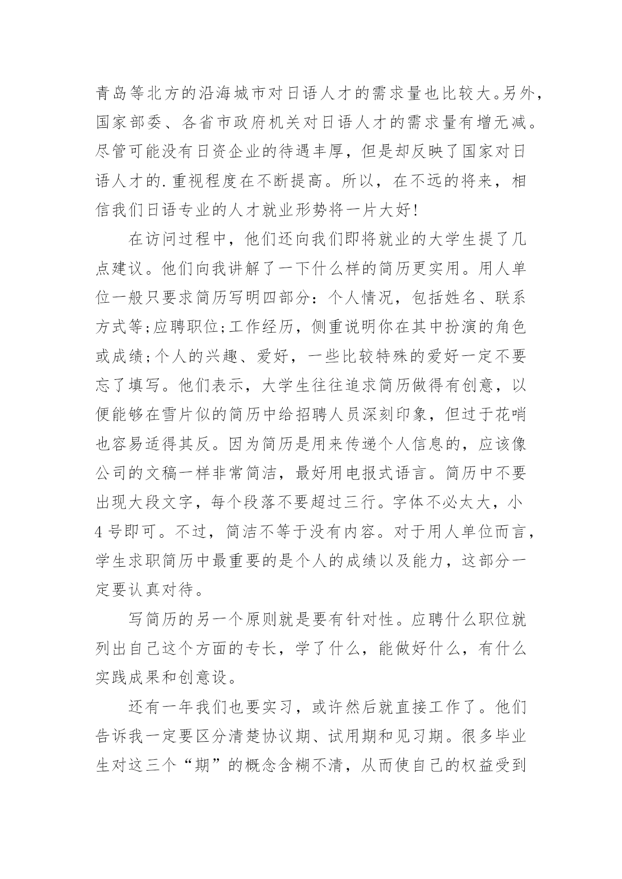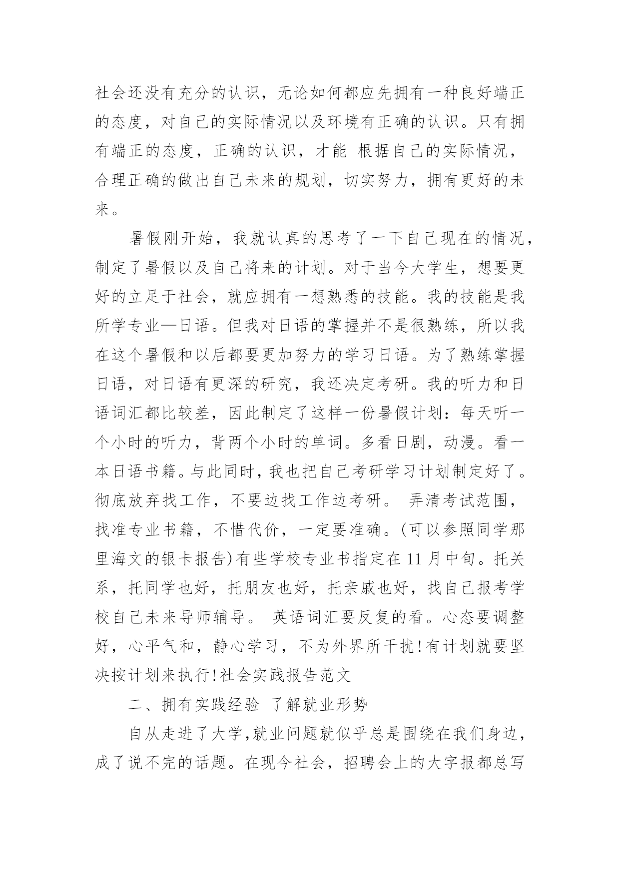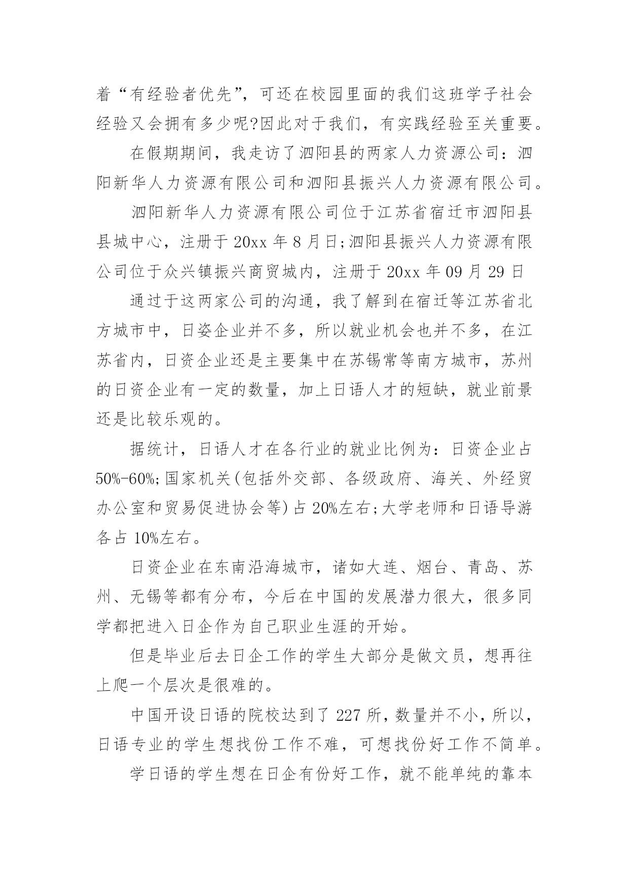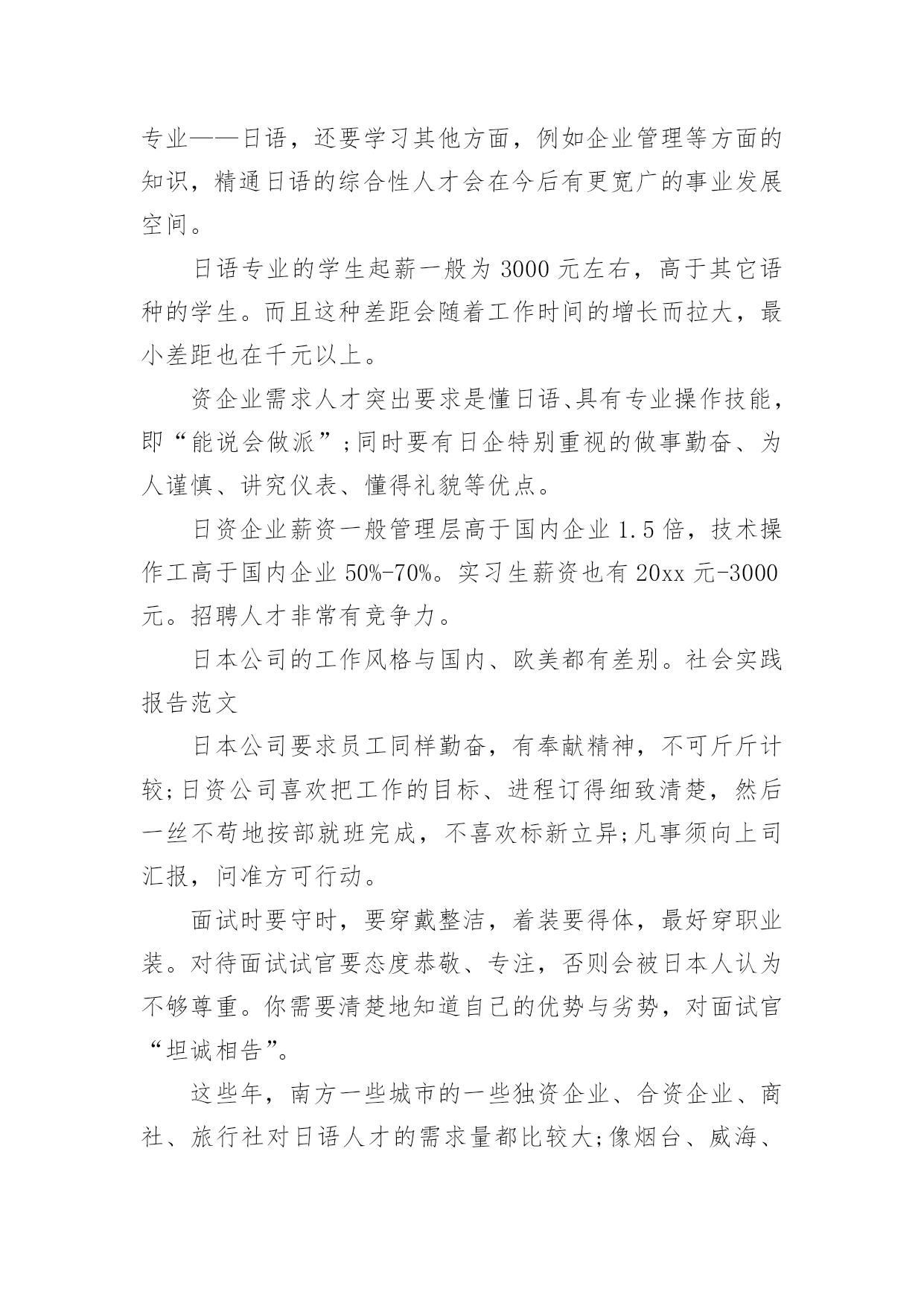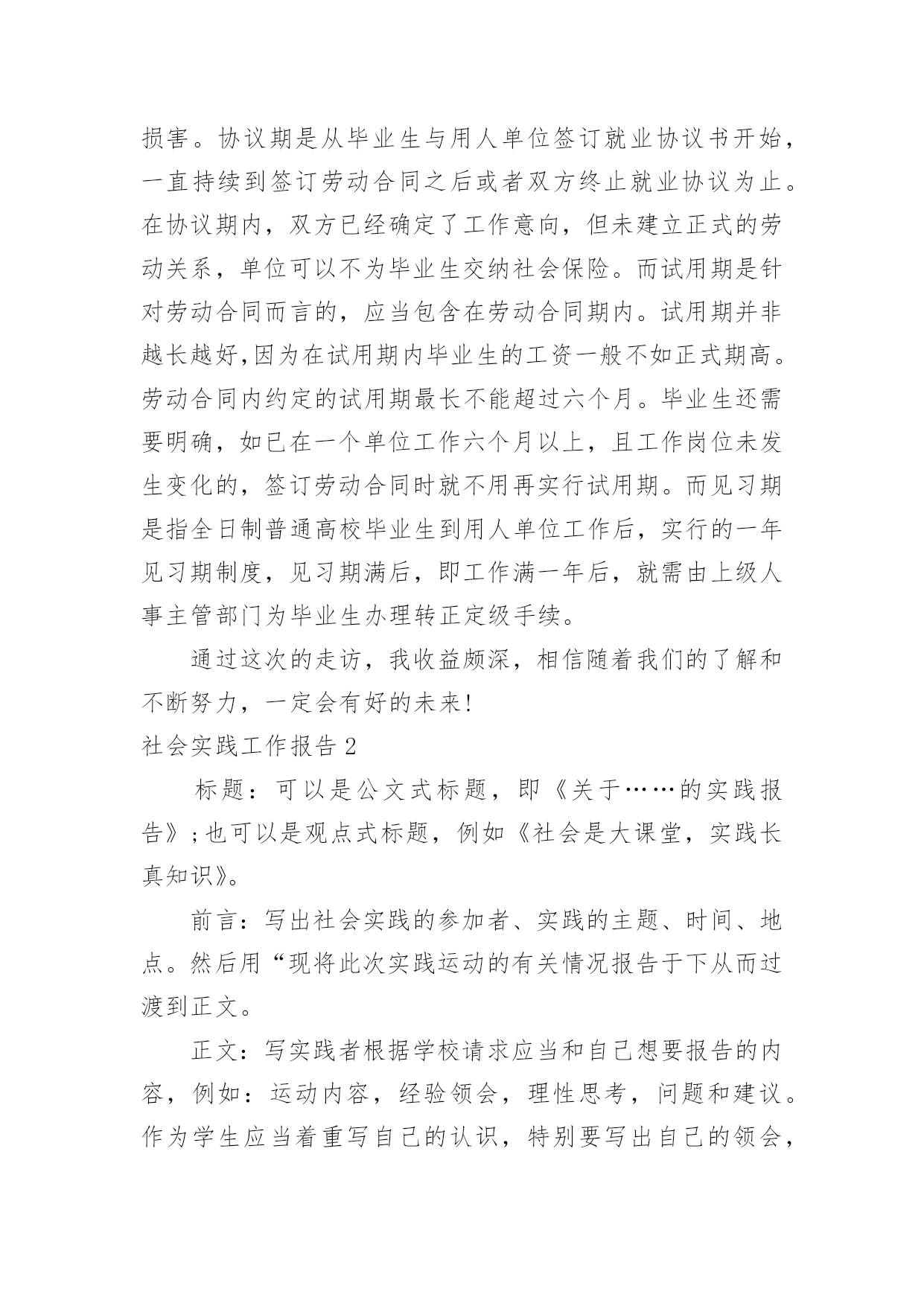 社会实践工作报告社会实践工作报告合集15篇随着个人的文明素养不断提升,报告的使用成为日常生活的常态,我们在写报告的时候要注意逻辑的合理性。相信许多人会觉得报告很难写吧,以下是小编为大家整理的社会实践工作报告,希望对大家有所帮助。社会实践工作报告1作为一个大学生有别于中学生就在于他更重视培养学生的实践能力,尤其在注重素质教育的今天,社会实践活动一直被视为高校培养德、智、体、美、劳全面发展的新世纪优秀人才的重要途径。对于我们大三学生更应抓住这个机会,为了拓展自身的知识面,扩大与社会的接触面,增加个人在社会竞争中的经验,锻炼和提高自己的能力,以便在以后毕业后能真正真正走入社会,能够适应国内外的经济形势的变化,并且能够在生活和工作中很好地处理各方面的问题。今年暑假社会实践的主题是四个“一”:一种端正的态度,一项熟悉的技能,一次实践的经历,一个正确的认识。围绕这四个主题,我开始了我这个假期的社会实践。一、用端正的态度,正确的认识规划未来大学生活已经过去大半,对于很多同学还有一年即将步入社会。或许对自己的能力还没有十足的把握,或许对这个社会还没有充分的认识,无论如何都应先拥有一种良好端正的态度,对自己的实际情况以及环境有正确的认识。只有拥有端正的态度,正确的认识,才能根据自己的实际情况,合理正确的做出自己未来的规划,切实努力,拥有更好的未来。暑假刚开始,我就认真的思考了一下自己现在的情况,制定了暑假以及自己将来的计划。对于当今大学生,想要更好的立足于社会,就应拥有一想熟悉的技能。我的技能是我所学专业—日语。但我对日语的掌握并不是很熟练,所以我在这个暑假和以后都要更加努力的学习日语。为了熟练掌握日语,对日语有更深的研究,我还决定考研。我的听力和日语词汇都比较差,因此制定了这样一份暑假计划:每天听一个小时的听力,背两个小时的单词。多看日剧,动漫。看一本日语书籍。与此同时,我也把自己考研学习计划制定好了。彻底放弃找工作,不要边找工作边考研。弄清考试范围,找准专业书籍,不惜代价,一定要准确。(可以参照同学那里海文的银卡报告)有些学校专业书指定在11月中旬。托关系,托同学也好,托朋友也好,托亲戚也好,找自己报考学校自己未来导师辅导。英语词汇要反复的看。心态要调整好,心平气和,静心学习,不为外界所干扰!有计划就要坚决按计划来执行!社会实践报告范文二、拥有实践经验了解就业形势自从走进了大学,就业问题就似乎总是围绕在我们身边,成了说不完的话题。在现今社会,招聘会上的大字报都总写着“有经验者优先”,可还在校园里面的我们这班学子社会经验又会拥有多少呢?因此对于我们,有实践经验至关重要。在假期期间,我走访了泗阳县的两家人力资源公司:泗阳新华人力资源有限公司和泗阳县振兴人力资源有限公司。泗阳新华人力资源有限公司位于江苏省宿迁市泗阳县县城中心,注册于20xx年8月日;泗阳县振兴人力资源有限公司位于众兴镇振兴商贸城内,注册于20xx年09月29日通过于这两家公司的沟通,我了解到在宿迁等江苏省北方城市中,日姿企业并不多,所以就业机会也并不多,在江苏省内,日资企业还是主要集中在苏锡常等南方城市,苏州的日资企业有一定的数量,加上日语人才的短缺,就业前景还是比较乐观的。据统计,日语人才在各行业的就业比例为:日资企业占50%-60%;国家机关(包括外交部、各级政府、海关、外经贸办公室和贸易促进协会等)占20%左右;大学老师和日语导游各占10%左右。日资企业在东南沿海城市,诸如大连、烟台、青岛、苏州、无锡等都有分布,今后在中国的发展潜力很大,很多同学都把进入日企作为自己职业生涯的开始。但是毕业后去日企工作的学生大部分是做文员,想再往上爬一个层次是很难的。中国开设日语的院校达到了227所,数量并不小,所以,日语专业的学生想找份工作不难,可想找份好工作不简单。学日语的学生想在日企有份好工作,就不能单纯的靠本专业——日语,还要学习其他方面,例如企业管理等方面的知识,精通日语的综合性人才会在今后有更宽广的事业发展空间。日语专业的学生起薪一般为3000元左右,高于其它语种的学生。而且这种差距会随着工作时间的增长而拉大,最小差距也在千元以上。资企业需求人才突出要求是懂日语、具有专业操作技能,即“能说会做派”;同时要有日企特别重视的做事勤奋、为人谨慎、讲究仪表、懂得礼貌等优点。日资企业薪资一般管理层高于国内企业1.5倍,技术操作工高于国内企业50%-70%。实习生薪资也有20xx元-3000元。招聘人才非常有竞争力。日本公司的工作风格与国内、欧美都有差别。社会实践报告范文日本公司要求员工同样勤奋,有奉献精神,不可斤斤计较;日资公司喜欢把工作的目标、进程订得细致清楚,然后一丝不苟地按部就班完成,不喜欢标新立异;凡事须向上司汇报,问准方可行动。面试时要守时,要穿戴整洁,着装要得体,最好穿职业