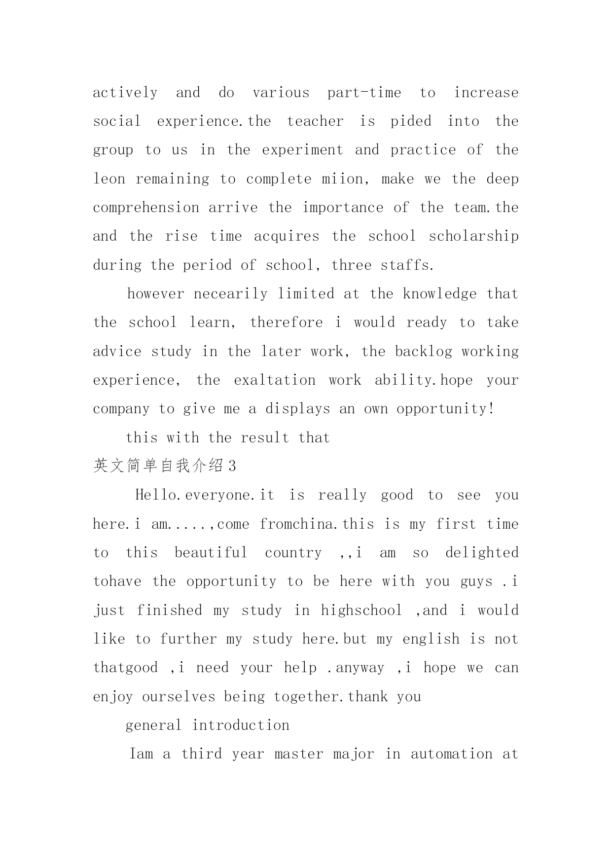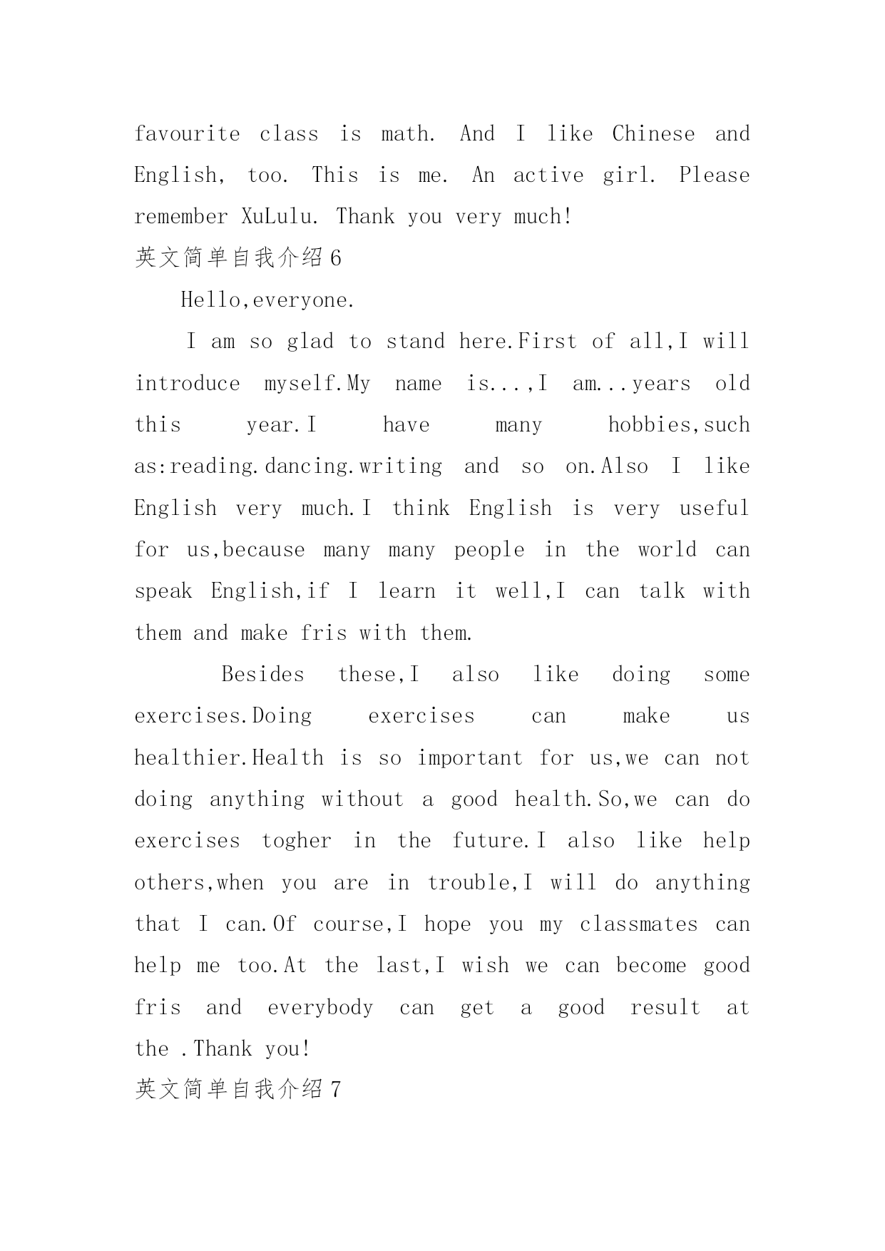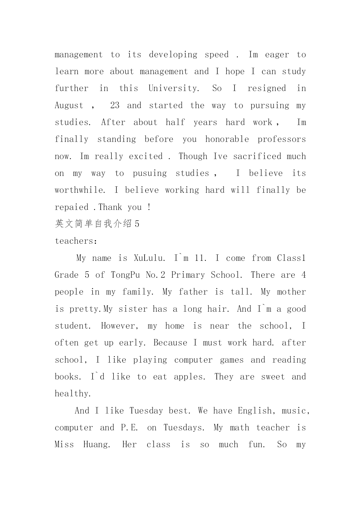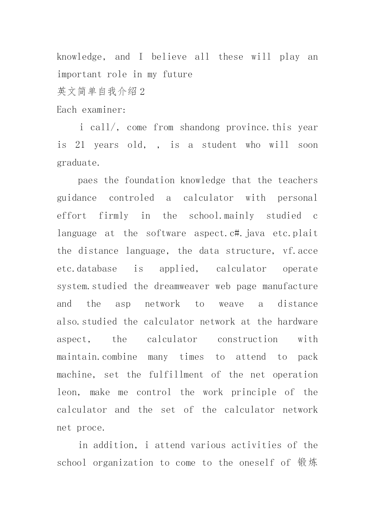 英文简单自我介绍英文简单自我介绍(实用7篇)来到一个陌生的地方时,通常需要用到自我介绍,自我介绍是让陌生人彼此认识的好方法。你所见过的自我介绍是什么样的呢?以下是小编精心整理的英文简单自我介绍,仅供参考,欢迎大家阅读。英文简单自我介绍1Iamcheerful,modest,self-confidentandgoodatcommunicatingwithIstudyindustriouslyandWheneverIcomeacrossaprobleminstudy,I'mabletoconsultwithanopenmindandtrymybesttogetanindepthPossessingthehonestcrediblemoralcharacter,asenseofteamworkandresponsibilityformywork,Ihavestrongendurance,willpowerandhard-workingqualityoftheworktoidentifypersistentoptimism,thecouragetofacedifficultiesandAtthesametime,IhavetakenanactivepartinallkindsofactivitiesinordertoimprovemypersonalFromtheseexperiences,Ihavenotonlyrealizedtheimportanceofunityandcooperation,butalsolearnedalotofsocialknowledge,andIbelieveallthesewillplayanimportantroleinmyfuture英文简单自我介绍2Eachexaminer:icall/,comefromshandongprovince.thisyearis21yearsold,,isastudentwhowillsoongraduate.paesthefoundationknowledgethattheteachersguidancecontroledacalculatorwithpersonaleffortfirmlyintheschool.mainlystudiedclanguageatthesoftwareaspect.c#.javaetc.plaitthedistancelanguage,thedatastructure,vf.acceetc.databaseisapplied,calculatoroperatesystem.studiedthedreamweaverwebpagemanufactureandtheaspnetworktoweaveadistancealso.studiedthecalculatornetworkatthehardwareaspect,thecalculatorconstructionwithmaintain.combinemanytimestoattendtopackmachine,setthefulfillmentofthenetoperationleon,makemecontroltheworkprincipleofthecalculatorandthesetofthecalculatornetworknetproce.inaddition,iattendvariousactivitiesoftheschoolorganizationtocometotheoneselfof锻炼activelyanddovariouspart-timetoincreasesocialexperience.theteacherispidedintothegrouptousintheexperimentandpracticeoftheleonremainingtocompletemiion,makewethedeepcomprehensionarrivetheimportanceoftheteam.theandtherisetimeacquirestheschoolscholarshipduringtheperiodofschool,threestaffs.howevernecearilylimitedattheknowledgethattheschoollearn,thereforeiwouldreadytotakeadvicestudyinthelaterwork,thebacklogworkingexperience,theexaltationworkability.hopeyourcompanytogivemeadisplaysanownopportunit