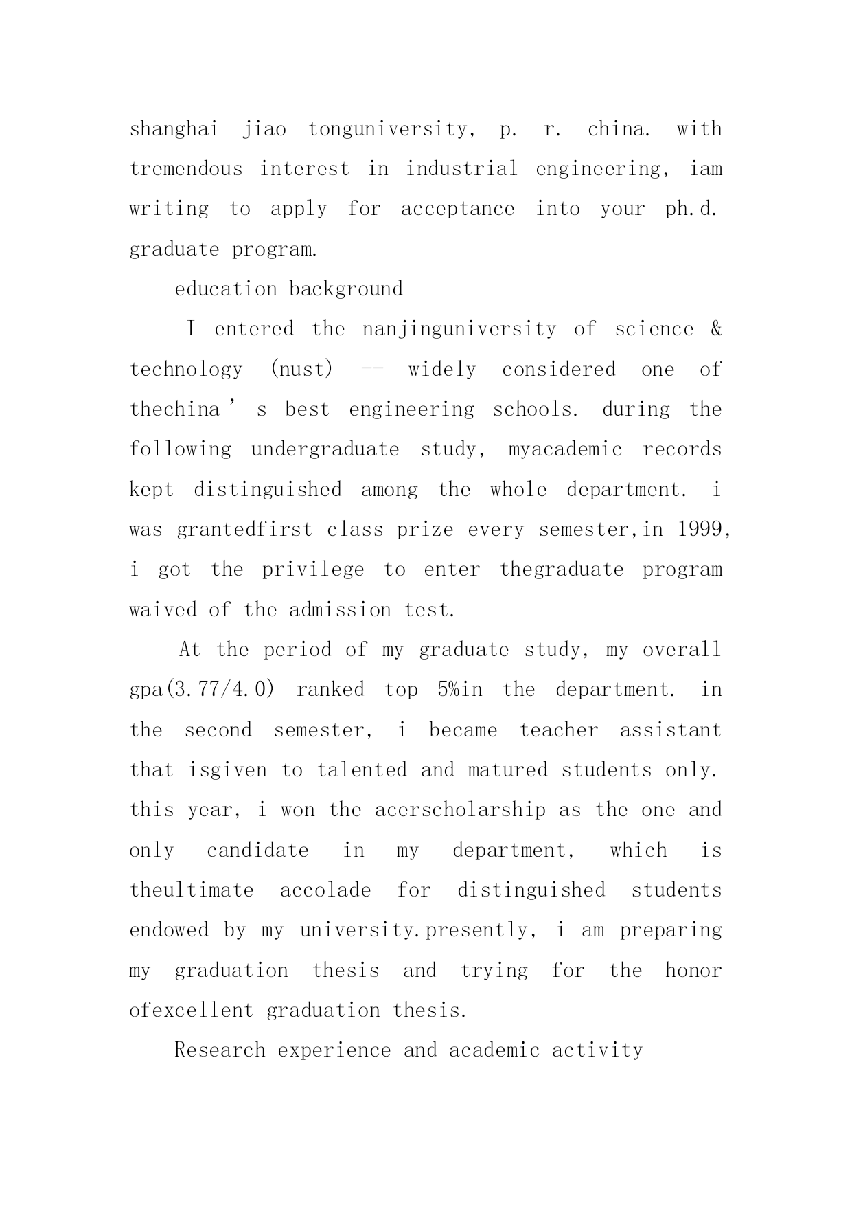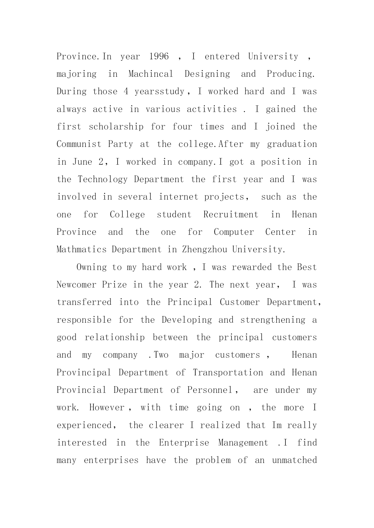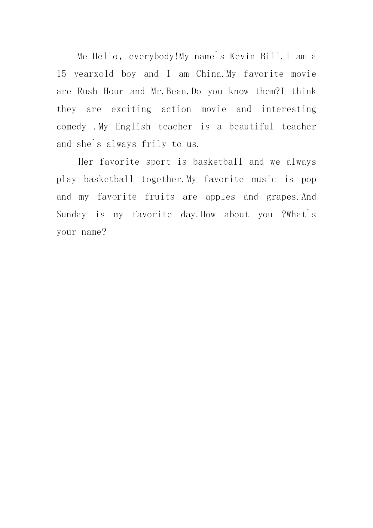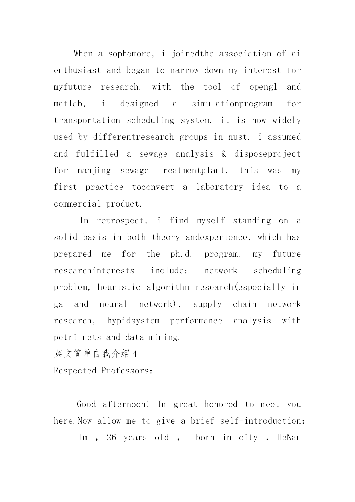 英文简单自我介绍英文简单自我介绍(实用7篇)来到一个陌生的地方时,通常需要用到自我介绍,自我介绍是让陌生人彼此认识的好方法。你所见过的自我介绍是什么样的呢?以下是小编精心整理的英文简单自我介绍,仅供参考,欢迎大家阅读。英文简单自我介绍1Iamcheerful,modest,self-confidentandgoodatcommunicatingwithIstudyindustriouslyandWheneverIcomeacrossaprobleminstudy,I'mabletoconsultwithanopenmindandtrymybesttogetanindepthPossessingthehonestcrediblemoralcharacter,asenseofteamworkandresponsibilityformywork,Ihavestrongendurance,willpowerandhard-workingqualityoftheworktoidentifypersistentoptimism,thecouragetofacedifficultiesandAtthesametime,IhavetakenanactivepartinallkindsofactivitiesinordertoimprovemypersonalFromtheseexperiences,Ihavenotonlyrealizedtheimportanceofunityandcooperation,butalsolearnedalotofsocialknowledge,andIbelieveallthesewillplayanimportantroleinmyfuture英文简单自我介绍2Eachexaminer:icall/,comefromshandongprovince.thisyearis21yearsold,,isastudentwhowillsoongraduate.paesthefoundationknowledgethattheteachersguidancecontroledacalculatorwithpersonaleffortfirmlyintheschool.mainlystudiedclanguageatthesoftwareaspect.c#.javaetc.plaitthedistancelanguage,thedatastructure,vf.acceetc.databaseisapplied,calculatoroperatesystem.studiedthedreamweaverwebpagemanufactureandtheaspnetworktoweaveadistancealso.studiedthecalculatornetworkatthehardwareaspect,thecalculatorconstructionwithmaintain.combinemanytimestoattendtopackmachine,setthefulfillmentofthenetoperationleon,makemecontroltheworkprincipleofthecalculatorandthesetofthecalculatornetworknetproce.inaddition,iattendvariousactivitiesoftheschoolorganizationtocometotheoneselfof锻炼activelyanddovariouspart-timetoincreasesocialexperience.theteacherispidedintothegrouptousintheexperimentandpracticeoftheleonremainingtocompletemiion,makewethedeepcomprehensionarrivetheimportanceoftheteam.theandtherisetimeacquirestheschoolscholarshipduringtheperiodofschool,threestaffs.howevernecearilylimitedattheknowledgethattheschoollearn,thereforeiwouldreadytotakeadvicestudyinthelaterwork,thebacklogworkingexperience,theexaltationworkability.hopeyourcompanytogivemeadisplaysanownopportunit