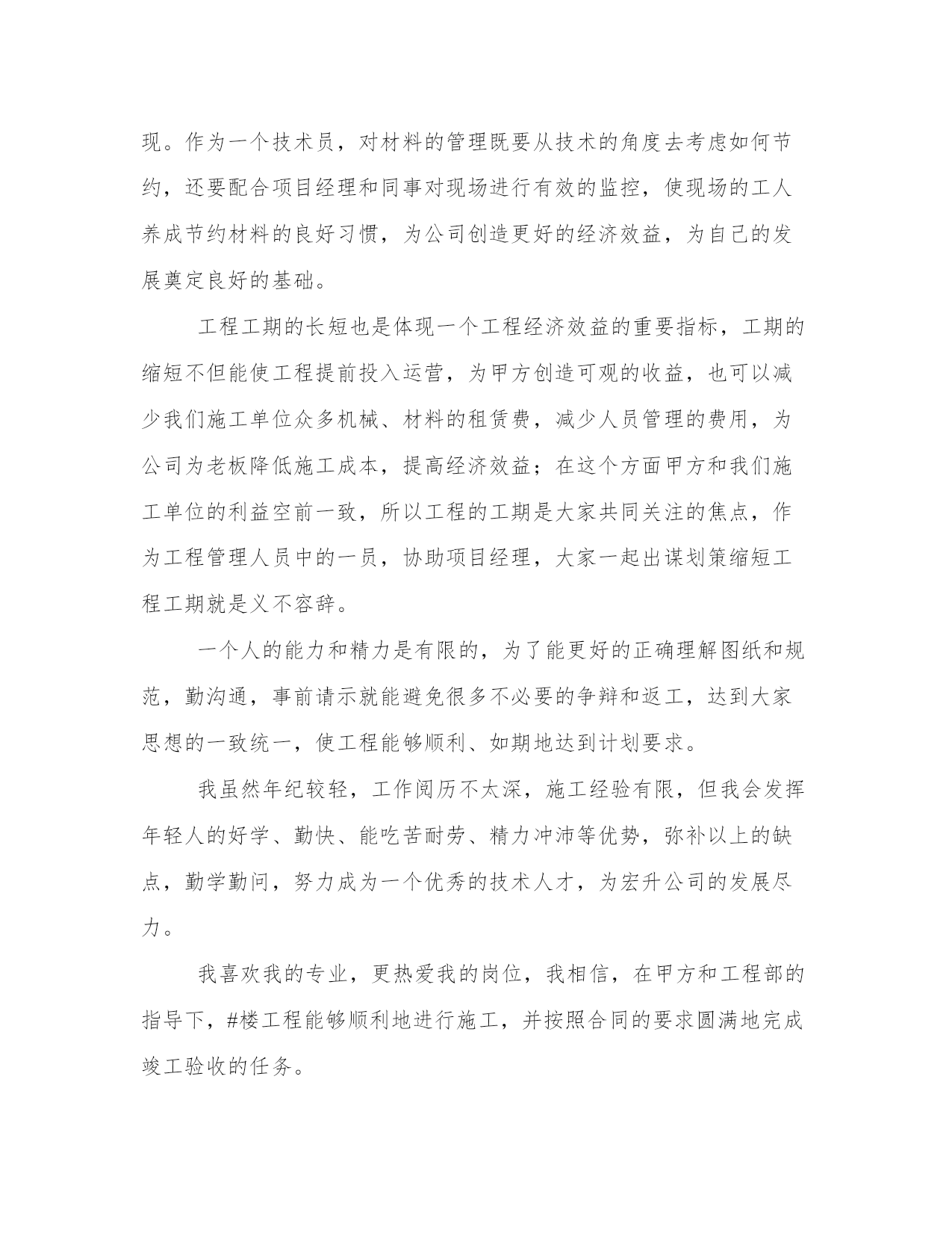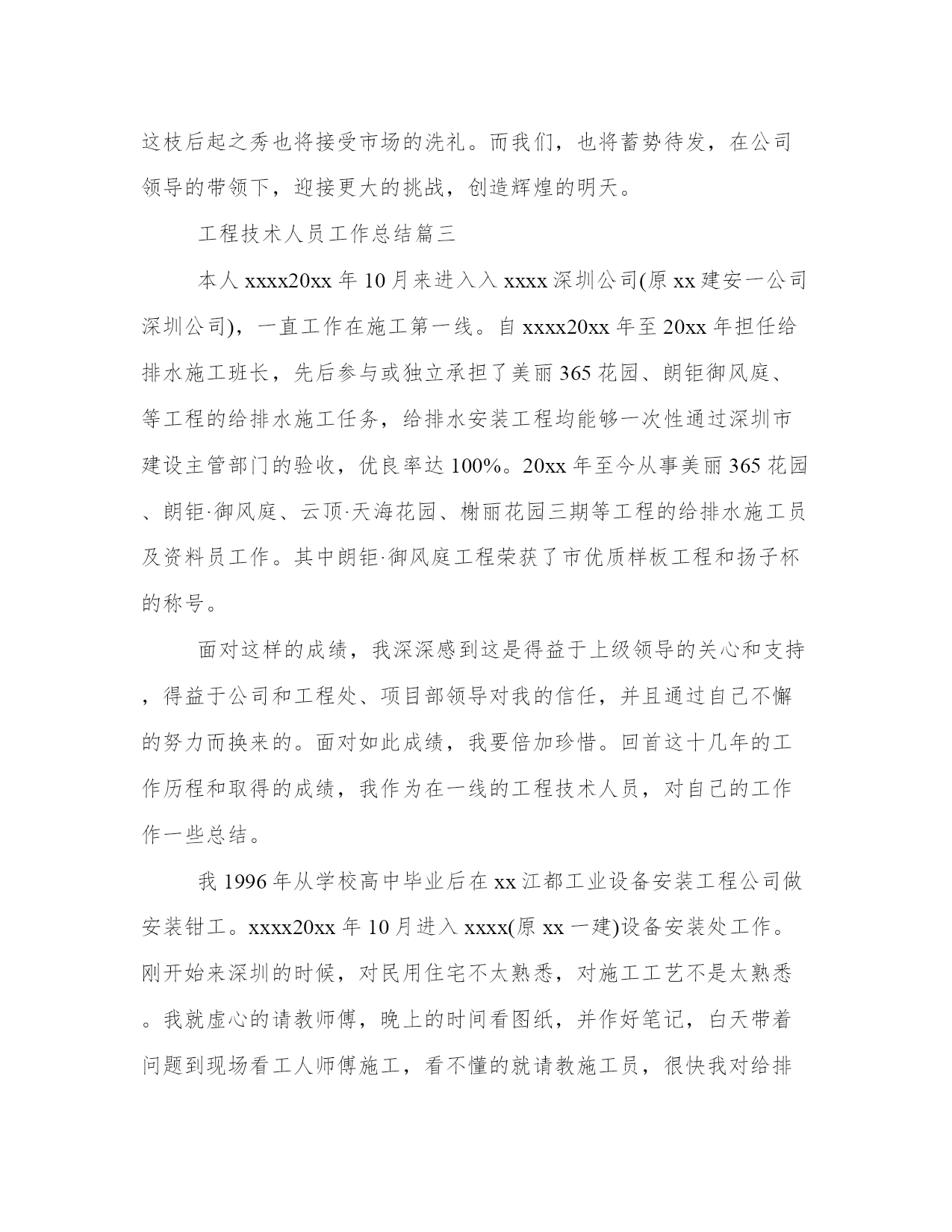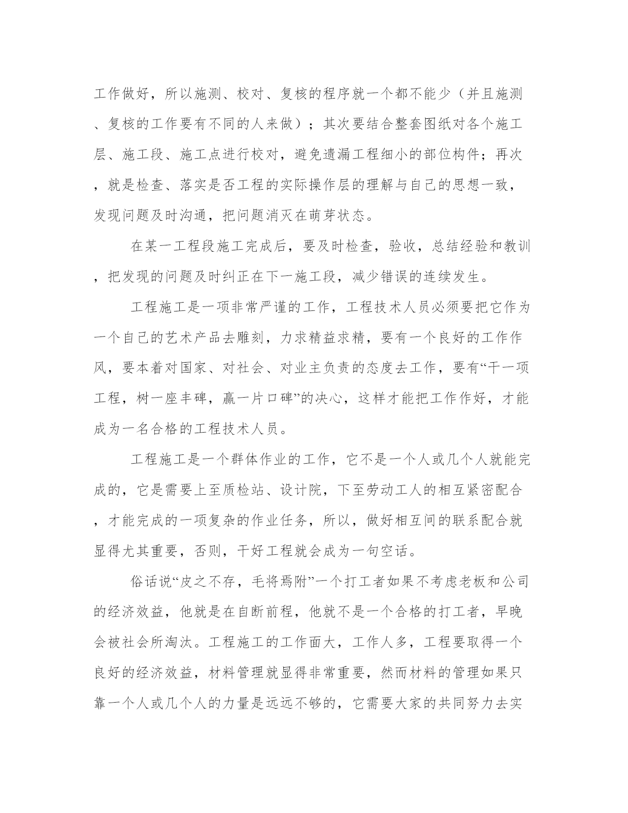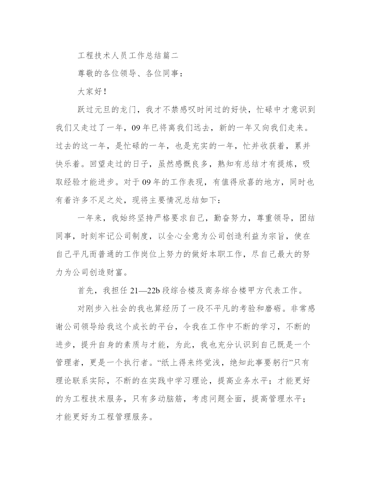 工程技术人员工作总结(实用10篇)总结是对过去一定时期的工作、学习或思想情况进行回顾、分析,并做出客观评价的书面材料,它可使零星的、肤浅的、表面的感性认知上升到全面的、系统的、本质的理性认识上来,让我们一起认真地写一份总结吧。怎样写总结才更能起到其作用呢?总结应该怎么写呢?以下我给大家整理了一些优质的总结范文,希望对大家能够有所帮助。工程技术人员工作总结篇一本人xxx,男,汉族,30岁,xxxx年毕业于郑州xxxx学院工民建专业,在校三年,普招大专学历。本人在毕业后就参加了工作,一直在施工单位从事技术施工,有一定的施工经验,并且有信心把#楼工程圆满地交给业主使用。工程施工是按照设计图纸把设计师的思想完成从意识形态到实物形态的转变过程,要搞好工程施工,就必须首先熟悉施工图纸,掌握设计师的意图,完成从图纸了解设计意图再回头修订图纸的过程(即完成图纸的施工前会审),其次要强化对图纸的了解程度,熟悉工程的基本概况,考虑具体的施工方案,初步明确工程技术施工的重点、难点,为以后的施工操作行为做准备。在工程施工过程中,测量放线工作是重中之重,它贯穿整个工程施工的始终,是工程施工的灵魂,要想工程干好,必须把测量放线的工作做好,所以施测、校对、复核的程序就一个都不能少(并且施测、复核的工作要有不同的人来做);其次要结合整套图纸对各个施工层、施工段、施工点进行校对,避免遗漏工程细小的部位构件;再次,就是检查、落实是否工程的实际操作层的理解与自己的思想一致,发现问题及时沟通,把问题消灭在萌芽状态。在某一工程段施工完成后,要及时检查,验收,总结经验和教训,把发现的问题及时纠正在下一施工段,减少错误的连续发生。工程施工是一项非常严谨的工作,工程技术人员必须要把它作为一个自己的艺术产品去雕刻,力求精益求精,要有一个良好的工作作风,要本着对国家、对社会、对业主负责的态度去工作,要有“干一项工程,树一座丰碑,赢一片口碑”的决心,这样才能把工作作好,才能成为一名合格的工程技术人员。工程施工是一个群体作业的工作,它不是一个人或几个人就能完成的,它是需要上至质检站、设计院,下至劳动工人的相互紧密配合,才能完成的一项复杂的作业任务,所以,做好相互间的联系配合就显得尤其重要,否则,干好工程就会成为一句空话。俗话说“皮之不存,毛将焉附”一个打工者如果不考虑老板和公司的经济效益,他就是在自断前程,他就不是一个合格的打工者,早晚会被社会所淘汰。工程施工的工作面大,工作人多,工程要取得一个良好的经济效益,材料管理就显得非常重要,然而材料的管理如果只靠一个人或几个人的力量是远远不够的,它需要大家的共同努力去实现。作为一个技术员,对材料的管理既要从技术的角度去考虑如何节约,还要配合项目经理和同事对现场进行有效的监控,使现场的工人养成节约材料的良好习惯,为公司创造更好的经济效益,为自己的发展奠定良好的基础。工程工期的长短也是体现一个工程经济效益的重要指标,工期的缩短不但能使工程提前投入运营,为甲方创造可观的收益,也可以减少我们施工单位众多机械、材料的租赁费,减少人员管理的费用,为公司为老板降低施工成本,提高经济效益;在这个方面甲方和我们施工单位的利益空前一致,所以工程的工期是大家共同关注的焦点,作为工程管理人员中的一员,协助项目经理,大家一起出谋划策缩短工程工期就是义不容辞。一个人的能力和精力是有限的,为了能更好的正确理解图纸和规范,勤沟通,事前请示就能避免很多不必要的争辩和返工,达到大家思想的一致统一,使工程能够顺利、如期地达到计划要求。我虽然年纪较轻,工作阅历不太深,施工经验有限,但我会发挥年轻人的好学、勤快、能吃苦耐劳、精力冲沛等优势,弥补以上的缺点,勤学勤问,努力成为一个优秀的技术人才,为宏升公司的发展尽力。我喜欢我的专业,更热爱我的岗位,我相信,在甲方和工程部的指导下,#楼工程能够顺利地进行施工,并按照合同的要求圆满地完成竣工验收的任务。工程技术人员工作总结篇二尊敬的各位领导、各位同事:大家好!跃过元旦的龙门,我才不禁感叹时间过的好快,忙碌中才意识到我们又走过了一年,09年已将离我们远去,新的一年又向我们走来。过去的这一年,是忙碌的一年,也是充实的一年,忙并收获着,累并快乐着。回望走过的日子,虽然感慨良多,熟知有总结才有提炼,吸取经验才能进步。对于09年的工作表现,有值得欣喜的地方,同时也有着许多不足之处,现将主要情况总结如下:一年来,我始终坚持严格要求自己,勤奋努力,尊重领导,团结同事,时刻牢记公司制度,以全心全意为公司创造利益为宗旨,使在自己平凡而普通的工作岗位上努力的做好本职工作,尽自己最大的努力为公司创造财富。首先,我担任21—22b段综合楼及商务综合楼甲方代表工作。对刚步入社会的我也算经历了一段不平凡的考验和磨砺。非常