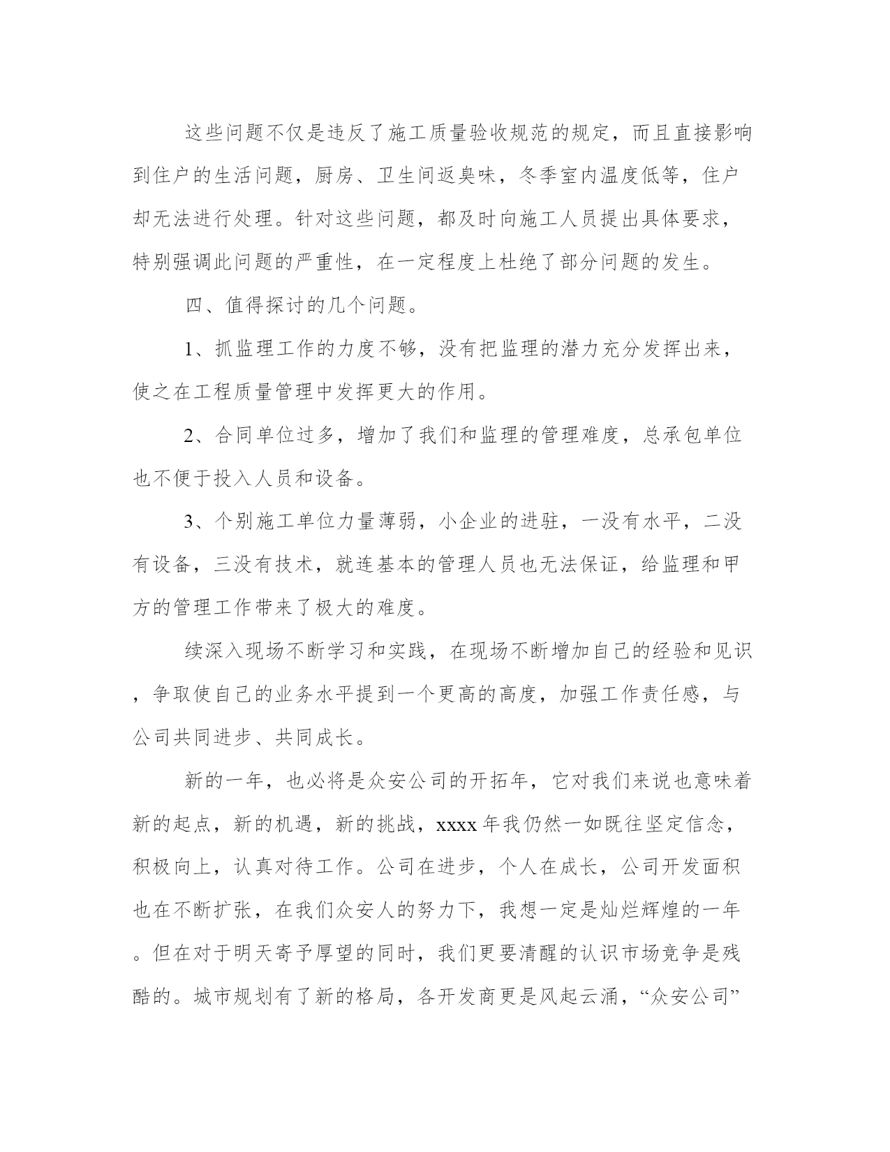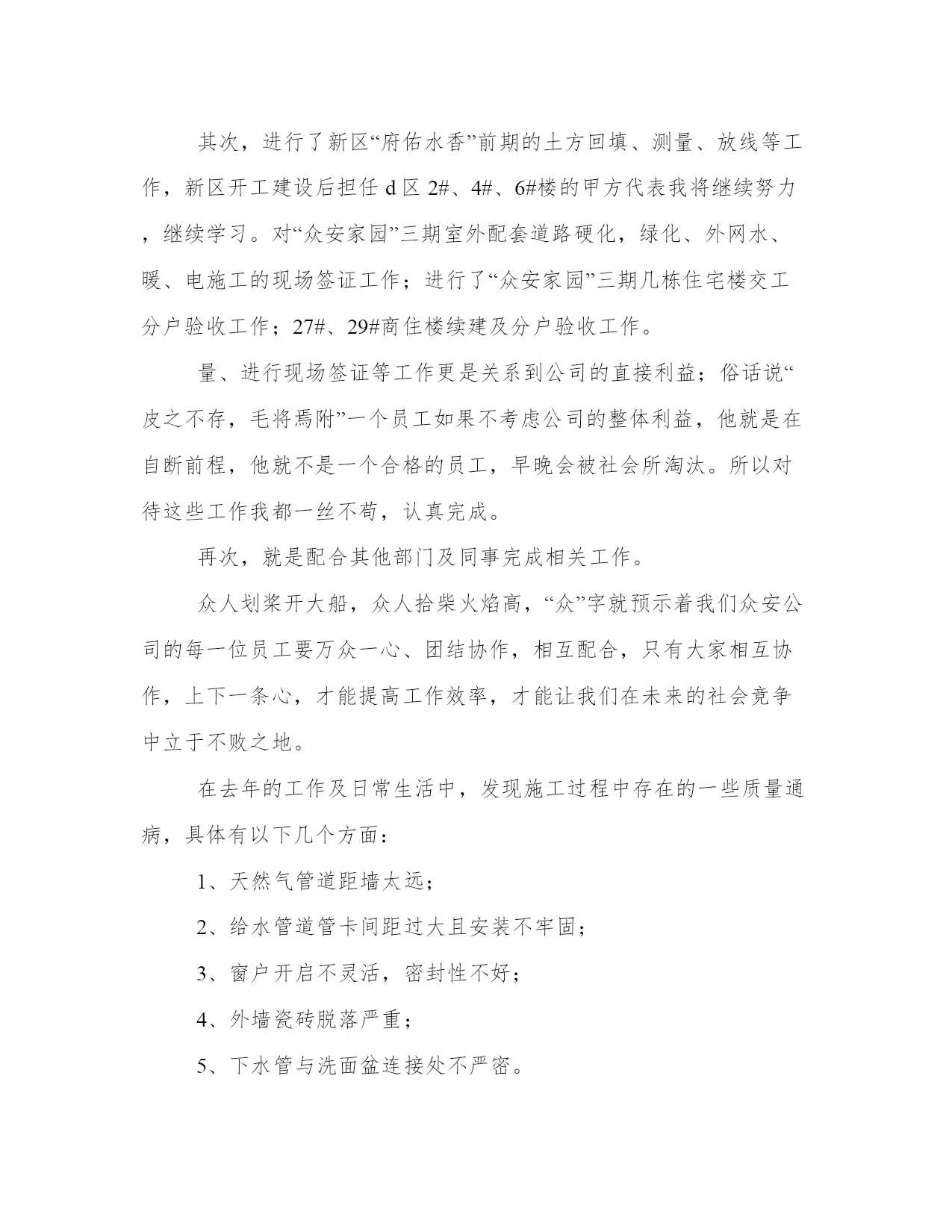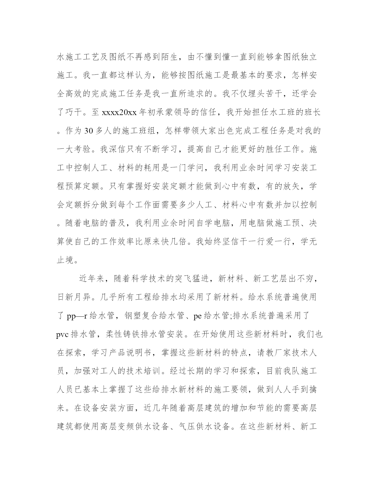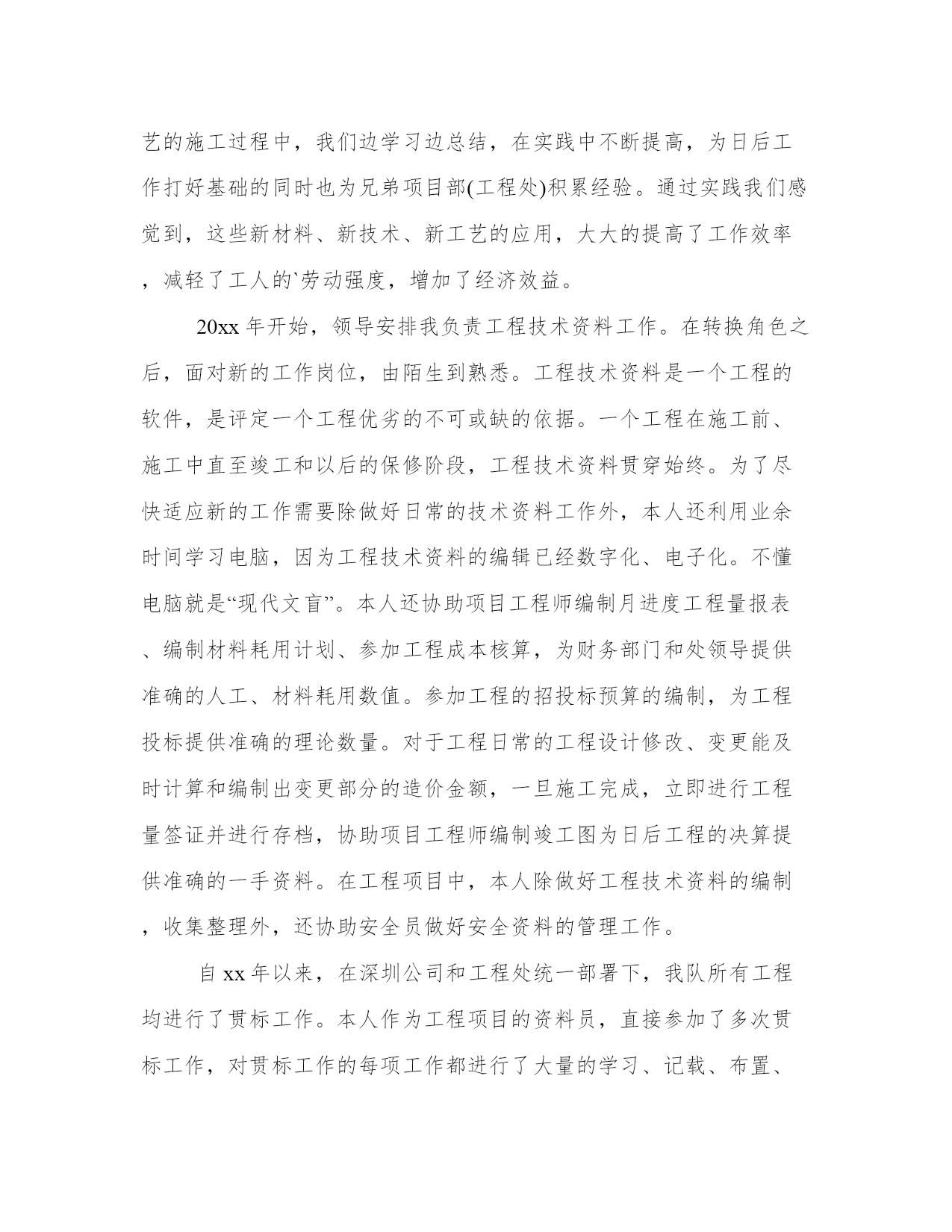 工程技术人员工作总结(实用10篇)总结是对过去一定时期的工作、学习或思想情况进行回顾、分析,并做出客观评价的书面材料,它可使零星的、肤浅的、表面的感性认知上升到全面的、系统的、本质的理性认识上来,让我们一起认真地写一份总结吧。怎样写总结才更能起到其作用呢?总结应该怎么写呢?以下我给大家整理了一些优质的总结范文,希望对大家能够有所帮助。工程技术人员工作总结篇一本人xxx,男,汉族,30岁,xxxx年毕业于郑州xxxx学院工民建专业,在校三年,普招大专学历。本人在毕业后就参加了工作,一直在施工单位从事技术施工,有一定的施工经验,并且有信心把#楼工程圆满地交给业主使用。工程施工是按照设计图纸把设计师的思想完成从意识形态到实物形态的转变过程,要搞好工程施工,就必须首先熟悉施工图纸,掌握设计师的意图,完成从图纸了解设计意图再回头修订图纸的过程(即完成图纸的施工前会审),其次要强化对图纸的了解程度,熟悉工程的基本概况,考虑具体的施工方案,初步明确工程技术施工的重点、难点,为以后的施工操作行为做准备。在工程施工过程中,测量放线工作是重中之重,它贯穿整个工程施工的始终,是工程施工的灵魂,要想工程干好,必须把测量放线的工作做好,所以施测、校对、复核的程序就一个都不能少(并且施测、复核的工作要有不同的人来做);其次要结合整套图纸对各个施工层、施工段、施工点进行校对,避免遗漏工程细小的部位构件;再次,就是检查、落实是否工程的实际操作层的理解与自己的思想一致,发现问题及时沟通,把问题消灭在萌芽状态。在某一工程段施工完成后,要及时检查,验收,总结经验和教训,把发现的问题及时纠正在下一施工段,减少错误的连续发生。工程施工是一项非常严谨的工作,工程技术人员必须要把它作为一个自己的艺术产品去雕刻,力求精益求精,要有一个良好的工作作风,要本着对国家、对社会、对业主负责的态度去工作,要有“干一项工程,树一座丰碑,赢一片口碑”的决心,这样才能把工作作好,才能成为一名合格的工程技术人员。工程施工是一个群体作业的工作,它不是一个人或几个人就能完成的,它是需要上至质检站、设计院,下至劳动工人的相互紧密配合,才能完成的一项复杂的作业任务,所以,做好相互间的联系配合就显得尤其重要,否则,干好工程就会成为一句空话。俗话说“皮之不存,毛将焉附”一个打工者如果不考虑老板和公司的经济效益,他就是在自断前程,他就不是一个合格的打工者,早晚会被社会所淘汰。工程施工的工作面大,工作人多,工程要取得一个良好的经济效益,材料管理就显得非常重要,然而材料的管理如果只靠一个人或几个人的力量是远远不够的,它需要大家的共同努力去实现。作为一个技术员,对材料的管理既要从技术的角度去考虑如何节约,还要配合项目经理和同事对现场进行有效的监控,使现场的工人养成节约材料的良好习惯,为公司创造更好的经济效益,为自己的发展奠定良好的基础。工程工期的长短也是体现一个工程经济效益的重要指标,工期的缩短不但能使工程提前投入运营,为甲方创造可观的收益,也可以减少我们施工单位众多机械、材料的租赁费,减少人员管理的费用,为公司为老板降低施工成本,提高经济效益;在这个方面甲方和我们施工单位的利益空前一致,所以工程的工期是大家共同关注的焦点,作为工程管理人员中的一员,协助项目经理,大家一起出谋划策缩短工程工期就是义不容辞。一个人的能力和精力是有限的,为了能更好的正确理解图纸和规范,勤沟通,事前请示就能避免很多不必要的争辩和返工,达到大家思想的一致统一,使工程能够顺利、如期地达到计划要求。我虽然年纪较轻,工作阅历不太深,施工经验有限,但我会发挥年轻人的好学、勤快、能吃苦耐劳、精力冲沛等优势,弥补以上的缺点,勤学勤问,努力成为一个优秀的技术人才,为宏升公司的发展尽力。我喜欢我的专业,更热爱我的岗位,我相信,在甲方和工程部的指导下,#楼工程能够顺利地进行施工,并按照合同的要求圆满地完成竣工验收的任务。工程技术人员工作总结篇二尊敬的各位领导、各位同事:大家好!跃过元旦的龙门,我才不禁感叹时间过的好快,忙碌中才意识到我们又走过了一年,09年已将离我们远去,新的一年又向我们走来。过去的这一年,是忙碌的一年,也是充实的一年,忙并收获着,累并快乐着。回望走过的日子,虽然感慨良多,熟知有总结才有提炼,吸取经验才能进步。对于09年的工作表现,有值得欣喜的地方,同时也有着许多不足之处,现将主要情况总结如下:一年来,我始终坚持严格要求自己,勤奋努力,尊重领导,团结同事,时刻牢记公司制度,以全心全意为公司创造利益为宗旨,使在自己平凡而普通的工作岗位上努力的做好本职工作,尽自己最大的努力为公司创造财富。首先,我担任21—22b段综合楼及商务综合楼甲方代表工作。对刚步入社会的我也算经历了一段不平凡的考验和磨砺。非常