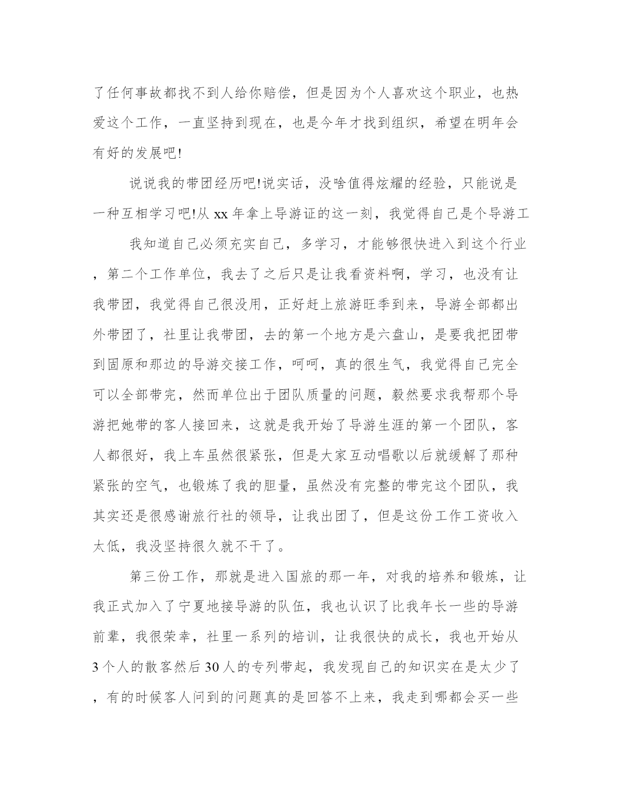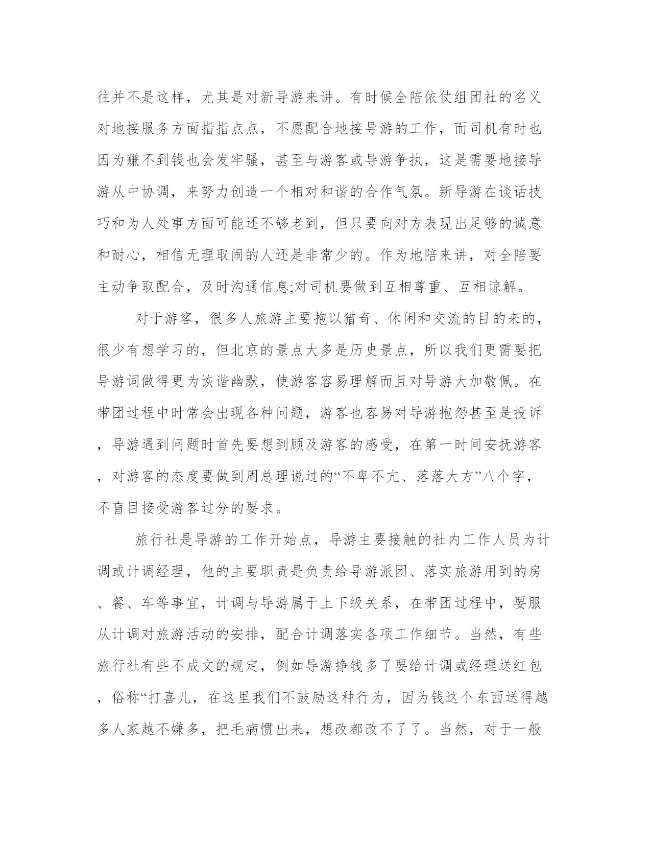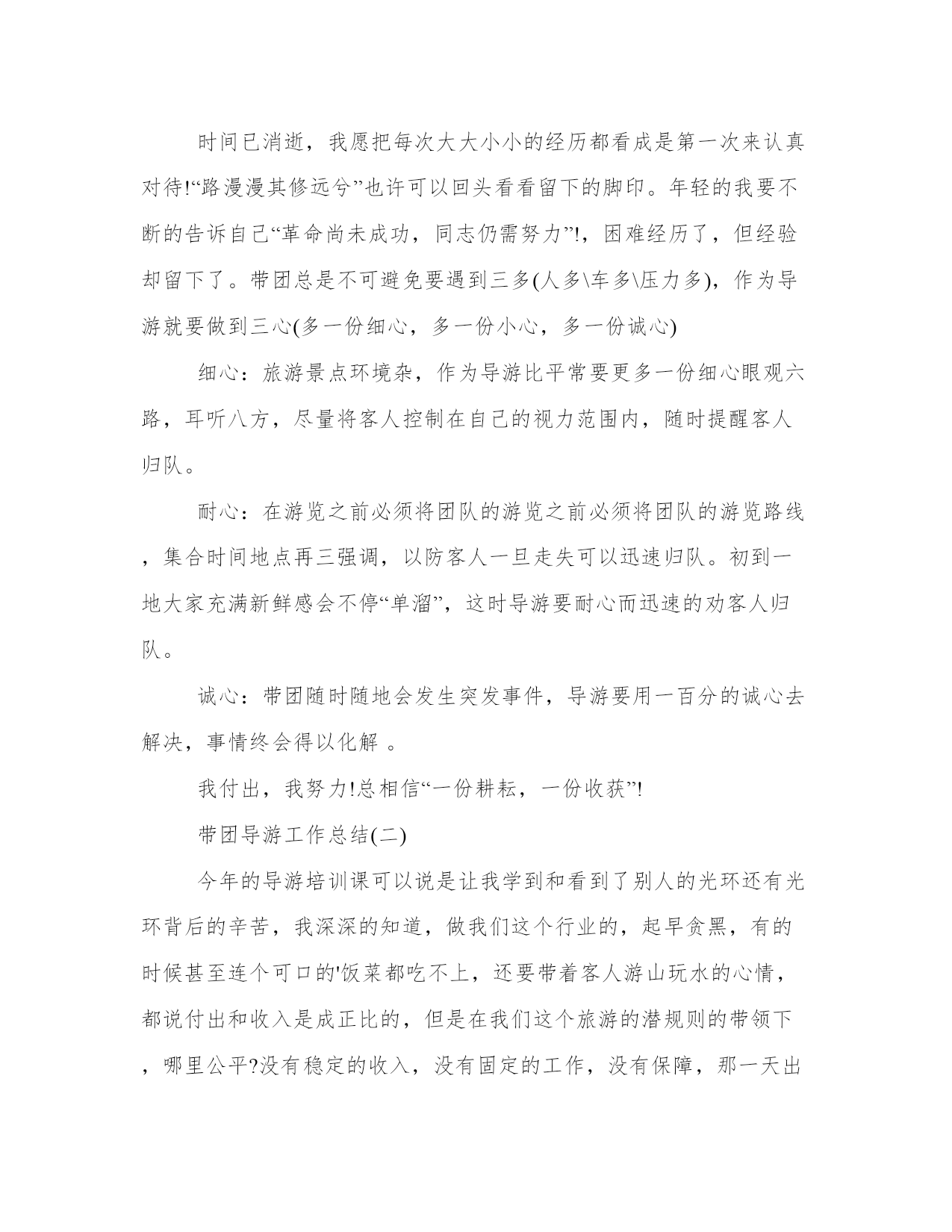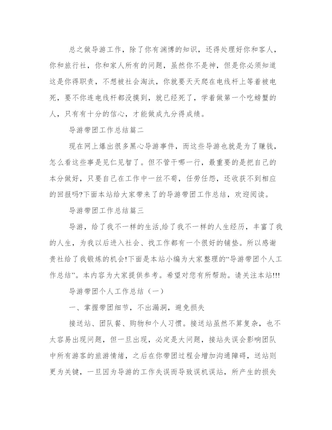 导游带团工作总结带团导游工作总结(大全14篇)总结是对前段社会实践活动进行全面回顾、检查的文种,这决定了总结有很强的客观性特征。写总结的时候需要注意什么呢?有哪些格式需要注意呢?那么下面我就给大家讲一讲总结怎么写才比较好,我们一起来看一看吧。导游带团工作总结篇一下面是由本站小编为大家精心整理的带团导游工作总结,欢迎阅读。如需了解更多带团导游工作总结内容,请继续关注本站工作总结栏目。带团导游工作总结(一)掐指一算做导游已2年有余,其间有酸也有甜。曾经试图放弃,却有千般理由选择继续,为了继续而毅然选择加入**旅游总公司,希望自己理想的翅膀再次飞翔。接下来200x年五月的时候带了一次青岛团,由于这次准备并不是很充分,又加上一些主观和客观的原因使自己对这次带团真的很有挫折感,不过,也让我学习到了怎么处理问题,面临问题时要临危不乱,以下是我带团来的大致小结:1:熟悉线路:团前准备一定要充分,线路熟记于心,多请教老导游,但也并不能轻信别人的提议,要做到有把握,有依据,才能万无一失。2:服务工作要热心,细心:特别是旺季,一定要提醒旅游注意事项,方可做到防患于未然,有时一句话就能带来意想不到的效果,如旅游安全问题,游览注意要守时等等,主要防止问题出现的时候游客产生情绪上的不满。导游若在事先有个铺垫,效果就会好很多。3:注意协调工作,安排好游客的同时,也要妥善处理好客人,司机,地陪旅行社和景区的关系。4:导游要以不变应万变,出现问题也不能自己先乱了阵脚。导游虽不是万能的,但你的头衔就注定了你必须在客人面前临危不乱,及时果断的处理问题,如发生意外情况也要学会随机应变来妥善处理。5:书到用时方恨少,导游所知道的知识必须广泛,因此要不断的学习,给自己充电。每次带团回来也要及时的总结教训,积累经验。6:维护旅行社的信誉同时也要保护好游客的权益,当你为客人利益着想时,当客人意见不统一或遇到意外问题时,客人也会尊重和理解你和旅行社的安排。7:最后,要及时解决客人遗留的问题,导游本身是一个服务行业,不仅仅是满足客人的需求,但不同的人也有不同的心理,你的决定不一定合大众,但一定做到合情合理,客人自然也会给你满意的答复。所以要学会解决不同的问题,不要把问题留到最后。时间已消逝,我愿把每次大大小小的经历都看成是第一次来认真对待!“路漫漫其修远兮”也许可以回头看看留下的脚印。年轻的我要不断的告诉自己“革命尚未成功,同志仍需努力”!,困难经历了,但经验却留下了。带团总是不可避免要遇到三多(人多\车多\压力多),作为导游就要做到三心(多一份细心,多一份小心,多一份诚心)细心:旅游景点环境杂,作为导游比平常要更多一份细心眼观六路,耳听八方,尽量将客人控制在自己的视力范围内,随时提醒客人归队。耐心:在游览之前必须将团队的游览之前必须将团队的游览路线,集合时间地点再三强调,以防客人一旦走失可以迅速归队。初到一地大家充满新鲜感会不停“单溜”,这时导游要耐心而迅速的劝客人归队。诚心:带团随时随地会发生突发事件,导游要用一百分的诚心去解决,事情终会得以化解。我付出,我努力!总相信“一份耕耘,一份收获”!带团导游工作总结(二)今年的导游培训课可以说是让我学到和看到了别人的光环还有光环背后的辛苦,我深深的知道,做我们这个行业的,起早贪黑,有的时候甚至连个可口的'饭菜都吃不上,还要带着客人游山玩水的心情,都说付出和收入是成正比的,但是在我们这个旅游的潜规则的带领下,哪里公平?没有稳定的收入,没有固定的工作,没有保障,那一天出了任何事故都找不到人给你赔偿,但是因为个人喜欢这个职业,也热爱这个工作,一直坚持到现在,也是今年才找到组织,希望在明年会有好的发展吧!说说我的带团经历吧!说实话,没啥值得炫耀的经验,只能说是一种互相学习吧!从xx年拿上导游证的这一刻,我觉得自己是个导游工我知道自己必须充实自己,多学习,才能够很快进入到这个行业,第二个工作单位,我去了之后只是让我看资料啊,学习,也没有让我带团,我觉得自己很没用,正好赶上旅游旺季到来,导游全部都出外带团了,社里让我带团,去的第一个地方是六盘山,是要我把团带到固原和那边的导游交接工作,呵呵,真的很生气,我觉得自己完全可以全部带完,然而单位出于团队质量的问题,毅然要求我帮那个导游把她带的客人接回来,这就是我开始了导游生涯的第一个团队,客人都很好,我上车虽然很紧张,但是大家互动唱歌以后就缓解了那种紧张的空气,也锻炼了我的胆量,虽然没有完整的带完这个团队,我其实还是很感谢旅行社的领导,让我出团了,但是这份工作工资收入太低,我没坚持很久就不干了。第三份工作,那就是进入国旅的那一年,对我的培养和锻炼,让我正式加入了宁夏地接导游的队伍,我也认识了比我年长一些的导游前辈,我很荣幸,社里一系列的培训,让我很快