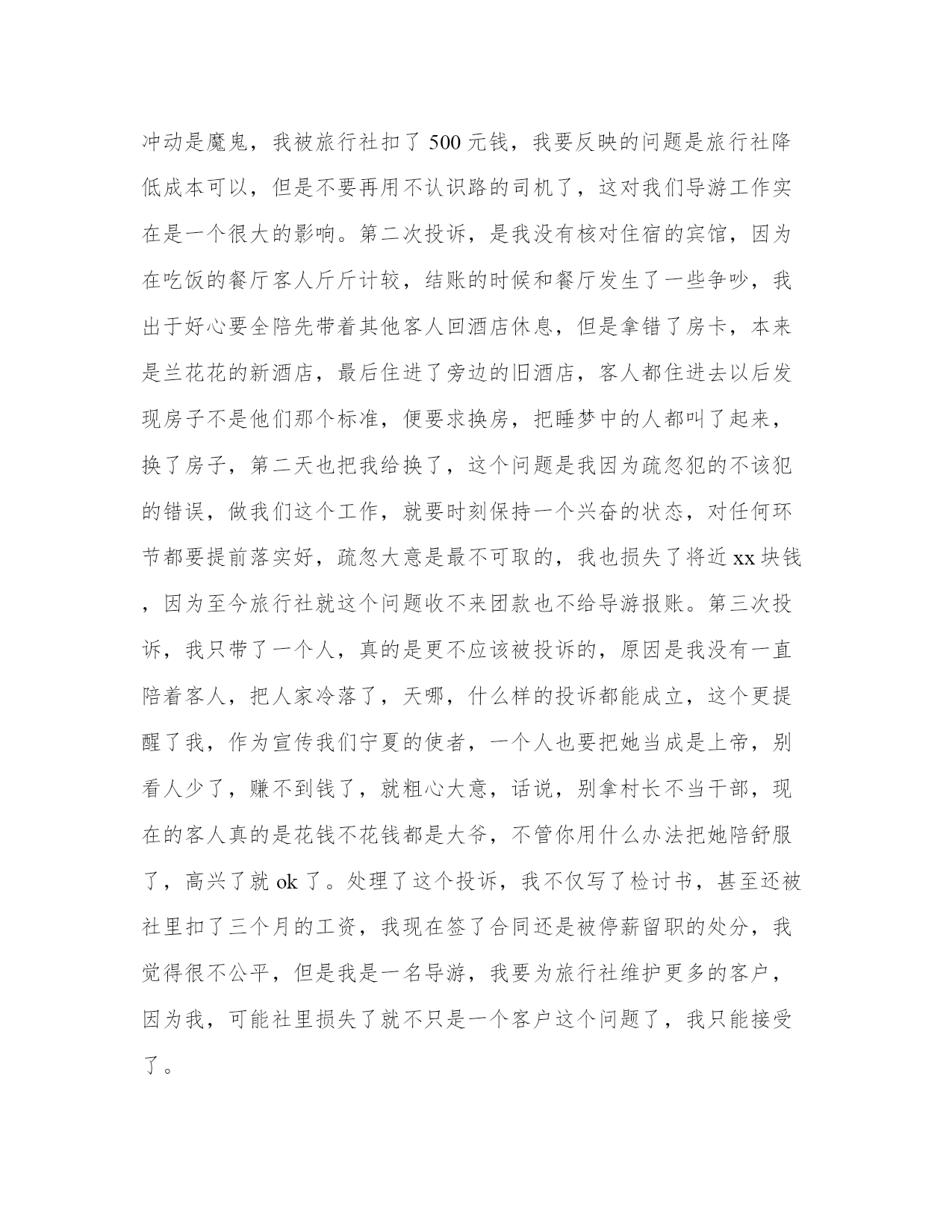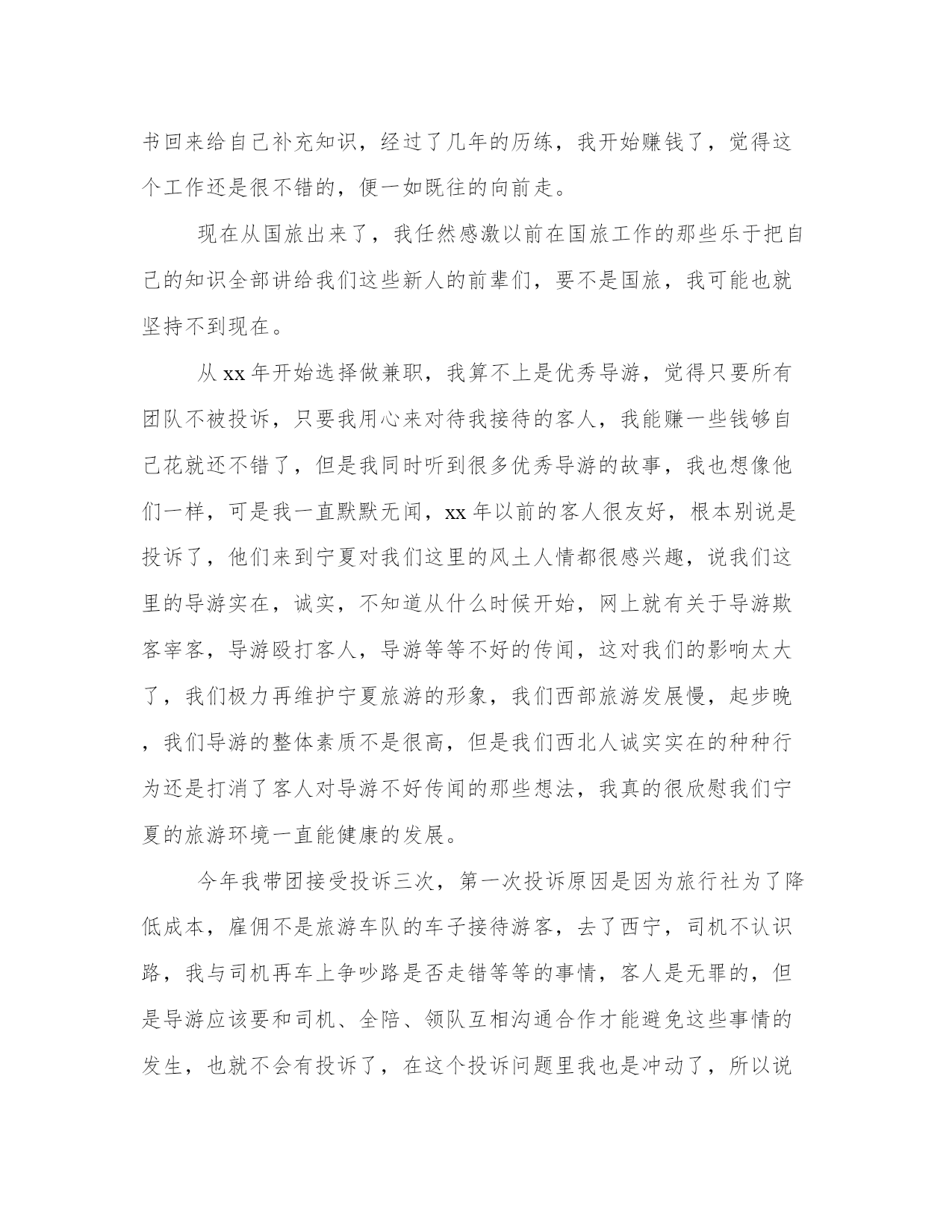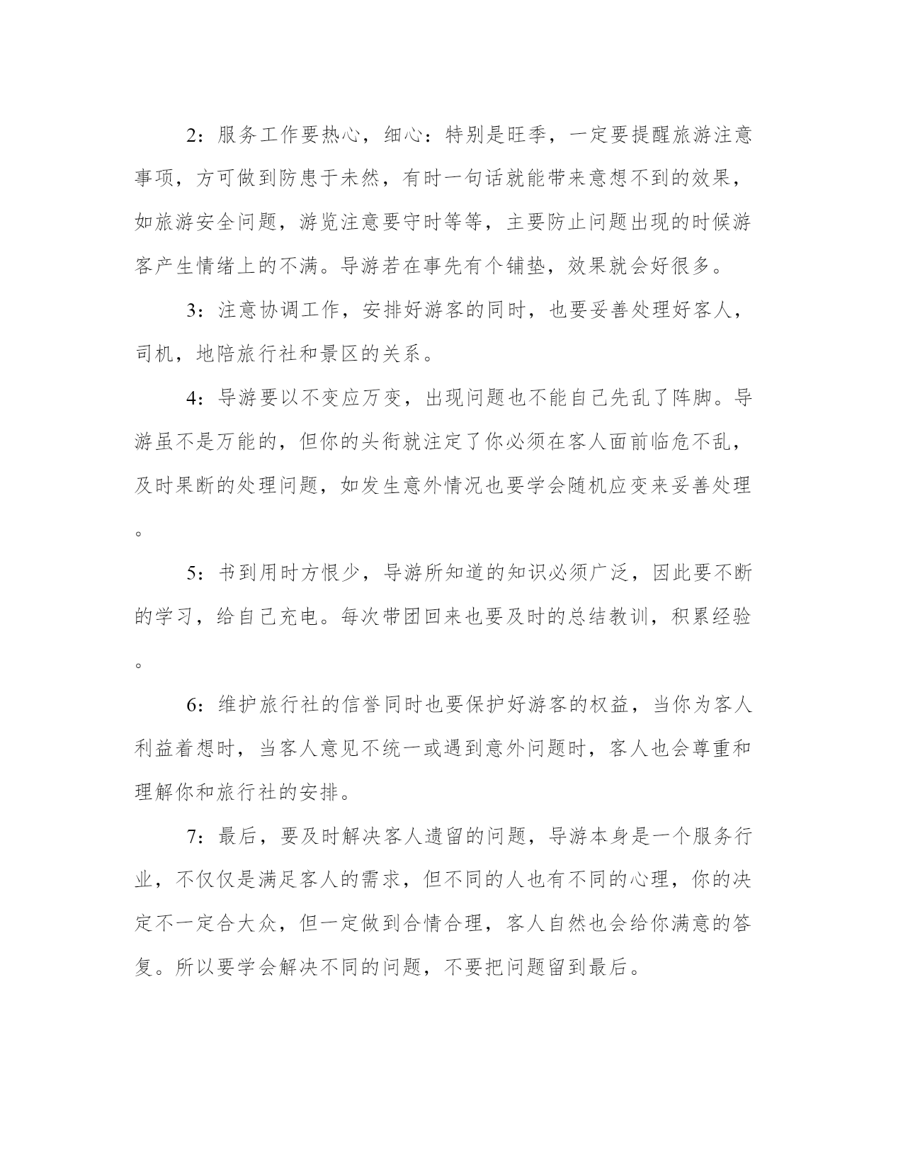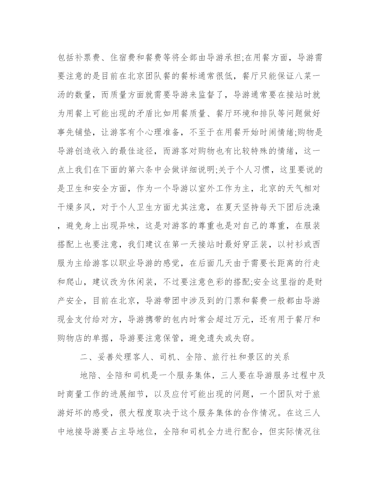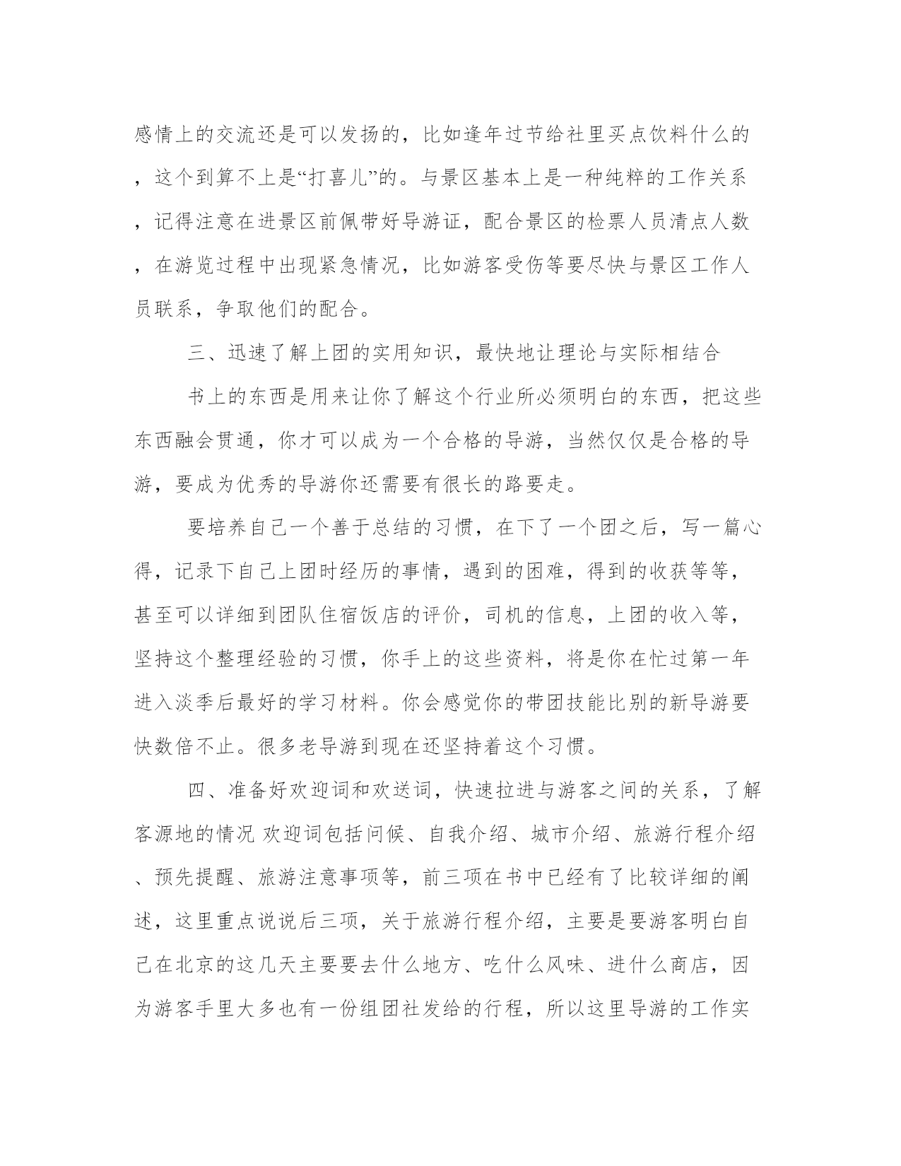 导游带团工作总结带团导游工作总结(大全14篇)总结是对前段社会实践活动进行全面回顾、检查的文种,这决定了总结有很强的客观性特征。写总结的时候需要注意什么呢?有哪些格式需要注意呢?那么下面我就给大家讲一讲总结怎么写才比较好,我们一起来看一看吧。导游带团工作总结篇一下面是由本站小编为大家精心整理的带团导游工作总结,欢迎阅读。如需了解更多带团导游工作总结内容,请继续关注本站工作总结栏目。带团导游工作总结(一)掐指一算做导游已2年有余,其间有酸也有甜。曾经试图放弃,却有千般理由选择继续,为了继续而毅然选择加入**旅游总公司,希望自己理想的翅膀再次飞翔。接下来200x年五月的时候带了一次青岛团,由于这次准备并不是很充分,又加上一些主观和客观的原因使自己对这次带团真的很有挫折感,不过,也让我学习到了怎么处理问题,面临问题时要临危不乱,以下是我带团来的大致小结:1:熟悉线路:团前准备一定要充分,线路熟记于心,多请教老导游,但也并不能轻信别人的提议,要做到有把握,有依据,才能万无一失。2:服务工作要热心,细心:特别是旺季,一定要提醒旅游注意事项,方可做到防患于未然,有时一句话就能带来意想不到的效果,如旅游安全问题,游览注意要守时等等,主要防止问题出现的时候游客产生情绪上的不满。导游若在事先有个铺垫,效果就会好很多。3:注意协调工作,安排好游客的同时,也要妥善处理好客人,司机,地陪旅行社和景区的关系。4:导游要以不变应万变,出现问题也不能自己先乱了阵脚。导游虽不是万能的,但你的头衔就注定了你必须在客人面前临危不乱,及时果断的处理问题,如发生意外情况也要学会随机应变来妥善处理。5:书到用时方恨少,导游所知道的知识必须广泛,因此要不断的学习,给自己充电。每次带团回来也要及时的总结教训,积累经验。6:维护旅行社的信誉同时也要保护好游客的权益,当你为客人利益着想时,当客人意见不统一或遇到意外问题时,客人也会尊重和理解你和旅行社的安排。7:最后,要及时解决客人遗留的问题,导游本身是一个服务行业,不仅仅是满足客人的需求,但不同的人也有不同的心理,你的决定不一定合大众,但一定做到合情合理,客人自然也会给你满意的答复。所以要学会解决不同的问题,不要把问题留到最后。时间已消逝,我愿把每次大大小小的经历都看成是第一次来认真对待!“路漫漫其修远兮”也许可以回头看看留下的脚印。年轻的我要不断的告诉自己“革命尚未成功,同志仍需努力”!,困难经历了,但经验却留下了。带团总是不可避免要遇到三多(人多\车多\压力多),作为导游就要做到三心(多一份细心,多一份小心,多一份诚心)细心:旅游景点环境杂,作为导游比平常要更多一份细心眼观六路,耳听八方,尽量将客人控制在自己的视力范围内,随时提醒客人归队。耐心:在游览之前必须将团队的游览之前必须将团队的游览路线,集合时间地点再三强调,以防客人一旦走失可以迅速归队。初到一地大家充满新鲜感会不停“单溜”,这时导游要耐心而迅速的劝客人归队。诚心:带团随时随地会发生突发事件,导游要用一百分的诚心去解决,事情终会得以化解。我付出,我努力!总相信“一份耕耘,一份收获”!带团导游工作总结(二)今年的导游培训课可以说是让我学到和看到了别人的光环还有光环背后的辛苦,我深深的知道,做我们这个行业的,起早贪黑,有的时候甚至连个可口的'饭菜都吃不上,还要带着客人游山玩水的心情,都说付出和收入是成正比的,但是在我们这个旅游的潜规则的带领下,哪里公平?没有稳定的收入,没有固定的工作,没有保障,那一天出了任何事故都找不到人给你赔偿,但是因为个人喜欢这个职业,也热爱这个工作,一直坚持到现在,也是今年才找到组织,希望在明年会有好的发展吧!说说我的带团经历吧!说实话,没啥值得炫耀的经验,只能说是一种互相学习吧!从xx年拿上导游证的这一刻,我觉得自己是个导游工我知道自己必须充实自己,多学习,才能够很快进入到这个行业,第二个工作单位,我去了之后只是让我看资料啊,学习,也没有让我带团,我觉得自己很没用,正好赶上旅游旺季到来,导游全部都出外带团了,社里让我带团,去的第一个地方是六盘山,是要我把团带到固原和那边的导游交接工作,呵呵,真的很生气,我觉得自己完全可以全部带完,然而单位出于团队质量的问题,毅然要求我帮那个导游把她带的客人接回来,这就是我开始了导游生涯的第一个团队,客人都很好,我上车虽然很紧张,但是大家互动唱歌以后就缓解了那种紧张的空气,也锻炼了我的胆量,虽然没有完整的带完这个团队,我其实还是很感谢旅行社的领导,让我出团了,但是这份工作工资收入太低,我没坚持很久就不干了。第三份工作,那就是进入国旅的那一年,对我的培养和锻炼,让我正式加入了宁夏地接导游的队伍,我也认识了比我年长一些的导游前辈,我很荣幸,社里一系列的培训,让我很快