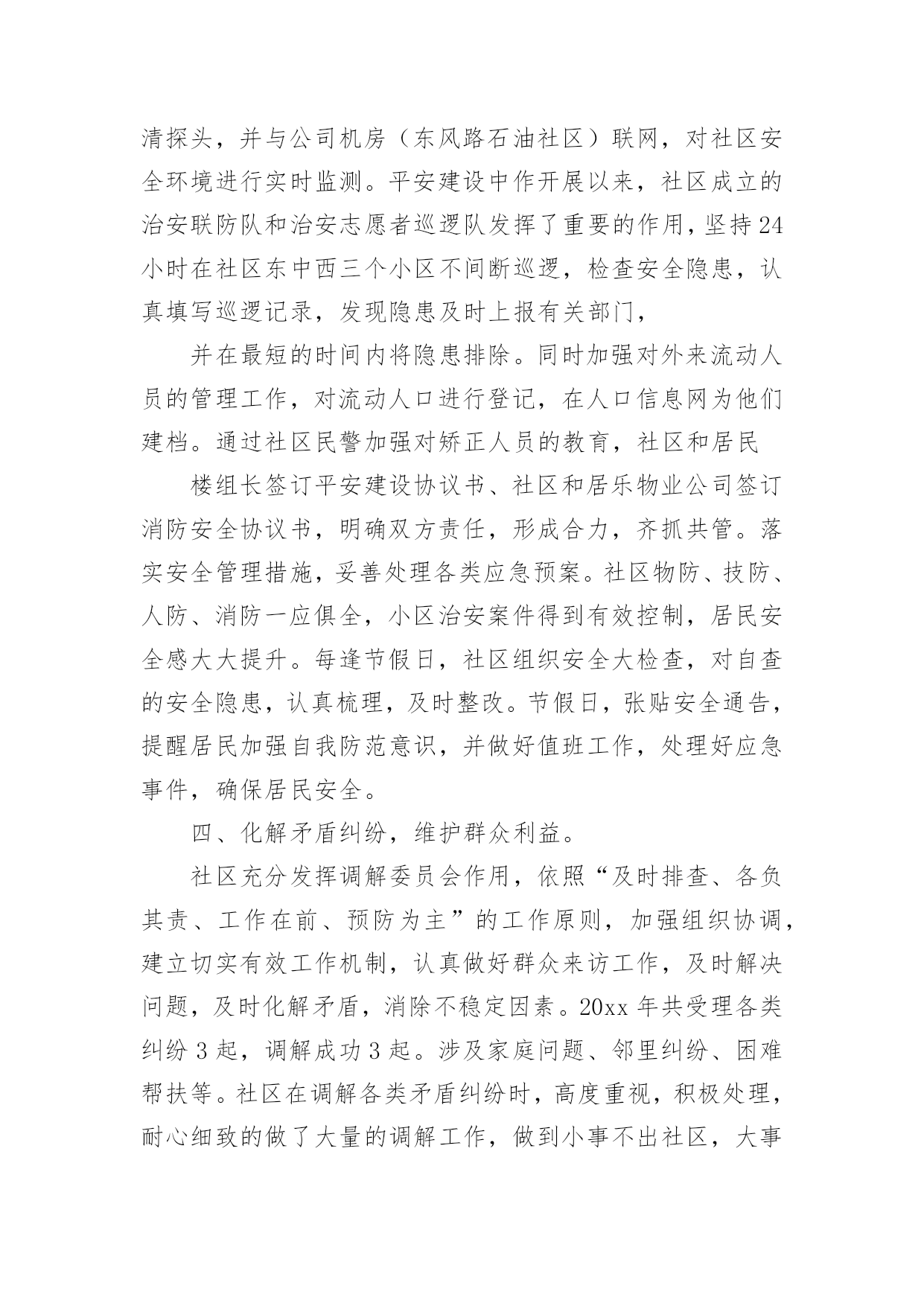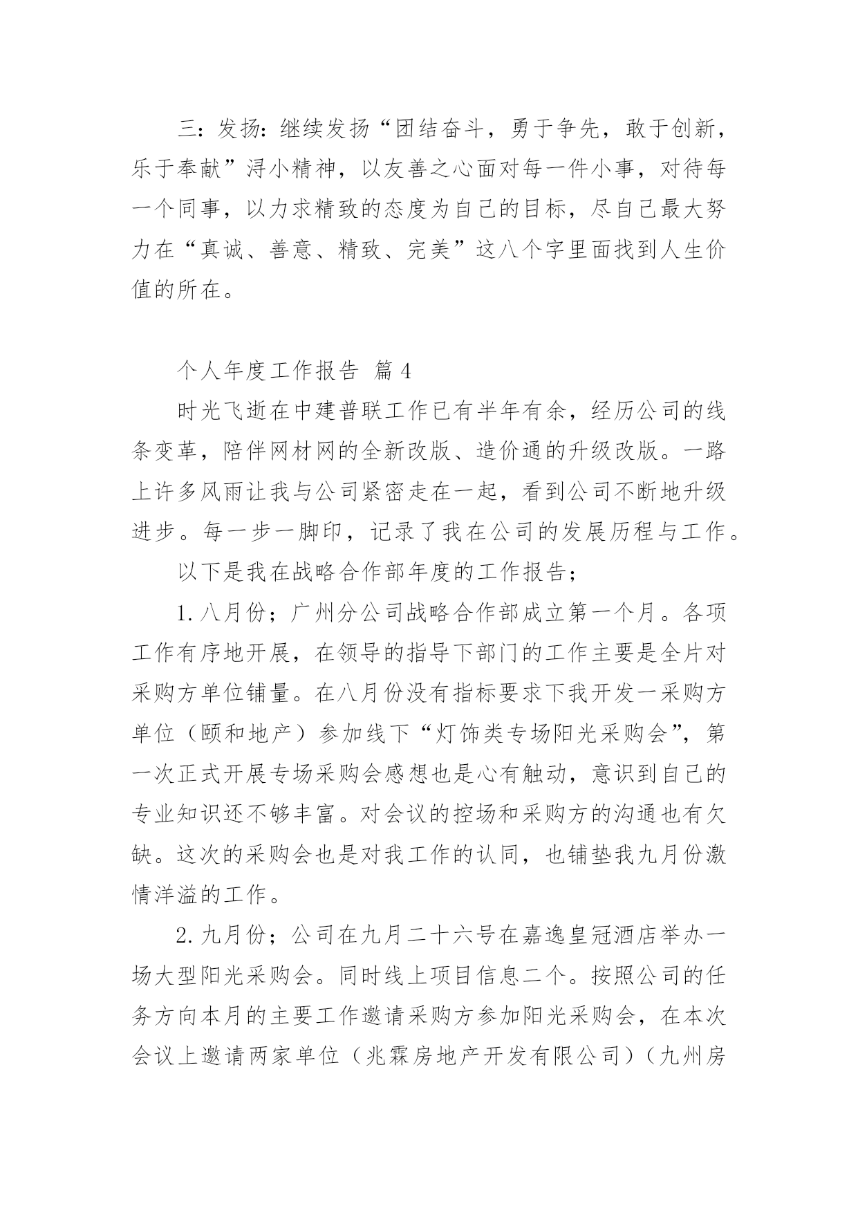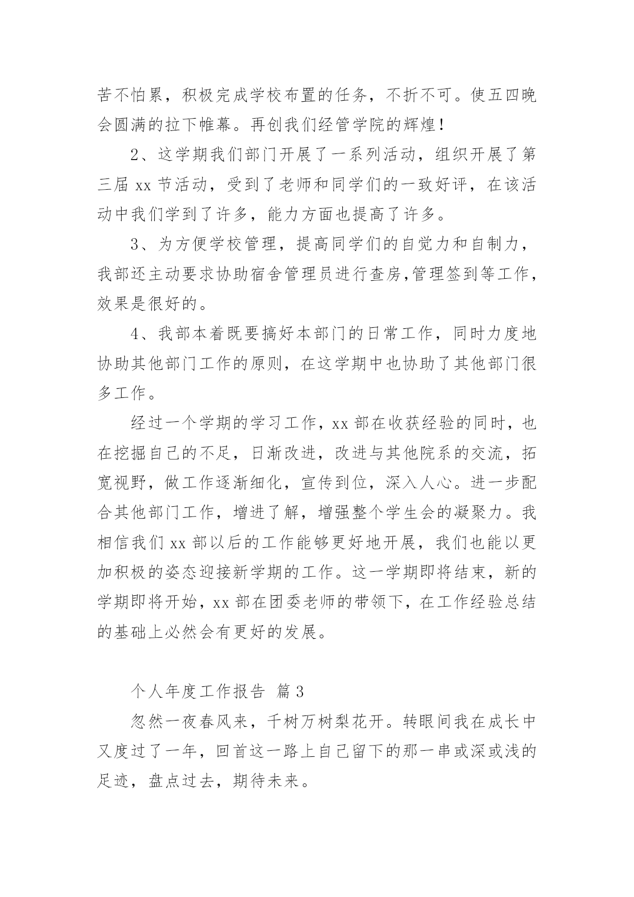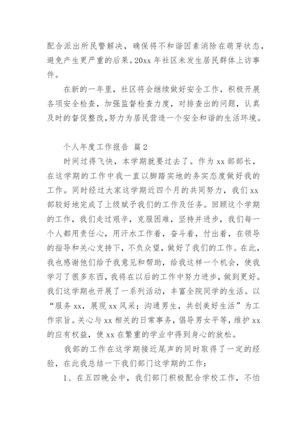 个人年度工作报告个人年度工作报告13篇在日常生活和工作中,报告与我们的生活紧密相连,我们在写报告的时候要注意涵盖报告的基本要素。你知道怎样写报告才能写的好吗?以下是小编为大家整理的个人年度工作报告,欢迎大家分享。个人年度工作报告篇120xx年石油东山社区“两委会”按照市区镇宝石机械公司社区安全的相关文件精神和要求,认真贯彻落实,现将20xx年社区安全工作总结如下:一、加强领导,落实责任。为了将社区安全工作切实落到实处,社区专门成立了以党支部书记赵军杰为组长,居委会主任孟庆华、副主任王文祥为副组长的平安建设领导小组,副主任雷西省同志具体分管安全工作,明确责任,加强协调。健全和完善社区平安建设长效机制,努力营造和谐稳定的社会环境。二、加强宣传,营造氛围。三、完善工作机制,形成群防群治。社区在开展平安创建工作过程中,完善人防技防物防网络,20xx年借助宝石机械公司创建全国安全社区这一契机,在公司矿服的大力支持下,将社区的监控探头全部更换为高清探头,并与公司机房(东风路石油社区)联网,对社区安全环境进行实时监测。平安建设中作开展以来,社区成立的治安联防队和治安志愿者巡逻队发挥了重要的作用,坚持24小时在社区东中西三个小区不间断巡逻,检查安全隐患,认真填写巡逻记录,发现隐患及时上报有关部门,并在最短的时间内将隐患排除。同时加强对外来流动人员的管理工作,对流动人口进行登记,在人口信息网为他们建档。通过社区民警加强对矫正人员的教育,社区和居民楼组长签订平安建设协议书、社区和居乐物业公司签订消防安全协议书,明确双方责任,形成合力,齐抓共管。落实安全管理措施,妥善处理各类应急预案。社区物防、技防、人防、消防一应俱全,小区治安案件得到有效控制,居民安全感大大提升。每逢节假日,社区组织安全大检查,对自查的安全隐患,认真梳理,及时整改。节假日,张贴安全通告,提醒居民加强自我防范意识,并做好值班工作,处理好应急事件,确保居民安全。四、化解矛盾纠纷,维护群众利益。社区充分发挥调解委员会作用,依照“及时排查、各负其责、工作在前、预防为主”的工作原则,加强组织协调,建立切实有效工作机制,认真做好群众来访工作,及时解决问题,及时化解矛盾,消除不稳定因素。20xx年共受理各类纠纷3起,调解成功3起。涉及家庭问题、邻里纠纷、困难帮扶等。社区在调解各类矛盾纠纷时,高度重视,积极处理,耐心细致的做了大量的调解工作,做到小事不出社区,大事配合派出所民警解决,确保将不和谐因素消除在萌芽状态,避免产生更严重的后果。20xx年社区未发生居民群体上访事件。在新的一年里,社区将会继续做好安全工作,积极开展各项安全检查,加强监督检查力度,对排查出的问题,认真及时的督促整改,努力为居民营造一个安全和谐的生活环境。个人年度工作报告篇2时间过得飞快,本学期就要过去了。作为xx部部长,在这学期的工作中我一直以脚踏实地的务实态度做好我的工作。同时经过大家这学期近四个月的共同努力,我们xx部较好地完成了上级赋予我们的工作及任务。回顾这个学期的工作,我们走过艰辛,克服困难,坚持并进步,我们每一个人都用责任心,用汗水工作着,奋斗着,付出着,在领导的指导和关心支持下,不负众望,做好了我们的工作。在此,我也感谢他们给予我意见和帮助,给我这样一个机会,使我学习了很多东西,我将在以后的工作中努力进步,做到更好。我们这学期也开展了一系列活动,丰富全院同学的生活。以“服务xx,展现xx风采;沟通男生,共创美好生活”为工作宗旨。关心与xx相关的日常事务,倡导男女平等,维护xx的应有权益,使xx在繁重的学业中得到身心的放松。我部的工作在这学期接近尾声的同时取得了一定的经验,在此我总结一下我们部门这学期的工作:1、在五四晚会中,我们部门积极配合学校工作,不怕苦不怕累,积极完成学校布置的任务,不折不可。使五四晚会圆满的拉下帷幕。再创我们经管学院的辉煌!2、这学期我们部门开展了一系列活动,组织开展了第三届xx节活动,受到了老师和同学们的一致好评,在该活动中我们学到了许多,能力方面也提高了许多。3、为方便学校管理,提高同学们的自觉力和自制力,我部还主动要求协助宿舍管理员进行查房,管理签到等工作,效果是很好的。4、我部本着既要搞好本部门的日常工作,同时力度地协助其他部门工作的原则,在这学期中也协助了其他部门很多工作。经过一个学期的学习工作,xx部在收获经验的同时,也在挖掘自己的不足,日渐改进,改进与其他院系的交流,拓宽视野,做工作逐渐细化,宣传到位,深入人心。进一步配合其他部门工作,增进了解,增强整个学生会的凝聚力。我相信我们xx部以后的工作能够更好地开展,我们也能以更加积极的姿态迎接新学期的工作。这一学期即将结束,新的学期即将开始,xx部在团委老师的带领下,在工作经验总结的基础上必然会有更好的发展。个人年度工作报告篇