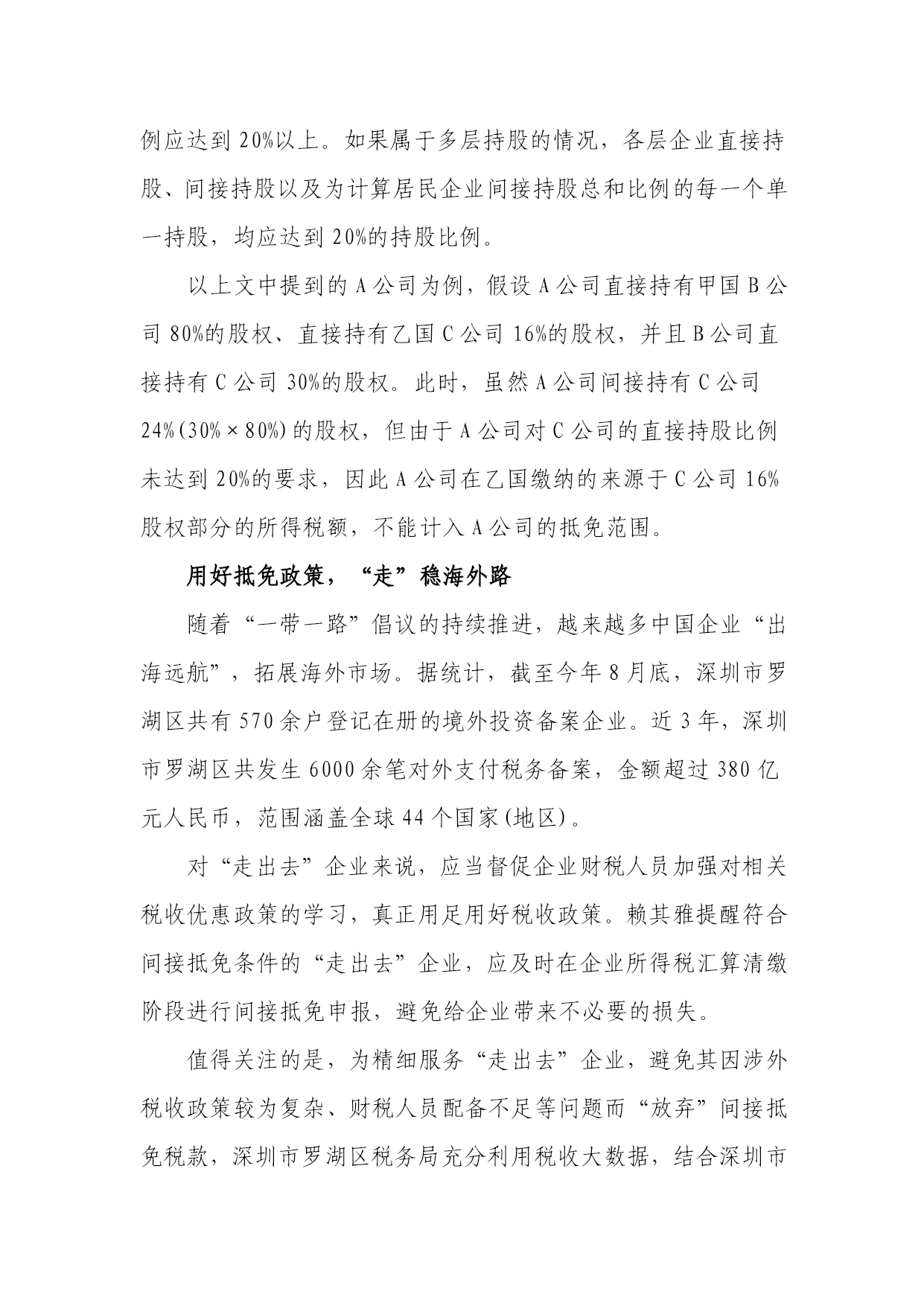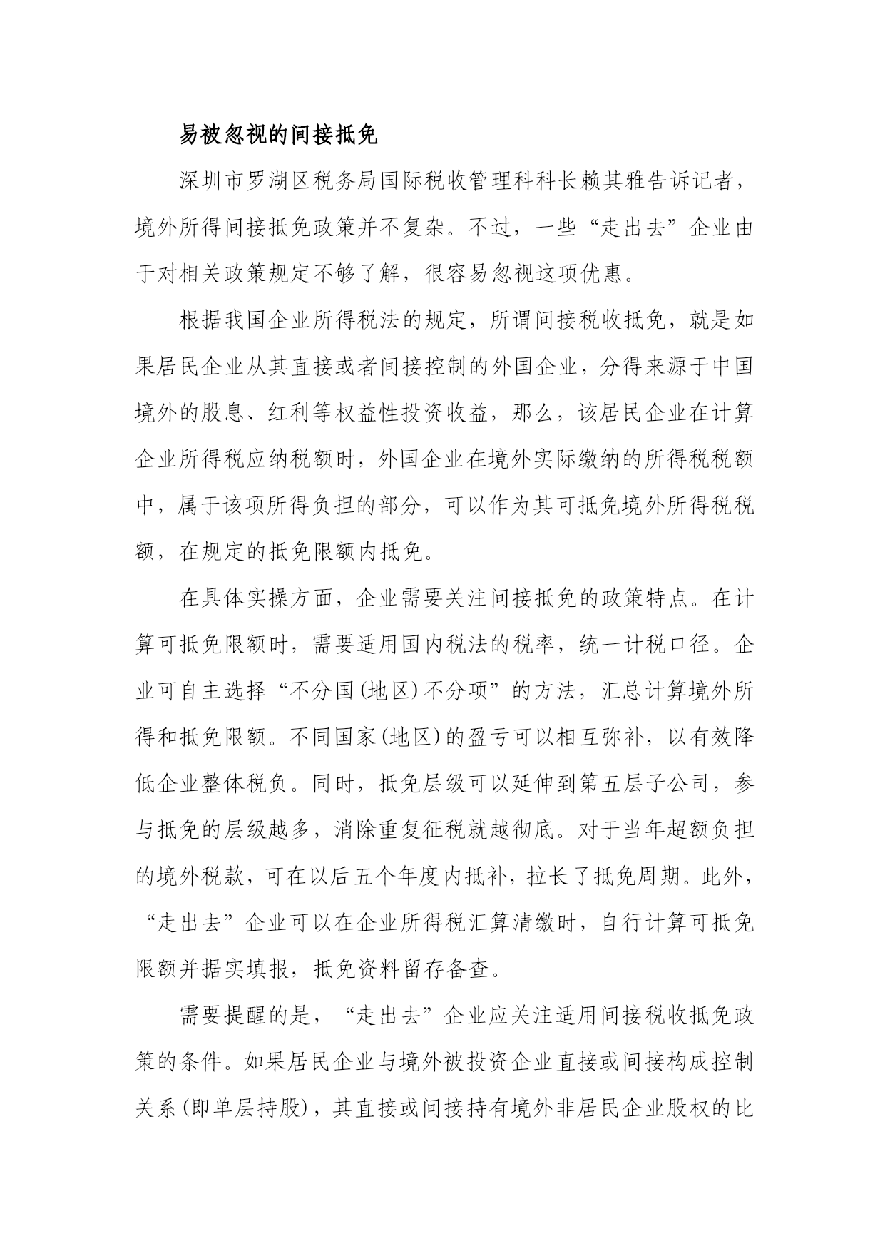 境外投资:不可忽视间接抵免政策摘要:境外所得税收抵免,指企业取得境外所得并在境外直接缴纳或间接负担的企业所得税性质的税额,可以从其国内应纳所得税额中抵免。窗体底端境外所得税收抵免,指企业取得境外所得并在境外直接缴纳或间接负担的企业所得税性质的税额,可以从其国内应纳所得税额中抵免。境外所得税收抵免包括直接抵免和间接抵免,可以消除国际重复征税,有效降低我国“走出去”企业的税负。笔者在工作中发现,一些“走出去”企业由于对间接抵免政策理解不到位,导致其“放弃”了间接抵免,增加了企业的税收成本。不该“放弃”的税收优惠A公司位于深圳市罗湖区,是一家从事跨境贸易的“走出去”企业。近些年,A公司陆续从其新西兰下属子公司取得股息分红。国家税务总局深圳市罗湖区税务局在进行企业所得税汇算清缴数据筛查时,发现A公司2018年、2019年均存在境外股息红利所得的数据,但是在其申报的境外所得可抵免的所得税额中,却没有包含间接负担的所得税额。在与A公司进一步沟通后,税务干部了解到,由于企业财务人员对间接抵免政策了解不足,没有就新西兰子公司间接负担的所得税额进行抵免申报。在税务干部的辅导下,A公司重新计算了2018年、2019年间接负担部分可抵免的税额,并进行了企业所得税补申报,成功确认130多万元的税收抵免额。易被忽视的间接抵免深圳市罗湖区税务局国际税收管理科科长赖其雅告诉记者,境外所得间接抵免政策并不复杂。不过,一些“走出去”企业由于对相关政策规定不够了解,很容易忽视这项优惠。根据我国HYPERLINK"https://www.shui5.cn/article/ff/125031.html"企业所得税法的规定,所谓间接税收抵免,就是如果居民企业从其直接或者间接控制的外国企业,分得来源于中国境外的股息、红利等权益性投资收益,那么,该居民企业在计算企业所得税应纳税额时,外国企业在境外实际缴纳的所得税税额中,属于该项所得负担的部分,可以作为其可抵免境外所得税税额,在规定的抵免限额内抵免。在具体实操方面,企业需要关注间接抵免的政策特点。在计算可抵免限额时,需要适用国内税法的税率,统一计税口径。企业可自主选择“不分国(地区)不分项”的方法,汇总计算境外所得和抵免限额。不同国家(地区)的盈亏可以相互弥补,以有效降低企业整体税负。同时,抵免层级可以延伸到第五层子公司,参与抵免的层级越多,消除重复征税就越彻底。对于当年超额负担的境外税款,可在以后五个年度内抵补,拉长了抵免周期。此外,“走出去”企业可以在企业所得税汇算清缴时,自行计算可抵免限额并据实填报,抵免资料留存备查。需要提醒的是,“走出去”企业应关注适用间接税收抵免政策的条件。如果居民企业与境外被投资企业直接或间接构成控制关系(即单层持股),其直接或间接持有境外非居民企业股权的比例应达到20%以上。如果属于多层持股的情况,各层企业直接持股、间接持股以及为计算居民企业间接持股总和比例的每一个单一持股,均应达到20%的持股比例。以上文中提到的A公司为例,假设A公司直接持有甲国B公司80%的股权、直接持有乙国C公司16%的股权,并且B公司直接持有C公司30%的股权。此时,虽然A公司间接持有C公司24%(30%×80%)的股权,但由于A公司对C公司的直接持股比例未达到20%的要求,因此A公司在乙国缴纳的来源于C公司16%股权部分的所得税额,不能计入A公司的抵免范围。用好抵免政策,“走”稳海外路随着“一带一路”倡议的持续推进,越来越多中国企业“出海远航”,拓展海外市场。据统计,截至今年8月底,深圳市罗湖区共有570余户登记在册的境外投资备案企业。近3年,深圳市罗湖区共发生6000余笔对外支付税务备案,金额超过380亿元人民币,范围涵盖全球44个国家(地区)。对“走出去”企业来说,应当督促企业财税人员加强对相关税收优惠政策的学习,真正用足用好税收政策。赖其雅提醒符合间接抵免条件的“走出去”企业,应及时在企业所得税汇算清缴阶段进行间接抵免申报,避免给企业带来不必要的损失。值得关注的是,为精细服务“走出去”企业,避免其因涉外税收政策较为复杂、财税人员配备不足等问题而“放弃”间接抵免税款,深圳市罗湖区税务局充分利用税收大数据,结合深圳市商务局提供的对外投资第三方信息,筛选符合间接抵免条件的“走出去”企业,建立“一户式”管理台账,为企业及时送上税收政策红利,支持“走出去”企业轻装上阵。据了解,深圳市罗湖区税务局已于近期为11家“走出去”企业办理间接抵免业务,抵免国内企业所得税税款650多万元。深圳市罗湖区税务局总会计师郭庆表示,接下来,该局将通过第三方数据比对、编印《间接抵免税收指引》等方式,把间接抵免政策服务做精做细。郭庆同时建议“走出去”企业财税人员,积极关注间接税收抵免政策的动态,准确合规
