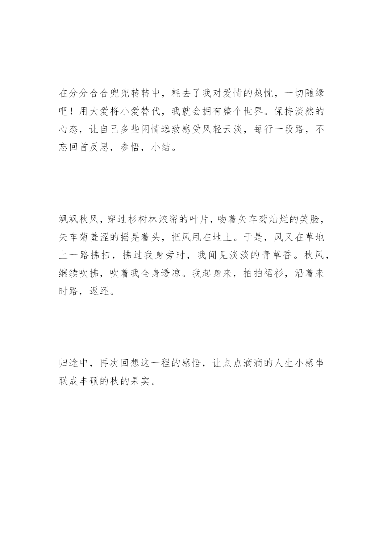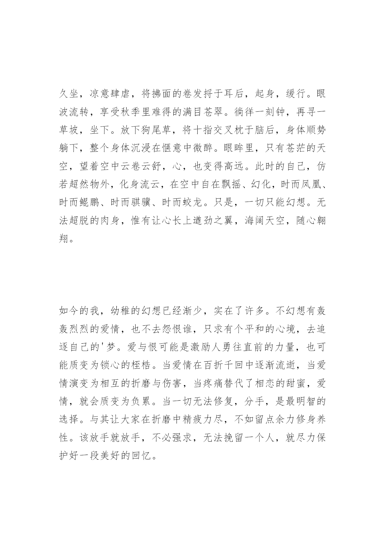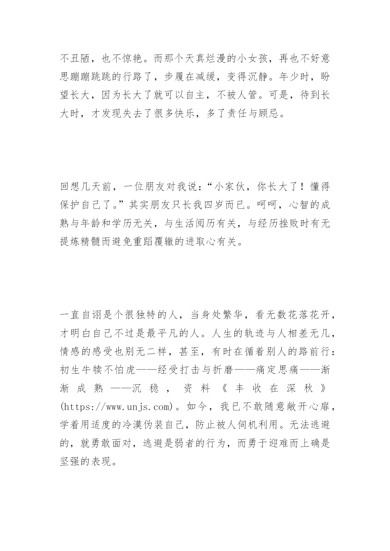 丰收在深秋-资料秋,渐凉,丰收在深秋。云漠漠,风瑟瑟。我右手摸着公路的围栏,步履从容的在平坦的人行道上漫步。围栏外,田野里的稻穗黄了,丰收在即,些许慨叹自我心底油然而生:一草一木,一春一秋,逐年递嬗,催人年华渐老。步履辗转,踏入一片广阔的芳草地。草地边缘杉树林立,起伏的草坡上种着数行矢车菊,矢车菊些微零乱的枝干上,花朵正艳,在秋风中楚楚摇曳。其余处,碧草萋萋。芳草地清新荡漾,随风沁脾,令人心神清爽。我脱去鞋子,赤脚踏上青草,草儿尽显柔情,绵绵软软的亲吻着我的脚底,丝丝凉意从脚底渗入心尖,令我气定神闲。舒畅的呼出一口气,缓步走向花儿,寻一处草厚的地方,将裙摆收拢,弯腰屈膝,落座草地上。随手抽取一条夹杂在花丛中的狗尾草,拈在指尖,手肘靠膝,漫不经心的转动草儿,凝视它摇尾的动感。记得我小时候,狗尾草就是这般,那时,我爱攫着狗尾草一边甩画圆圈,一边蹦蹦跳跳的向前行,跳动间,后脑勺的马尾也跟着左右摇摆。到如今,二十多年过去了,狗尾草依然,不丑陋,也不惊艳。而那个天真烂漫的小女孩,再也不好意思蹦蹦跳跳的行路了,步履在减缓,变得沉静。年少时,盼望长大,因为长大了就可以自主,不被人管。可是,待到长大时,才发现失去了很多快乐,多了责任与顾忌。回想几天前,一位朋友对我说:“小家伙,你长大了!懂得保护自己了。”其实朋友只长我四岁而已。呵呵,心智的成熟与年龄和学历无关,与生活阅历有关,与经历挫败时有无提炼精髓而避免重蹈覆辙的进取心有关。一直自诩是个很独特的人,当身处繁华,看无数花落花开,才明白自己不过是最平凡的人。人生的轨迹与人相差无几,情感的感受也别无二样,甚至,有时在循着别人的路前行:初生牛犊不怕虎——经受打击与折磨——痛定思痛——渐渐成熟——沉稳,资料《丰收在深秋》(https://www.unjs.com)。如今,我已不敢随意敞开心扉,学着用适度的冷漠伪装自己,防止被人伺机利用。无法逃避的,就勇敢面对,逃避是弱者的行为,而勇于迎难而上确是坚强的表现。久坐,凉意肆虐,将拂面的卷发捋于耳后,起身,缓行。眼波流转,享受秋季里难得的满目苍翠。徜徉一刻钟,再寻一草坡,坐下。放下狗尾草,将十指交叉枕于脑后,身体顺势躺下,整个身体沉浸在惬意中微醉。眼眸里,只有苍茫的天空,望着空中云卷云舒,心,也变得高远。此时的自己,仿若超然物外,化身流云,在空中自在飘摇、幻化,时而凤凰、时而鲲鹏、时而骐骥、时而蛟龙。只是,一切只能幻想。无法超脱的肉身,惟有让心长上遒劲之翼,海阔天空,随心翱翔。如今的我,幼稚的幻想已经渐少,实在了许多。不幻想有轰轰烈烈的爱情,也不去怨恨谁,只求有个平和的心境,去追逐自己的'梦。爱与恨可能是激励人勇往直前的力量,也可能质变为锁心的桎梏。当爱情在百折千回中逐渐流逝,当爱情演变为相互的折磨与伤害,当疼痛替代了相恋的甜蜜,爱情,就会质变为负累。当一切无法修复,分手,是最明智的选择。与其让大家在折磨中精疲力尽,不如留点余力修身养性。该放手就放手,不必强求,无法挽留一个人,就尽力保护好一段美好的回忆。在分分合合兜兜转转中,耗去了我对爱情的热忱,一切随缘吧!用大爱将小爱替代,我就会拥有整个世界。保持淡然的心态,让自己多些闲情逸致感受风轻云淡,每行一段路,不忘回首反思,参悟,小结。飒飒秋风,穿过杉树林浓密的叶片,吻着矢车菊灿烂的笑脸,矢车菊羞涩的摇晃着头,把风甩在地上。于是,风又在草地上一路拂扫,拂过我身旁时,我闻见淡淡的青草香。秋风,继续吹拂,吹着我全身透凉。我起身来,拍拍裙衫,沿着来时路,返还。归途中,再次回想这一程的感悟,让点点滴滴的人生小感串联成丰硕的秋的果实。