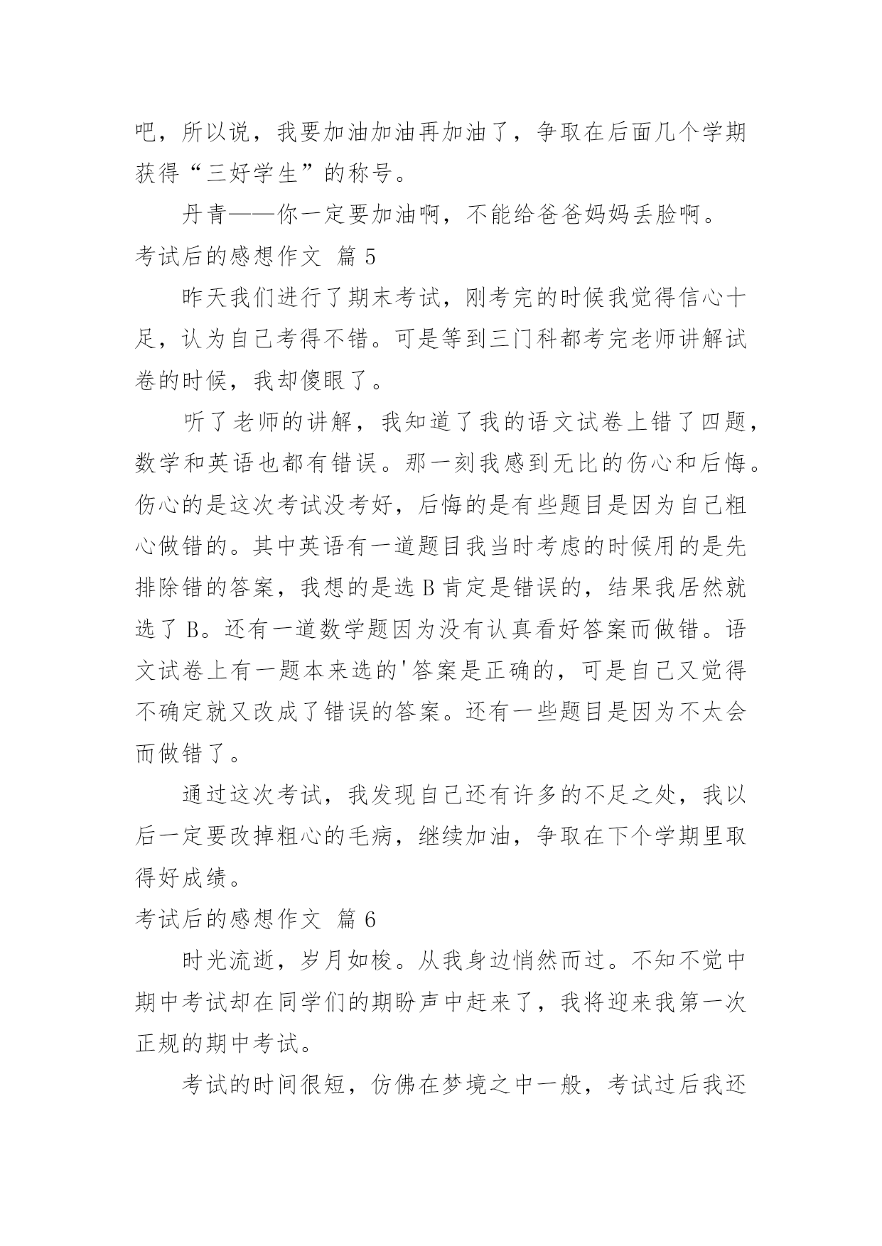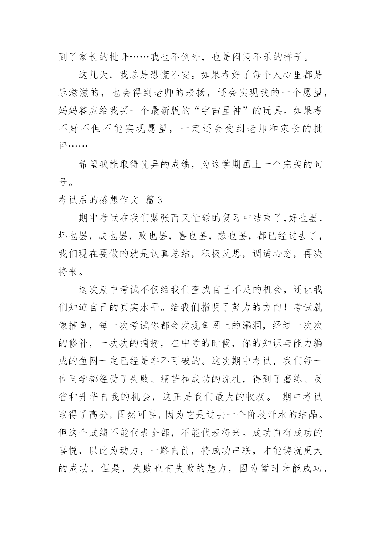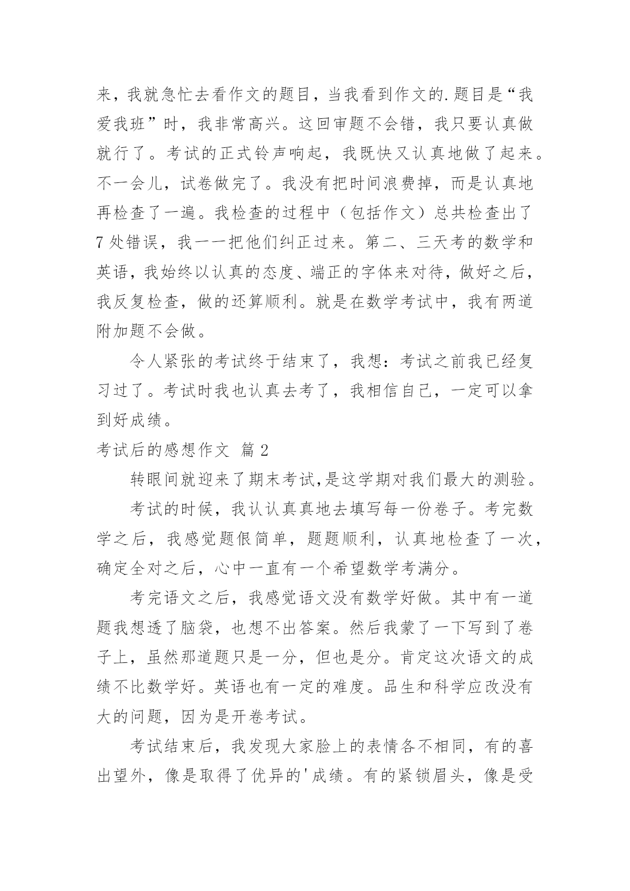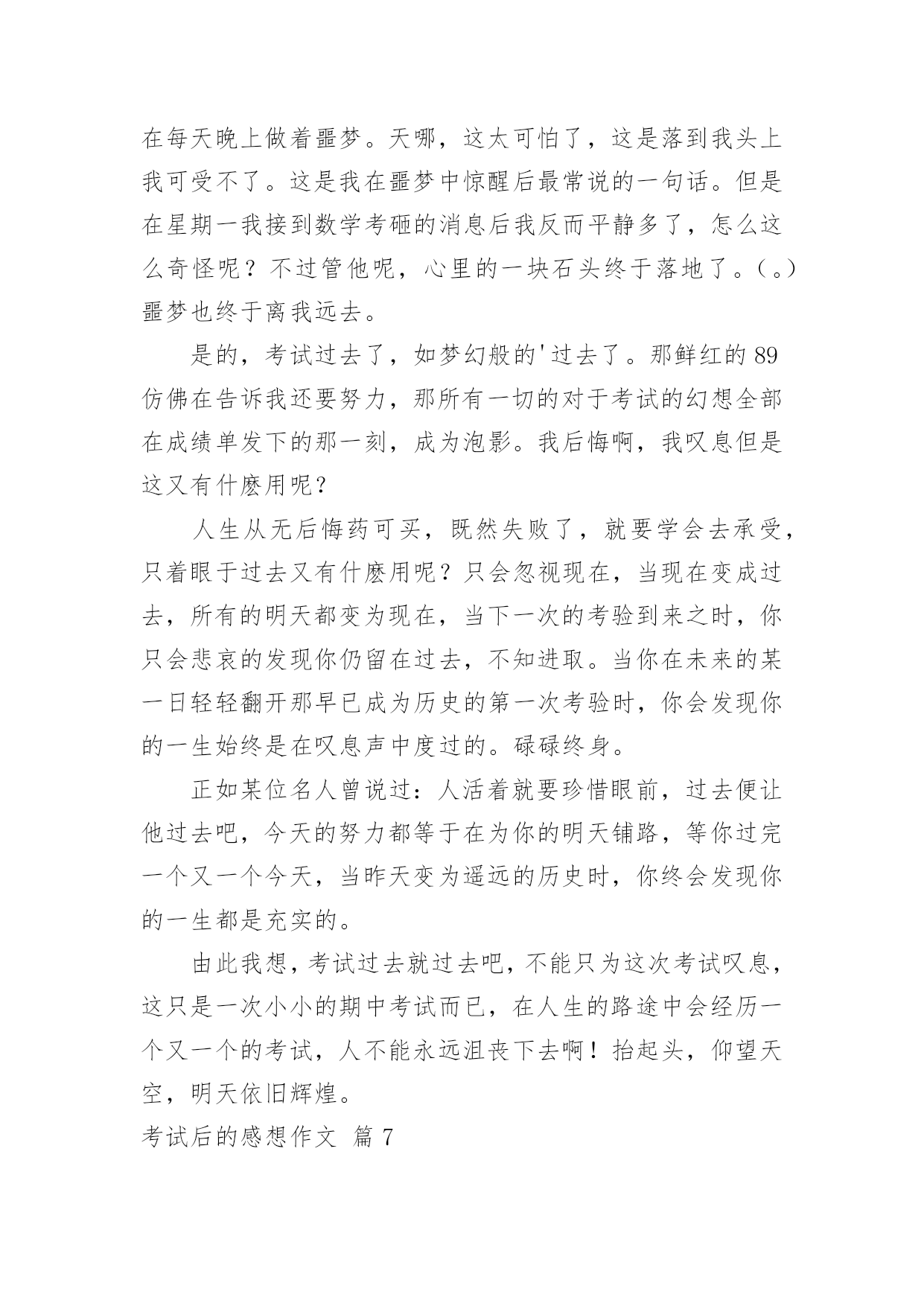 考试后的感想作文[通用]考试后的感想作文7篇在日复一日的学习、工作或生活中,大家都尝试过写作文吧,借助作文可以宣泄心中的情感,调节自己的心情。怎么写作文才能避免踩雷呢?以下是小编帮大家整理的考试后的感想作文7篇,希望能够帮助到大家。考试后的感想作文篇1期中考试已经结束了,我如释重负的舒出了一口气,在考试期间,我产生了许多感想,让我告诉大家吧。考试之前,我很高兴,因为我有一种说不出的感觉:这次我一定能挺进班级前三名。我上一次的月考总分位于班级的第四名。而我绝大多数的错误,都是因为我没有认真做,非常粗心的缘故。在数学考试中,我犯下了许多错误。我应该考100分的,因为这些错误,我只考了92分。而犯的错误不是单个的,例如:单位名称没有写、符号漏了……甚至最厉害的是:有一道解方程题目我竟然没有做!这是多么令人难以相信的事情哪!从一年级到现在,这个毛病一直没有改掉令我十分头疼。语文考试成绩也不佳,只考了73分。失分最多的原因是:作文我审题审错了。应该是“最感动的一件事”,我看成了“一件事”,把“最感动的”漏掉了。考试开始了,我们第一天考的是语文,考试之前我感到很紧张,我害怕作文不会写,因为作文是我的弱项,而我作文平时也写得比较少,每次碰到作文就没辙了。试卷一发下来,我就急忙去看作文的题目,当我看到作文的.题目是“我爱我班”时,我非常高兴。这回审题不会错,我只要认真做就行了。考试的正式铃声响起,我既快又认真地做了起来。不一会儿,试卷做完了。我没有把时间浪费掉,而是认真地再检查了一遍。我检查的过程中(包括作文)总共检查出了7处错误,我一一把他们纠正过来。第二、三天考的数学和英语,我始终以认真的态度、端正的字体来对待,做好之后,我反复检查,做的还算顺利。就是在数学考试中,我有两道附加题不会做。令人紧张的考试终于结束了,我想:考试之前我已经复习过了。考试时我也认真去考了,我相信自己,一定可以拿到好成绩。考试后的感想作文篇2转眼间就迎来了期末考试,是这学期对我们最大的测验。考试的时候,我认认真真地去填写每一份卷子。考完数学之后,我感觉题佷简单,题题顺利,认真地检查了一次,确定全对之后,心中一直有一个希望数学考满分。考完语文之后,我感觉语文没有数学好做。其中有一道题我想透了脑袋,也想不出答案。然后我蒙了一下写到了卷子上,虽然那道题只是一分,但也是分。肯定这次语文的成绩不比数学好。英语也有一定的难度。品生和科学应改没有大的问题,因为是开卷考试。考试结束后,我发现大家脸上的表情各不相同,有的喜出望外,像是取得了优异的'成绩。有的紧锁眉头,像是受到了家长的批评……我也不例外,也是闷闷不乐的样子。这几天,我总是恐慌不安。如果考好了每个人心里都是乐滋滋的,也会得到老师的表扬,还会实现我的一个愿望,妈妈答应给我买一个最新版的“宇宙星神”的玩具。如果考不好不但不能实现愿望,一定还会受到老师和家长的批评……希望我能取得优异的成绩,为这学期画上一个完美的句号。考试后的感想作文篇3期中考试在我们紧张而又忙碌的复习中结束了,好也罢,坏也罢,成也罢,败也罢,喜也罢,愁也罢,都已经过去了,我们现在要做的就是认真总结,积极反思,调适心态,再决将来。这次期中考试不仅给我们查找自己不足的机会,还让我们知道自己的真实水平。给我们指明了努力的方向!考试就像捕鱼,每一次考试你都会发现鱼网上的漏洞,经过一次次的修补,一次次的捕捞,在中考的时候,你的知识与能力编成的鱼网一定已经是牢不可破的。这次期中考试,我们每一位同学都经受了失败、痛苦和成功的洗礼,得到了磨练、反省和升华自我的机会,这正是我们最大的收获。期中考试取得了高分,固然可喜,因为它是过去一个阶段汗水的结晶。但这个成绩不能代表全部,不能代表将来。成功自有成功的喜悦,以此为动力,一路向前,将成功串联,才能铸就更大的成功。但是,失败也有失败的魅力,因为暂时未能成功,我们便有了期待,在努力中期待,在期待中努力,终究会迎来希望的.太阳。成功不是骄傲的资本,失败却是努力的理由。某某人,为了发明某某物,失败多少次,才终于取得最后的成功,不应该只是作文时举例论证的材料。战之能胜是好汉,屡败屡战亦英雄。勤奋着,就是美丽的。期中考试,不管取得怎样的成绩,都要引起我们足够的思考。一要反思我们的学习习惯。上课是否认真听讲,认真笔记?作业是否及时完成,独立完成?是否主动学习,主动钻研?是否注意答题规范,书写整洁?二要反思我们的勤奋度、刻苦度、专注度。学问永远是苦根上长出来的甜果。一切少付出多收获的想法都是不现实的。我们要多自问:面对作业,面对压力,是否怨天尤人?我们的学习,是心无旁骛,穷根究底,还是心猿意马,浅尝辄止?同学们,为了今后,我们要抓紧现在,只有善于总结,才能赢得未来。一次考试并不是句号,更不能代表我们全部的实力。人生道路有风和日丽的日子,也有