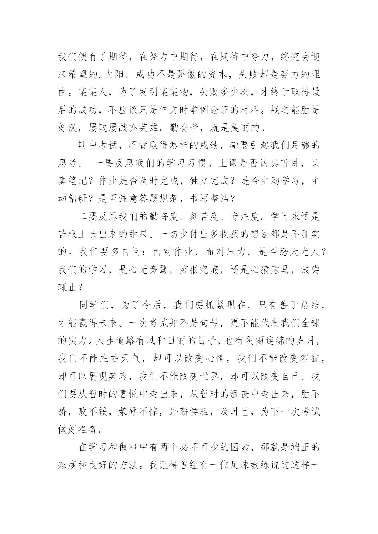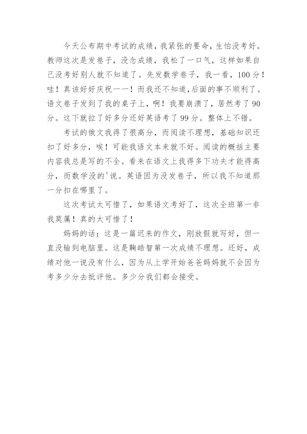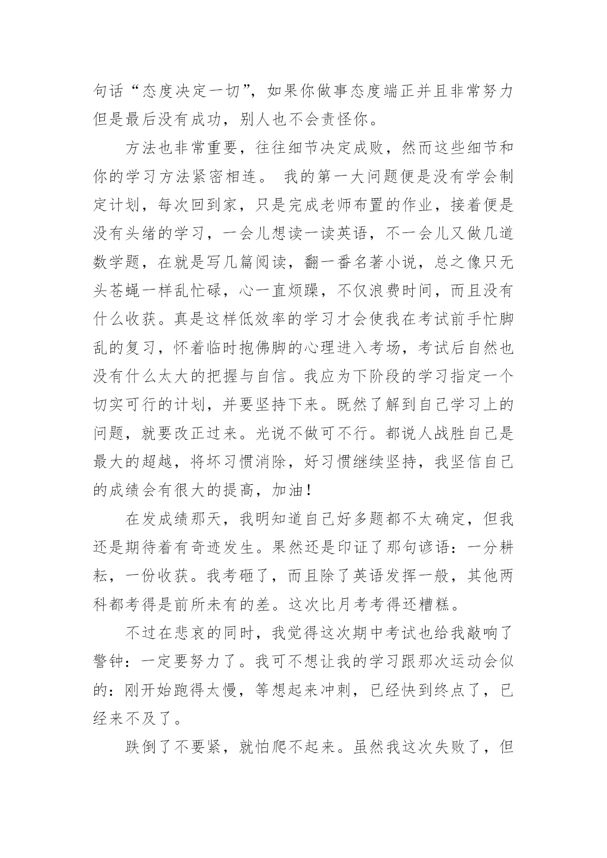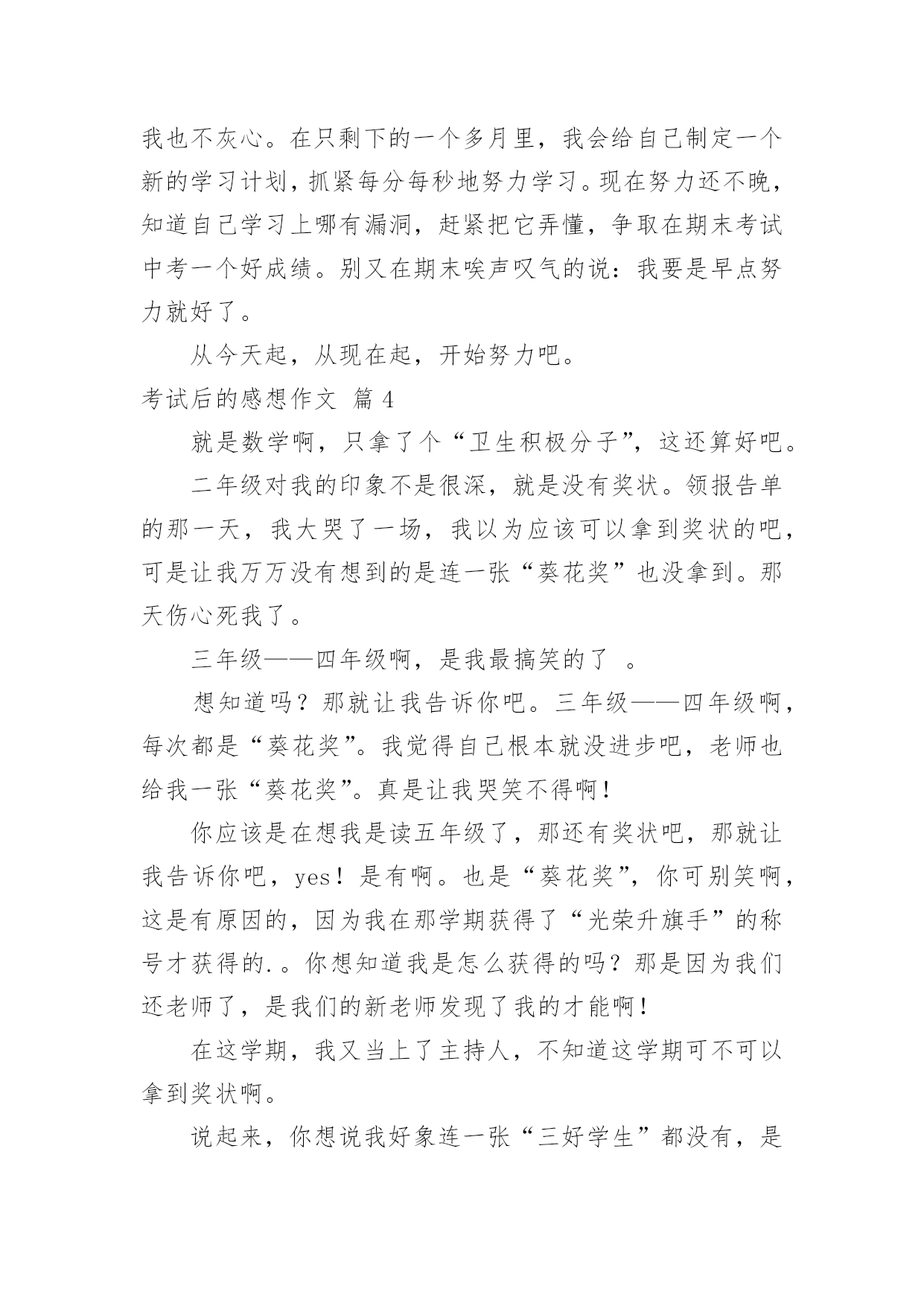 考试后的感想作文[通用]考试后的感想作文7篇在日复一日的学习、工作或生活中,大家都尝试过写作文吧,借助作文可以宣泄心中的情感,调节自己的心情。怎么写作文才能避免踩雷呢?以下是小编帮大家整理的考试后的感想作文7篇,希望能够帮助到大家。考试后的感想作文篇1期中考试已经结束了,我如释重负的舒出了一口气,在考试期间,我产生了许多感想,让我告诉大家吧。考试之前,我很高兴,因为我有一种说不出的感觉:这次我一定能挺进班级前三名。我上一次的月考总分位于班级的第四名。而我绝大多数的错误,都是因为我没有认真做,非常粗心的缘故。在数学考试中,我犯下了许多错误。我应该考100分的,因为这些错误,我只考了92分。而犯的错误不是单个的,例如:单位名称没有写、符号漏了……甚至最厉害的是:有一道解方程题目我竟然没有做!这是多么令人难以相信的事情哪!从一年级到现在,这个毛病一直没有改掉令我十分头疼。语文考试成绩也不佳,只考了73分。失分最多的原因是:作文我审题审错了。应该是“最感动的一件事”,我看成了“一件事”,把“最感动的”漏掉了。考试开始了,我们第一天考的是语文,考试之前我感到很紧张,我害怕作文不会写,因为作文是我的弱项,而我作文平时也写得比较少,每次碰到作文就没辙了。试卷一发下来,我就急忙去看作文的题目,当我看到作文的.题目是“我爱我班”时,我非常高兴。这回审题不会错,我只要认真做就行了。考试的正式铃声响起,我既快又认真地做了起来。不一会儿,试卷做完了。我没有把时间浪费掉,而是认真地再检查了一遍。我检查的过程中(包括作文)总共检查出了7处错误,我一一把他们纠正过来。第二、三天考的数学和英语,我始终以认真的态度、端正的字体来对待,做好之后,我反复检查,做的还算顺利。就是在数学考试中,我有两道附加题不会做。令人紧张的考试终于结束了,我想:考试之前我已经复习过了。考试时我也认真去考了,我相信自己,一定可以拿到好成绩。考试后的感想作文篇2转眼间就迎来了期末考试,是这学期对我们最大的测验。考试的时候,我认认真真地去填写每一份卷子。考完数学之后,我感觉题佷简单,题题顺利,认真地检查了一次,确定全对之后,心中一直有一个希望数学考满分。考完语文之后,我感觉语文没有数学好做。其中有一道题我想透了脑袋,也想不出答案。然后我蒙了一下写到了卷子上,虽然那道题只是一分,但也是分。肯定这次语文的成绩不比数学好。英语也有一定的难度。品生和科学应改没有大的问题,因为是开卷考试。考试结束后,我发现大家脸上的表情各不相同,有的喜出望外,像是取得了优异的'成绩。有的紧锁眉头,像是受到了家长的批评……我也不例外,也是闷闷不乐的样子。这几天,我总是恐慌不安。如果考好了每个人心里都是乐滋滋的,也会得到老师的表扬,还会实现我的一个愿望,妈妈答应给我买一个最新版的“宇宙星神”的玩具。如果考不好不但不能实现愿望,一定还会受到老师和家长的批评……希望我能取得优异的成绩,为这学期画上一个完美的句号。考试后的感想作文篇3期中考试在我们紧张而又忙碌的复习中结束了,好也罢,坏也罢,成也罢,败也罢,喜也罢,愁也罢,都已经过去了,我们现在要做的就是认真总结,积极反思,调适心态,再决将来。这次期中考试不仅给我们查找自己不足的机会,还让我们知道自己的真实水平。给我们指明了努力的方向!考试就像捕鱼,每一次考试你都会发现鱼网上的漏洞,经过一次次的修补,一次次的捕捞,在中考的时候,你的知识与能力编成的鱼网一定已经是牢不可破的。这次期中考试,我们每一位同学都经受了失败、痛苦和成功的洗礼,得到了磨练、反省和升华自我的机会,这正是我们最大的收获。期中考试取得了高分,固然可喜,因为它是过去一个阶段汗水的结晶。但这个成绩不能代表全部,不能代表将来。成功自有成功的喜悦,以此为动力,一路向前,将成功串联,才能铸就更大的成功。但是,失败也有失败的魅力,因为暂时未能成功,我们便有了期待,在努力中期待,在期待中努力,终究会迎来希望的.太阳。成功不是骄傲的资本,失败却是努力的理由。某某人,为了发明某某物,失败多少次,才终于取得最后的成功,不应该只是作文时举例论证的材料。战之能胜是好汉,屡败屡战亦英雄。勤奋着,就是美丽的。期中考试,不管取得怎样的成绩,都要引起我们足够的思考。一要反思我们的学习习惯。上课是否认真听讲,认真笔记?作业是否及时完成,独立完成?是否主动学习,主动钻研?是否注意答题规范,书写整洁?二要反思我们的勤奋度、刻苦度、专注度。学问永远是苦根上长出来的甜果。一切少付出多收获的想法都是不现实的。我们要多自问:面对作业,面对压力,是否怨天尤人?我们的学习,是心无旁骛,穷根究底,还是心猿意马,浅尝辄止?同学们,为了今后,我们要抓紧现在,只有善于总结,才能赢得未来。一次考试并不是句号,更不能代表我们全部的实力。人生道路有风和日丽的日子,也有