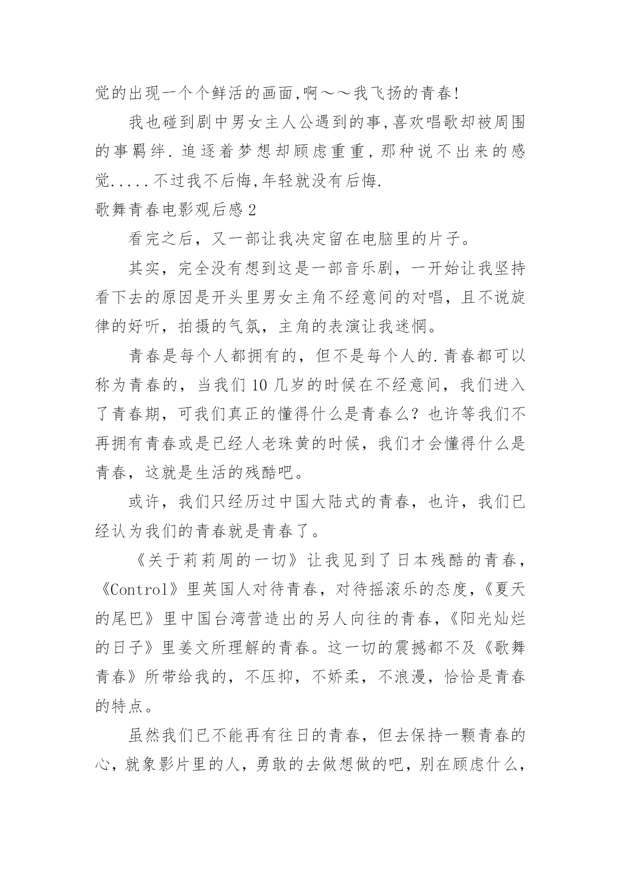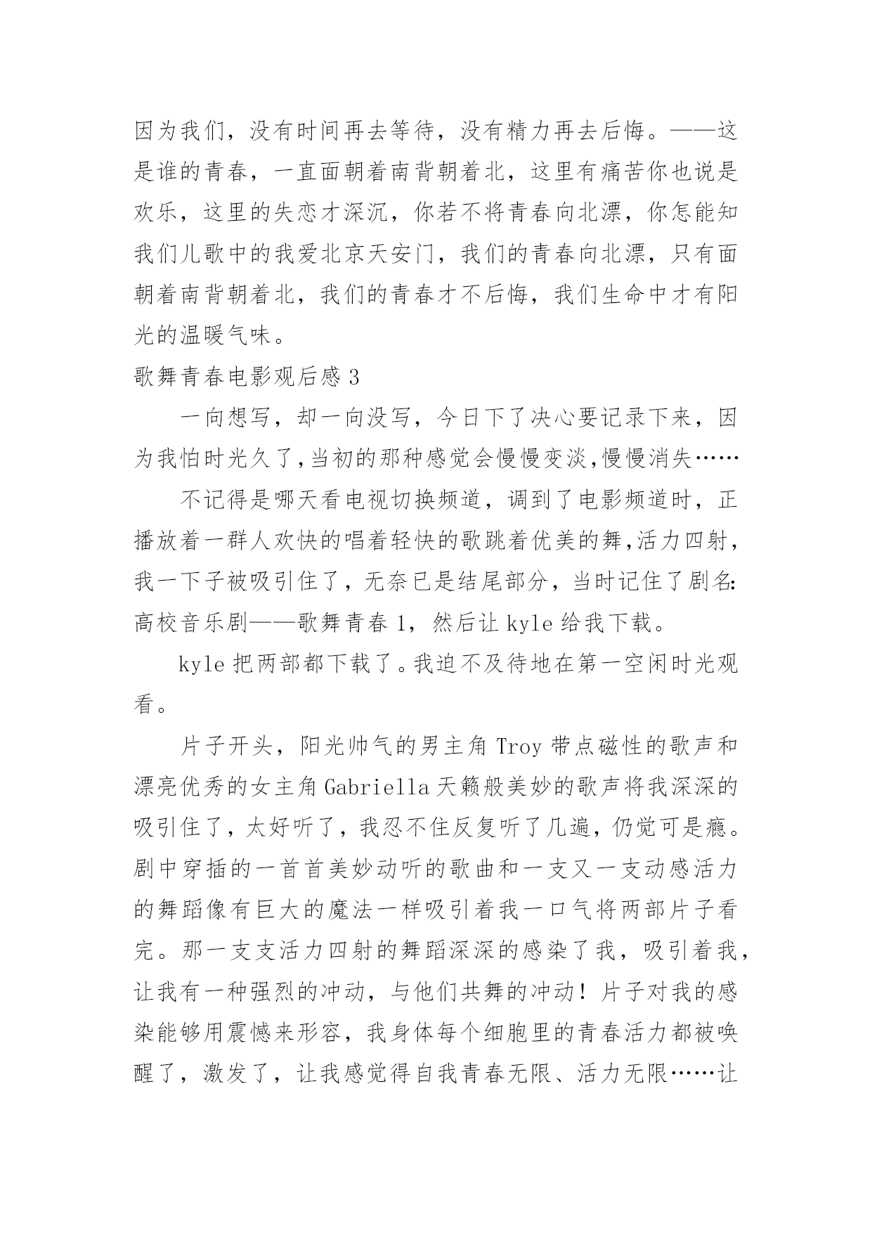 歌舞青春电影观后感歌舞青春电影观后感当认真看完一部影视作品后,一定有不少感悟吧,这时候,最关键的观后感怎么能落下!想必许多人都在为如何写好观后感而烦恼吧,下面是小编为大家收集的歌舞青春电影观后感,希望能够帮助到大家。歌舞青春电影观后感1《歌舞青春》讲述了两个生活背景迥然不同的高中生:帅气英俊、球技高超的篮球校队队长特洛伊(TroyBolton)和容貌甜美、易于害羞的优等转学生凯碧(GabriellaMontez)之间的故事。两人天籁般的嗓音和对舞台表演的兴趣,让他们共同心怀对歌唱的梦想。然而由于两人在不同的学科各自精彩,使他们在追逐歌唱梦想的道路上困难重重。最终在家人和朋友的理解与支持下两人彼此鼓励,在兼顾现实的同时一步步向自己的梦想前进。看完后对我的触动很大,我又想到了青春飞扬的岁月.我们年轻,可以站在太阳下尽情挥洒汗水,可以在大热天三两成群的啃着冰激淋,留下我们银铃般的笑容.我们可以为了一个帅气的大男生而议论纷纷,也可以在课桌底捧着一本青春爱情小说或者娱乐杂志读的津津有味....下课铃一响就聚拢来你一句我一句的讨论.我们可以为了一个公演练习到很晚,为得是展现一个全新的自我......我的头脑里不自觉的出现一个个鲜活的画面,啊~~我飞扬的青春!我也碰到剧中男女主人公遇到的事,喜欢唱歌却被周围的事羁绊.追逐着梦想却顾虑重重,那种说不出来的感觉.....不过我不后悔,年轻就没有后悔.歌舞青春电影观后感2看完之后,又一部让我决定留在电脑里的片子。其实,完全没有想到这是一部音乐剧,一开始让我坚持看下去的原因是开头里男女主角不经意间的对唱,且不说旋律的好听,拍摄的气氛,主角的表演让我迷惘。青春是每个人都拥有的,但不是每个人的.青春都可以称为青春的,当我们10几岁的时候在不经意间,我们进入了青春期,可我们真正的懂得什么是青春么?也许等我们不再拥有青春或是已经人老珠黄的时候,我们才会懂得什么是青春,这就是生活的残酷吧。或许,我们只经历过中国大陆式的青春,也许,我们已经认为我们的青春就是青春了。《关于莉莉周的一切》让我见到了日本残酷的青春,《Control》里英国人对待青春,对待摇滚乐的态度,《夏天的尾巴》里中国台湾营造出的另人向往的青春,《阳光灿烂的日子》里姜文所理解的青春。这一切的震撼都不及《歌舞青春》所带给我的,不压抑,不娇柔,不浪漫,恰恰是青春的特点。虽然我们已不能再有往日的青春,但去保持一颗青春的心,就象影片里的人,勇敢的去做想做的吧,别在顾虑什么,因为我们,没有时间再去等待,没有精力再去后悔。——这是谁的青春,一直面朝着南背朝着北,这里有痛苦你也说是欢乐,这里的失恋才深沉,你若不将青春向北漂,你怎能知我们儿歌中的我爱北京天安门,我们的青春向北漂,只有面朝着南背朝着北,我们的青春才不后悔,我们生命中才有阳光的温暖气味。歌舞青春电影观后感3一向想写,却一向没写,今日下了决心要记录下来,因为我怕时光久了,当初的那种感觉会慢慢变淡,慢慢消失……不记得是哪天看电视切换频道,调到了电影频道时,正播放着一群人欢快的唱着轻快的歌跳着优美的舞,活力四射,我一下子被吸引住了,无奈已是结尾部分,当时记住了剧名:高校音乐剧——歌舞青春1,然后让kyle给我下载。kyle把两部都下载了。我迫不及待地在第一空闲时光观看。片子开头,阳光帅气的男主角Troy带点磁性的歌声和漂亮优秀的女主角Gabriella天籁般美妙的歌声将我深深的吸引住了,太好听了,我忍不住反复听了几遍,仍觉可是瘾。剧中穿插的一首首美妙动听的歌曲和一支又一支动感活力的舞蹈像有巨大的魔法一样吸引着我一口气将两部片子看完。那一支支活力四射的舞蹈深深的感染了我,吸引着我,让我有一种强烈的冲动,与他们共舞的冲动!片子对我的感染能够用震憾来形容,我身体每个细胞里的青春活力都被唤醒了,激发了,让我感觉得自我青春无限、活力无限……让我久久未再舞动的身体想跟着音乐摇摆、跟着音乐舞动、跟着音乐疯狂……我要跳舞!很感激导演拍出一部这么好的片子,很幸运我看了这部这么好的片子,很开心能受到这么大的感染!期望能看到更多能感染我的片子。