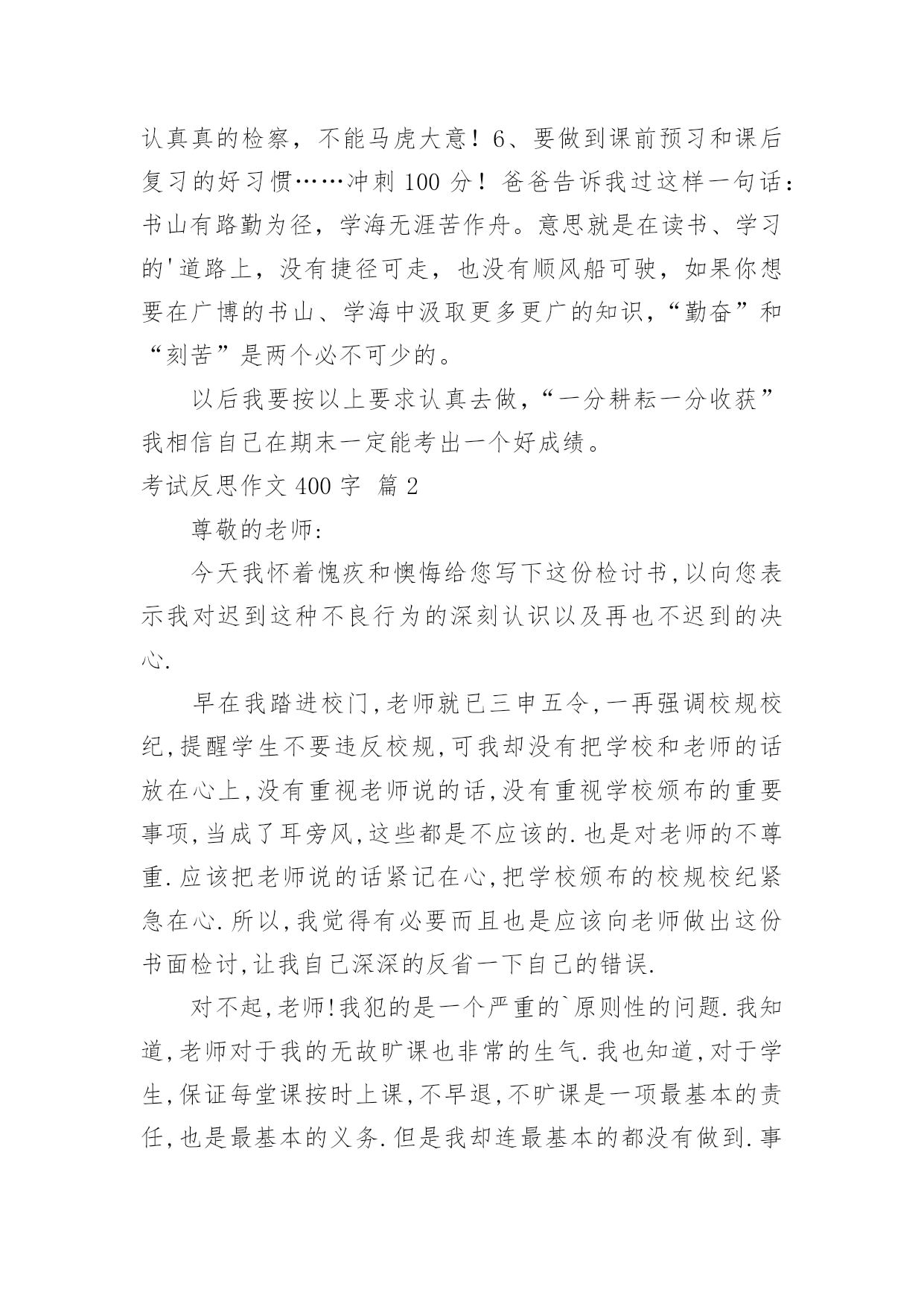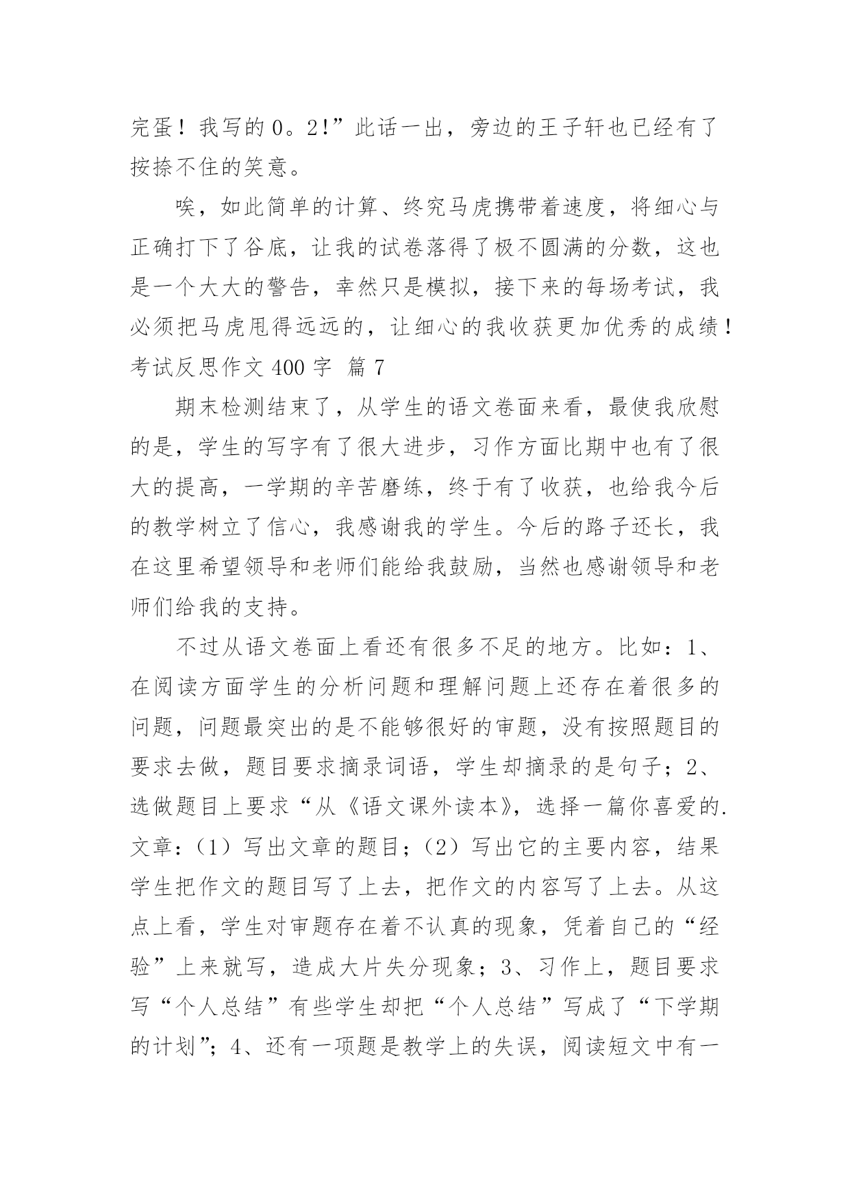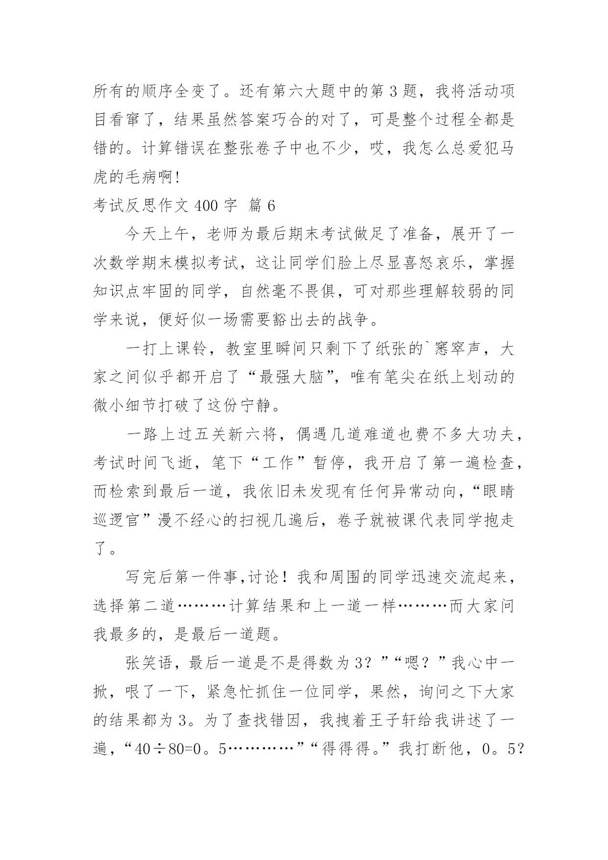 考试反思作文400字【精华】考试反思作文400字8篇在平日的学习、工作和生活里,大家对作文都不陌生吧,借助作文可以提高我们的语言组织能力。作文的注意事项有许多,你确定会写吗?以下是小编帮大家整理的考试反思作文400字8篇,欢迎阅读与收藏。考试反思作文400字篇1今天下午老师发语文期中考试卷,我的心情好像“十五个吊桶打水——七上八下”恐怕自己考不好,十分不安。当老师说:“这次我们班同学考试的成绩比我的预料的还好,语文成绩九十九分的同学有三位,董春江、孟心怡和陈延玉。”当听到有我时,我的心里暗暗高兴。我接过自己的试卷仔细一看,哦!原来我就错了一个题:《望洞庭》中总写洞庭湖秋色的诗句是什么,应是前两句,而我却写成了后两句。课本里的知识错了这一个,阅读短文和作文还没减分,错的这一个题都是粗心大意造成的,真亏呀!要不就考100分了,咳!这个坏毛病我下决心一定要改掉。我以后做到:1、要多读书,课外知识也一定要掌握好。2、做题时要先把题读三遍后,再认真仔细的做题。3、写作文时要看清作文要求之后再写文章,字数只能多不能少,把平时摘抄的好词好句用上。5、检查作业时要一字一句,认认真真的检察,不能马虎大意!6、要做到课前预习和课后复习的好习惯……冲刺100分!爸爸告诉我过这样一句话:书山有路勤为径,学海无涯苦作舟。意思就是在读书、学习的'道路上,没有捷径可走,也没有顺风船可驶,如果你想要在广博的书山、学海中汲取更多更广的知识,“勤奋”和“刻苦”是两个必不可少的。以后我要按以上要求认真去做,“一分耕耘一分收获”我相信自己在期末一定能考出一个好成绩。考试反思作文400字篇2尊敬的老师:今天我怀着愧疚和懊悔给您写下这份检讨书,以向您表示我对迟到这种不良行为的深刻认识以及再也不迟到的决心.早在我踏进校门,老师就已三申五令,一再强调校规校纪,提醒学生不要违反校规,可我却没有把学校和老师的话放在心上,没有重视老师说的话,没有重视学校颁布的重要事项,当成了耳旁风,这些都是不应该的.也是对老师的不尊重.应该把老师说的话紧记在心,把学校颁布的校规校纪紧急在心.所以,我觉得有必要而且也是应该向老师做出这份书面检讨,让我自己深深的反省一下自己的错误.对不起,老师!我犯的是一个严重的`原则性的问题.我知道,老师对于我的无故旷课也非常的生气.我也知道,对于学生,保证每堂课按时上课,不早退,不旷课是一项最基本的责任,也是最基本的义务.但是我却连最基本的都没有做到.事后,我冷静的想了很久,我渐渐的认识到自己将要为自己的冲动付出代价了.老师反复教导言犹在耳,严肃认真的表情犹在眼前,我深为震撼,也已经深刻的认识到事已至此的重要性.如今,大错既成,我深深懊悔不已.深刻检讨,认为在本人的思想中已深藏了致命的错误:思想觉悟不高,本人对他人的尊重不够,以后我将对老师有更多的尊重.对重要事项重视严重不足.平时生活作风懒散,如果不是因为过于懒散也不至于如此.为了更好的认识错误,也是为了让老师你能够相信学生我能够真正的改正自己的错误,保证不再重犯,我将自己所犯的错误归结如下:考试反思作文400字篇3今天上午,经过一场“奋战”数学考试终于完了,下课铃声也随之响起,这时,我感到特别轻松,心情也高兴到了极点,我现在只想问问王老师我昨天语文测试的成绩如何。于是,我走到了讲台前,轻声地问:“王老师,昨天的语文测试我考了多少分呀?”王老师也温和地回答:“嗯,你考了99分。”她边说边拿出了我的卷纸。当我听到“99”这个数字时,原本高兴的心情似乎一下子跌入了万丈深渊。我几乎每次考试都能考100分,考100分也一直是我的追求和目标,可这次却马失前蹄。我觉得自己的心似乎都在哭泣。这时,王老师也把卷纸摆在了我的面前,我一看,原来只有最后一题看图写话中“抓住”的“抓”写错了,右边的“爪”被我写成了“瓜”,一字之差害得我惨丢一分。看着这无情的卷纸,我久久说不出话来,眼泪在眼眶中打转。这时,王老师看出了我的伤心与失落,忙安慰我说:“王彦喆,不要难过,重不在于成绩,而在于你掌握了没有,虽然这次你没有完全掌握‘抓’字的写法,但是只要下次你牢牢地掌握住,并且不再犯同样的`错误就行了。”“重不在于成绩,而在于掌握”这句话我记住了。我一定要汲取每次丢分的教训,做错的题绝不再错第二次,争取在这次期末考试中考出优异的成绩!考试反思作文400字篇4我的数学成绩一向不好,这我们班人都知道。别说100分了,连95分都上不了,因此我感到惭愧。因为上次数学考试了,即将发下试卷,我十分紧张,小心脏”扑通扑通“的跳啊!试卷发下来了,才89。5分!哎……!又没上90分,我多么想得一次一百分啊!因此,我为明天小数加减法考试而准备起来。我列了一个清单,上面写着我在考试之前一定要复习的东西,做完一个打个勾。开始的一项:我拿起数学书。把重点的东西全部画了