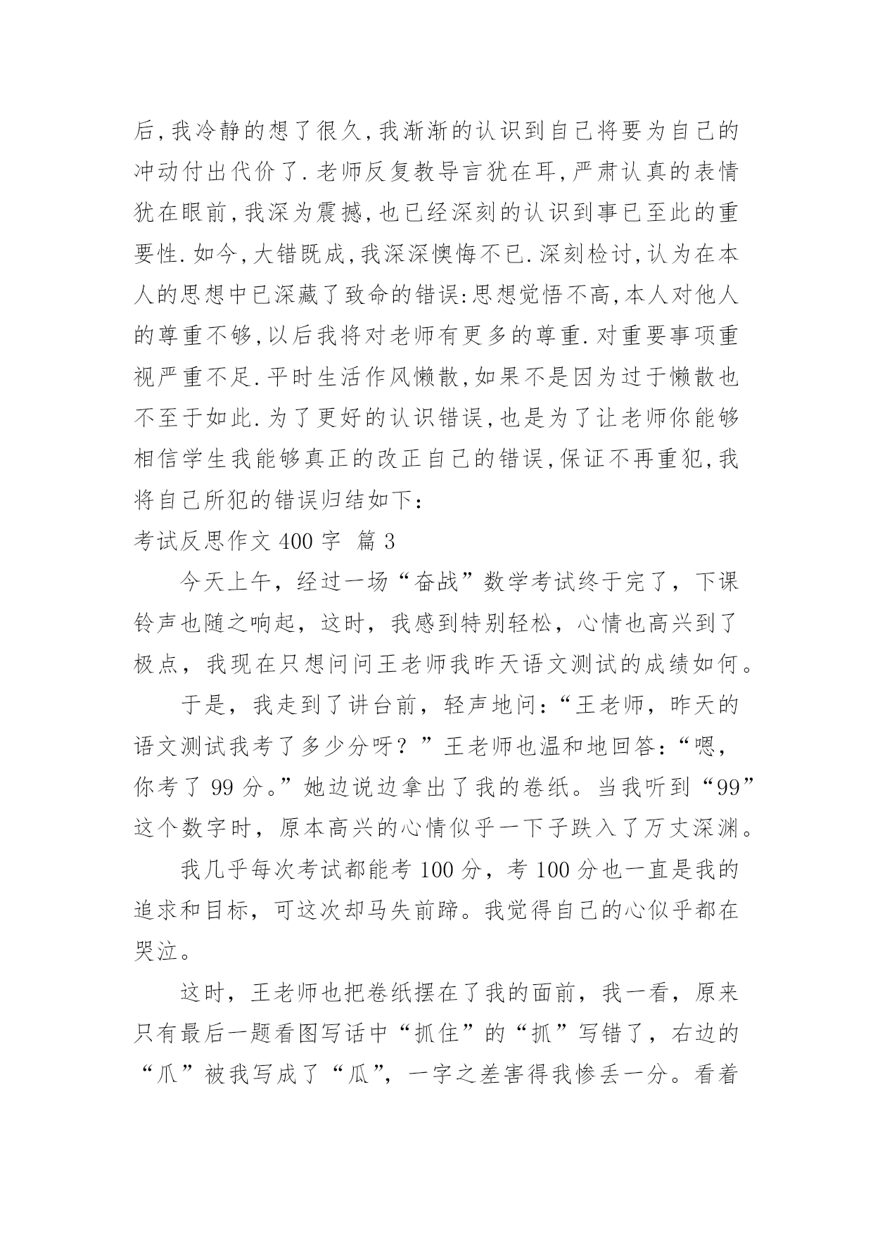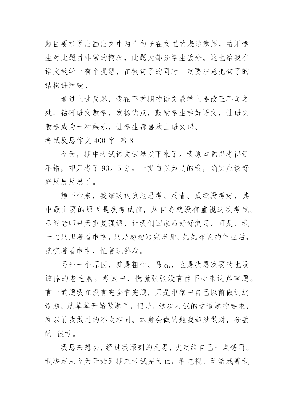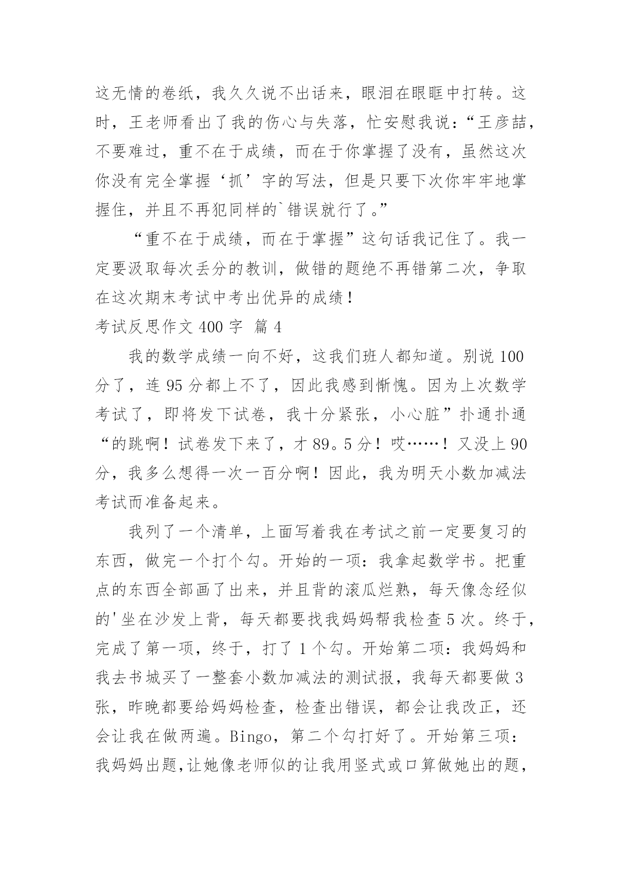 考试反思作文400字【精华】考试反思作文400字8篇在平日的学习、工作和生活里,大家对作文都不陌生吧,借助作文可以提高我们的语言组织能力。作文的注意事项有许多,你确定会写吗?以下是小编帮大家整理的考试反思作文400字8篇,欢迎阅读与收藏。考试反思作文400字篇1今天下午老师发语文期中考试卷,我的心情好像“十五个吊桶打水——七上八下”恐怕自己考不好,十分不安。当老师说:“这次我们班同学考试的成绩比我的预料的还好,语文成绩九十九分的同学有三位,董春江、孟心怡和陈延玉。”当听到有我时,我的心里暗暗高兴。我接过自己的试卷仔细一看,哦!原来我就错了一个题:《望洞庭》中总写洞庭湖秋色的诗句是什么,应是前两句,而我却写成了后两句。课本里的知识错了这一个,阅读短文和作文还没减分,错的这一个题都是粗心大意造成的,真亏呀!要不就考100分了,咳!这个坏毛病我下决心一定要改掉。我以后做到:1、要多读书,课外知识也一定要掌握好。2、做题时要先把题读三遍后,再认真仔细的做题。3、写作文时要看清作文要求之后再写文章,字数只能多不能少,把平时摘抄的好词好句用上。5、检查作业时要一字一句,认认真真的检察,不能马虎大意!6、要做到课前预习和课后复习的好习惯……冲刺100分!爸爸告诉我过这样一句话:书山有路勤为径,学海无涯苦作舟。意思就是在读书、学习的'道路上,没有捷径可走,也没有顺风船可驶,如果你想要在广博的书山、学海中汲取更多更广的知识,“勤奋”和“刻苦”是两个必不可少的。以后我要按以上要求认真去做,“一分耕耘一分收获”我相信自己在期末一定能考出一个好成绩。考试反思作文400字篇2尊敬的老师:今天我怀着愧疚和懊悔给您写下这份检讨书,以向您表示我对迟到这种不良行为的深刻认识以及再也不迟到的决心.早在我踏进校门,老师就已三申五令,一再强调校规校纪,提醒学生不要违反校规,可我却没有把学校和老师的话放在心上,没有重视老师说的话,没有重视学校颁布的重要事项,当成了耳旁风,这些都是不应该的.也是对老师的不尊重.应该把老师说的话紧记在心,把学校颁布的校规校纪紧急在心.所以,我觉得有必要而且也是应该向老师做出这份书面检讨,让我自己深深的反省一下自己的错误.对不起,老师!我犯的是一个严重的`原则性的问题.我知道,老师对于我的无故旷课也非常的生气.我也知道,对于学生,保证每堂课按时上课,不早退,不旷课是一项最基本的责任,也是最基本的义务.但是我却连最基本的都没有做到.事后,我冷静的想了很久,我渐渐的认识到自己将要为自己的冲动付出代价了.老师反复教导言犹在耳,严肃认真的表情犹在眼前,我深为震撼,也已经深刻的认识到事已至此的重要性.如今,大错既成,我深深懊悔不已.深刻检讨,认为在本人的思想中已深藏了致命的错误:思想觉悟不高,本人对他人的尊重不够,以后我将对老师有更多的尊重.对重要事项重视严重不足.平时生活作风懒散,如果不是因为过于懒散也不至于如此.为了更好的认识错误,也是为了让老师你能够相信学生我能够真正的改正自己的错误,保证不再重犯,我将自己所犯的错误归结如下:考试反思作文400字篇3今天上午,经过一场“奋战”数学考试终于完了,下课铃声也随之响起,这时,我感到特别轻松,心情也高兴到了极点,我现在只想问问王老师我昨天语文测试的成绩如何。于是,我走到了讲台前,轻声地问:“王老师,昨天的语文测试我考了多少分呀?”王老师也温和地回答:“嗯,你考了99分。”她边说边拿出了我的卷纸。当我听到“99”这个数字时,原本高兴的心情似乎一下子跌入了万丈深渊。我几乎每次考试都能考100分,考100分也一直是我的追求和目标,可这次却马失前蹄。我觉得自己的心似乎都在哭泣。这时,王老师也把卷纸摆在了我的面前,我一看,原来只有最后一题看图写话中“抓住”的“抓”写错了,右边的“爪”被我写成了“瓜”,一字之差害得我惨丢一分。看着这无情的卷纸,我久久说不出话来,眼泪在眼眶中打转。这时,王老师看出了我的伤心与失落,忙安慰我说:“王彦喆,不要难过,重不在于成绩,而在于你掌握了没有,虽然这次你没有完全掌握‘抓’字的写法,但是只要下次你牢牢地掌握住,并且不再犯同样的`错误就行了。”“重不在于成绩,而在于掌握”这句话我记住了。我一定要汲取每次丢分的教训,做错的题绝不再错第二次,争取在这次期末考试中考出优异的成绩!考试反思作文400字篇4我的数学成绩一向不好,这我们班人都知道。别说100分了,连95分都上不了,因此我感到惭愧。因为上次数学考试了,即将发下试卷,我十分紧张,小心脏”扑通扑通“的跳啊!试卷发下来了,才89。5分!哎……!又没上90分,我多么想得一次一百分啊!因此,我为明天小数加减法考试而准备起来。我列了一个清单,上面写着我在考试之前一定要复习的东西,做完一个打个勾。开始的一项:我拿起数学书。把重点的东西全部画了