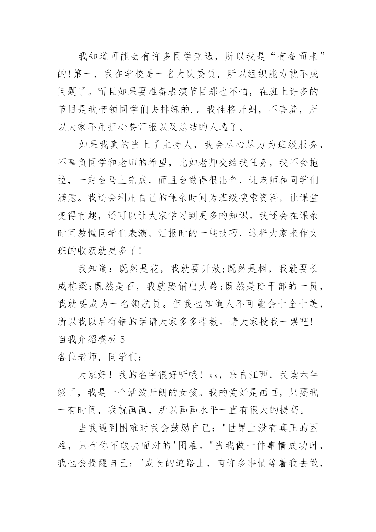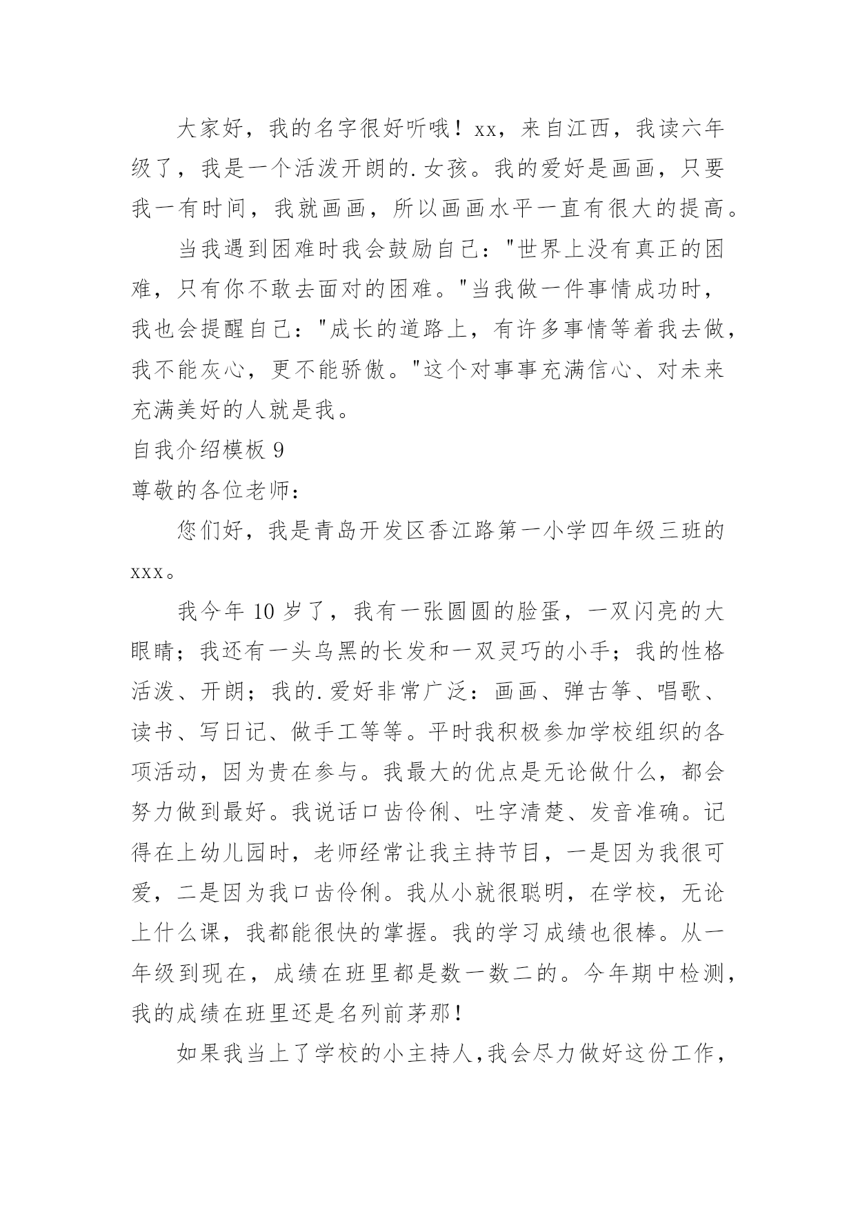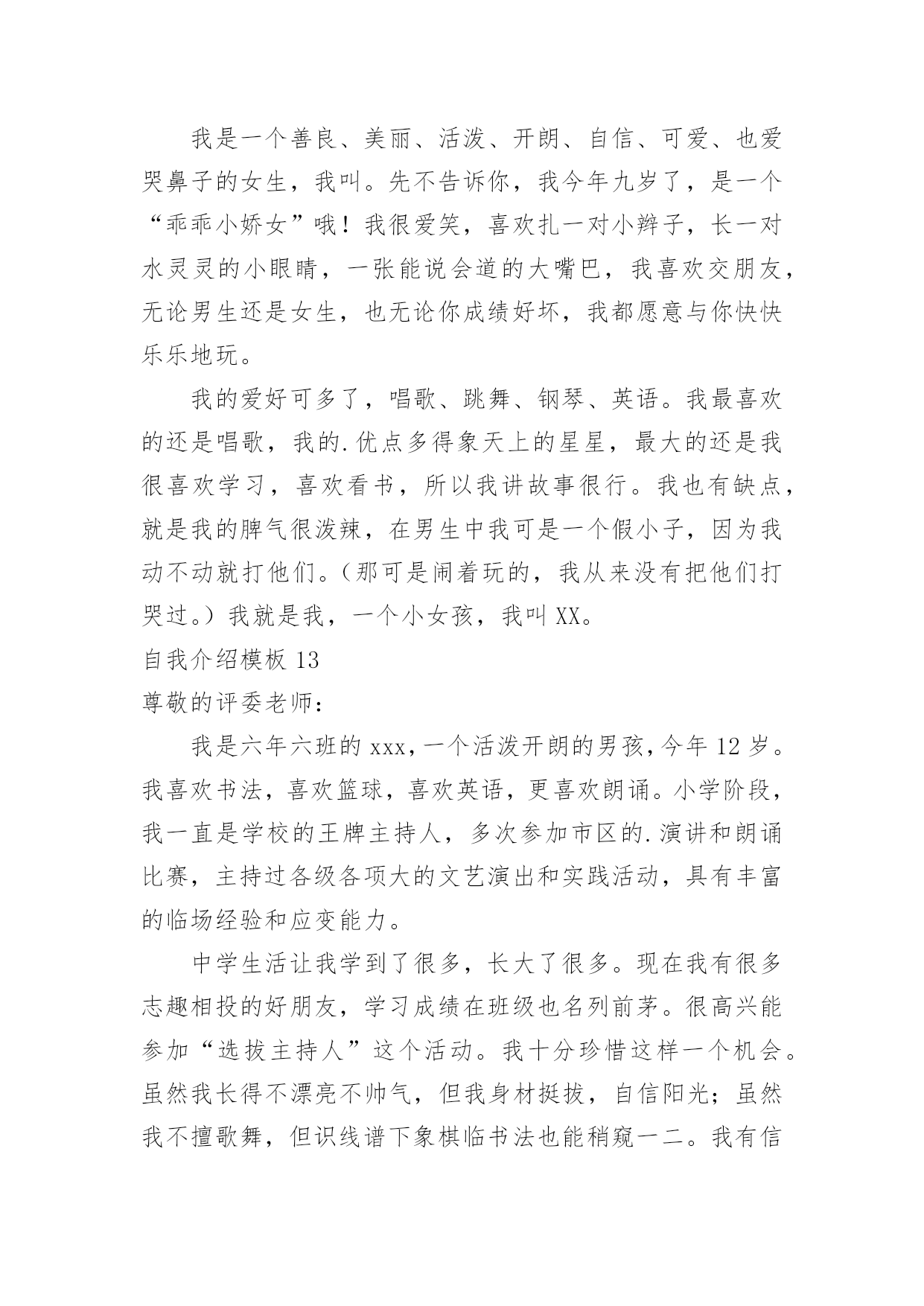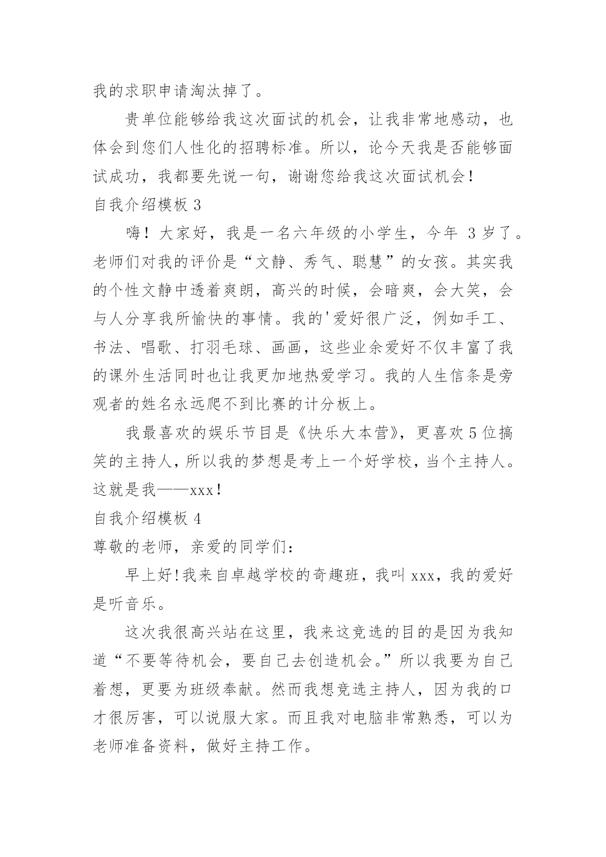 自我介绍(荐)自我介绍模板当我们在一个新环境中,我们就有可能用到自我介绍,自我介绍是认识自我的手段。那么什么样的自我介绍才合适呢?下面是小编帮大家整理的自我介绍模板,欢迎大家分享。自我介绍模板1各位老师,同学们:大家好!我叫xxx,是来自二(2)班的一个小小围棋迷。我的兴趣很广泛。我喜爱看书,《上下五千年》、《百科全书》……我都爱看。我还喜爱跳绳。上幼儿园时,老师教我们跳绳,刚开始我一点儿也不会。我心里想:我必须要学会它。于是,我坚持天天练习,功夫不负有心人,我最后学会了跳绳,并且在“元旦”的比赛中,获得了第二名。我更喜爱下围棋。上幼儿园时,我就对它着了迷。那时,只要父亲回来,我就缠着要他陪我杀几盘。此刻,父亲根本不是我的'对手了。父亲以前问我:“吃饭与下围棋,哪个更重要?”我毫不犹豫地说:“下围棋重要!”你们看,我的棋瘾不小吧?我心里有个小秘密:要在将来成为一个职业棋手,为祖国争光,请大家为我鼓鼓劲吧!谢谢大家!自我介绍模板2您好,我叫张竞,竞赛的竞。我生在成都长在成都,所以希望能够为成都的发展尽一份微薄之力。作为一名汽车维修专业的职校毕业生,我认为自己在汽车专业知识和技能方面比较有优势。我高一、高二的时候参加了学校汽车维修精英班的学习,在实训实作中学到了很多专业知识。在每年的寒暑假,我都到汽车维修厂实习,从事汽车修理业务,主修车型为东风雪铁龙系列。我对待工作非常负责,不亚于全职员工。有两次遇到故障车的电路问题,在师傅的指导下,我连续24小时不睡觉,直到把问题解决。这种经历大大提升了我的专业素质和专业技能。这段实习经历也让我了解,现在汽车维修行业最缺乏那种既懂得传统的`机械维修技术,又能掌握现代电子维修技术的人才。所以,高二时我通过了成人高考,目前正在电子科大学习微电子技术。去年11月,我在成都市中等职业学生技能大赛中获“汽车维修专业”第一名,取得了劳动局颁发的“高级技工”证书。非常遗憾的一点是,虽然我的汽车维修专业课成绩非常好,但是我数学考试却不及格。究其原因,是我完全按照自己的兴趣分配学习时间,几乎把所有时间都给了汽车专业课。回头看来,这是我学习最失败的地方,它已经给我带来了非常严重的后果,有一些企业一看到我有不及格的科目立刻把我的求职申请淘汰掉了。贵单位能够给我这次面试的机会,让我非常地感动,也体会到您们人性化的招聘标准。所以,论今天我是否能够面试成功,我都要先说一句,谢谢您给我这次面试机会!自我介绍模板3嗨!大家好,我是一名六年级的小学生,今年3岁了。老师们对我的评价是“文静、秀气、聪慧”的女孩。其实我的个性文静中透着爽朗,高兴的时候,会暗爽,会大笑,会与人分享我所愉快的事情。我的'爱好很广泛,例如手工、书法、唱歌、打羽毛球、画画,这些业余爱好不仅丰富了我的课外生活同时也让我更加地热爱学习。我的人生信条是旁观者的姓名永远爬不到比赛的计分板上。我最喜欢的娱乐节目是《快乐大本营》,更喜欢5位搞笑的主持人,所以我的梦想是考上一个好学校,当个主持人。这就是我——xxx!自我介绍模板4尊敬的老师,亲爱的同学们:早上好!我来自卓越学校的奇趣班,我叫xxx,我的爱好是听音乐。这次我很高兴站在这里,我来这竞选的目的是因为我知道“不要等待机会,要自己去创造机会。”所以我要为自己着想,更要为班级奉献。然而我想竞选主持人,因为我的口才很厉害,可以说服大家。而且我对电脑非常熟悉,可以为老师准备资料,做好主持工作。我知道可能会有许多同学竞选,所以我是“有备而来”的!第一,我在学校是一名大队委员,所以组织能力就不成问题了。而且如果要准备表演节目那也不怕,在班上许多的节目是我带领同学们去排练的.。我性格开朗,不害羞,所以大家不用担心要汇报以及总结的人选了。如果我真的当上了主持人,我会尽心尽力为班级服务,不辜负同学和老师的希望,比如老师交给我任务,我不会拖拉,一定会马上完成,而且会做得很出色,让老师和同学们满意。我还会利用自己的课余时间为班级搜索资料,让课堂变得有趣,还可以让大家学习到更多的知识。我还会在课余时间教懂同学们表演、汇报时的一些技巧,这样大家来作文班的收获就更多了!我知道:既然是花,我就要开放;既然是树,我就要长成栋梁;既然是石,我就要铺出大路;既然是班干部的一员,我就要成为一名领航员。但我也知道人不可能会十全十美,所以我以后有错的话请大家多多指教。请大家投我一票吧!自我介绍模板5各位老师,同学们:大家好!我的名字很好听哦!xx,来自江西,我读六年级了,我是一个活泼开朗的女孩。我的爱好是画画,只要我一有时间,我就画画,所以画画水平一直有很大的提高。当我遇到困难时我会鼓励自己:"世界上没有真正的困难,只有你不敢去面对的'困难。"当我做一件事情成功时,我也会提醒自己:"成长的道路上,有许多事情等着我去做,我不能灰心,更不能骄傲。"这个对