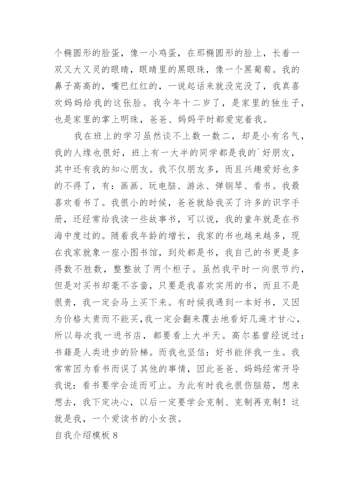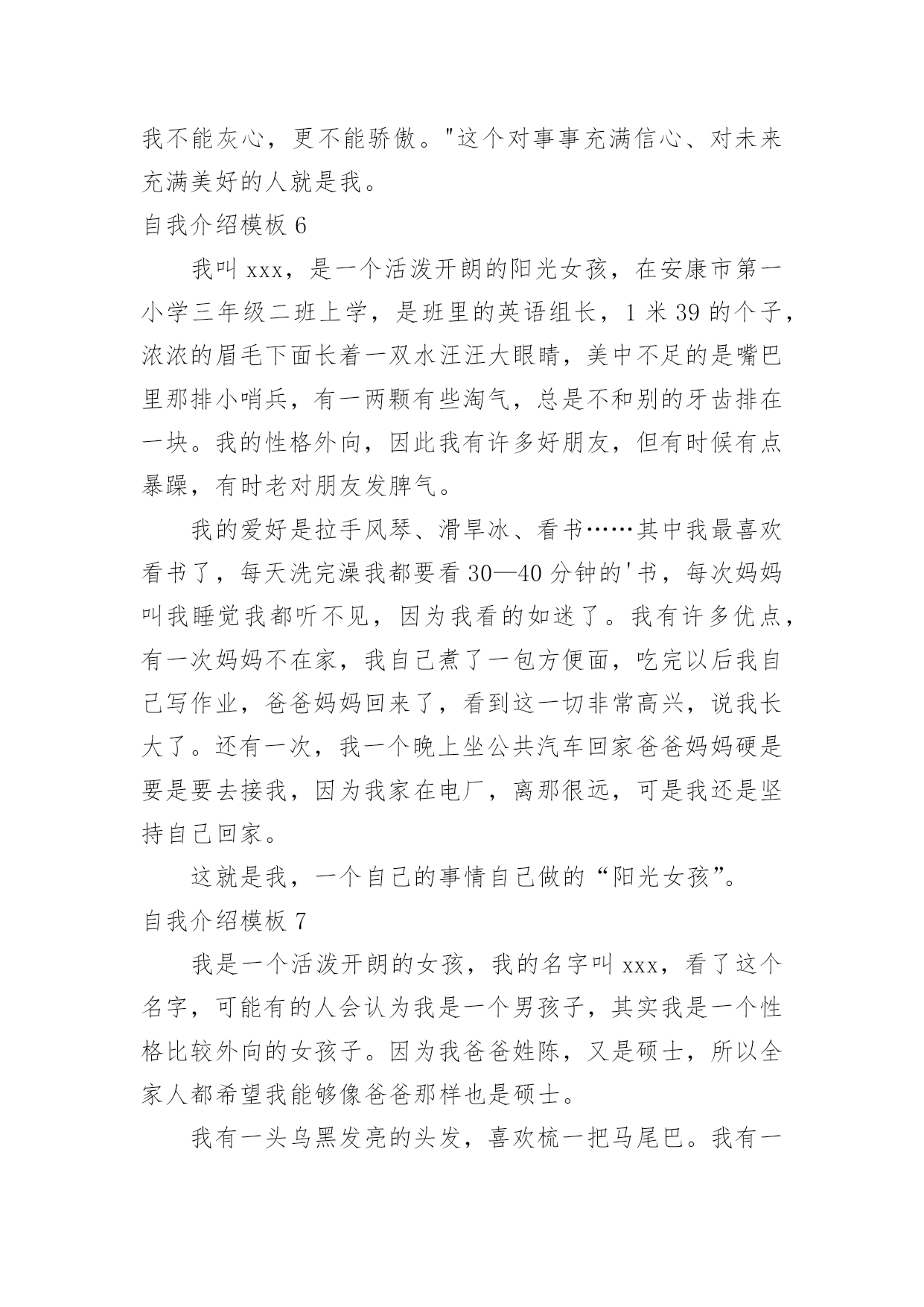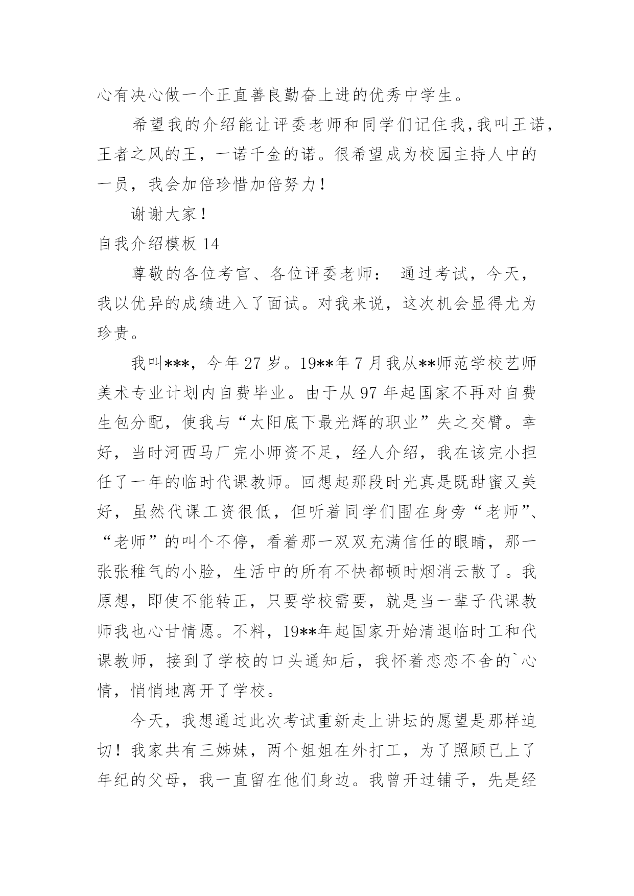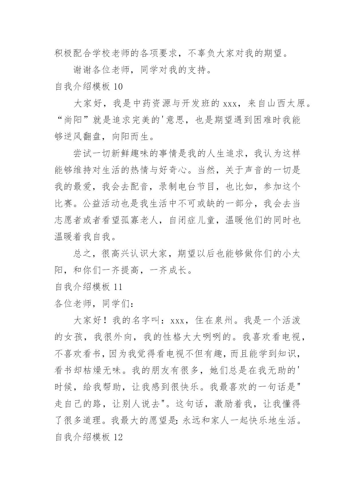 自我介绍(荐)自我介绍模板当我们在一个新环境中,我们就有可能用到自我介绍,自我介绍是认识自我的手段。那么什么样的自我介绍才合适呢?下面是小编帮大家整理的自我介绍模板,欢迎大家分享。自我介绍模板1各位老师,同学们:大家好!我叫xxx,是来自二(2)班的一个小小围棋迷。我的兴趣很广泛。我喜爱看书,《上下五千年》、《百科全书》……我都爱看。我还喜爱跳绳。上幼儿园时,老师教我们跳绳,刚开始我一点儿也不会。我心里想:我必须要学会它。于是,我坚持天天练习,功夫不负有心人,我最后学会了跳绳,并且在“元旦”的比赛中,获得了第二名。我更喜爱下围棋。上幼儿园时,我就对它着了迷。那时,只要父亲回来,我就缠着要他陪我杀几盘。此刻,父亲根本不是我的'对手了。父亲以前问我:“吃饭与下围棋,哪个更重要?”我毫不犹豫地说:“下围棋重要!”你们看,我的棋瘾不小吧?我心里有个小秘密:要在将来成为一个职业棋手,为祖国争光,请大家为我鼓鼓劲吧!谢谢大家!自我介绍模板2您好,我叫张竞,竞赛的竞。我生在成都长在成都,所以希望能够为成都的发展尽一份微薄之力。作为一名汽车维修专业的职校毕业生,我认为自己在汽车专业知识和技能方面比较有优势。我高一、高二的时候参加了学校汽车维修精英班的学习,在实训实作中学到了很多专业知识。在每年的寒暑假,我都到汽车维修厂实习,从事汽车修理业务,主修车型为东风雪铁龙系列。我对待工作非常负责,不亚于全职员工。有两次遇到故障车的电路问题,在师傅的指导下,我连续24小时不睡觉,直到把问题解决。这种经历大大提升了我的专业素质和专业技能。这段实习经历也让我了解,现在汽车维修行业最缺乏那种既懂得传统的`机械维修技术,又能掌握现代电子维修技术的人才。所以,高二时我通过了成人高考,目前正在电子科大学习微电子技术。去年11月,我在成都市中等职业学生技能大赛中获“汽车维修专业”第一名,取得了劳动局颁发的“高级技工”证书。非常遗憾的一点是,虽然我的汽车维修专业课成绩非常好,但是我数学考试却不及格。究其原因,是我完全按照自己的兴趣分配学习时间,几乎把所有时间都给了汽车专业课。回头看来,这是我学习最失败的地方,它已经给我带来了非常严重的后果,有一些企业一看到我有不及格的科目立刻把我的求职申请淘汰掉了。贵单位能够给我这次面试的机会,让我非常地感动,也体会到您们人性化的招聘标准。所以,论今天我是否能够面试成功,我都要先说一句,谢谢您给我这次面试机会!自我介绍模板3嗨!大家好,我是一名六年级的小学生,今年3岁了。老师们对我的评价是“文静、秀气、聪慧”的女孩。其实我的个性文静中透着爽朗,高兴的时候,会暗爽,会大笑,会与人分享我所愉快的事情。我的'爱好很广泛,例如手工、书法、唱歌、打羽毛球、画画,这些业余爱好不仅丰富了我的课外生活同时也让我更加地热爱学习。我的人生信条是旁观者的姓名永远爬不到比赛的计分板上。我最喜欢的娱乐节目是《快乐大本营》,更喜欢5位搞笑的主持人,所以我的梦想是考上一个好学校,当个主持人。这就是我——xxx!自我介绍模板4尊敬的老师,亲爱的同学们:早上好!我来自卓越学校的奇趣班,我叫xxx,我的爱好是听音乐。这次我很高兴站在这里,我来这竞选的目的是因为我知道“不要等待机会,要自己去创造机会。”所以我要为自己着想,更要为班级奉献。然而我想竞选主持人,因为我的口才很厉害,可以说服大家。而且我对电脑非常熟悉,可以为老师准备资料,做好主持工作。我知道可能会有许多同学竞选,所以我是“有备而来”的!第一,我在学校是一名大队委员,所以组织能力就不成问题了。而且如果要准备表演节目那也不怕,在班上许多的节目是我带领同学们去排练的.。我性格开朗,不害羞,所以大家不用担心要汇报以及总结的人选了。如果我真的当上了主持人,我会尽心尽力为班级服务,不辜负同学和老师的希望,比如老师交给我任务,我不会拖拉,一定会马上完成,而且会做得很出色,让老师和同学们满意。我还会利用自己的课余时间为班级搜索资料,让课堂变得有趣,还可以让大家学习到更多的知识。我还会在课余时间教懂同学们表演、汇报时的一些技巧,这样大家来作文班的收获就更多了!我知道:既然是花,我就要开放;既然是树,我就要长成栋梁;既然是石,我就要铺出大路;既然是班干部的一员,我就要成为一名领航员。但我也知道人不可能会十全十美,所以我以后有错的话请大家多多指教。请大家投我一票吧!自我介绍模板5各位老师,同学们:大家好!我的名字很好听哦!xx,来自江西,我读六年级了,我是一个活泼开朗的女孩。我的爱好是画画,只要我一有时间,我就画画,所以画画水平一直有很大的提高。当我遇到困难时我会鼓励自己:"世界上没有真正的困难,只有你不敢去面对的'困难。"当我做一件事情成功时,我也会提醒自己:"成长的道路上,有许多事情等着我去做,我不能灰心,更不能骄傲。"这个对
