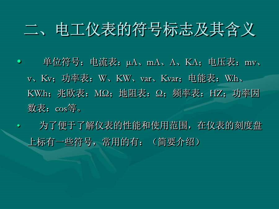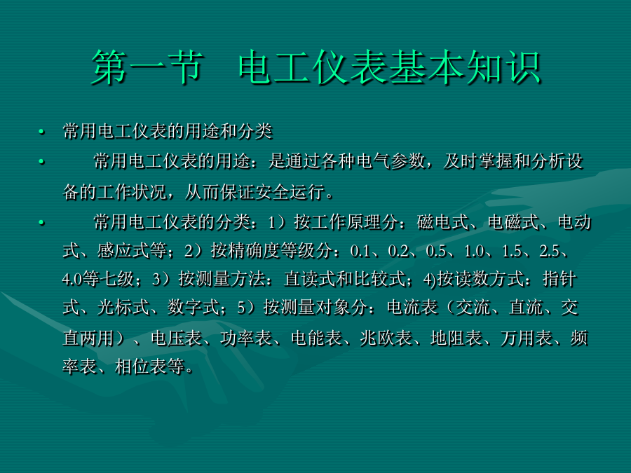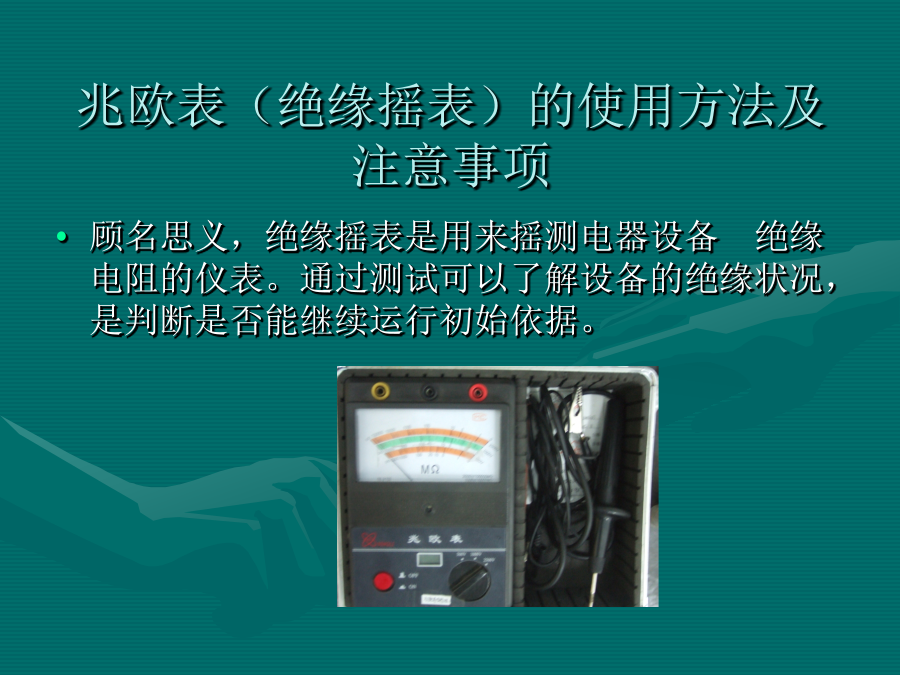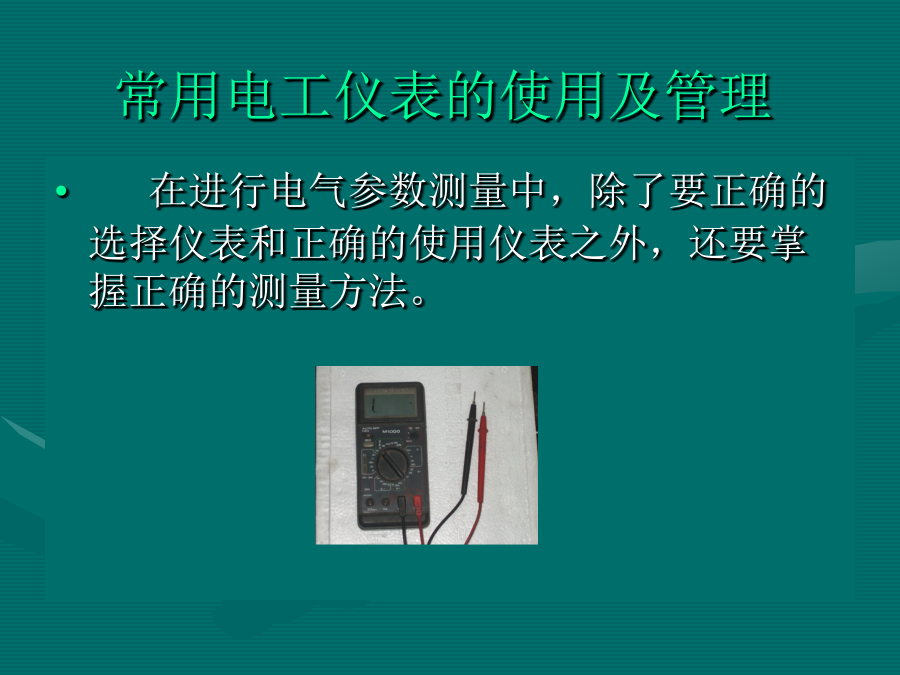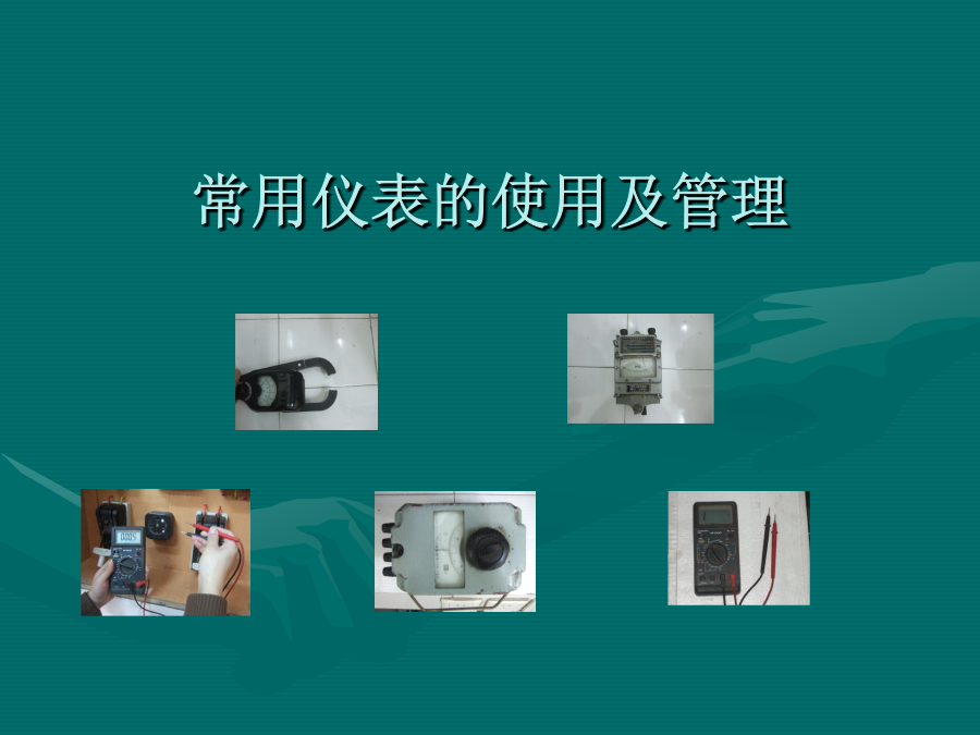 农电岗位培训讲演稿常用仪表的使用及管理常用电工仪表的使用及管理第一节电工仪表基本知识二、电工仪表的符号标志及其含义第二节常用电工仪表的测量万用表的使用方法及注意事项:兆欧表(绝缘摇表)的使用方法及注意事项测量前正确选用摇表正确接线测量方法注意事项钳形电流表的使用方法及注意事项测量及注意事项接地电阻测量仪的使用方法及注意事项测量方法和注意事项最后祝:各位在培训期间开心、愉快。谢谢大家!!!