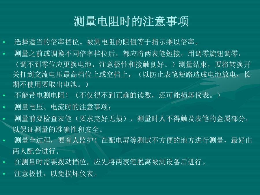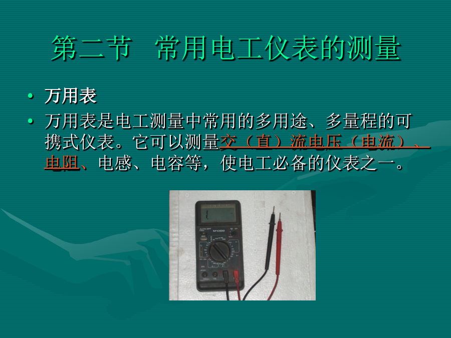 常用电子电气测试设备的使用模拟和数字万用表的操作、功能和应用万用表具有用途多,量程大,使用方便等优点,是电子测量中最常用的工具。万用表能测量电流、电压、电阻、有的还可以测量三极管的放大倍数,频率、电容值、逻辑电位、分贝值等。掌握万用表的使用方法是电子技术的一项基本技能。常见的万用表有指针式万用表(模拟式万用表)和数字式万用表。指针式万用表是一表头为核心部件的多功能测量仪表,测量值由表头指针指示读取。数字式万用表的测量值由液晶显示屏直接以数字的形式显示,读取方便,有些还带有语音提示功能。万用表是共用一个表头