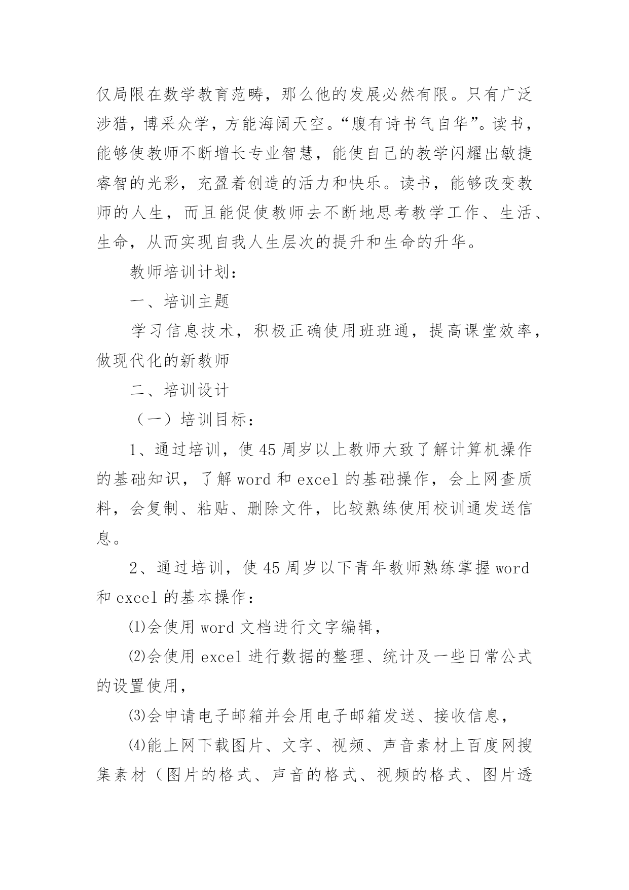 教师读书培训方案教师读书培训方案范文为确保事情或工作高质量高水平开展,通常需要预先制定一份完整的方案,方案可以对一个行动明确一个大概的方向。那么什么样的方案才是好的呢?下面是小编整理的教师读书专题培训方案范文,欢迎大家借鉴与参考,希望对大家有所帮助。教师读书培训方案1为了进一步激发全校教师读书的兴趣,营造浓厚的读书氛围,养成良好的读书习惯,提高审美修养和人文底蕴,打造学习型教师群体,提高教师综合素质。特制定教师读书活动方案作为我校校本培训特色项目。一、活动目的首先,读书是学校可持续发展的需要。教师作为学校发展的关键因素必须加强自身学习,并努力将学习与教学工作联系起来,真正以实际行动改进自身教学行为,共同推进学校的发展。其次,读书是教师专业成长与发展的需要。教师要获得自身的发展,必须依赖学习这一行为,引导教师养成“爱读书、会读书、读好书”的好习惯,提高教育科研能力,以提高自身专业的素养,从而推动自己的专业发展。二、活动目标构建一支师德高尚、素质优良、结构合理的学习型教师队伍。三、活动内容(一)读书种类:古典名著、名人传记、教育名著和教育家评论及专业书籍、学科指导类,现代科技、时政类,生涯指导和学习方法类等。(二)读书方式:1、自主研读。每天保证半小时以上的阅读,力争读深、读透,读有思考,读有感受,读写同步,写好一篇有质量的读书读后感。2、集体阅读。每学期由学校推荐一本书籍,规定全体教师集体阅读,在一定的时间内撰写读书心得,学校统一组织教师一起谈感受、谈收获、谈疑惑。(三)活动形式:1、青年教师交流青年教师自主阅读后,学校每隔四个星期举行一次读书交流活动,并由三位老师负责交流自己的读书心得。第8周麻绵绵金红燕杨笑曼第12周戴健达徐吉祥章玮双第16周吴兵彬金林燕董盛第20周胡洁李慧慧麻琼洁2、中老年教师写读后感四、保障措施:1、成立读书活动领导小组,为读书活动提供组织保障。教师读书活动领导小组:组长:金仙昆副组长:吴金芳组员:杨笑曼吕秀望麻琼洁董秀明2、学校建立有关读书计划的管理、评价和激励等规章制度,每学期把读书情况纳入常规管理,及时检查总结、量化考核、反馈指导,确保读书活动取得实效。3、学校将把教师读书计划纳入校本研训计划,把读书活动与校本教研校本培训有机结合起来。教师读书笔记及读书心得将由学校教导处统一检查并备案,教师读书活动表现与教师教科研活动成果考核相联系。教师读书培训方案2苏霍姆林斯基要求教师要“读书,读书,再读书!”只有教师书读多了,知识面广了,领悟能力强了,在课堂上才会游刃有余,精彩纷呈。因此,我作为一名数学教师,要积极参与到学校的读书活动中,努力通过读书来滋养精神,提升品位,不断提高师德素质和自身修养。我为自己定下了以下的读书计划:一、指导思想:以我校教师读书计划为行动指南,通过读书锻炼思维能力和对教育问题的思考能力,努力转变思想观念、思维模式,努力提高自身素质,不断进行教育创新;通过阅读经典、名著来丰富自己的人生,让生命在阅读中更加精彩!二、我的读书目标:1、通过学习教育经典理论,转变教育观念,提高教育教学能力、教育创新能力,同时通过阅读接触更广的课外知识,深化更多的学科内容,逐步养成多读书,读好书的习惯。2、通过读书,培养自身好读书的习惯,提升内涵,从而更加积极地投入教育实践与改革,言传身教,为人师表。3、通过学习名篇名著,丰富自身个人文化涵养,强化自身修养,使自己的精神世界变得更为丰富多彩。4、通过读书活动,树立正确的世界观、人生观、价值观和教师职业观,建立新型的师生关系,塑造良好的教师形象。三、主要措施:1、个人自学为主,充分利用课余时间阅读有关书目,养成不动笔墨不读书的习惯,勤于做读书笔记,写好心得体会。每天确保一小时的读书时间,让读书成为自己的自觉行动,学习成为自己的一种需要。2、读书活动与课堂教学相结合。要用现代教育思想指导教育教学工作实践,紧紧围绕学生发展和学生需求这个中心,为学生的发展提供开放的空间。边学习教育理论,转变教育观念,及时认真地进行教学反思,真正做到“读”有所悟,“悟”有所用,“用”有所得。3、充分利用网络,进行网上阅读,了解、把握教育教学的信息和动态。撰写博客,读书要与思考有机结合,及时写下心得体会,努力寻求读书成效的最大化,不断提高自己的各方面素质与综合能力。积极撰写个人博客并阅读其他老师的博客,取人之长,补己之短。4、坚持读书与反思相结合,带着问题读书,寻求解决问题的方法,潜心写好读书心得。坚持读书与课程改革相结合,充分理解新课程,在课堂教学中融入新课程理念,实施新课程。四、读书安排:大量阅读书籍,做好读书笔记,使知识不断积累,思想与时俱进。用先进的教育思想、教育理念武装自己的头脑。每周阅读两篇教育教学文章,每月通读一本教学杂志,每学期精读一本教育教学著作。1、经典阅读:《给