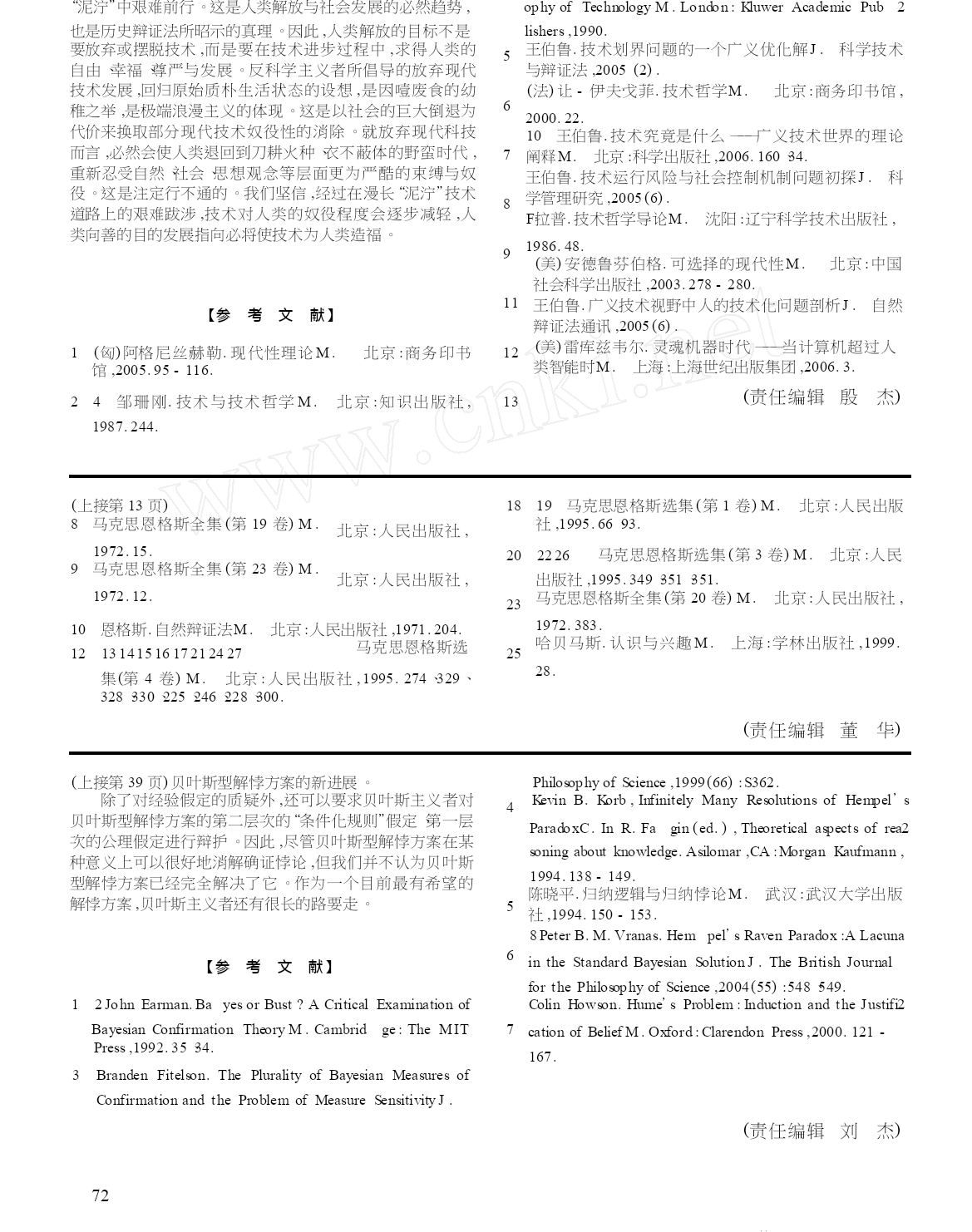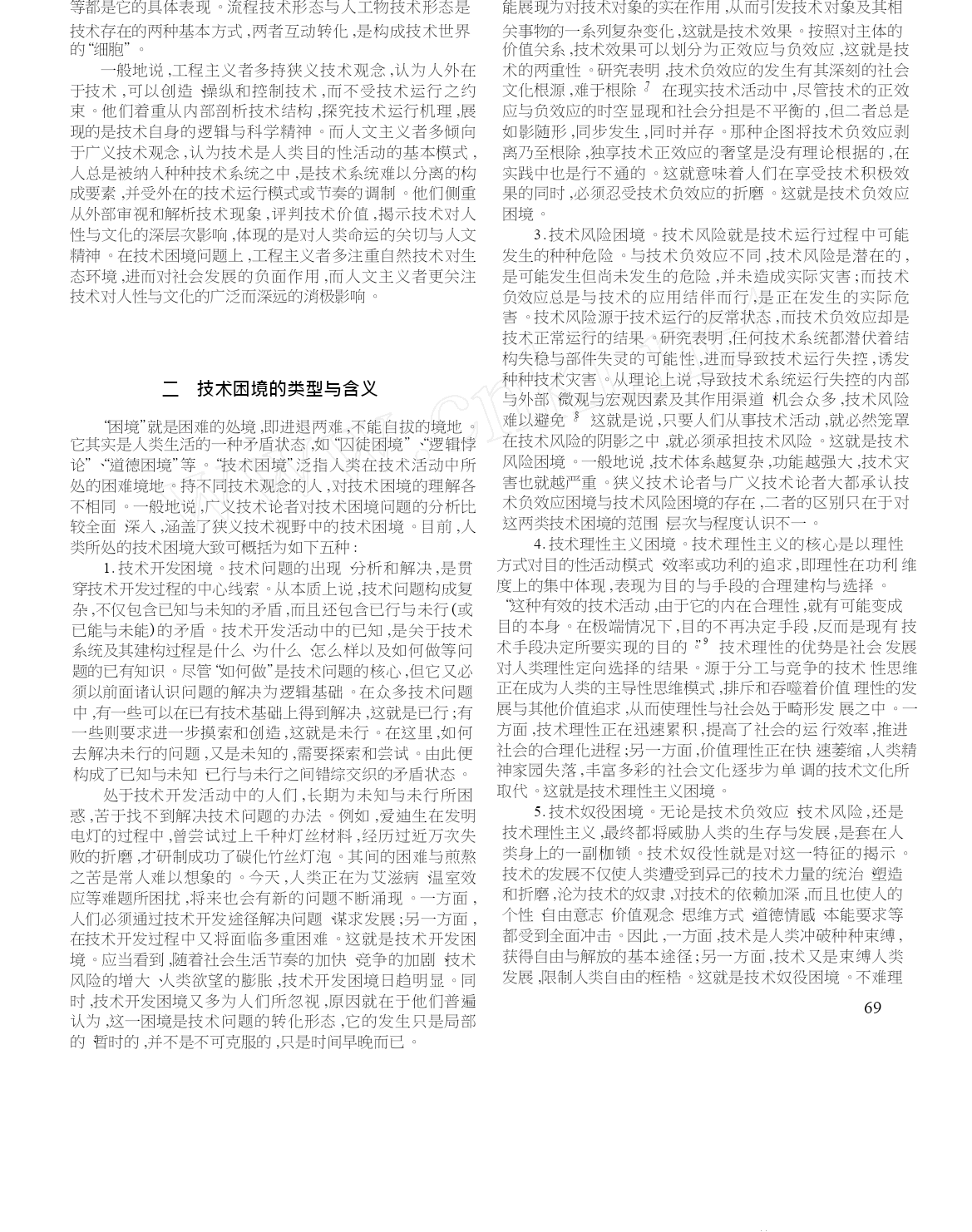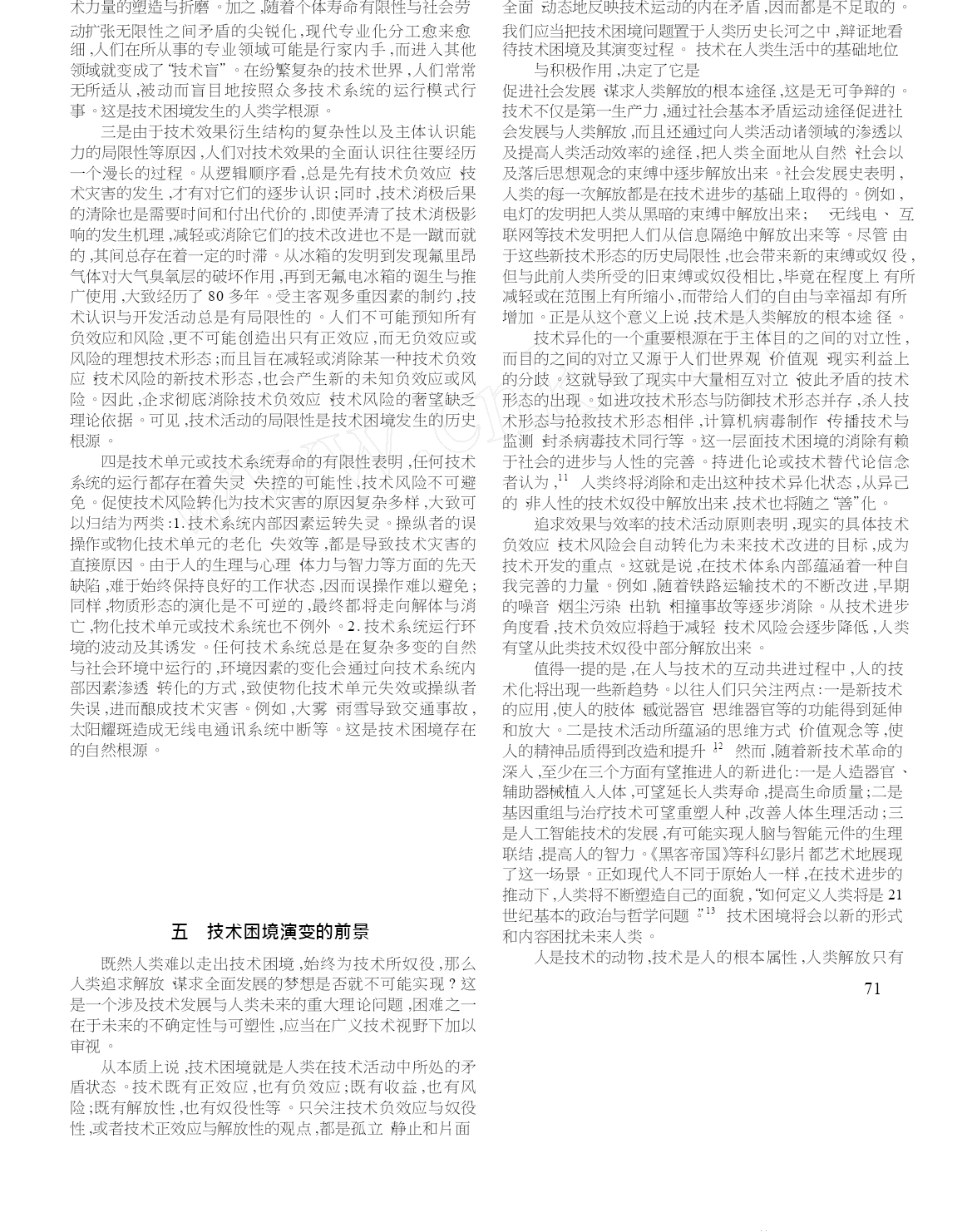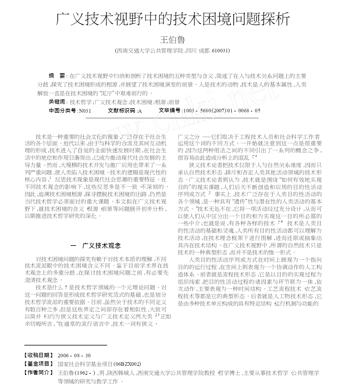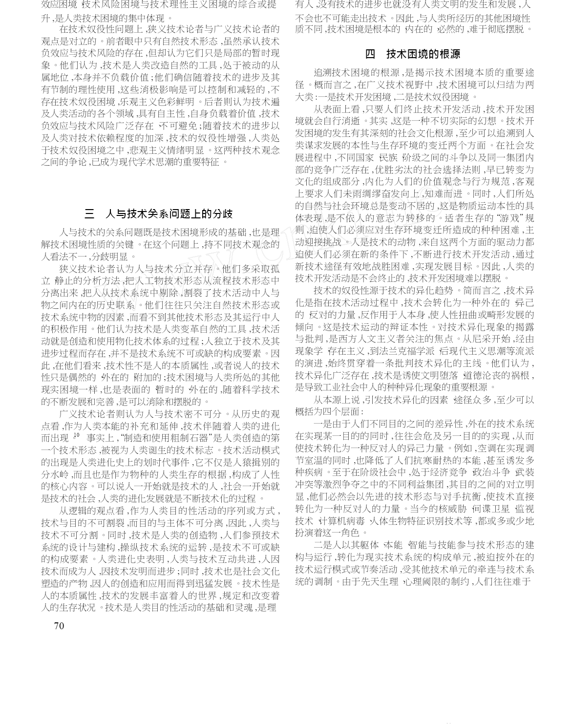 广义技术视野中的技术困境问题探析(完整版)(文档可以直接使用,也可根据实际需要修改使用,可编辑欢迎下载)广义技术视野中的技术困境问题探析王伯鲁(西南交通大学公共管理学院,四川成都610031)摘要:在广义技术视野中归纳和剖析了技术困境的五种类型与含义,简述了在人与技术关系问题上的主要分歧,探究了技术困境形成的根源,并展望了技术困境演变的前景。人是技术的动物,技术是人的基本属性,人类解放一直是在技术困境的“泥泞”中艰难前行的。关键词:技术哲学;广义技术观念;技术困境;根源;前景中图分类号:N031文献标识码:A文章编号:1003-5680(2007)01-0068-05技术是一种重要的社会文化的现象,广泛存在于社会生活的各个层面。近代以来,由于与科学的合流及其间互动机理的形成,技术进入了自觉的全面快速发展时期,在社会生活中的地位和作用日渐突出,已成为推动现代社会发展的主导力量。然而,大规模的技术开发与推广应用也带来了一系列严重问题,使人类陷入技术困境。技术的逻辑是现代性的核心内容,1反思技术现象是现代社会思潮的重要特征。在不同技术观念的影响下,这些反思多是不一致、不深刻的。因此,追溯技术困境根源,探寻摆脱技术困境的出路,仍然是当代技术哲学必须面对的重大课题。本文拟在广义技术视野下,就技术困境的含义、根源、前景等问题展开初步分析,以期推进技术哲学研究的深化。广义之分———它们取决于工程技术人员和社会科学工作者运用这个词的不同方式。一开始就注意到这一点是很重要的,因为这两种用法之间的不同引出了一系列的概念之争,很容易由此造成分析上的混乱。”4狭义技术论者把技术仅限于人与自然关系维度,因而只承认自然技术形态,排斥和否定人类其他活动领域的技术形态。广义技术论者则认为,技术就是围绕“如何有效地实现目的”的现实课题,人们后天不断创造和应用的目的性活动序列或方式。5事实上,技术广泛存在于人类目的性活动的各个领域,是一种具有“遗传”性与潜在性的人类活动的基本方式。“技术无处不在,它将一项活动经过充分设计,从而可以使人们从中区分出一个目的和为实现这一目的所必需的一些中介;也就是说,有各种各样的技术。”6技术是人类目的性活动的基础和灵魂,人类所有目的性活动都可以理解为技术活动,在技术理念框架下进行图解,进而还原或抽象出其内在技术结构。在广义技术视野中,所谓的自然技术只是技术的一种典型形态,而并不是技术的惟一形式。人类目的性活动序列或方式在时间上展现为一个指向目的的运行过程,在空间上则表现为一个协调动作的人工构造体系。前者就是流程技术形态,它是以目的的实现过程为组织线索,把目的性活动过程的诸因素与环节联为一体,依次动作,主要表现为一种时间结构。工艺流程技术、农艺流程技术等都是它的典型形态。后者就是人工物技术形态,它是由多种技术单元构成的具有特定结构、运行机制与功能的一广义技术观念对技术困境问题的探究有赖于对技术本质的理解,不同技术流派眼中的技术困境含义不同。鉴于目前学术界在技术观念上的多重分歧,在探讨技术困境问题之前,有必要先澄清技术观念。技术是什么?是技术哲学领域的一个元理论问题。对这一问题的回答是形成技术哲学研究范式的基础,也是划分技术哲学流派的重要依据。目前,虽然关于技术的不同定义有数百种之多,但是这些界定之间却存在着相似性,大致可以简并、归约为狭义技术定义与广义技术定义两大类。23正如米切姆所言“,在通常的流行语言中,技术一词有狭义、【收稿日期】2006-08-30【基金项目】国家社会科学基金项目(06BZX002)【作者简介】王伯鲁(1962-),男,陕西韩城人,西南交通大学公共管理学院教授、哲学博士,主要从事技术哲学、公共管理学等领域的研究与教学工作。等都是它的具体表现。流程技术形态与人工物技术形态是能展现为对技术对象的实在作用,从而引发技术对象及其相技术存在的两种基本方式,两者互动转化,是构成技术世界的“细胞”。一般地说,工程主义者多持狭义技术观念,认为人外在于技术,可以创造、操纵和控制技术,而不受技术运行之约束。他们着重从内部剖析技术结构,探究技术运行机理,展现的是技术自身的逻辑与科学精神。而人文主义者多倾向于广义技术观念,认为技术是人类目的性活动的基本模式,人总是被纳入种种技术系统之中,是技术系统难以分离的构成要素,并受外在的技术运行模式或节奏的调制。他们侧重从外部审视和解析技术现象,评判技术价值,揭示技术对人性与文化的深层次影响,体现的是对人类命运的关切与人文精神。在技术困境问题上,工程主义者多注重自然技术对生态环境,进而对社会发展的负面作用,而人文主义者更关注技术对人性与文化的广泛而深远的消极影响。关事物的一系列复杂变化,这就是技术效果。按照对主体的价值关系,