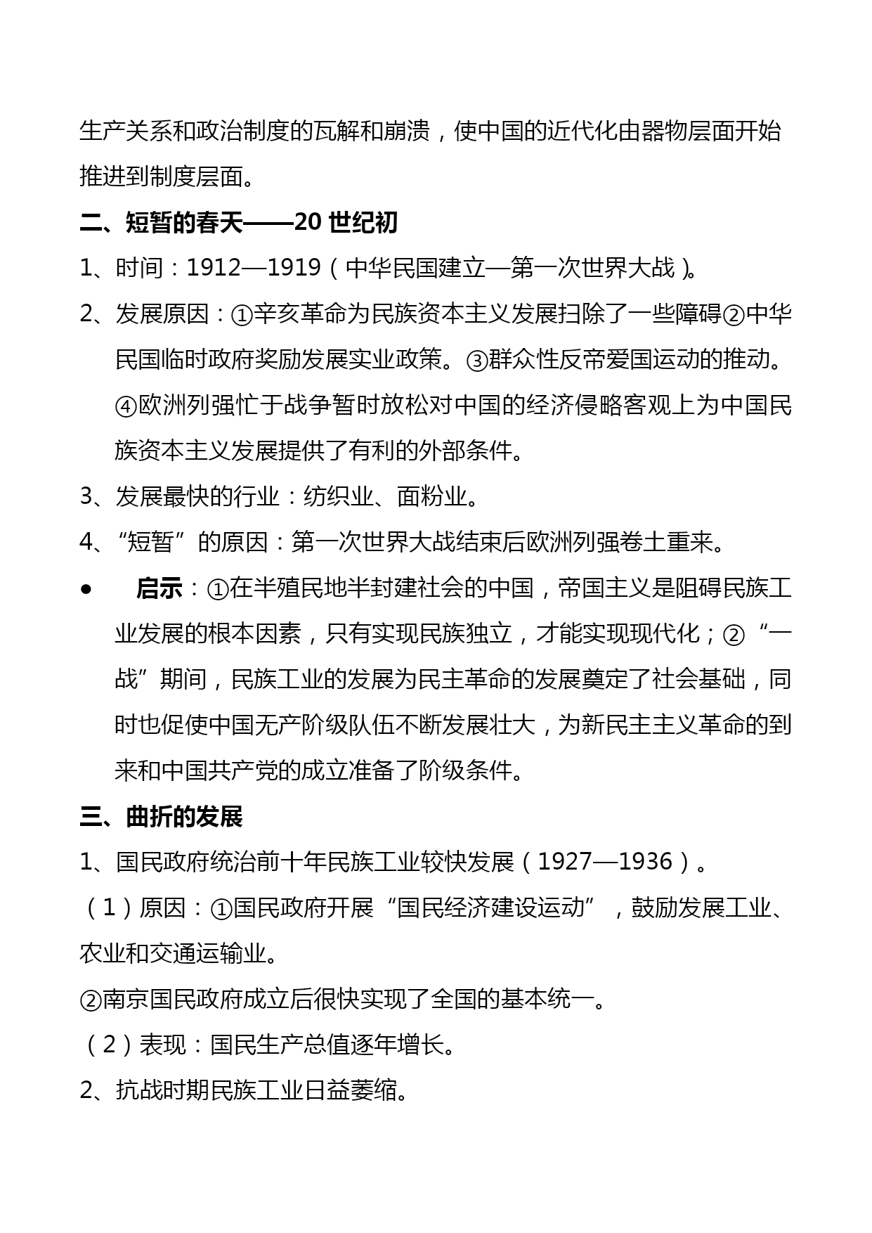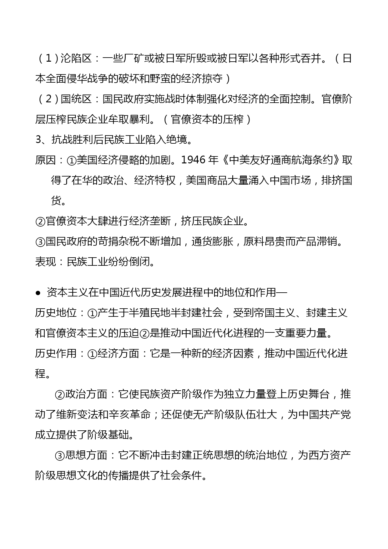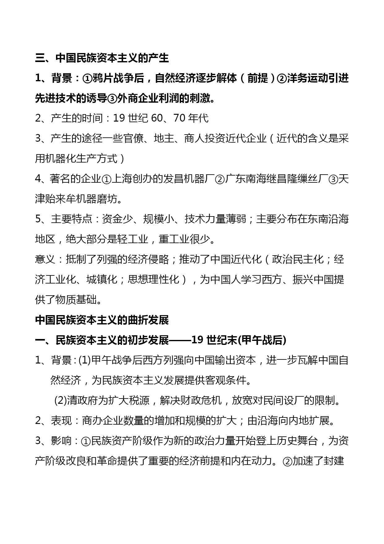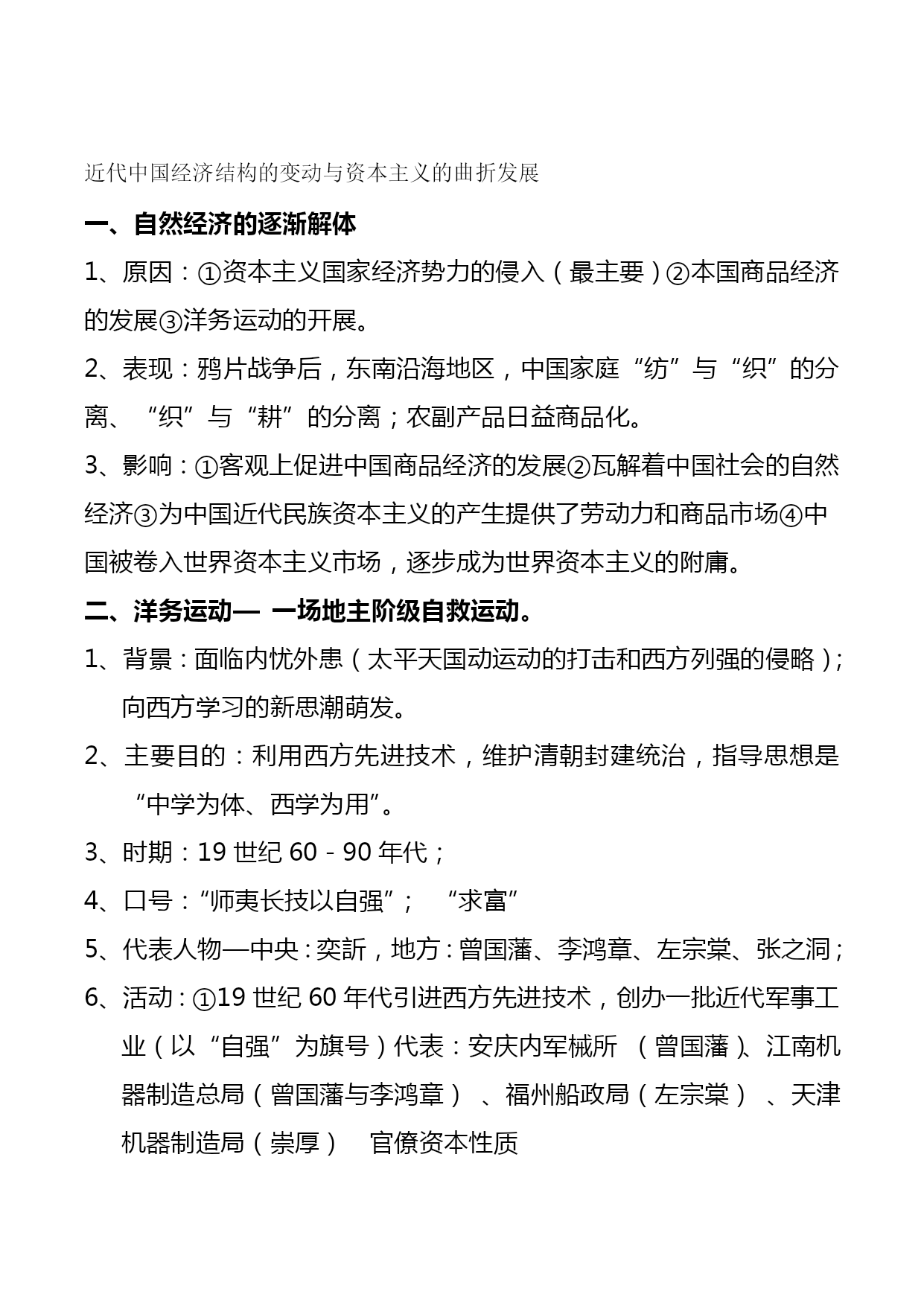近代中国经济结构的变动与资本主义的曲折发展知识点名师资料合集(完整版)资料(可以直接使用,可编辑优秀版资料,欢迎下载)近代中国经济结构的变动与资本主义的曲折发展一、自然经济的逐渐解体1、原因:①资本主义国家经济势力的侵入(最主要)②本国商品经济的发展③洋务运动的开展。2、表现:鸦片战争后,东南沿海地区,中国家庭“纺”与“织”的分离、“织”与“耕”的分离;农副产品日益商品化。3、影响:①客观上促进中国商品经济的发展②瓦解着中国社会的自然经济③为中国近代民族资本主义的产生提供了劳动力和商品市场④中国被卷入世界资本主义市场,逐步成为世界资本主义的附庸。二、洋务运动—一场地主阶级自救运动。1、背景:面临内忧外患(太平天国动运动的打击和西方列强的侵略);向西方学习的新思潮萌发。2、主要目的:利用西方先进技术,维护清朝封建统治,指导思想是“中学为体、西学为用”。3、时期:19世纪60-90年代;4、口号:“师夷长技以自强”;“求富”5、代表人物—中央:奕訢,地方:曾国藩、李鸿章、左宗棠、张之洞;6、活动:①19世纪60年代引进西方先进技术,创办一批近代军事工业(以“自强”为旗号)代表:安庆内军械所(曾国藩)、江南机器制造总局(曾国藩与李鸿章)、福州船政局(左宗棠)、天津机器制造局(崇厚)官僚资本性质②19世纪70年代创办一批近代民用工业(以“求富”为旗号,目的:解决军事工业方面的困难)代表:李鸿章创办的轮船招商局和开平煤矿;张之洞创办的汉阳铁厂和湖北织布局。性质:本质为封建经济,带有资本主义性质。③19世纪70年代中期起筹划海防(建成北洋、南洋、福建三支海军)④为适应洋务运动的需要,创办了京师同文馆等一批新式学堂,培养翻译、军事和科技人才,又选派留学生出国深造,开近代教育先河。7、失败标志:清军在甲午中日战争中惨败北洋水师全军覆没,宣告了洋务运动的破产。洋务运动失败原因有:①没有彻底变革封建制度(根本原因)②列强不希望中国富强③顽固派的阻挠和破坏④中央缺乏一个健全有力的领导核心。只引技术,不变专制制度,注定失败。8、积极作用—是中国近代化的开端,推动了中国的近代化。①引进了西方资本主义国家的一些近代科学技术,培养了一批科技人员和技术工人②在客观上既刺激了资本主义的发展,又对外国经济势力扩张起了一定抵制作用③对本国封建经济的瓦解也起到了一定的促进作用④打开中国教育的近代化历程。三、中国民族资本主义的产生1、背景:①鸦片战争后,自然经济逐步解体(前提)②洋务运动引进先进技术的诱导③外商企业利润的刺激。2、产生的时间:19世纪60、70年代3、产生的途径一些官僚、地主、商人投资近代企业(近代的含义是采用机器化生产方式)4、著名的企业①上海创办的发昌机器厂②广东南海继昌隆缫丝厂③天津贻来牟机器磨坊。5、主要特点:资金少、规模小、技术力量薄弱;主要分布在东南沿海地区,绝大部分是轻工业,重工业很少。意义:抵制了列强的经济侵略;推动了中国近代化(政治民主化;经济工业化、城镇化;思想理性化),为中国人学习西方、振兴中国提供了物质基础。中国民族资本主义的曲折发展一、民族资本主义的初步发展——19世纪末(甲午战后)1、背景:(1)甲午战争后西方列强向中国输出资本,进一步瓦解中国自然经济,为民族资本主义发展提供客观条件。(2)清政府为扩大税源,解决财政危机,放宽对民间设厂的限制。2、表现:商办企业数量的增加和规模的扩大;由沿海向内地扩展。3、影响:①民族资产阶级作为新的政治力量开始登上历史舞台,为资产阶级改良和革命提供了重要的经济前提和内在动力。②加速了封建生产关系和政治制度的瓦解和崩溃,使中国的近代化由器物层面开始推进到制度层面。二、短暂的春天——20世纪初1、时间:1912—1919(中华民国建立—第一次世界大战)。2、发展原因:①辛亥革命为民族资本主义发展扫除了一些障碍②中华民国临时政府奖励发展实业政策。③群众性反帝爱国运动的推动。④欧洲列强忙于战争暂时放松对中国的经济侵略客观上为中国民族资本主义发展提供了有利的外部条件。3、发展最快的行业:纺织业、面粉业。4、“短暂”的原因:第一次世界大战结束后欧洲列强卷土重来。启示:①在半殖民地半封建社会的中国,帝国主义是阻碍民族工业发展的根本因素,只有实现民族独立,才能实现现代化;②“一战”期间,民族工业的发展为民主革命的发展奠定了社会基础,同时也促使中国无产阶级队伍不断发展壮大,为新民主主义革命的到来和中国共产党的成立准备了阶级条件。三、曲折的发展1、国民政府统治前十年民族工业较快发展(1927—1936)。(1)原因:①国民政府开展“国民经济建设运动”,鼓励发展工业、农业和交通运输业。②南京国民政府成立后很
