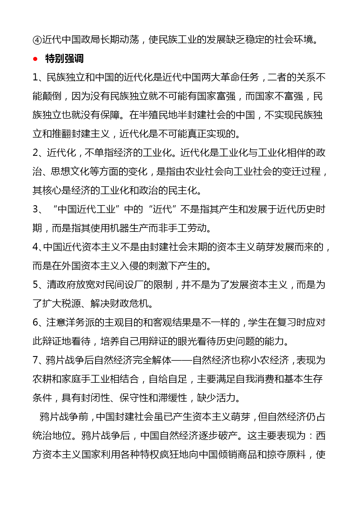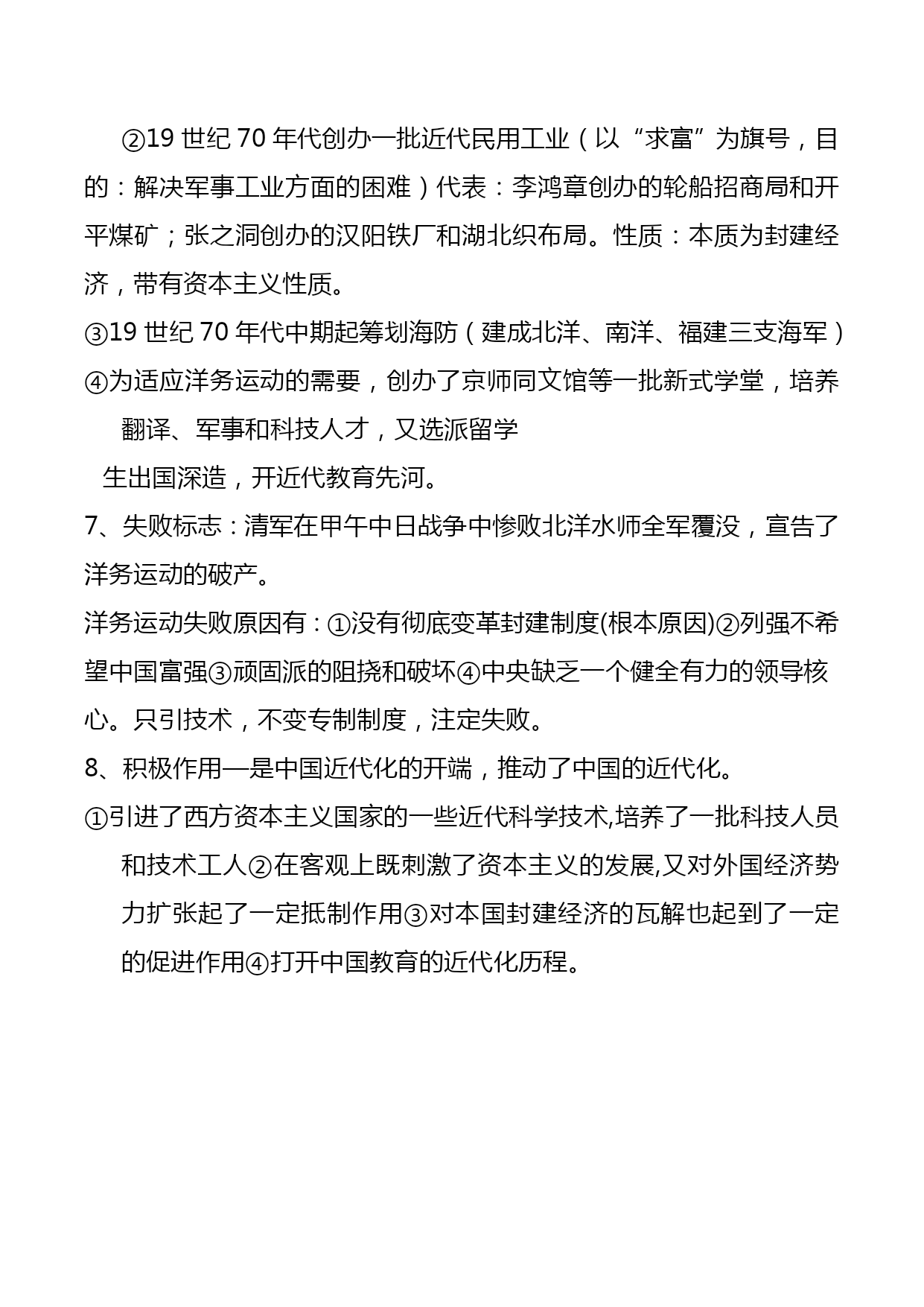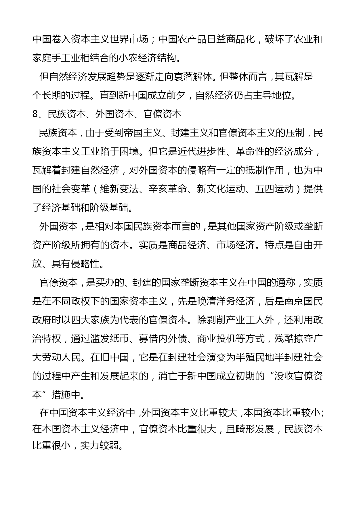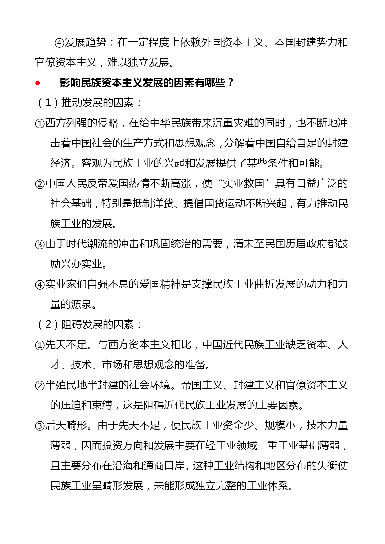 近代中国经济结构的变动与资本主义的曲折发展知识点名师资料合集(完整版)资料(可以直接使用,可编辑优秀版资料,欢迎下载)近代中国经济结构的变动与资本主义的曲折发展一、自然经济的逐渐解体1、原因:①资本主义国家经济势力的侵入(最主要)②本国商品经济的发展③洋务运动的开展。2、表现:鸦片战争后,东南沿海地区,中国家庭“纺”与“织”的分离、“织”与“耕”的分离;农副产品日益商品化。3、影响:①客观上促进中国商品经济的发展②瓦解着中国社会的自然经济③为中国近代民族资本主义的产生提供了劳动力和商品市场④中国被卷入世界资本主义市场,逐步成为世界资本主义的附庸。二、洋务运动—一场地主阶级自救运动。1、背景:面临内忧外患(太平天国动运动的打击和西方列强的侵略);向西方学习的新思潮萌发。2、主要目的:利用西方先进技术,维护清朝封建统治,指导思想是“中学为体、西学为用”。3、时期:19世纪60-90年代;4、口号:“师夷长技以自强”;“求富”5、代表人物—中央:奕訢,地方:曾国藩、李鸿章、左宗棠、张之洞;6、活动:①19世纪60年代引进西方先进技术,创办一批近代军事工业(以“自强”为旗号)代表:安庆内军械所(曾国藩)、江南机器制造总局(曾国藩与李鸿章)、福州船政局(左宗棠)、天津机器制造局(崇厚)官僚资本性质②19世纪70年代创办一批近代民用工业(以“求富”为旗号,目的:解决军事工业方面的困难)代表:李鸿章创办的轮船招商局和开平煤矿;张之洞创办的汉阳铁厂和湖北织布局。性质:本质为封建经济,带有资本主义性质。③19世纪70年代中期起筹划海防(建成北洋、南洋、福建三支海军)④为适应洋务运动的需要,创办了京师同文馆等一批新式学堂,培养翻译、军事和科技人才,又选派留学生出国深造,开近代教育先河。7、失败标志:清军在甲午中日战争中惨败北洋水师全军覆没,宣告了洋务运动的破产。洋务运动失败原因有:①没有彻底变革封建制度(根本原因)②列强不希望中国富强③顽固派的阻挠和破坏④中央缺乏一个健全有力的领导核心。只引技术,不变专制制度,注定失败。8、积极作用—是中国近代化的开端,推动了中国的近代化。①引进了西方资本主义国家的一些近代科学技术,培养了一批科技人员和技术工人②在客观上既刺激了资本主义的发展,又对外国经济势力扩张起了一定抵制作用③对本国封建经济的瓦解也起到了一定的促进作用④打开中国教育的近代化历程。三、中国民族资本主义的产生1、背景:①鸦片战争后,自然经济逐步解体(前提)②洋务运动引进先进技术的诱导③外商企业利润的刺激。2、产生的时间:19世纪60、70年代3、产生的途径一些官僚、地主、商人投资近代企业(近代的含义是采用机器化生产方式)4、著名的企业①上海创办的发昌机器厂②广东南海继昌隆缫丝厂③天津贻来牟机器磨坊。5、主要特点:资金少、规模小、技术力量薄弱;主要分布在东南沿海地区,绝大部分是轻工业,重工业很少。意义:抵制了列强的经济侵略;推动了中国近代化(政治民主化;经济工业化、城镇化;思想理性化),为中国人学习西方、振兴中国提供了物质基础。中国民族资本主义的曲折发展一、民族资本主义的初步发展——19世纪末(甲午战后)1、背景:(1)甲午战争后西方列强向中国输出资本,进一步瓦解中国自然经济,为民族资本主义发展提供客观条件。(2)清政府为扩大税源,解决财政危机,放宽对民间设厂的限制。2、表现:商办企业数量的增加和规模的扩大;由沿海向内地扩展。3、影响:①民族资产阶级作为新的政治力量开始登上历史舞台,为资产阶级改良和革命提供了重要的经济前提和内在动力。②加速了封建生产关系和政治制度的瓦解和崩溃,使中国的近代化由器物层面开始推进到制度层面。二、短暂的春天——20世纪初1、时间:1912—1919(中华民国建立—第一次世界大战)。2、发展原因:①辛亥革命为民族资本主义发展扫除了一些障碍②中华民国临时政府奖励发展实业政策。③群众性反帝爱国运动的推动。④欧洲列强忙于战争暂时放松对中国的经济侵略客观上为中国民族资本主义发展提供了有利的外部条件。3、发展最快的行业:纺织业、面粉业。4、“短暂”的原因:第一次世界大战结束后欧洲列强卷土重来。启示:①在半殖民地半封建社会的中国,帝国主义是阻碍民族工业发展的根本因素,只有实现民族独立,才能实现现代化;②“一战”期间,民族工业的发展为民主革命的发展奠定了社会基础,同时也促使中国无产阶级队伍不断发展壮大,为新民主主义革命的到来和中国共产党的成立准备了阶级条件。三、曲折的发展1、国民政府统治前十年民族工业较快发展(1927—1936)。(1)原因:①国民政府开展“国民经济建设运动”,鼓励发展工业、农业和交通运输业。②南京国民政府成立后很