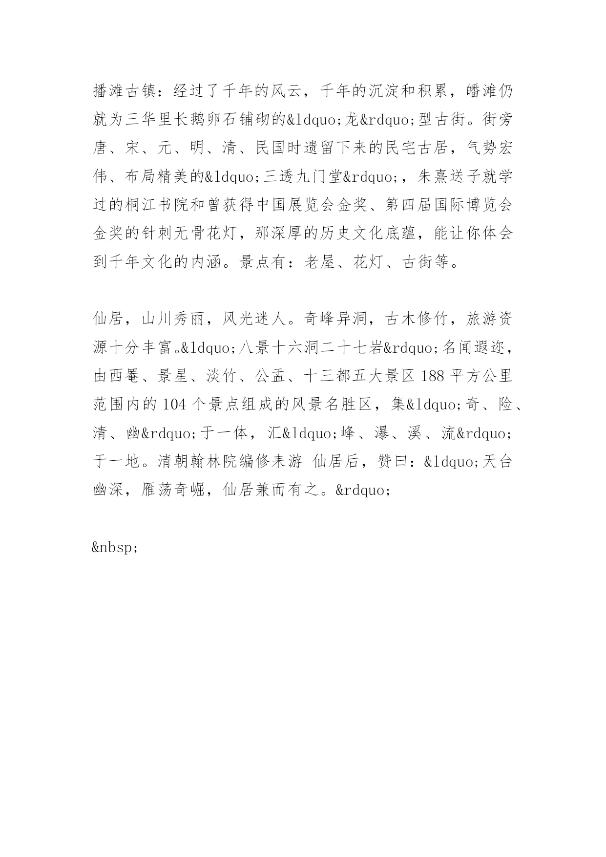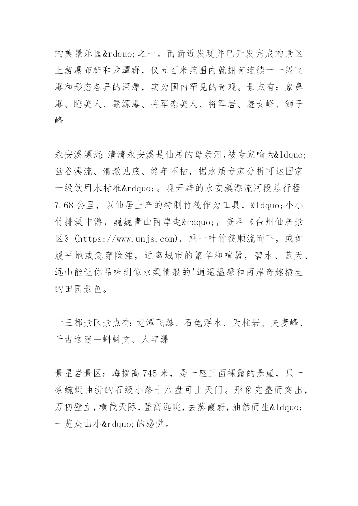 台州仙居景区-资料台州仙居景区-资料仙居县位于浙江省东南部,原名乐安、永安,台州仙居景区。北宋景德四(1007)年,宋真宗以其“洞天名山,屏蔽周围,而多神仙之宅”,诏改仙居,意为“仙人居住之地”。仙居风景名胜区,总面积187.8平方公里,含神仙居、景星、十三都、公盂、淡竹五大景区,集奇、险、清、幽于一体,汇峰、瀑、溪、林于一地。清翰林院编修潘耒游后赞曰:“天台幽深,雁荡奇崛,仙居兼而有之”。宋大理学家朱熹也曾发出“地气垂于此矣!”的惊叹。历史悠久的千年古邑,有仅风景秀丽,拥有令人赞叹不已的自然景观,同时也有着十分丰富的人文景观及灿烂的历史文化。内有神仙居景区:幽幽神仙居,融险峰、幽谷、秀林、奇瀑于一体,总面积15.8平方公里。景区内奇峰环列,山崖陡峭,基岩落石处处成景,有鬼斧神工之作的将军岩、神态安详的睡美人、因风作态的飞天瀑等景点60多个,身临其景,处于袅袅雾霭之中,大有飘飘欲仙之感,在1997年省旅游局组织的风景名胜区评选中被评为全省“游客最喜爱的美景乐园”之一。而新近发现并已开发完成的景区上游瀑布群和龙潭群,仅五百米范围内就拥有连续十一级飞瀑和形态各异的深潭,实为国内罕见的奇观。景点有:象鼻瀑、睡美人、罨源瀑、将军恋美人、将军岩、羞女峰、狮子峰永安溪漂流:清清永安溪是仙居的母亲河,被专家喻为“幽谷溪流、清澈见底、终年不枯,据水质专家分析可达国家一级饮用水标准”。现开辟的永安溪漂流河段总行程7.68公里,以仙居土产的特制竹筏作为工具,“小小竹排溪中游,巍巍青山两岸走”,资料《台州仙居景区》(https://www.unjs.com)。乘一叶竹筏顺流而下,或如履平地或急穿险滩,远离城市的繁华和喧嚣,碧水、蓝天、远山能让你品味到似水柔情般的'逍遥温馨和两岸奇趣横生的田园景色。十三都景区景点有:龙潭飞瀑、石龟浮水、天柱岩、夫妻峰、千古这谜-蝌蚪文、人字瀑景星岩景区:海拨高745米,是一座三面裸露的悬崖,只一条蜿蜒曲折的石级小路十八盘可上天门。形象完整而突出,万仞壁立,横截天际,登高远眺,去蒸霞蔚,油然而生“一览众山小”的感觉。播滩古镇:经过了千年的风云,千年的沉淀和积累,皤滩仍就为三华里长鹅卵石铺砌的“龙”型古街。街旁唐、宋、元、明、清、民国时遗留下来的民宅古居,气势宏伟、布局精美的“三透九门堂”,朱熹送子就学过的桐江书院和曾获得中国展览会金奖、第四届国际博览会金奖的针刺无骨花灯,那深厚的历史文化底蕴,能让你体会到千年文化的内涵。景点有:老屋、花灯、古街等。仙居,山川秀丽,风光迷人。奇峰异洞,古木修竹,旅游资源十分丰富。“八景十六洞二十七岩”名闻遐迩,由西罨、景星、淡竹、公盂、十三都五大景区188平方公里范围内的104个景点组成的风景名胜区,集“奇、险、清、幽”于一体,汇“峰、瀑、溪、流”于一地。清朝翰林院编修耒游仙居后,赞曰:“天台幽深,雁荡奇崛,仙居兼而有之。”
