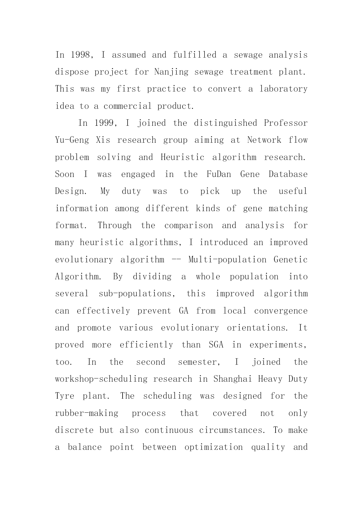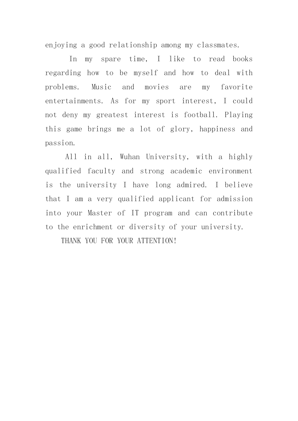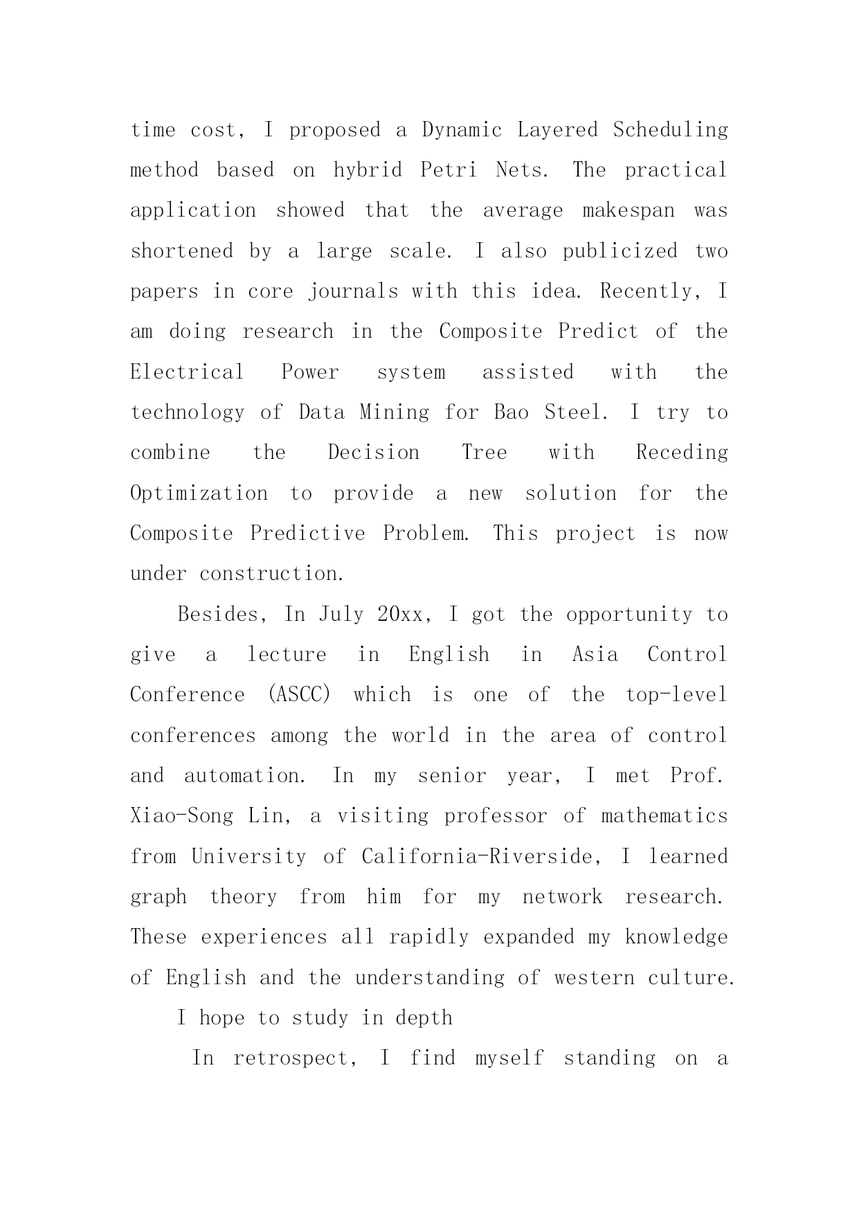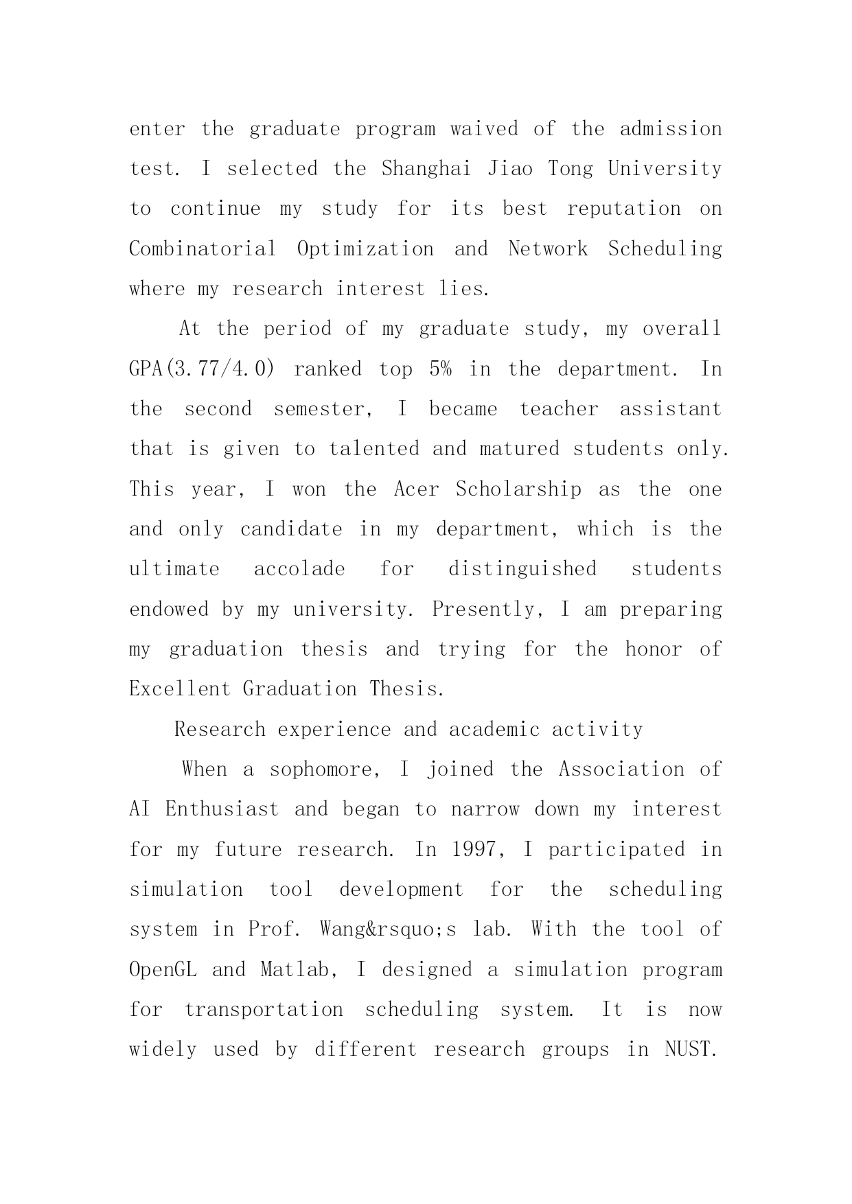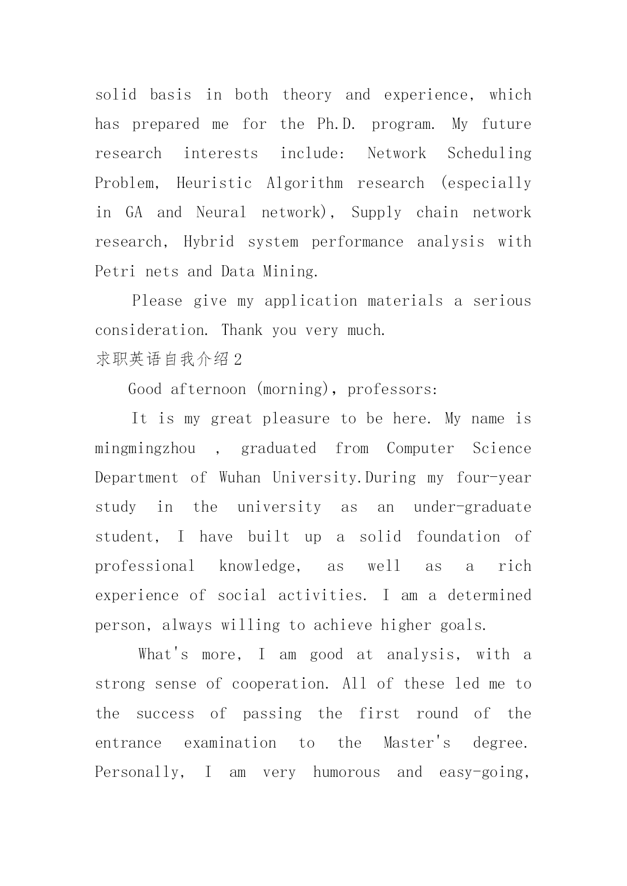 求职英语自我介绍求职英语自我介绍当碰到不熟悉的.人时,可能需要我们进行自我介绍,自我介绍是认识自我的手段。怎么写自我介绍才能避免踩雷呢?下面是小编整理的求职英语自我介绍,希望对大家有所帮助。求职英语自我介绍1GeneralIntroductionIamathirdyearmastermajorinautomationatShanghaiJiaoTongUniversity,P.R.China.WithtremendousinterestinIndustrialEngineering,IamwritingtoapplyforacceptanceintoyourPh.D.graduateprogram.EducationbackgroundIn1995,IenteredtheNanjingUniversityofScienceTechnology(NUST)--widelyconsideredoneoftheChina’sbestengineeringschools.Duringthefollowingundergraduatestudy,myacademicrecordskeptdistinguishedamongthewholedepartment.IwasgrantedFirstClassPrizeeverysemester,andmyoverallGPA(89.5/100)rankedNo.1among113students.In1999,Igottheprivilegetoenterthegraduateprogramwaivedoftheadmissiontest.IselectedtheShanghaiJiaoTongUniversitytocontinuemystudyforitsbestreputationonCombinatorialOptimizationandNetworkSchedulingwheremyresearchinterestlies.Attheperiodofmygraduatestudy,myoverallGPA(3.77/4.0)rankedtop5%inthedepartment.Inthesecondsemester,Ibecameteacherassistantthatisgiventotalentedandmaturedstudentsonly.Thisyear,IwontheAcerScholarshipastheoneandonlycandidateinmydepartment,whichistheultimateaccoladefordistinguishedstudentsendowedbymyuniversity.Presently,IampreparingmygraduationthesisandtryingforthehonorofExcellentGraduationThesis.ResearchexperienceandacademicactivityWhenasophomore,IjoinedtheAssociationofAIEnthusiastandbegantonarrowdownmyinterestformyfutureresearch.In1997,IparticipatedinsimulationtooldevelopmentfortheschedulingsysteminProf.Wang’slab.WiththetoolofOpenGLandMatlab,Idesignedasimulationprogramfortransportationschedulingsystem.ItisnowwidelyusedbydifferentresearchgroupsinNUST.In1998,IassumedandfulfilledasewageanalysisdisposeprojectforNanjingsewagetreatmentplant.Thiswasmyfirstpracticetoconvertalaboratoryideatoacommercialproduct.In1999,IjoinedthedistinguishedProfessorYu-GengXisresearchgroupaimingatNetworkflowproblemsolvingandHeuristicalgorithmresearch.SoonIwasengagedintheFuDanGeneDatabaseDesign.Mydutywastopickuptheusefulinformationamongdifferentkindsof