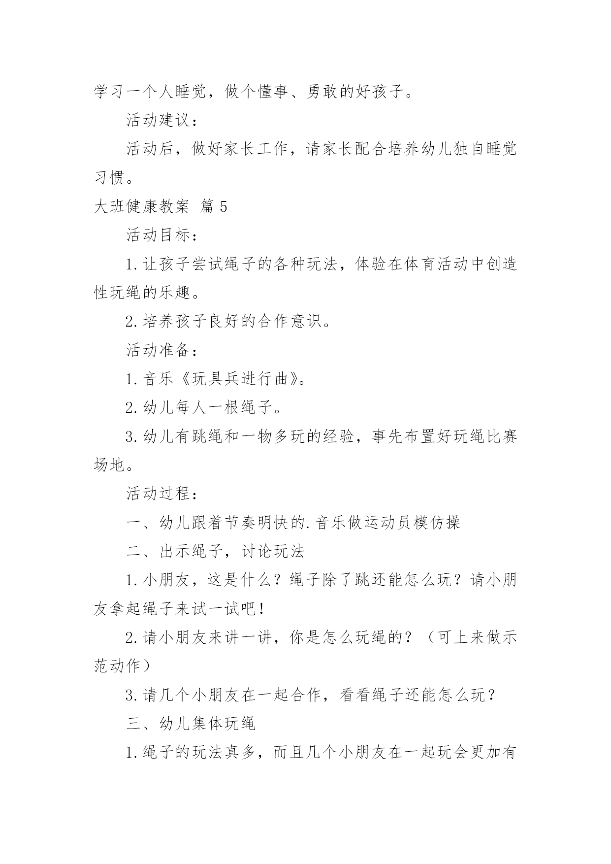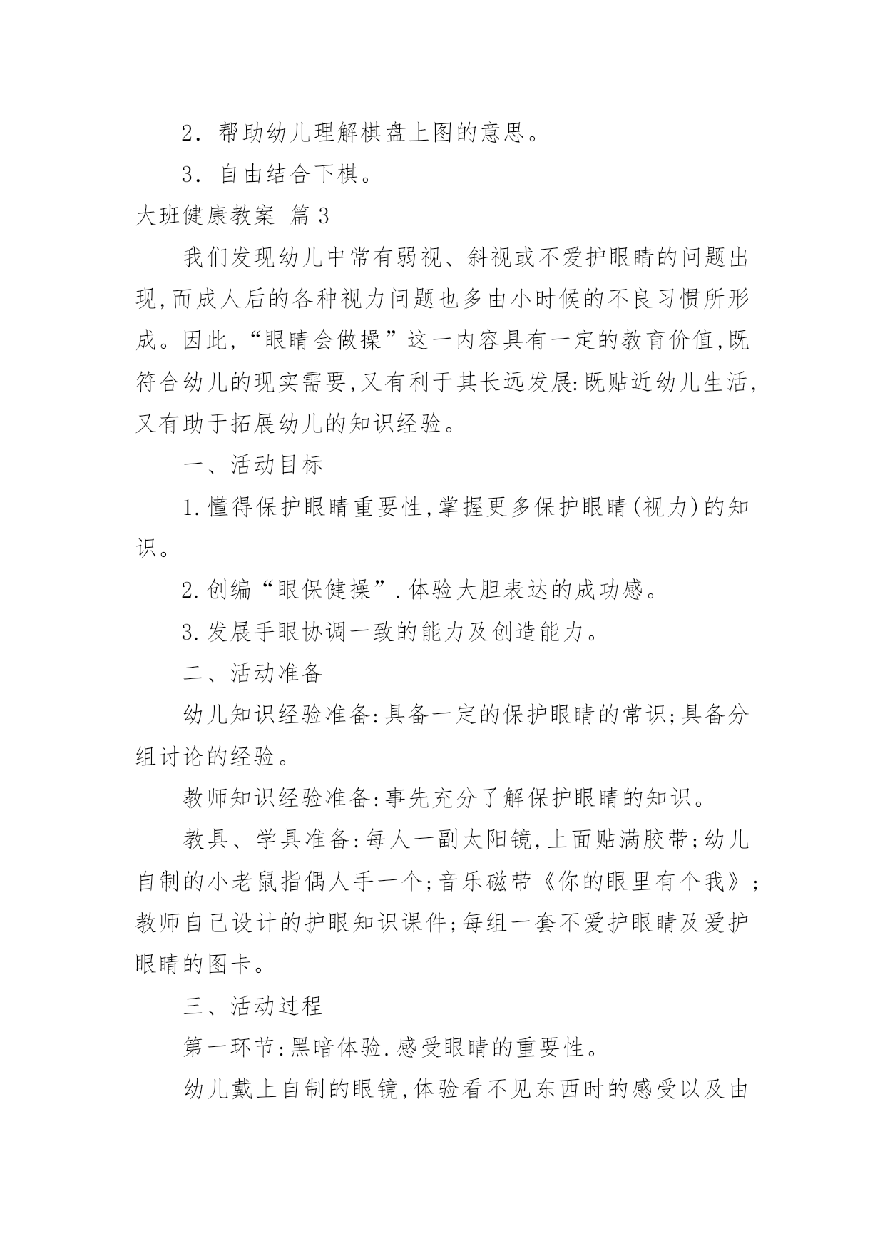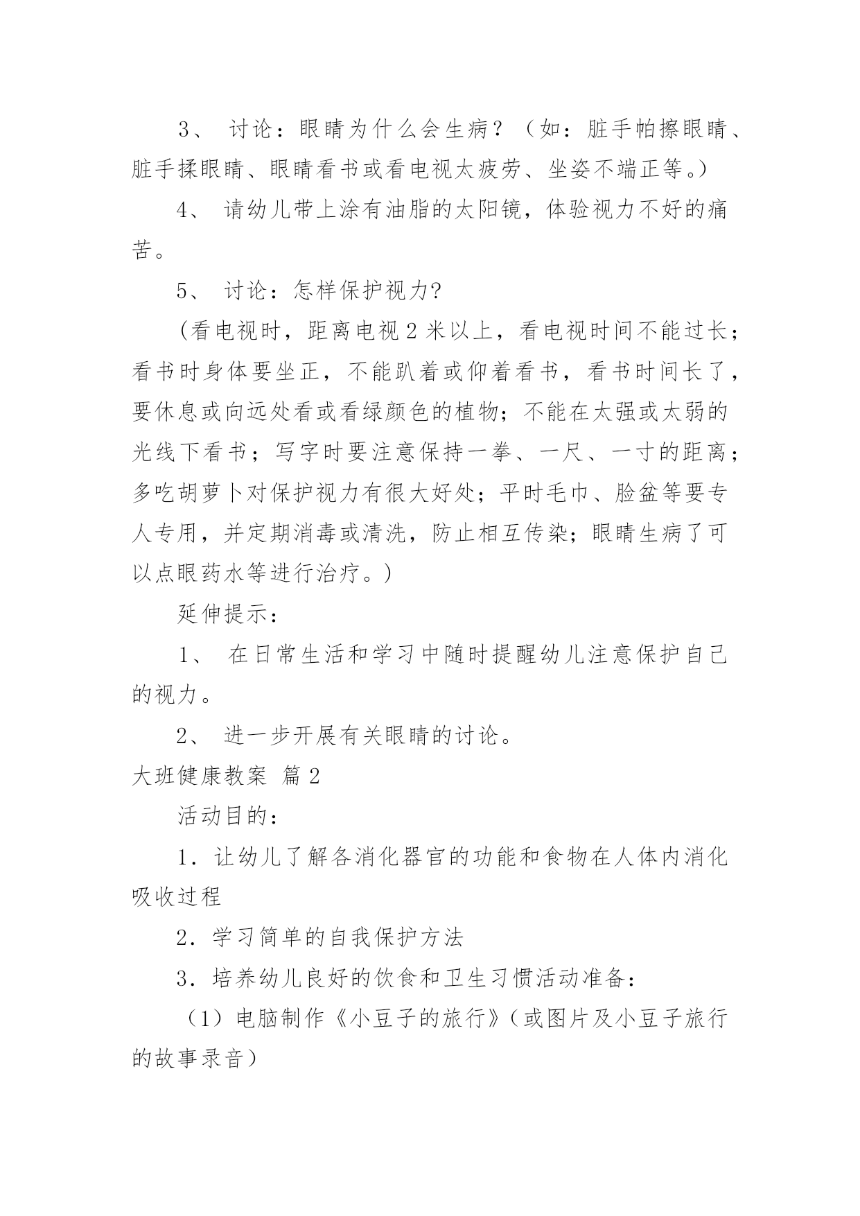 大班健康教案有关大班健康教案锦集5篇作为一名为他人授业解惑的教育工作者,很有必要精心设计一份教案,教案是教学活动的依据,有着重要的地位。那么教案应该怎么写才合适呢?下面是小编为大家收集的大班健康教案5篇,仅供参考,大家一起来看看吧。大班健康教案篇1容明娟活动目标:1、了解有关眼睛的构造和卫生方面的知识,防止眼疾。2、懂得爱护自己眼睛的'重要性。3、萌发从小珍爱生命的意识。活动准备:1、收集有关眼睛方面的资料。2、对班级幼儿视力进行事先了解。3、在一副幼儿太阳镜上涂上油脂,使眼睛看东西模糊。4、挂图《眼睛生病了》。过程建议:1、交流自己收集的有关眼睛的资料。2、出示挂图《眼睛生病了》,提问:这个小朋友为什么要揉眼睛?他的眼睛怎么了?眼睛会生什么病呢?(近视眼、红眼病、沙眼、结膜炎、麦粒肿等。)3、讨论:眼睛为什么会生病?(如:脏手帕擦眼睛、脏手揉眼睛、眼睛看书或看电视太疲劳、坐姿不端正等。)4、请幼儿带上涂有油脂的太阳镜,体验视力不好的痛苦。5、讨论:怎样保护视力?(看电视时,距离电视2米以上,看电视时间不能过长;看书时身体要坐正,不能趴着或仰着看书,看书时间长了,要休息或向远处看或看绿颜色的植物;不能在太强或太弱的光线下看书;写字时要注意保持一拳、一尺、一寸的距离;多吃胡萝卜对保护视力有很大好处;平时毛巾、脸盆等要专人专用,并定期消毒或清洗,防止相互传染;眼睛生病了可以点眼药水等进行治疗。)延伸提示:1、在日常生活和学习中随时提醒幼儿注意保护自己的视力。2、进一步开展有关眼睛的讨论。大班健康教案篇2活动目的:1.让幼儿了解各消化器官的功能和食物在人体内消化吸收过程2.学习简单的自我保护方法3.培养幼儿良好的饮食和卫生习惯活动准备:(1)电脑制作《小豆子的旅行》(或图片及小豆子旅行的故事录音)(2)健康知识卡片、消化图、自制健康行为棋活动过程:(一)观看"小豆子的旅行",了解各器官的功能今天,有颗小豆子要到淘淘的消化器官中去旅行,它会看到些什么,里面会发生什么事呢?请小豆子来告诉我们。1、放第一段食物从口腔到食管的动画。提问:小豆子从哪里进去?看到了什么?2、放第二段,了解胃的功能。提问:胃有什么作用?小豆子在胃里还看见了什么?我们怎样来保护我们的胃呢?小结:以后我们要注意,少吃冷、硬的东西,少吃零食,不吃不干净的东西,不能吃得太饱,也不能饿坏了胃,要吃饱早饭少喝冷饮。(这一部分的目标是让幼儿在了解胃的功能的基础上知道不良的饮食习惯会使胃生病。)3、放第三段,提问:小豆子到哪里去?(小肠)小肠有什么用呢?小豆子在小肠里看到些什么呢?小豆子为什么没有从小门里出去呢?(这一部分的目标是让幼儿知道食物没有被磨碎就不能被身体吸收利用。)4、第四段录音。提问:小豆子又到了哪里呢?大肠里都是些什么呢?什么叫残渣?能不能让残渣长时间在体内呢?小结:我们小朋友要定时大便。(二)分组找顺序排图我们知道了每个消化器官的用处,现在,老师为每组小朋友准备了一套图片分别表示每个消化器官的工作情况,请各组小朋友合作,按照刚才小豆子旅行的顺序排列出来。然后,讲一讲为什么这样排?在观察图片基础上讨论如何保护各消化器官例:1.如何保护牙齿,保持牙齿的锋利。2.食管旁边有一把小锁,平时是关闭。如边吃饭边讲,就会把食物呛入气管。3.大肠里的残渣都是些脏的东西,所以大便以后要洗手。(这一部分的目标是通过形象的.图片进一步了解各器官的功能及消化的顺序。)(三)进行健康知识有奖抢答活动,把幼儿分成四队。准备些图片,上面有的行为是对的,有的是错的,当教师出示图片时马上抢答对还是错?为什么?回答得又多又对者为优胜。内容有:小摊下吃东西、喝酒。运动后马上喝水,饭后剧烈运动,吃汤饱饭等。活动延伸:玩健康行为棋,(棋谱上都是一些生活习惯方面的内容)1.老师讲一下下棋的规划。2.帮助幼儿理解棋盘上图的意思。3.自由结合下棋。大班健康教案篇3我们发现幼儿中常有弱视、斜视或不爱护眼睛的问题出现,而成人后的各种视力问题也多由小时候的不良习惯所形成。因此,“眼睛会做操”这一内容具有一定的教育价值,既符合幼儿的现实需要,又有利于其长远发展:既贴近幼儿生活,又有助于拓展幼儿的知识经验。一、活动目标1.懂得保护眼睛重要性,掌握更多保护眼睛(视力)的知识。2.创编“眼保健操”.体验大胆表达的成功感。3.发展手眼协调一致的能力及创造能力。二、活动准备幼儿知识经验准备:具备一定的保护眼睛的常识;具备分组讨论的经验。教师知识经验准备:事先充分了解保护眼睛的知识。教具、学具准备:每人一副太阳镜,上面贴满胶带;幼儿自制的小老鼠指偶人手一个;音乐磁带《你的眼里有个我》;教师自己设计的护眼知识课件;每组一套不爱护眼睛及爱护眼睛的图卡。三、活动过程第一环节:黑暗体验.感受眼睛的重要性。幼儿戴上自制的眼镜,体验看