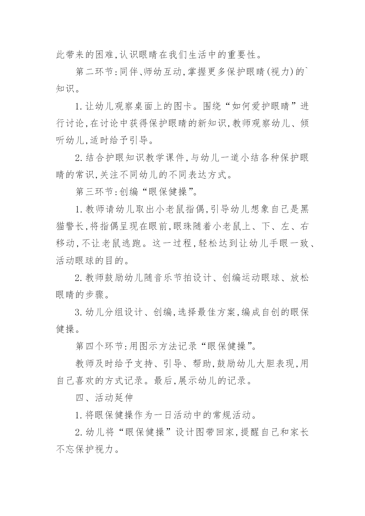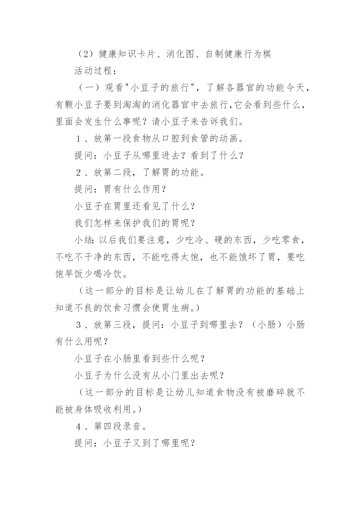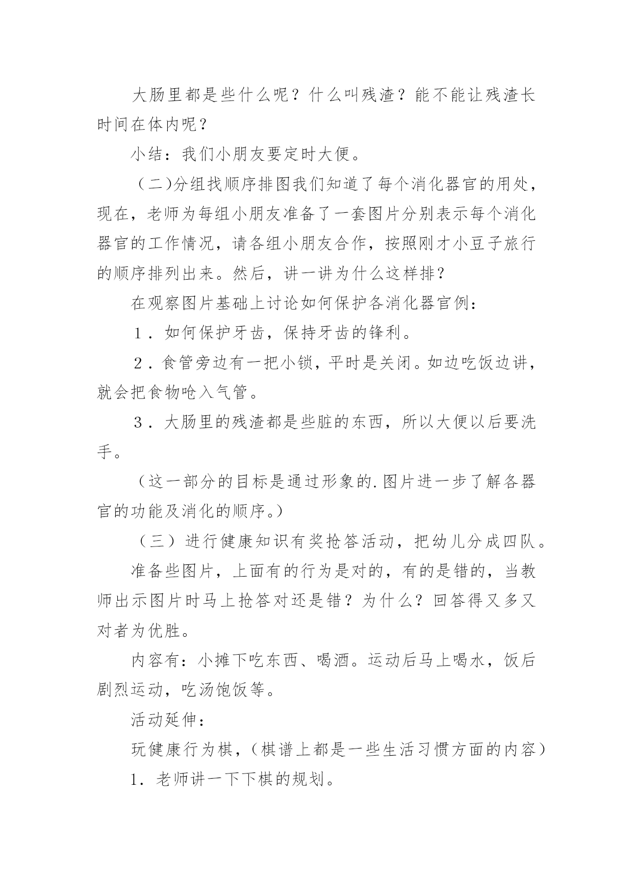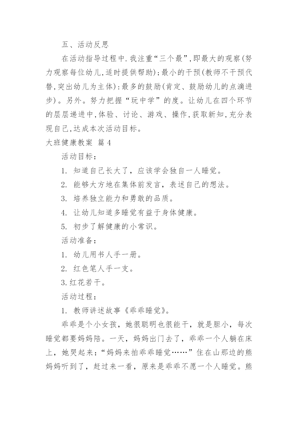 大班健康教案有关大班健康教案锦集5篇作为一名为他人授业解惑的教育工作者,很有必要精心设计一份教案,教案是教学活动的依据,有着重要的地位。那么教案应该怎么写才合适呢?下面是小编为大家收集的大班健康教案5篇,仅供参考,大家一起来看看吧。大班健康教案篇1容明娟活动目标:1、了解有关眼睛的构造和卫生方面的知识,防止眼疾。2、懂得爱护自己眼睛的'重要性。3、萌发从小珍爱生命的意识。活动准备:1、收集有关眼睛方面的资料。2、对班级幼儿视力进行事先了解。3、在一副幼儿太阳镜上涂上油脂,使眼睛看东西模糊。4、挂图《眼睛生病了》。过程建议:1、交流自己收集的有关眼睛的资料。2、出示挂图《眼睛生病了》,提问:这个小朋友为什么要揉眼睛?他的眼睛怎么了?眼睛会生什么病呢?(近视眼、红眼病、沙眼、结膜炎、麦粒肿等。)3、讨论:眼睛为什么会生病?(如:脏手帕擦眼睛、脏手揉眼睛、眼睛看书或看电视太疲劳、坐姿不端正等。)4、请幼儿带上涂有油脂的太阳镜,体验视力不好的痛苦。5、讨论:怎样保护视力?(看电视时,距离电视2米以上,看电视时间不能过长;看书时身体要坐正,不能趴着或仰着看书,看书时间长了,要休息或向远处看或看绿颜色的植物;不能在太强或太弱的光线下看书;写字时要注意保持一拳、一尺、一寸的距离;多吃胡萝卜对保护视力有很大好处;平时毛巾、脸盆等要专人专用,并定期消毒或清洗,防止相互传染;眼睛生病了可以点眼药水等进行治疗。)延伸提示:1、在日常生活和学习中随时提醒幼儿注意保护自己的视力。2、进一步开展有关眼睛的讨论。大班健康教案篇2活动目的:1.让幼儿了解各消化器官的功能和食物在人体内消化吸收过程2.学习简单的自我保护方法3.培养幼儿良好的饮食和卫生习惯活动准备:(1)电脑制作《小豆子的旅行》(或图片及小豆子旅行的故事录音)(2)健康知识卡片、消化图、自制健康行为棋活动过程:(一)观看"小豆子的旅行",了解各器官的功能今天,有颗小豆子要到淘淘的消化器官中去旅行,它会看到些什么,里面会发生什么事呢?请小豆子来告诉我们。1、放第一段食物从口腔到食管的动画。提问:小豆子从哪里进去?看到了什么?2、放第二段,了解胃的功能。提问:胃有什么作用?小豆子在胃里还看见了什么?我们怎样来保护我们的胃呢?小结:以后我们要注意,少吃冷、硬的东西,少吃零食,不吃不干净的东西,不能吃得太饱,也不能饿坏了胃,要吃饱早饭少喝冷饮。(这一部分的目标是让幼儿在了解胃的功能的基础上知道不良的饮食习惯会使胃生病。)3、放第三段,提问:小豆子到哪里去?(小肠)小肠有什么用呢?小豆子在小肠里看到些什么呢?小豆子为什么没有从小门里出去呢?(这一部分的目标是让幼儿知道食物没有被磨碎就不能被身体吸收利用。)4、第四段录音。提问:小豆子又到了哪里呢?大肠里都是些什么呢?什么叫残渣?能不能让残渣长时间在体内呢?小结:我们小朋友要定时大便。(二)分组找顺序排图我们知道了每个消化器官的用处,现在,老师为每组小朋友准备了一套图片分别表示每个消化器官的工作情况,请各组小朋友合作,按照刚才小豆子旅行的顺序排列出来。然后,讲一讲为什么这样排?在观察图片基础上讨论如何保护各消化器官例:1.如何保护牙齿,保持牙齿的锋利。2.食管旁边有一把小锁,平时是关闭。如边吃饭边讲,就会把食物呛入气管。3.大肠里的残渣都是些脏的东西,所以大便以后要洗手。(这一部分的目标是通过形象的.图片进一步了解各器官的功能及消化的顺序。)(三)进行健康知识有奖抢答活动,把幼儿分成四队。准备些图片,上面有的行为是对的,有的是错的,当教师出示图片时马上抢答对还是错?为什么?回答得又多又对者为优胜。内容有:小摊下吃东西、喝酒。运动后马上喝水,饭后剧烈运动,吃汤饱饭等。活动延伸:玩健康行为棋,(棋谱上都是一些生活习惯方面的内容)1.老师讲一下下棋的规划。2.帮助幼儿理解棋盘上图的意思。3.自由结合下棋。大班健康教案篇3我们发现幼儿中常有弱视、斜视或不爱护眼睛的问题出现,而成人后的各种视力问题也多由小时候的不良习惯所形成。因此,“眼睛会做操”这一内容具有一定的教育价值,既符合幼儿的现实需要,又有利于其长远发展:既贴近幼儿生活,又有助于拓展幼儿的知识经验。一、活动目标1.懂得保护眼睛重要性,掌握更多保护眼睛(视力)的知识。2.创编“眼保健操”.体验大胆表达的成功感。3.发展手眼协调一致的能力及创造能力。二、活动准备幼儿知识经验准备:具备一定的保护眼睛的常识;具备分组讨论的经验。教师知识经验准备:事先充分了解保护眼睛的知识。教具、学具准备:每人一副太阳镜,上面贴满胶带;幼儿自制的小老鼠指偶人手一个;音乐磁带《你的眼里有个我》;教师自己设计的护眼知识课件;每组一套不爱护眼睛及爱护眼睛的图卡。三、活动过程第一环节:黑暗体验.感受眼睛的重要性。幼儿戴上自制的眼镜,体验看