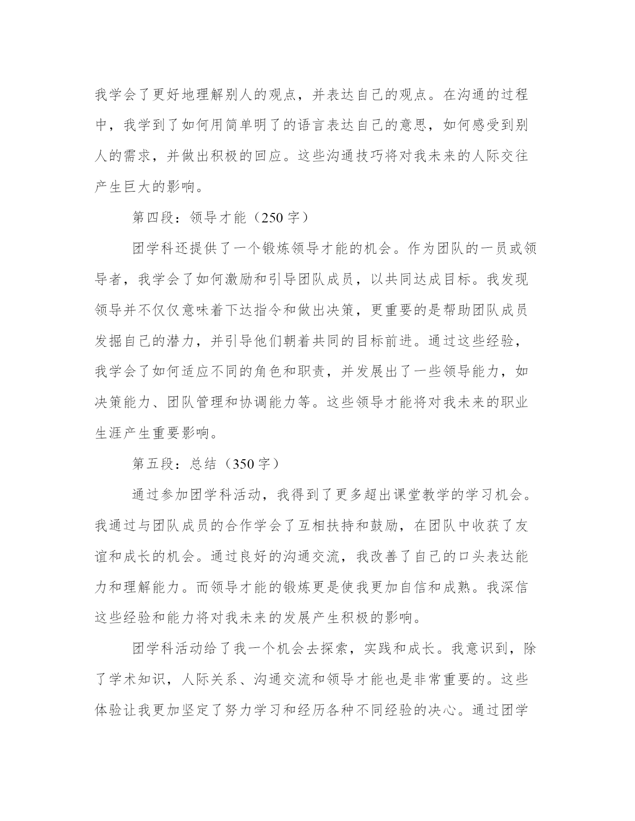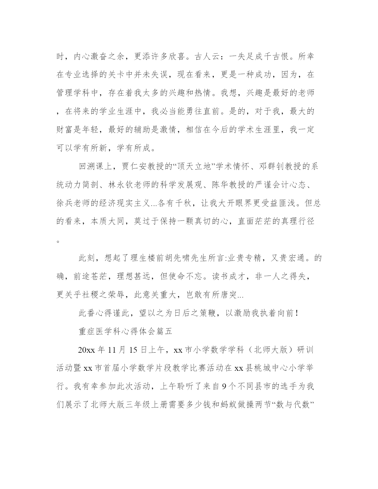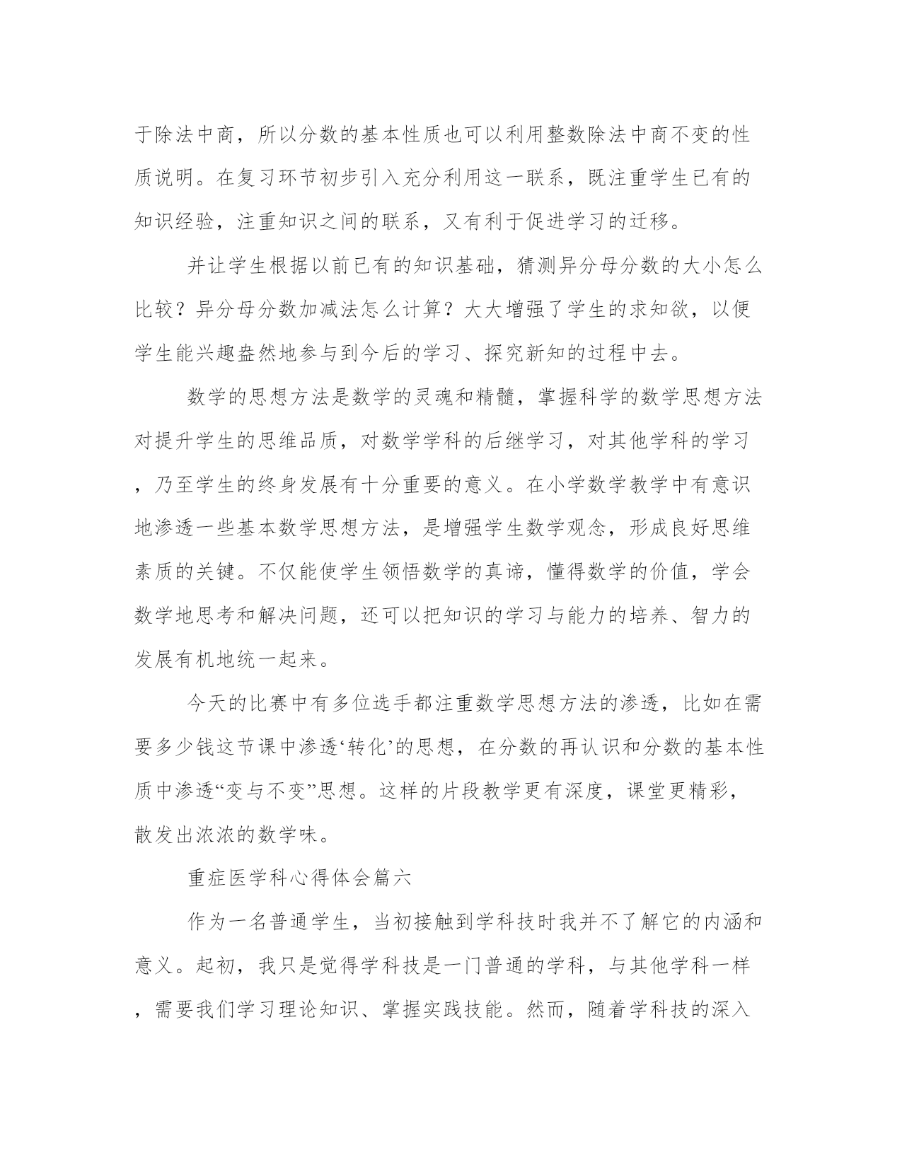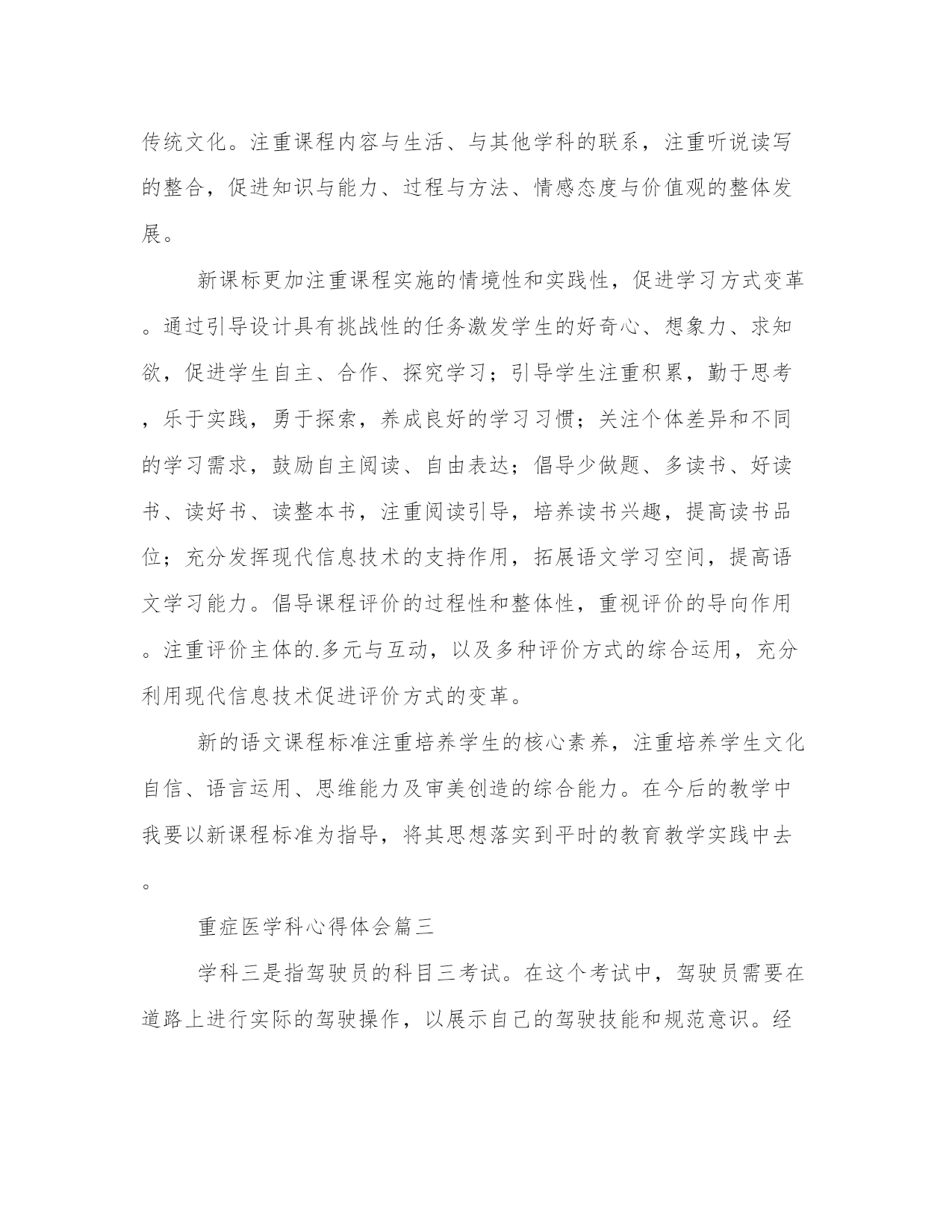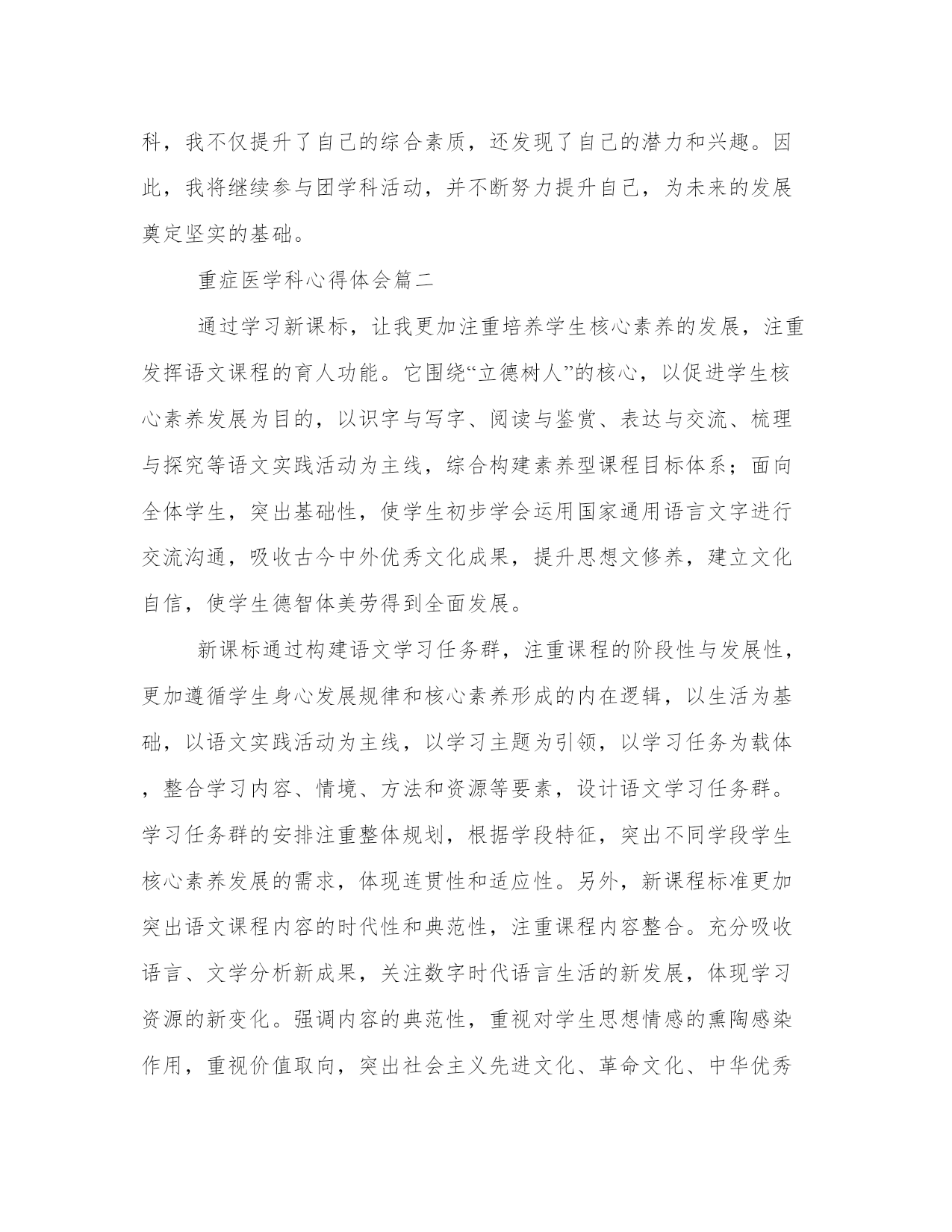2023年重症医学科心得体会团学科心得体会(优秀9篇)体会是指将学习的东西运用到实践中去,通过实践反思学习内容并记录下来的文字,近似于经验总结。大家想知道怎么样才能写得一篇好的心得体会吗?下面小编给大家带来关于学习心得体会范文,希望会对大家的工作与学习有所帮助。重症医学科心得体会篇一第一段:引子(150字)团学科是学生在校期间参加的一种课外活动,旨在培养学生的团队协作能力和领导才能。在我参加团学科的过程中,我收获了许多宝贵的经验和体会。通过团学科活动,我不仅增强了自己的组织和沟通能力,还结交了许多志同道合的朋友。第二段:团队合作(250字)团学科活动中最重要的一点是团队合作。只有将每个团队成员的优点和长处充分发挥出来,团队才能取得最好的成绩。通过与团队成员的密切合作,我学会了倾听和谦虚,尊重他人的意见,并从中获得启发。团队合作的经验不仅仅适用于团学科,它也是我未来工作和生活中不可或缺的一部分。第三段:沟通交流(250字)在团学科活动中,顺畅的沟通交流是成功的关键之一。每个人都有不同的思考方式和对待问题的方法。通过和团队成员之间的交流,我学会了更好地理解别人的观点,并表达自己的观点。在沟通的过程中,我学到了如何用简单明了的语言表达自己的意思,如何感受到别人的需求,并做出积极的回应。这些沟通技巧将对我未来的人际交往产生巨大的影响。第四段:领导才能(250字)团学科还提供了一个锻炼领导才能的机会。作为团队的一员或领导者,我学会了如何激励和引导团队成员,以共同达成目标。我发现领导并不仅仅意味着下达指令和做出决策,更重要的是帮助团队成员发掘自己的潜力,并引导他们朝着共同的目标前进。通过这些经验,我学会了如何适应不同的角色和职责,并发展出了一些领导能力,如决策能力、团队管理和协调能力等。这些领导才能将对我未来的职业生涯产生重要影响。第五段:总结(350字)通过参加团学科活动,我得到了更多超出课堂教学的学习机会。我通过与团队成员的合作学会了互相扶持和鼓励,在团队中收获了友谊和成长的机会。通过良好的沟通交流,我改善了自己的口头表达能力和理解能力。而领导才能的锻炼更是使我更加自信和成熟。我深信这些经验和能力将对我未来的发展产生积极的影响。团学科活动给了我一个机会去探索,实践和成长。我意识到,除了学术知识,人际关系、沟通交流和领导才能也是非常重要的。这些体验让我更加坚定了努力学习和经历各种不同经验的决心。通过团学科,我不仅提升了自己的综合素质,还发现了自己的潜力和兴趣。因此,我将继续参与团学科活动,并不断努力提升自己,为未来的发展奠定坚实的基础。重症医学科心得体会篇二通过学习新课标,让我更加注重培养学生核心素养的发展,注重发挥语文课程的育人功能。它围绕“立德树人”的核心,以促进学生核心素养发展为目的,以识字与写字、阅读与鉴赏、表达与交流、梳理与探究等语文实践活动为主线,综合构建素养型课程目标体系;面向全体学生,突出基础性,使学生初步学会运用国家通用语言文字进行交流沟通,吸收古今中外优秀文化成果,提升思想文修养,建立文化自信,使学生德智体美劳得到全面发展。新课标通过构建语文学习任务群,注重课程的阶段性与发展性,更加遵循学生身心发展规律和核心素养形成的内在逻辑,以生活为基础,以语文实践活动为主线,以学习主题为引领,以学习任务为载体,整合学习内容、情境、方法和资源等要素,设计语文学习任务群。学习任务群的安排注重整体规划,根据学段特征,突出不同学段学生核心素养发展的需求,体现连贯性和适应性。另外,新课程标准更加突出语文课程内容的时代性和典范性,注重课程内容整合。充分吸收语言、文学分析新成果,关注数字时代语言生活的新发展,体现学习资源的新变化。强调内容的典范性,重视对学生思想情感的熏陶感染作用,重视价值取向,突出社会主义先进文化、革命文化、中华优秀传统文化。注重课程内容与生活、与其他学科的联系,注重听说读写的整合,促进知识与能力、过程与方法、情感态度与价值观的整体发展。新课标更加注重课程实施的情境性和实践性,促进学习方式变革。通过引导设计具有挑战性的任务激发学生的好奇心、想象力、求知欲,促进学生自主、合作、探究学习;引导学生注重积累,勤于思考,乐于实践,勇于探索,养成良好的学习习惯;关注个体差异和不同的学习需求,鼓励自主阅读、自由表达;倡导少做题、多读书、好读书、读好书、读整本书,注重阅读引导,培养读书兴趣,提高读书品位;充分发挥现代信息技术的支持作用,拓展语文学习空间,提高语文学习能力。倡导课程评价的过程性和整体性,重视评价的导向作用。注重评价主体的.多元与互动,以及多种评价方式的综合运用,充分利用现代信息技术促进评价方式的变革。新的语文课程标准注重培养学生的核心素养,注重培养学生文化自信、语言运用、思维能力及审美创