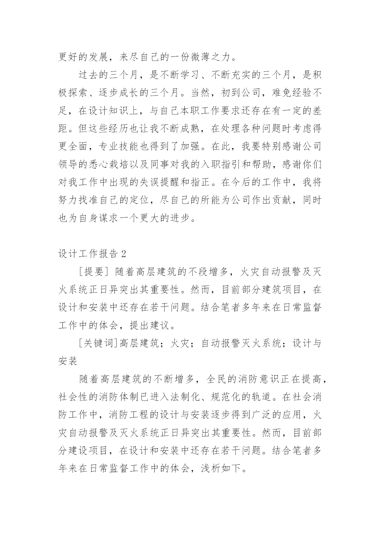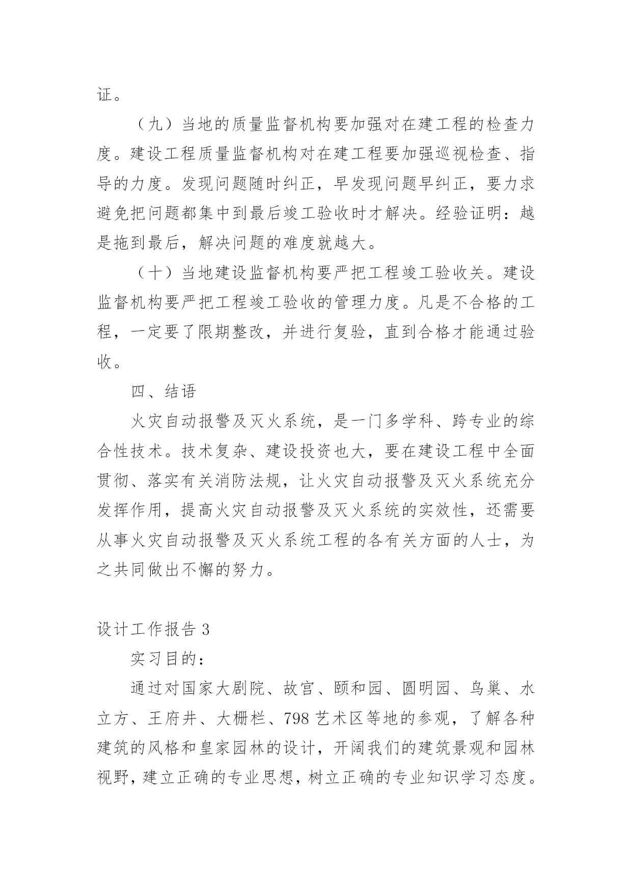 设计工作报告在当下这个社会中,越来越多的事务都会使用到报告,报告具有成文事后性的特点。那么报告应该怎么写才合适呢?下面是小编收集整理的设计工作报告,仅供参考,欢迎大家阅读。设计工作报告1尊敬的各位领导:您好!来到xx这个大家庭不知不觉就三个月了,回想这段时间,我为自己的选择而感到高兴,无论是工作环境还是工作氛围,都是我经历过最理想的。领导的关怀、同事的教导和帮助,让我跳出以前的行业属性,融入到这个温暖的大集体。公司同事年龄都很年轻,所以自然而然在一起沟通交流都很顺畅。我自认为还没老,但和很多同事比起来真的是老大哥了,我从他们身上看到了更多的激情、活力和快乐,而这些也时刻影响着我。公司和部门经常组织的一些聚会活动也很好的促进了同事之间的感情,在这里没有勾心斗角、尔虞我诈,更多的是理解和关怀。来到xx虽然才只有短短的3个月,但是让我学到了很多很多,比如设计水平也有一些小的提高,思想也成熟了不少,做事也慢慢变得有规律了,不再向以前那么拖拉了,让我自信了很多,也发现自己其实很优秀!回想这三个月,我要感恩各级领导的关怀、教育和培养;感怀工作环境的和谐、融洽和温馨;感谢身边同事的支持和帮助;同时也要感谢培训学校李明友老师当初的大力举荐。正是这种优良的环境氛围和厚重的人文情怀,才使得我能在三个月里顺利转正。想想这三个月,工作中我有取得成绩时的.喜悦和激动,也有失败时的沮丧和痛苦。但我更多的还是收获。虽然收获了很多,但是在学习中我还是深刻了解到自身很多的不足,需要提高并改正。主要表现在以下几个方面:1、严把工作流程,有效的与各部门同事沟通,提高工作效率。2、突破设计思路,提高设计眼界,不要只局限于当前的事物。把握整体设计方向,处理好细节处,增强画面美观度。在设计风格上,尝试多种设计风格,将多种设计元素结合大众喜好做出方案。3、学无止境,“业精于勤而荒于嬉”,在以后的工作中不断学习专业知识和了解业务知识,通过多看、多想、多学、多练来不断的提高自己的各项技能。同时要不断锻炼自己的胆识和毅力,工作上、做人做事上都要非常细心,提高自己解决实际问题的能力,并在工作过程中慢慢克服急躁情绪,不能鲁莽行事,积极、热情、细致地的对待每一项工作指令。4、“态度决定一切”。作为公司的一名员工,严谨的工作态度,是我应尽的责任和义务。作为一名平面设计师,不断地开拓设计思路,更好的与市场融合,是我目前需要改进和加强的,所以我会和公司一起努力,为公司的不断壮大,更好的发展,来尽自己的一份微薄之力。过去的三个月,是不断学习、不断充实的三个月,是积极探索、逐步成长的三个月。当然,初到公司,难免经验不足,在设计知识上,与自己本职工作要求还存在有一定的差距。但这些经历也让我不断成熟,在处理各种问题时考虑得更全面,专业技能也得到了加强。在此,我要特别感谢公司领导的悉心栽培以及同事对我的入职指引和帮助,感谢你们对我工作中出现的失误提醒和指正。在今后的工作中,我将努力找准自己的定位,尽自己的所能为公司作出贡献,同时也为自身谋求一个更大的进步。设计工作报告2[提要]随着高层建筑的不段增多,火灾自动报警及灭火系统正日异突出其重要性。然而,目前部分建筑项目,在设计和安装中还存在若干问题。结合笔者多年来在日常监督工作中的体会,提出建议。[关键词]高层建筑;火灾;自动报警灭火系统;设计与安装随着高层建筑的不断增多,全民的消防意识正在提高,社会性的消防体制已进入法制化、规范化的轨道。在社会消防工作中,消防工程的设计与安装逐步得到广泛的应用,火灾自动报警及灭火系统正日异突出其重要性。然而,目前部分建设项目,在设计和安装中还存在若干问题。结合笔者多年来在日常监督工作中的体会,浅析如下。一、火灾自动报警及灭火系统设计和安装中存在的问题及后果设计方面的问题主要有:消防控制室内的位置设计不当,发生火灾时,会直接威胁到消防指挥人员的生命安全能;系统不完善,削弱了系统的功能,给施工安装造成困难,如:消防控制室的部分控制设备形同虚设防消防控制室的消防通讯设计不完善;不符合实际需要:如火灾事故广播扬声器设置数量不当;设置喷水系统的类型不当;部分施工图与现场实际情形严重不符;滤布防火门未设计电动控制;防火卷帘未采取组合控制;防火卷帘的控制功能设计不完善;防烟楼梯间的加压送风系统设计不完善;1211气体灭火系统设计不完善;选用火灾探测器的类型不当。安装方面问题主要有:业主强令消防设计服从于装修设计,使系统不能发挥正常功能;技术不合理,施工单位随意地确定敷设线管的路径;系统不能正常工作,如系统中的部分线路未接通;降低了系统的使用寿命和可靠性,如施工单位安装线管的焊接质量很差;吊顶里敷设的部分线路未穿保护管;报警信号传输与控制线未采取防火保护措施;系统调试的部分方法不当;防火卷帘的配电及控制线路采用的保护管不当;业主强