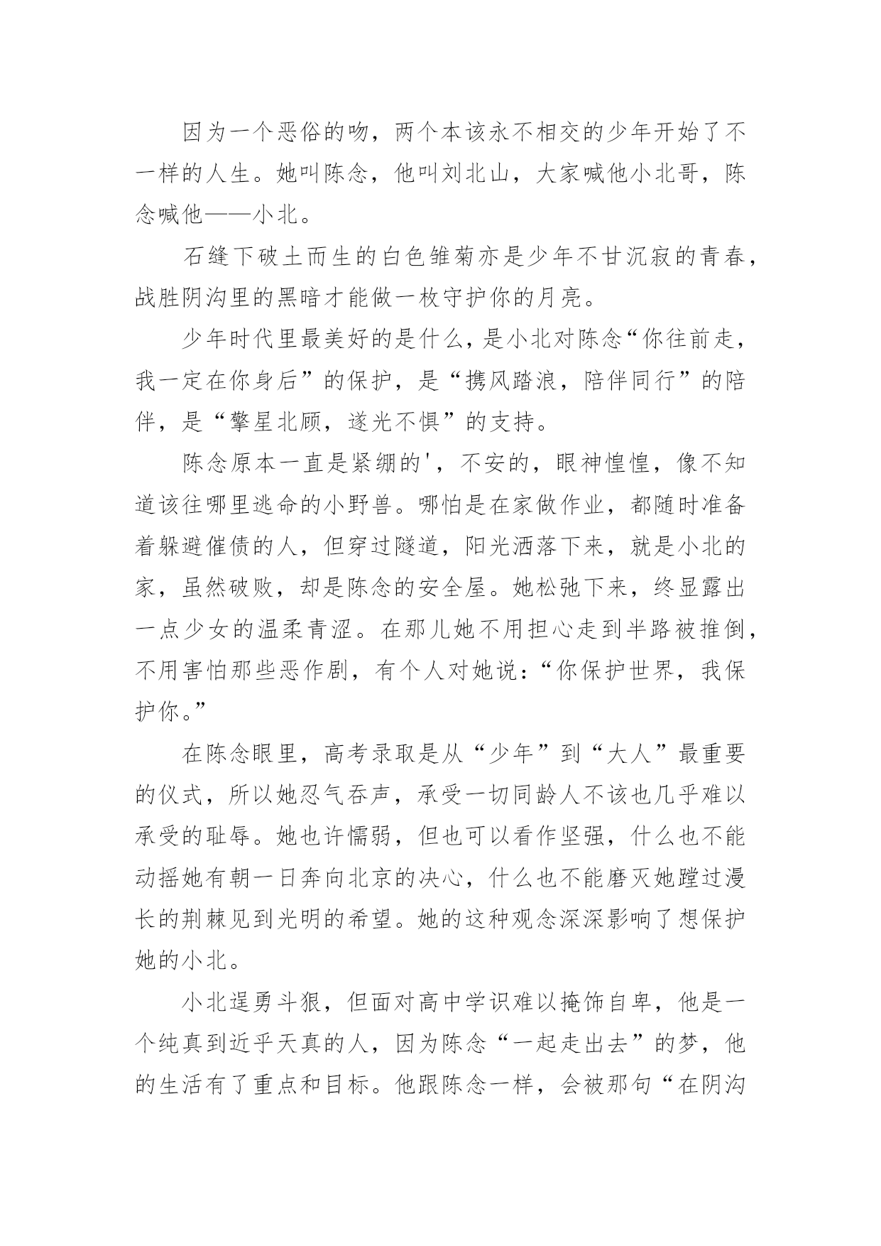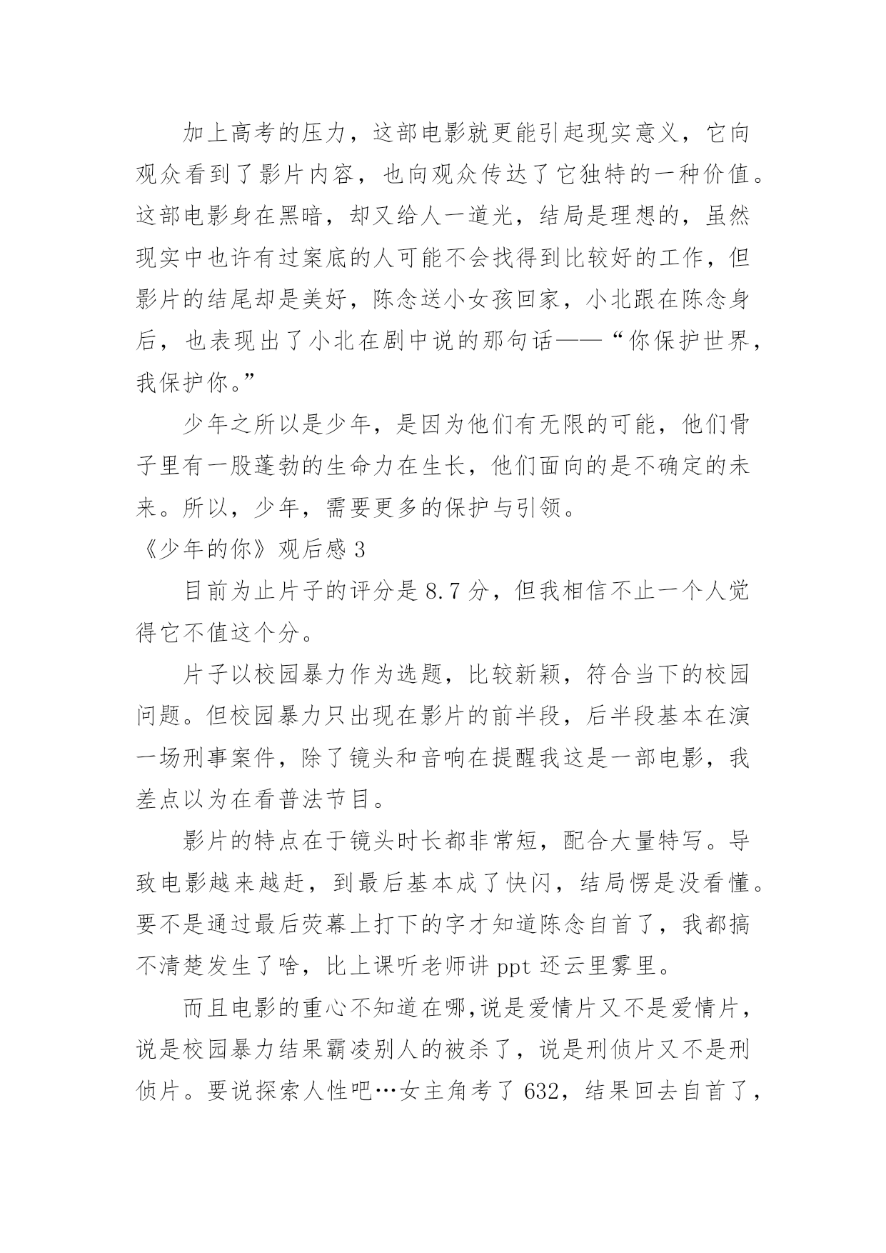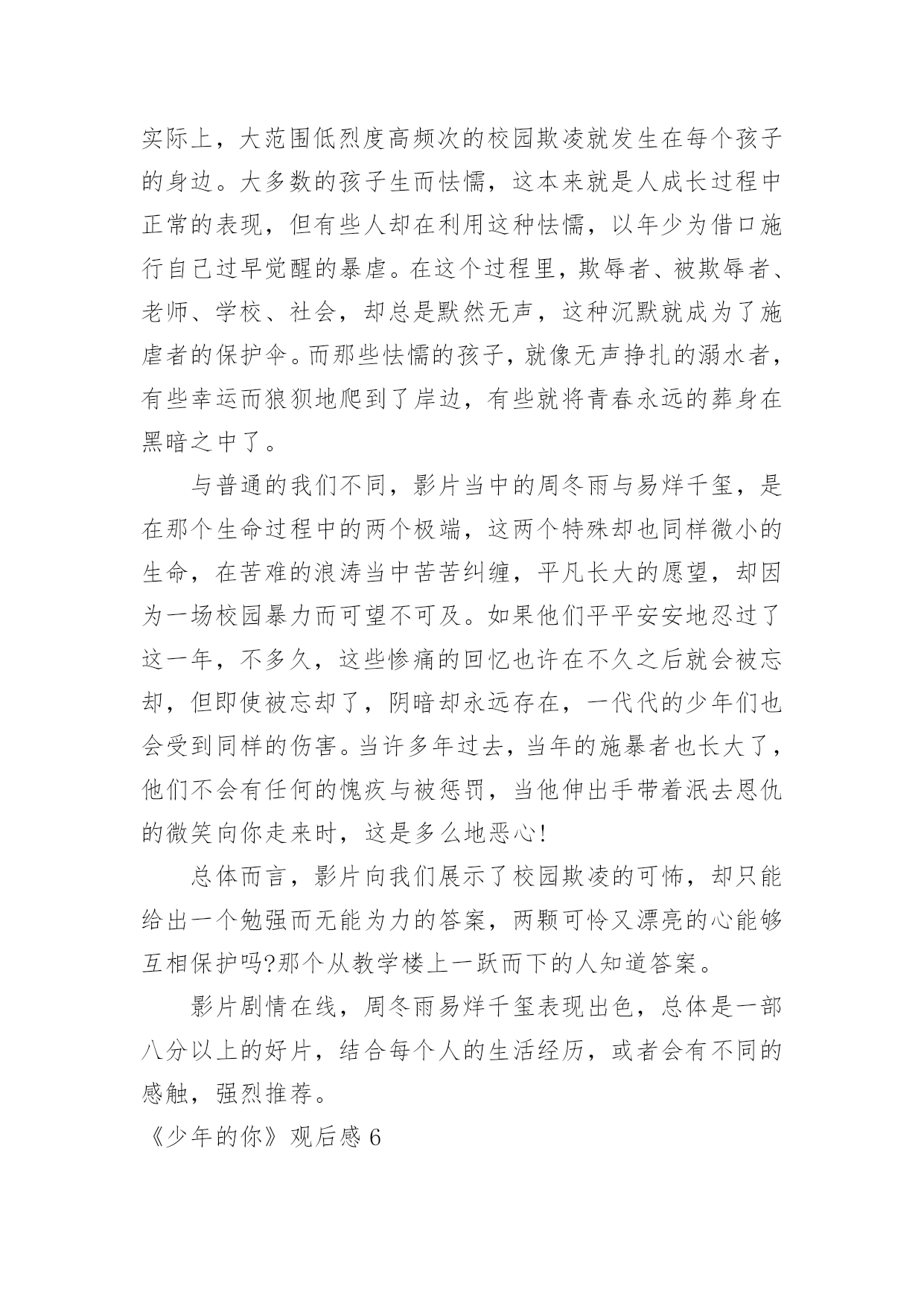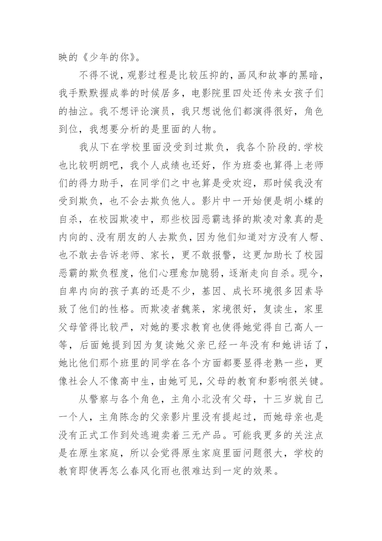 《少年的你》观后感《少年的你》观后感当看完一部作品后,一定对生活有了新的感悟和看法吧,现在就让我们写一篇走心的观后感吧。你想知道观后感怎么写吗?以下是小编整理的《少年的你》观后感,仅供参考,希望能够帮助到大家。《少年的你》观后感1少年炽热的心跳,将黑夜都洞晓。——题记十月末的时候,我的舍友们出去看了场叫做《少年的你》的电影,主演是易烊千玺和周冬雨,据说电影很好看。我没有去,自然也不知道这部电影有多好看,但是当我默默地听着她们关于电影情节的描述,脑海里竟然不由自主地浮现出这样、那样的画面,听到最后我甚至诧异地发现自己的眼泪落下了一滴又一滴,情绪也有些低落,但更多的是感动——它所展现给我的,少年的`感动。没有多少人还能记得甚至保持自己少年时的样子,无论外貌抑或性格都不能。人们在日复一日、年复一年地永远重复着单调的工作时,便早已丧失了少年时最真诚、最炽热的自己,在那些自我被埋藏的厚厚的阴影下,永世不得翻身。少年的你,就像一个过客,来的时候是那样的亲切自然,走的时候又是那么的令人遗憾。遗憾,遗憾自己在少年时有太多不可为、不敢为的事情,遗憾那些世俗的条条框框终究不能被战胜,遗憾自己未恍过神来,时间它已乘着不回头的小船向远方驶去,而自己抓不住也赶不上它。有多少人的青春从《少年的你》中被唤醒,又有多少人幸运地未能被唤醒记忆,只是以旁观者的角度,以局外人的心态来观看这部还不错的电影。于后者而言,他们无疑是幸福的,于前者而言,那更可能是一笔巨大的财富。他们见识了更加真实的有血有肉的少年,他们曾经有刻骨铭心的少年经历,有一腔热血,有一颗真心,有一双善良的眼睛。他们曾有最炽热的心跳,将黑夜都洞晓。可故事既然以“从前”、“曾经”开头,那么也就意味着结局并不会这样,那是已经流逝不复返的东西,它随着时间不再回头。如一切倒退,返璞归真,那是少年啊!曾有少年如斯,遇上方知有。如果哪一天你遇到这样的少年,请抓住他,别放走他,少年永远不应该被放弃,他应该在无数人的仰望中意气风发,应该在平淡的日子中保持纯真,应该在选择的面前坚持自我,不被迷惑。少年可以最好,也可以最坏,可以最无理,也可以最懂事。却独独不应该丢掉炽热。少年最炽热。《少年的你》观后感2有个在千里之外的朋友给闲着呆在家的我买了当天上映的《少年的你》。不得不说,观影过程是比较压抑的,画风和故事的黑暗,我手默默握成拳的时候居多,电影院里四处还传来女孩子们的抽泣。我不想评论演员,我只想说他们都演得很好,角色到位,我想要分析的是里面的人物。我从下在学校里面没受到过欺负,我各个阶段的.学校也比较明朗吧,我个人成绩也还好,作为班委也算得上老师们的得力助手,在同学们之中也算是受欢迎,那时候我没有受到欺负,也不会去欺负他人。影片中一开始便是胡小蝶的自杀,在校园欺凌中,那些校园恶霸选择的欺凌对象真的是内向的、没有朋友的人去欺负,因为他们知道对方没有人帮、也不敢去告诉老师、家长,更不敢报警,这更加助长了校园恶霸的欺负程度,他们心理愈加脆弱,逐渐走向自杀。现今,自卑内向的孩子真的还是不少,基因、成长环境很多因素导致了他们的性格。而欺凌者魏莱,家境很好,复读生,家里父母管得比较严,对她的要求教育也使得她觉得自己高人一等,后面她提到因为复读她父亲已经一年没有和她讲话了,她比他们那个班里的同学在各个方面都要显得老熟一些,更像社会人不像高中生,由她可见,父母的教育和影响很关键。从警察与各个角色,主角小北没有父母,十三岁就自己一个人,主角陈念的父亲影片里没有提起过,而她母亲也是没有正式工作到处逃避卖着三无产品。可能我更多的关注点是在原生家庭,所以会觉得原生家庭里面问题很大,学校的教育即使再怎么春风化雨也很难达到一定的效果。加上高考的压力,这部电影就更能引起现实意义,它向观众看到了影片内容,也向观众传达了它独特的一种价值。这部电影身在黑暗,却又给人一道光,结局是理想的,虽然现实中也许有过案底的人可能不会找得到比较好的工作,但影片的结尾却是美好,陈念送小女孩回家,小北跟在陈念身后,也表现出了小北在剧中说的那句话——“你保护世界,我保护你。”少年之所以是少年,是因为他们有无限的可能,他们骨子里有一股蓬勃的生命力在生长,他们面向的是不确定的未来。所以,少年,需要更多的保护与引领。《少年的你》观后感3目前为止片子的评分是8.7分,但我相信不止一个人觉得它不值这个分。片子以校园暴力作为选题,比较新颖,符合当下的校园问题。但校园暴力只出现在影片的前半段,后半段基本在演一场刑事案件,除了镜头和音响在提醒我这是一部电影,我差点以为在看普法节目。影片的特点在于镜头时长都非常短,配合大量特写。导致电影越来越赶,到最后基本成了快闪,结局愣是没看懂。要不是通过最后荧幕上打下的字才知道陈念自首了,我都搞不清楚发生了啥,比上课听老师讲ppt还云里雾里。而且电影