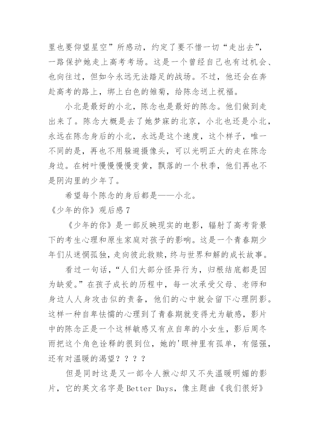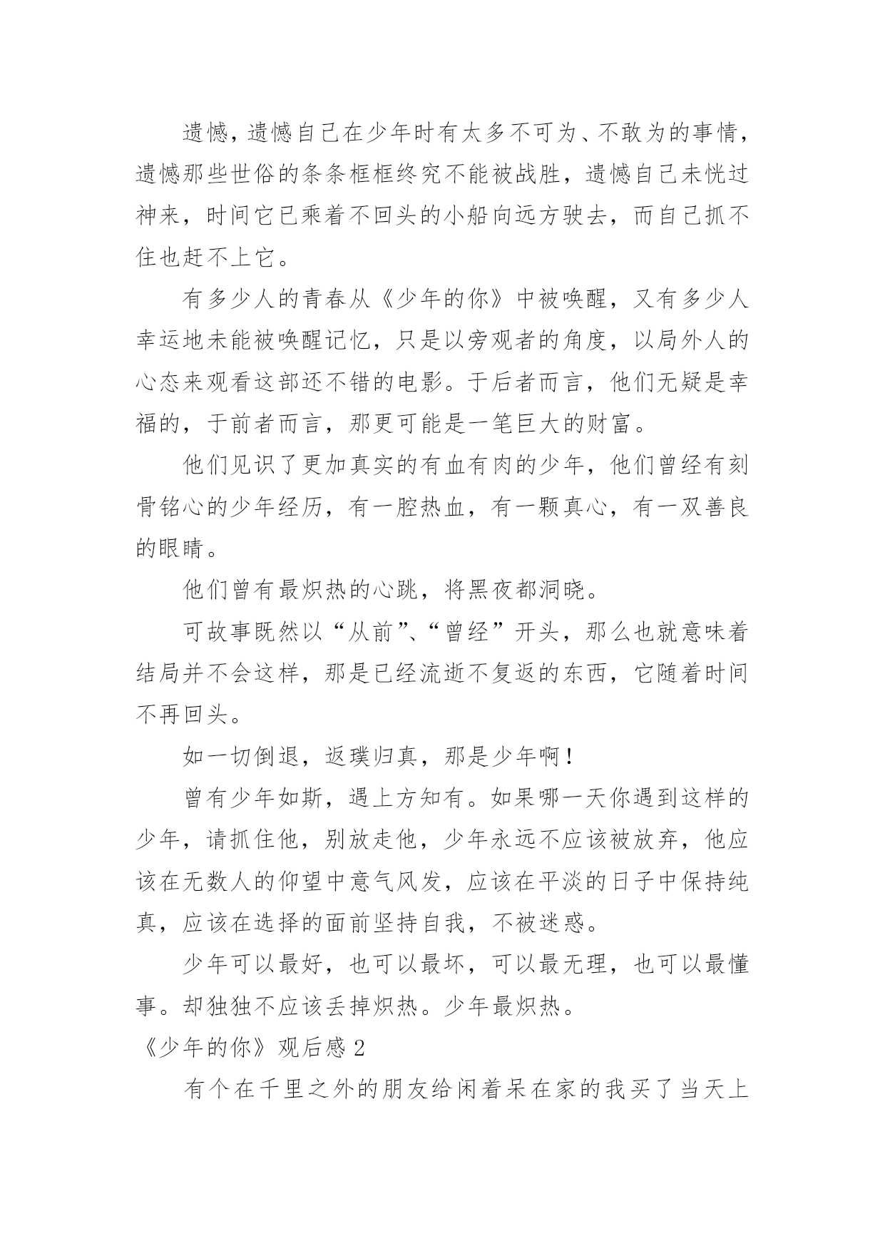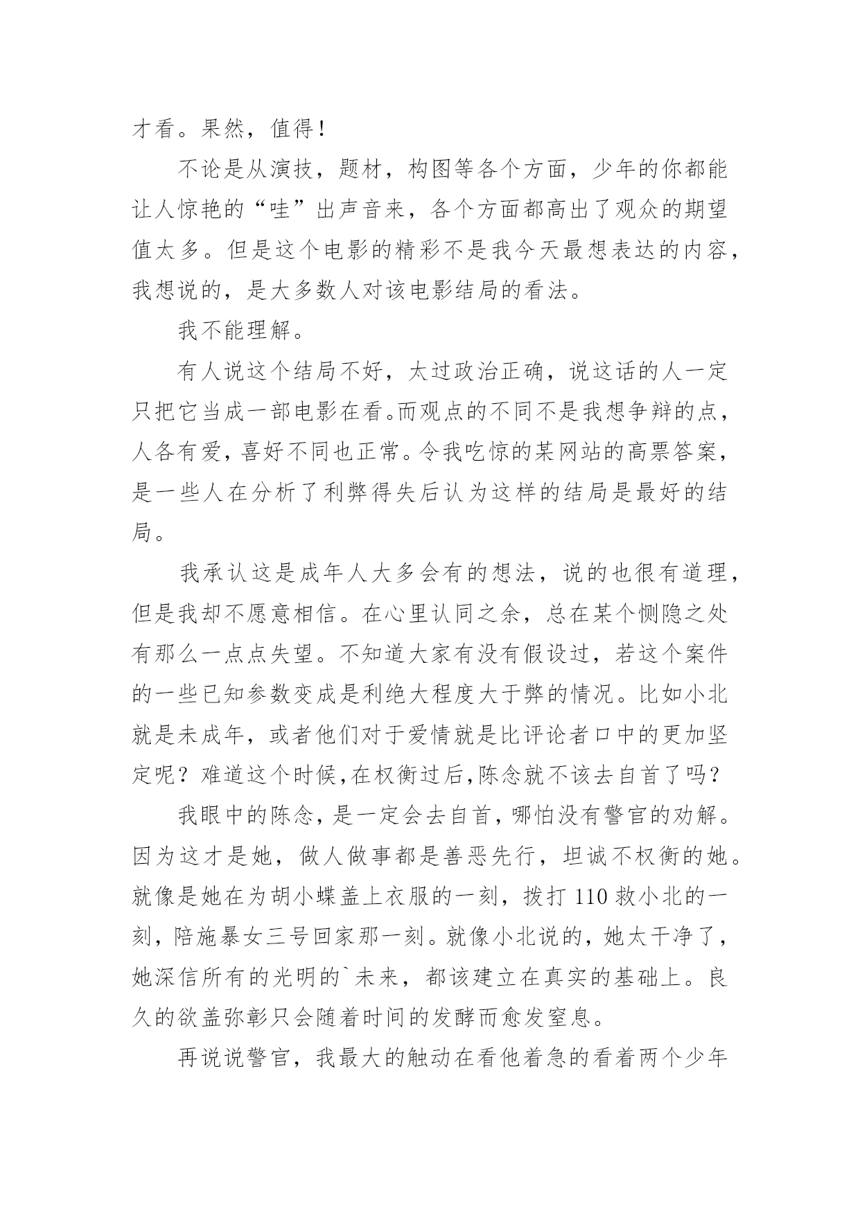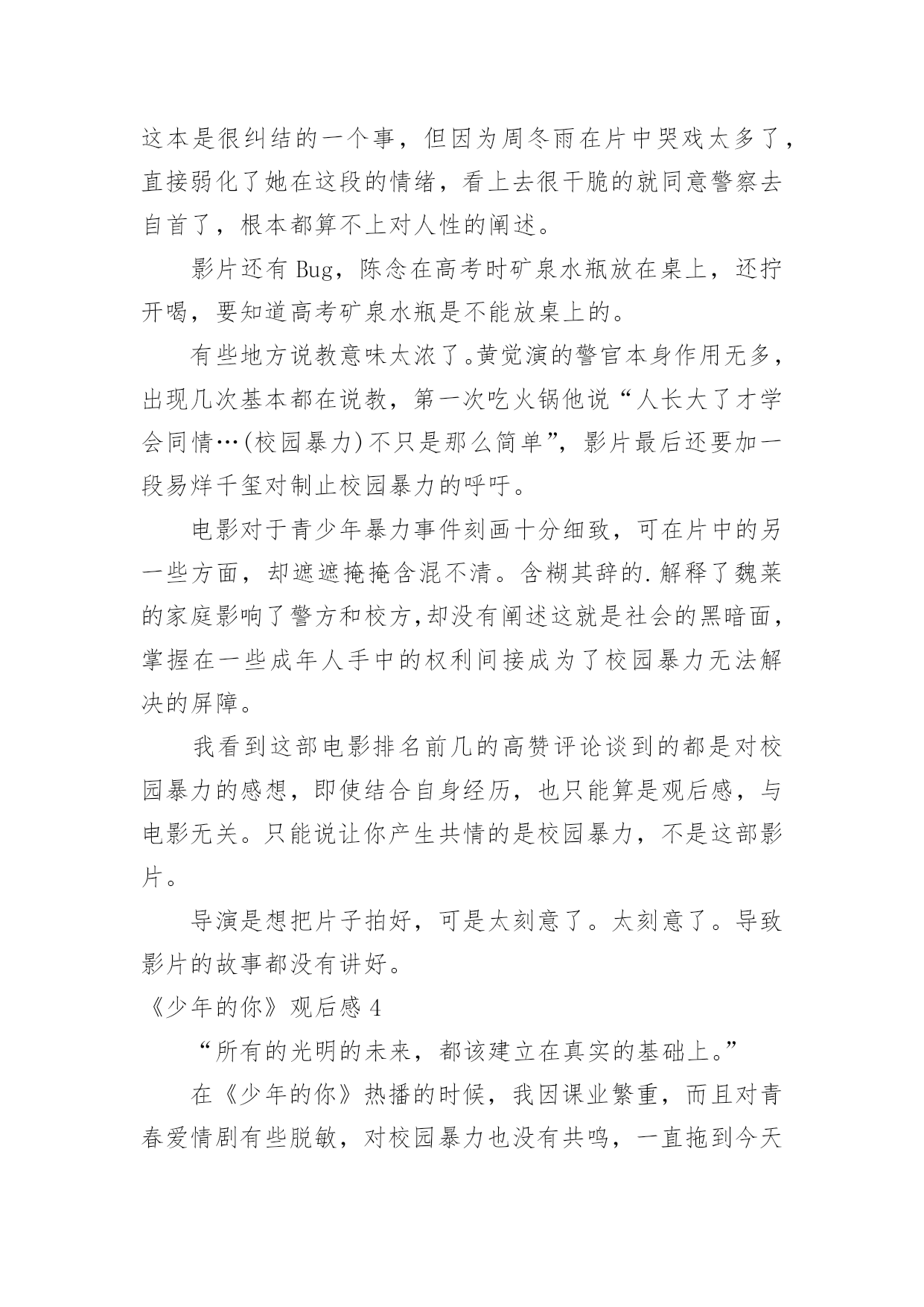 《少年的你》观后感《少年的你》观后感当看完一部作品后,一定对生活有了新的感悟和看法吧,现在就让我们写一篇走心的观后感吧。你想知道观后感怎么写吗?以下是小编整理的《少年的你》观后感,仅供参考,希望能够帮助到大家。《少年的你》观后感1少年炽热的心跳,将黑夜都洞晓。——题记十月末的时候,我的舍友们出去看了场叫做《少年的你》的电影,主演是易烊千玺和周冬雨,据说电影很好看。我没有去,自然也不知道这部电影有多好看,但是当我默默地听着她们关于电影情节的描述,脑海里竟然不由自主地浮现出这样、那样的画面,听到最后我甚至诧异地发现自己的眼泪落下了一滴又一滴,情绪也有些低落,但更多的是感动——它所展现给我的,少年的`感动。没有多少人还能记得甚至保持自己少年时的样子,无论外貌抑或性格都不能。人们在日复一日、年复一年地永远重复着单调的工作时,便早已丧失了少年时最真诚、最炽热的自己,在那些自我被埋藏的厚厚的阴影下,永世不得翻身。少年的你,就像一个过客,来的时候是那样的亲切自然,走的时候又是那么的令人遗憾。遗憾,遗憾自己在少年时有太多不可为、不敢为的事情,遗憾那些世俗的条条框框终究不能被战胜,遗憾自己未恍过神来,时间它已乘着不回头的小船向远方驶去,而自己抓不住也赶不上它。有多少人的青春从《少年的你》中被唤醒,又有多少人幸运地未能被唤醒记忆,只是以旁观者的角度,以局外人的心态来观看这部还不错的电影。于后者而言,他们无疑是幸福的,于前者而言,那更可能是一笔巨大的财富。他们见识了更加真实的有血有肉的少年,他们曾经有刻骨铭心的少年经历,有一腔热血,有一颗真心,有一双善良的眼睛。他们曾有最炽热的心跳,将黑夜都洞晓。可故事既然以“从前”、“曾经”开头,那么也就意味着结局并不会这样,那是已经流逝不复返的东西,它随着时间不再回头。如一切倒退,返璞归真,那是少年啊!曾有少年如斯,遇上方知有。如果哪一天你遇到这样的少年,请抓住他,别放走他,少年永远不应该被放弃,他应该在无数人的仰望中意气风发,应该在平淡的日子中保持纯真,应该在选择的面前坚持自我,不被迷惑。少年可以最好,也可以最坏,可以最无理,也可以最懂事。却独独不应该丢掉炽热。少年最炽热。《少年的你》观后感2有个在千里之外的朋友给闲着呆在家的我买了当天上映的《少年的你》。不得不说,观影过程是比较压抑的,画风和故事的黑暗,我手默默握成拳的时候居多,电影院里四处还传来女孩子们的抽泣。我不想评论演员,我只想说他们都演得很好,角色到位,我想要分析的是里面的人物。我从下在学校里面没受到过欺负,我各个阶段的.学校也比较明朗吧,我个人成绩也还好,作为班委也算得上老师们的得力助手,在同学们之中也算是受欢迎,那时候我没有受到欺负,也不会去欺负他人。影片中一开始便是胡小蝶的自杀,在校园欺凌中,那些校园恶霸选择的欺凌对象真的是内向的、没有朋友的人去欺负,因为他们知道对方没有人帮、也不敢去告诉老师、家长,更不敢报警,这更加助长了校园恶霸的欺负程度,他们心理愈加脆弱,逐渐走向自杀。现今,自卑内向的孩子真的还是不少,基因、成长环境很多因素导致了他们的性格。而欺凌者魏莱,家境很好,复读生,家里父母管得比较严,对她的要求教育也使得她觉得自己高人一等,后面她提到因为复读她父亲已经一年没有和她讲话了,她比他们那个班里的同学在各个方面都要显得老熟一些,更像社会人不像高中生,由她可见,父母的教育和影响很关键。从警察与各个角色,主角小北没有父母,十三岁就自己一个人,主角陈念的父亲影片里没有提起过,而她母亲也是没有正式工作到处逃避卖着三无产品。可能我更多的关注点是在原生家庭,所以会觉得原生家庭里面问题很大,学校的教育即使再怎么春风化雨也很难达到一定的效果。加上高考的压力,这部电影就更能引起现实意义,它向观众看到了影片内容,也向观众传达了它独特的一种价值。这部电影身在黑暗,却又给人一道光,结局是理想的,虽然现实中也许有过案底的人可能不会找得到比较好的工作,但影片的结尾却是美好,陈念送小女孩回家,小北跟在陈念身后,也表现出了小北在剧中说的那句话——“你保护世界,我保护你。”少年之所以是少年,是因为他们有无限的可能,他们骨子里有一股蓬勃的生命力在生长,他们面向的是不确定的未来。所以,少年,需要更多的保护与引领。《少年的你》观后感3目前为止片子的评分是8.7分,但我相信不止一个人觉得它不值这个分。片子以校园暴力作为选题,比较新颖,符合当下的校园问题。但校园暴力只出现在影片的前半段,后半段基本在演一场刑事案件,除了镜头和音响在提醒我这是一部电影,我差点以为在看普法节目。影片的特点在于镜头时长都非常短,配合大量特写。导致电影越来越赶,到最后基本成了快闪,结局愣是没看懂。要不是通过最后荧幕上打下的字才知道陈念自首了,我都搞不清楚发生了啥,比上课听老师讲ppt还云里雾里。而且电影