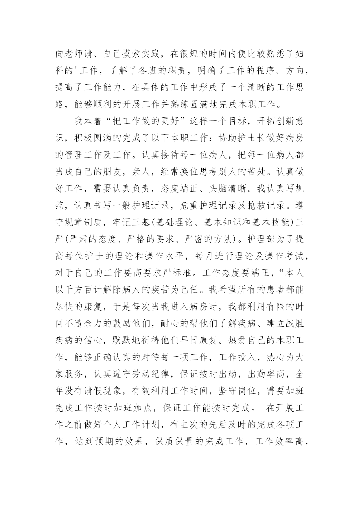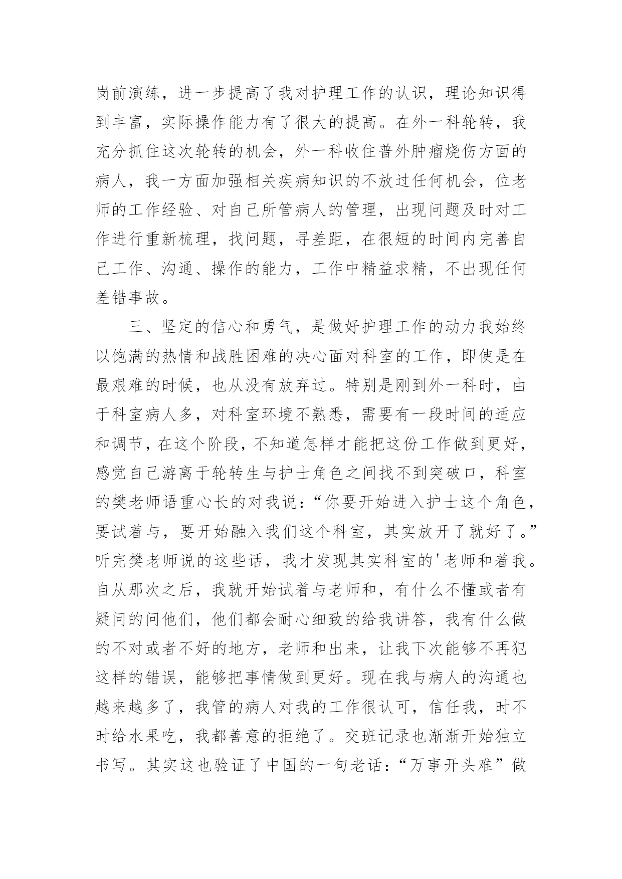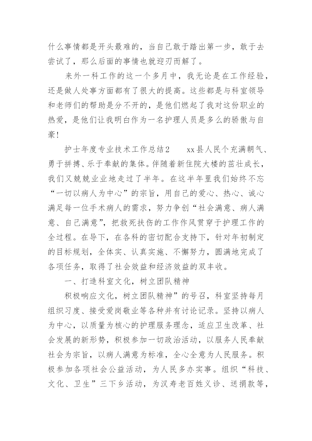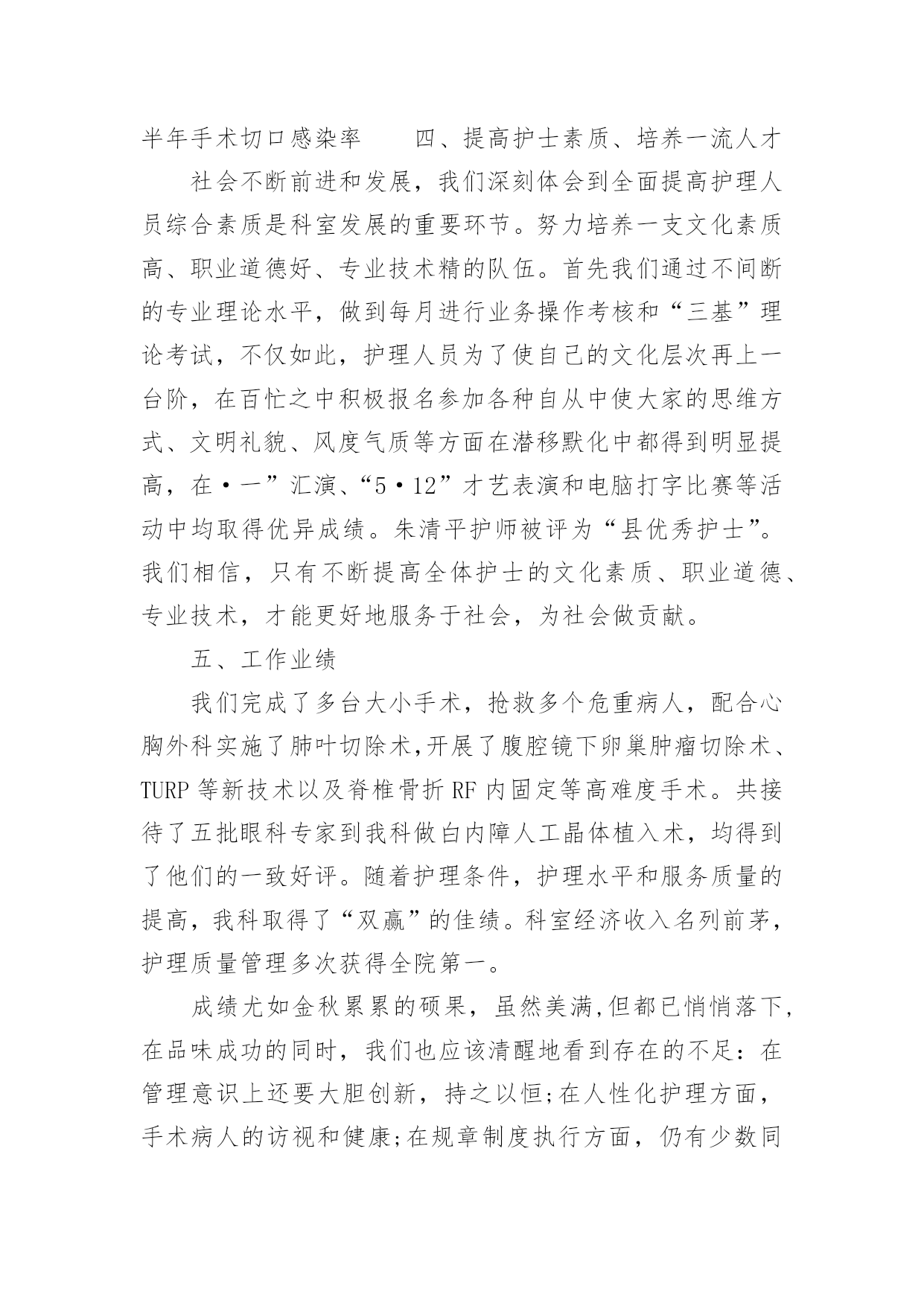 护士年度专业技术工作总结2021护士年度专业技术工作总结时光飞逝,如梭之日,辛苦的工作已经告一段落了,经过过去这段时间的积累和沉淀,我们已然有了很大的提升和改变,是不是该好好写一份工作总结记录一下呢?想必许多人都在为如何写好工作总结而烦恼吧,以下是小编收集整理的2021护士年度专业技术工作总结,供大家参考借鉴,希望可以帮助到有需要的朋友。护士年度专业技术工作总结1自20xx年7月以来,我从外一科开始轮转,通过一个多月的工作,使我对护理工作有了较深的认识。一、领导和老师的关心和支持,是我工作打好基础的关键从接受我到工作,导给了我极大的关心,到外一科进行轮转,科主任、护士长及老师们工作上给予了最大的支持和生活上的关心,带作中给予了很多指导和帮助。在工作中遇到很多棘手的问题和困难,外一科各位老师进行指导,帮助查找和分析存在的问题,提出指导性的意见,并鼓励我、关心我,增加了我干好工作的信心,使我能在短时间内找准工作突破口,及时将科室的工作理顺。二、不断的干好护理工作的基础在我实习一年和这一个多月的护理工作中,体会到作为护士不仅要熟悉自己的工作,还要不断加强专科知识、与病人沟通、与同事配合协作、调节自己的家庭生活等。8月中旬,护理部首先安排我们进行岗前演练,进一步提高了我对护理工作的认识,理论知识得到丰富,实际操作能力有了很大的提高。在外一科轮转,我充分抓住这次轮转的机会,外一科收住普外肿瘤烧伤方面的病人,我一方面加强相关疾病知识的不放过任何机会,位老师的工作经验、对自己所管病人的管理,出现问题及时对工作进行重新梳理,找问题,寻差距,在很短的时间内完善自己工作、沟通、操作的能力,工作中精益求精,不出现任何差错事故。三、坚定的信心和勇气,是做好护理工作的动力我始终以饱满的热情和战胜困难的决心面对科室的工作,即使是在最艰难的时候,也从没有放弃过。特别是刚到外一科时,由于科室病人多,对科室环境不熟悉,需要有一段时间的适应和调节,在这个阶段,不知道怎样才能把这份工作做到更好,感觉自己游离于轮转生与护士角色之间找不到突破口,科室的樊老师语重心长的对我说:“你要开始进入护士这个角色,要试着与,要开始融入我们这个科室,其实放开了就好了。”听完樊老师说的这些话,我才发现其实科室的'老师和着我。自从那次之后,我就开始试着与老师和,有什么不懂或者有疑问的问他们,他们都会耐心细致的给我讲答,我有什么做的不对或者不好的地方,老师和出来,让我下次能够不再犯这样的错误,能够把事情做到更好。现在我与病人的沟通也越来越多了,我管的病人对我的工作很认可,信任我,时不时给水果吃,我都善意的拒绝了。交班记录也渐渐开始独立书写。其实这也验证了中国的一句老话:“万事开头难”做什么事情都是开头最难的,当自己敢于踏出第一步,敢于去尝试了,那么后面的事情也就迎刃而解了。来外一科工作的这一个多月中,我无论是在工作经验,还是做人处事方面都有了很大的提高。这些都是与科室领导和老师们的帮助是分不开的,是他们燃起了我对这份职业的热爱,是他们让我明白作为一名护理人员是多么的骄傲与自豪!护士年度专业技术工作总结2xx县人民个充满朝气、勇于拼搏、乐于奉献的集体。伴随着新住院大楼的茁壮成长,我们又兢兢业业地走过了半年。在这半年里我们始终不忘“一切以病人为中心”的宗旨,用自己的爱心、热心、诚心满足每一位手术病人的需求,努力争创“社会满意、病人满意、自己满意”,把救死扶伤的工作作风贯穿于护理工作的全过程。在导下,在各科的密切配合支持下,针对年初制定的目标规划,全体实、认真实施、不懈努力,圆满地完成了各项任务,取得了社会效益和经济效益的双丰收。一、打造科室文化,树立团队精神积极响应文化,树立团队精神”的号召,科室坚持每月组织习度、接受爱岗敬业等各种并有讨论记录。坚持以病人为中心,以质量为核心的护理服务理念,适应卫生改革、社会发展的新形势,积极参加一切政治活动,以服务人民奉献社会为宗旨,以病人满意为标准,全心全意为人民服务。积极参加各项社会公益活动,为人民多办实事。组织“科技、文化、卫生”三下乡活动,为汉寿老百姓义诊、送捐款等,并有多人多次无偿献血。爱心奉献社会,为科室增光添彩。二、以病人为中心,争创一流优质服务在日常工作中,护理人员时刻牢记“以病人为中心”的.服务宗旨,设身处地为病人着想,做到凡事都来换位思考“假如我是病人”。积极推行年初规划的“一对一全程服务”,接待好每一个手术病人,做好每一项工作,关心每一个病人,当病人入手术室时,护士在手术室门口热情迎接,自我介绍,做好各项安抚工作,加强与病人沟通,减少病人对陌生环境的恐惧,增强对手术治疗的信心。护士长经常询问同事的工作技术,态度及病人的要求,对病人提出的意见和建议都能予以重视,及时解决。三、规范整体护理,争创一流管理有好的管理是优质服务的基础和前提