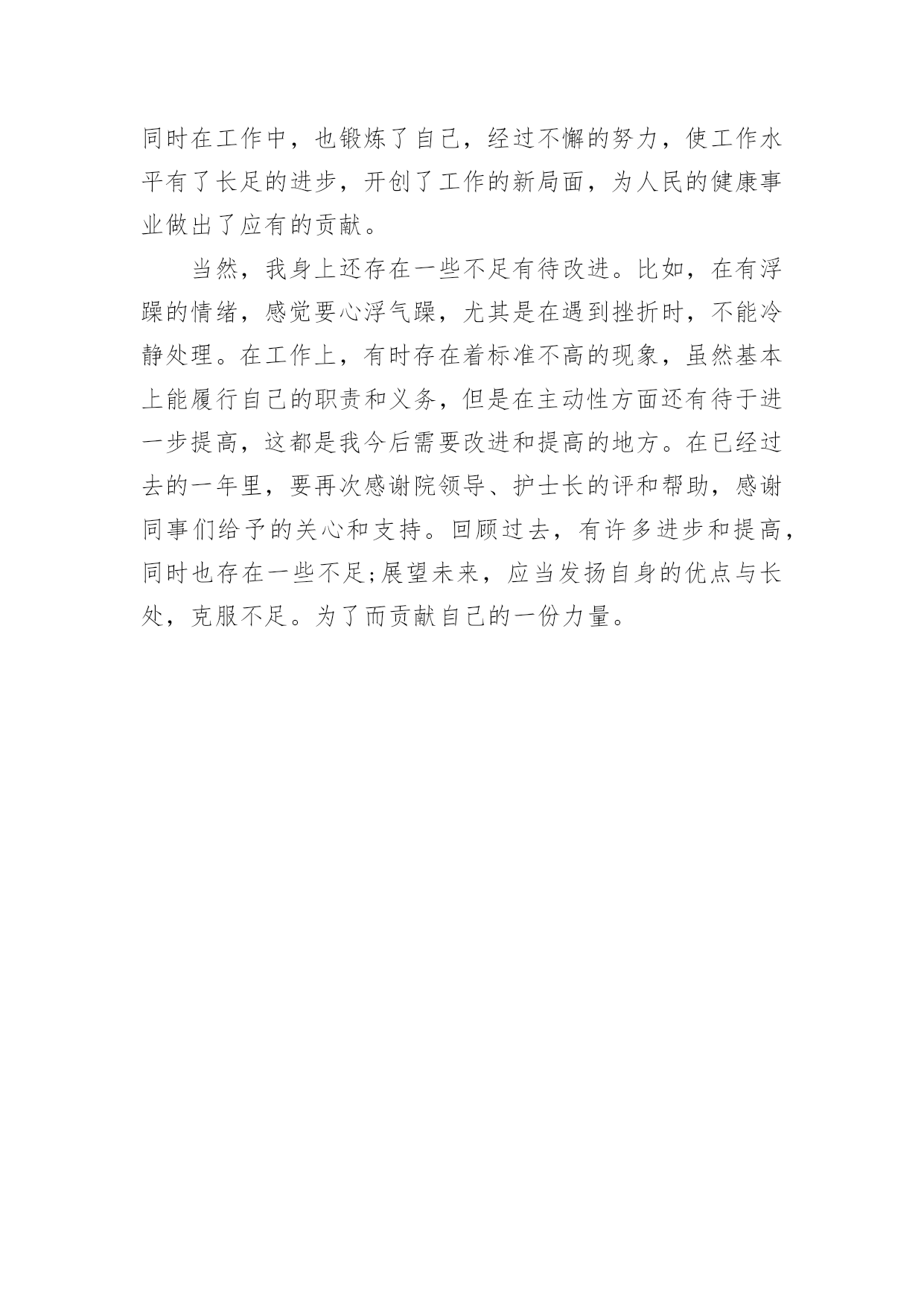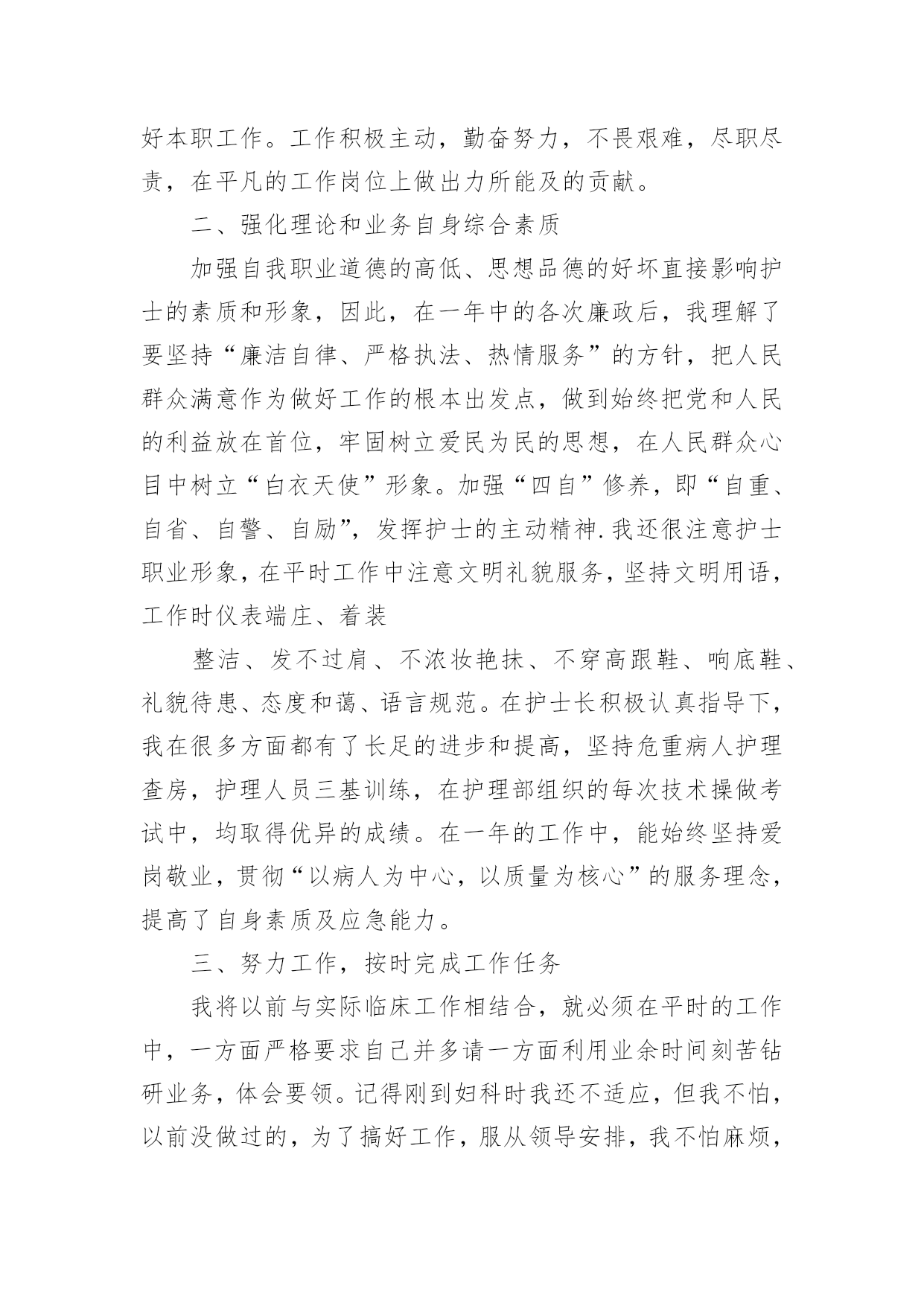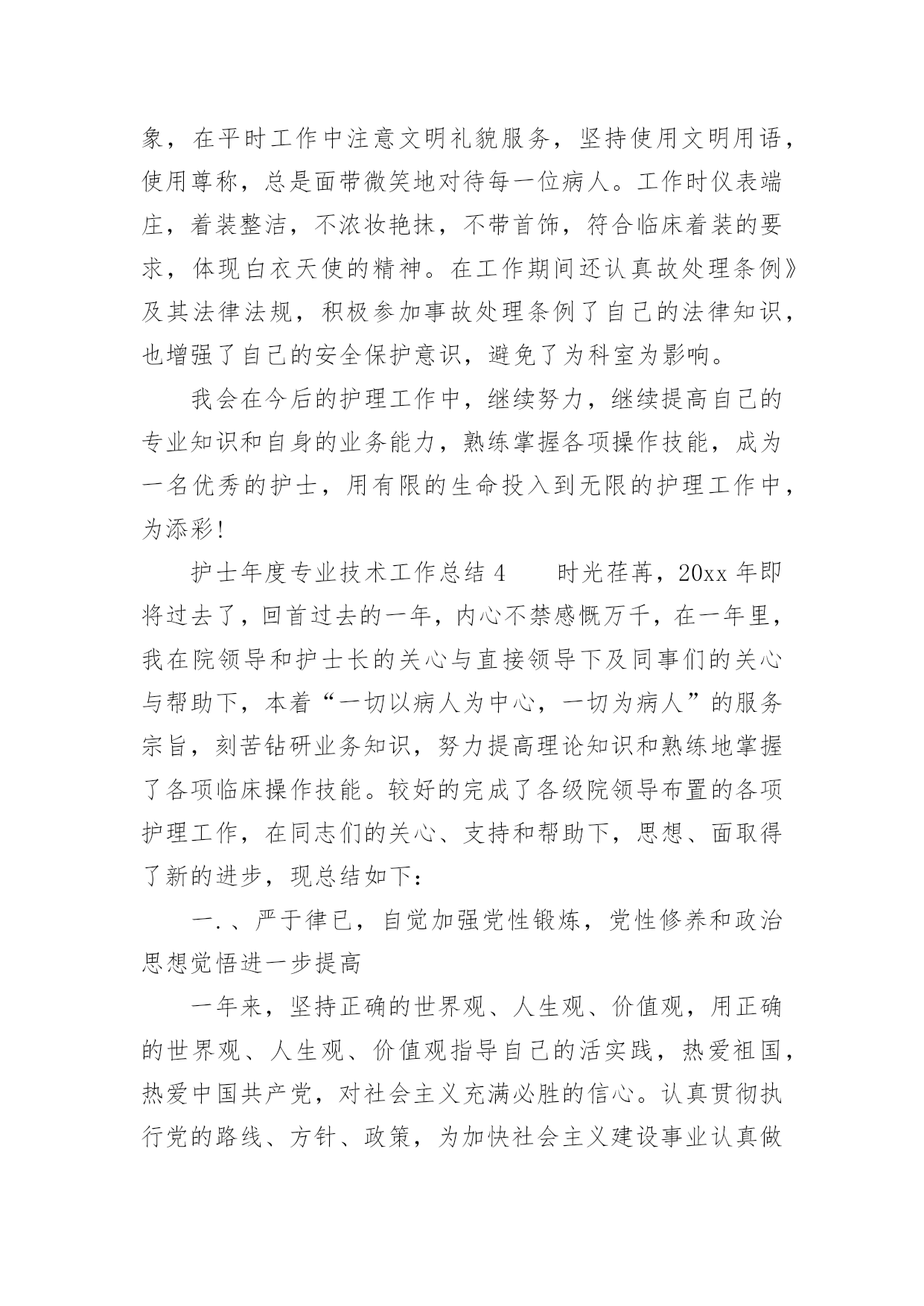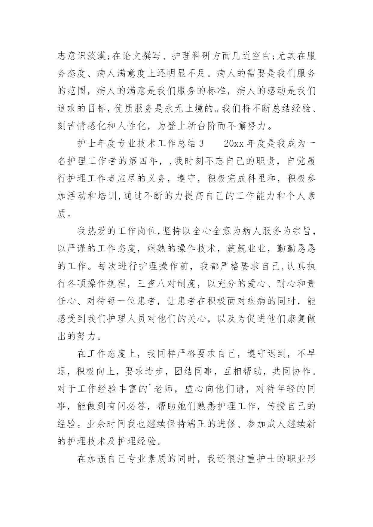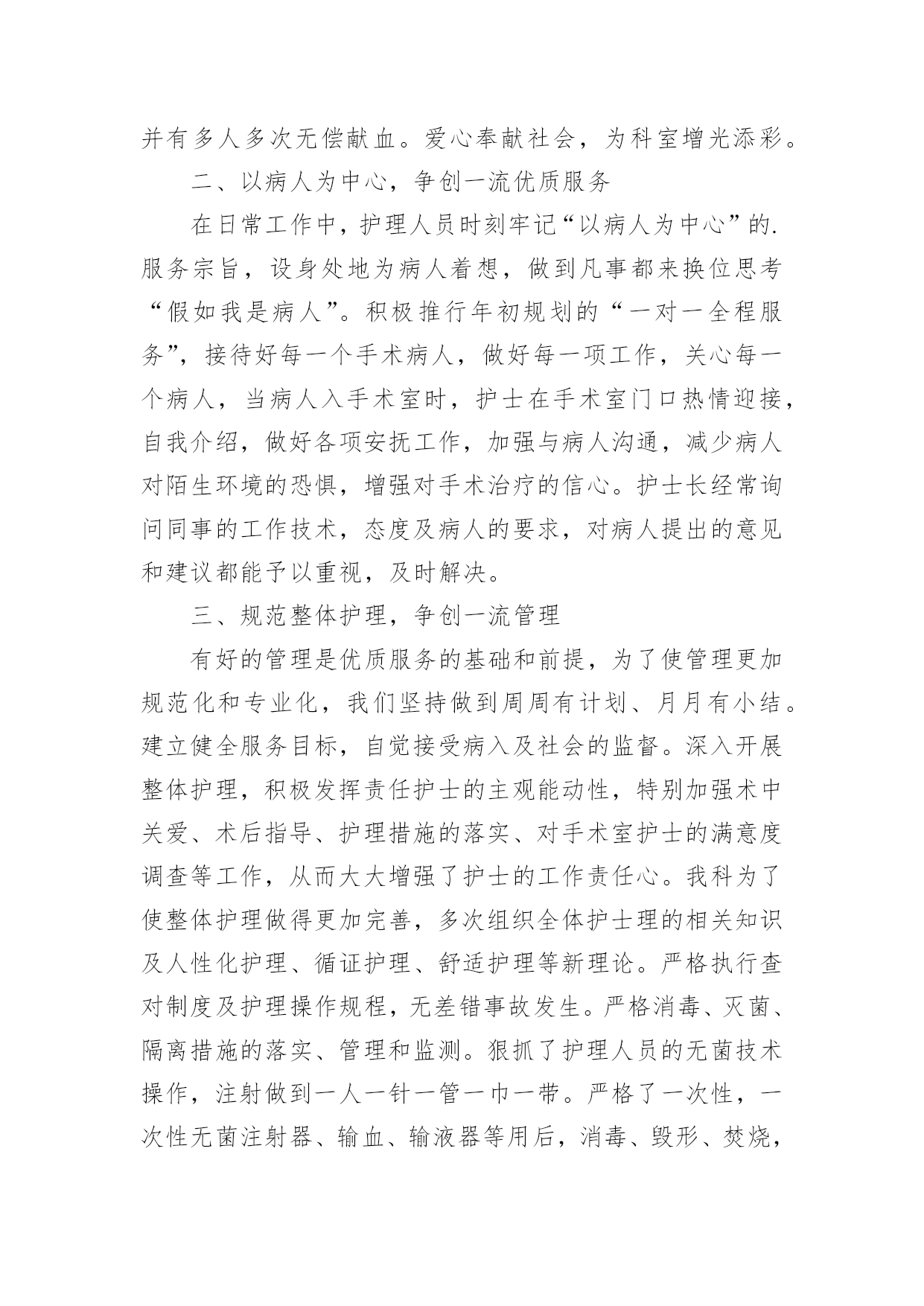 护士年度专业技术工作总结2021护士年度专业技术工作总结时光飞逝,如梭之日,辛苦的工作已经告一段落了,经过过去这段时间的积累和沉淀,我们已然有了很大的提升和改变,是不是该好好写一份工作总结记录一下呢?想必许多人都在为如何写好工作总结而烦恼吧,以下是小编收集整理的2021护士年度专业技术工作总结,供大家参考借鉴,希望可以帮助到有需要的朋友。护士年度专业技术工作总结1自20xx年7月以来,我从外一科开始轮转,通过一个多月的工作,使我对护理工作有了较深的认识。一、领导和老师的关心和支持,是我工作打好基础的关键从接受我到工作,导给了我极大的关心,到外一科进行轮转,科主任、护士长及老师们工作上给予了最大的支持和生活上的关心,带作中给予了很多指导和帮助。在工作中遇到很多棘手的问题和困难,外一科各位老师进行指导,帮助查找和分析存在的问题,提出指导性的意见,并鼓励我、关心我,增加了我干好工作的信心,使我能在短时间内找准工作突破口,及时将科室的工作理顺。二、不断的干好护理工作的基础在我实习一年和这一个多月的护理工作中,体会到作为护士不仅要熟悉自己的工作,还要不断加强专科知识、与病人沟通、与同事配合协作、调节自己的家庭生活等。8月中旬,护理部首先安排我们进行岗前演练,进一步提高了我对护理工作的认识,理论知识得到丰富,实际操作能力有了很大的提高。在外一科轮转,我充分抓住这次轮转的机会,外一科收住普外肿瘤烧伤方面的病人,我一方面加强相关疾病知识的不放过任何机会,位老师的工作经验、对自己所管病人的管理,出现问题及时对工作进行重新梳理,找问题,寻差距,在很短的时间内完善自己工作、沟通、操作的能力,工作中精益求精,不出现任何差错事故。三、坚定的信心和勇气,是做好护理工作的动力我始终以饱满的热情和战胜困难的决心面对科室的工作,即使是在最艰难的时候,也从没有放弃过。特别是刚到外一科时,由于科室病人多,对科室环境不熟悉,需要有一段时间的适应和调节,在这个阶段,不知道怎样才能把这份工作做到更好,感觉自己游离于轮转生与护士角色之间找不到突破口,科室的樊老师语重心长的对我说:“你要开始进入护士这个角色,要试着与,要开始融入我们这个科室,其实放开了就好了。”听完樊老师说的这些话,我才发现其实科室的'老师和着我。自从那次之后,我就开始试着与老师和,有什么不懂或者有疑问的问他们,他们都会耐心细致的给我讲答,我有什么做的不对或者不好的地方,老师和出来,让我下次能够不再犯这样的错误,能够把事情做到更好。现在我与病人的沟通也越来越多了,我管的病人对我的工作很认可,信任我,时不时给水果吃,我都善意的拒绝了。交班记录也渐渐开始独立书写。其实这也验证了中国的一句老话:“万事开头难”做什么事情都是开头最难的,当自己敢于踏出第一步,敢于去尝试了,那么后面的事情也就迎刃而解了。来外一科工作的这一个多月中,我无论是在工作经验,还是做人处事方面都有了很大的提高。这些都是与科室领导和老师们的帮助是分不开的,是他们燃起了我对这份职业的热爱,是他们让我明白作为一名护理人员是多么的骄傲与自豪!护士年度专业技术工作总结2xx县人民个充满朝气、勇于拼搏、乐于奉献的集体。伴随着新住院大楼的茁壮成长,我们又兢兢业业地走过了半年。在这半年里我们始终不忘“一切以病人为中心”的宗旨,用自己的爱心、热心、诚心满足每一位手术病人的需求,努力争创“社会满意、病人满意、自己满意”,把救死扶伤的工作作风贯穿于护理工作的全过程。在导下,在各科的密切配合支持下,针对年初制定的目标规划,全体实、认真实施、不懈努力,圆满地完成了各项任务,取得了社会效益和经济效益的双丰收。一、打造科室文化,树立团队精神积极响应文化,树立团队精神”的号召,科室坚持每月组织习度、接受爱岗敬业等各种并有讨论记录。坚持以病人为中心,以质量为核心的护理服务理念,适应卫生改革、社会发展的新形势,积极参加一切政治活动,以服务人民奉献社会为宗旨,以病人满意为标准,全心全意为人民服务。积极参加各项社会公益活动,为人民多办实事。组织“科技、文化、卫生”三下乡活动,为汉寿老百姓义诊、送捐款等,并有多人多次无偿献血。爱心奉献社会,为科室增光添彩。二、以病人为中心,争创一流优质服务在日常工作中,护理人员时刻牢记“以病人为中心”的.服务宗旨,设身处地为病人着想,做到凡事都来换位思考“假如我是病人”。积极推行年初规划的“一对一全程服务”,接待好每一个手术病人,做好每一项工作,关心每一个病人,当病人入手术室时,护士在手术室门口热情迎接,自我介绍,做好各项安抚工作,加强与病人沟通,减少病人对陌生环境的恐惧,增强对手术治疗的信心。护士长经常询问同事的工作技术,态度及病人的要求,对病人提出的意见和建议都能予以重视,及时解决。三、规范整体护理,争创一流管理有好的管理是优质服务的基础和前提