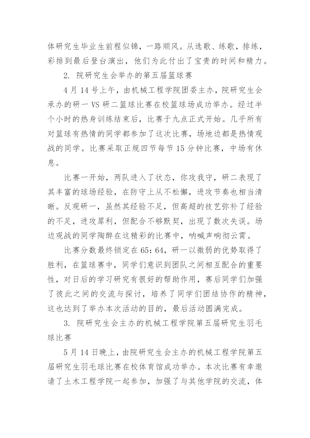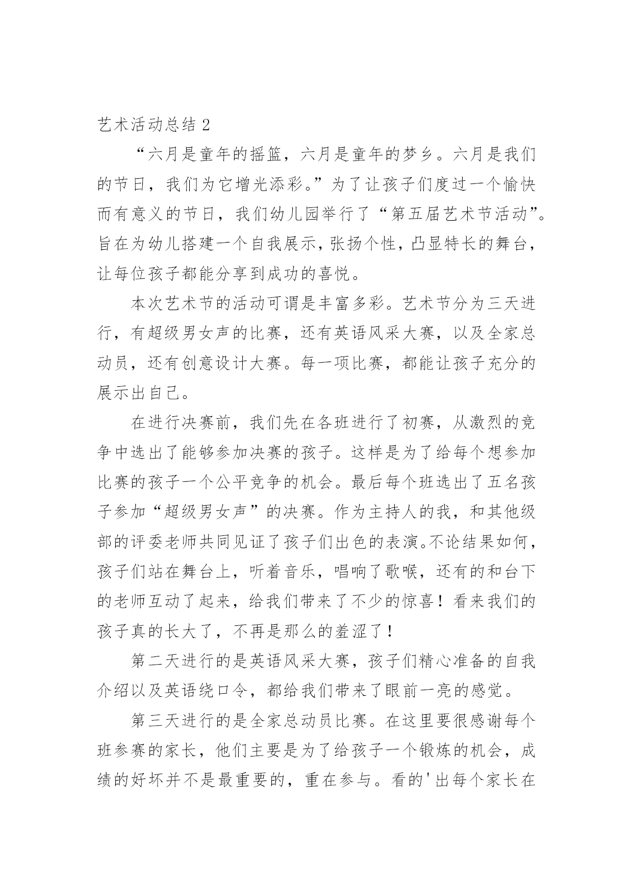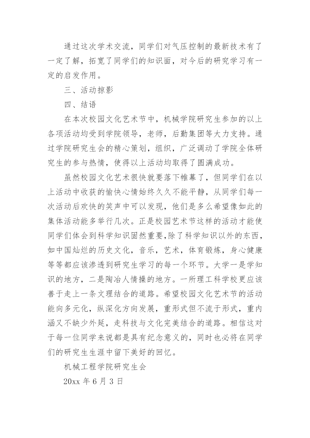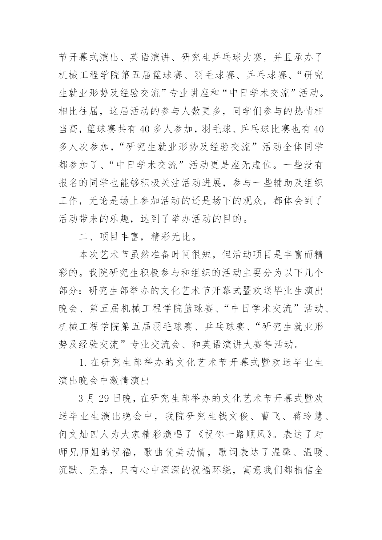 艺术活动总结总结是对取得的成绩、存在的问题及得到的经验和教训等方面情况进行评价与描述的一种书面材料,它可以帮助我们有寻找学习和工作中的规律,为此要我们写一份总结。那么总结有什么格式呢?下面是小编整理的艺术活动总结,希望能够帮助到大家。艺术活动总结1多彩的校园生活,带给全体师生无限美好的期盼。为了活跃校园气氛,丰富同学们的业余生活文化,机械工程学院研究生会以校园文化艺术节为契机,特组织开展了“机械工程学院研究生趣味篮球比赛”、“机械工程学院第五届研究生羽毛球比赛”等活动,这些活动融思想性、艺术性、娱乐性、知识性于一体,本着校团委的“党旗辉映团旗红”的活动领导主题,严格遵循“形式多样、人人参与、层层评优”的原则,给我院研究生提供了一个展示才华的大好舞台。通过这些活动,丰富了广大研究生的课余生活,展示了我院新一届研究生的风采,同时培养研究生的团结协作精神。从整体来看我院此次校园文化艺术节活动是很成功的,达到了预期的目的。一、研究生参与热情高。从活动情况来看,本次艺术节活动我院研究生都能积极参加,参与热情较高,积极参加了研究生部举办的文化艺术节开幕式演出、英语演讲、研究生乒乓球大赛,并且承办了机械工程学院第五届篮球赛、羽毛球赛、乒乓球赛、“研究生就业形势及经验交流”专业讲座和“中日学术交流”活动。相比往届,这届活动的参与人数更多,同学们参与的热情相当高,篮球赛共有40多人参加,羽毛球、乒乓球比赛也有40多人次参加,“研究生就业形势及经验交流”活动全体同学都参加了、“中日学术交流”活动更是座无虚位。一些没有报名的同学也能够积极关注活动进展,参与一些辅助及组织工作,无论是场上参加活动的还是场下的观众,都体会到了活动带来的乐趣,达到了举办活动的目的。二、项目丰富,精彩无比。本次艺术节虽然准备时间很短,但活动项目是丰富而精彩的。我院研究生积极参与和组织的活动主要分为以下几个部分:研究生部举办的文化艺术节开幕式暨欢送毕业生演出晚会、第五届机械工程学院篮球赛、“中日学术交流”活动、机械工程学院第五届羽毛球赛、乒乓球赛、“研究生就业形势及经验交流”专业交流会、和英语演讲大赛等活动。1.在研究生部举办的文化艺术节开幕式暨欢送毕业生演出晚会中激情演出3月29日晚,在研究生部举办的文化艺术节开幕式暨欢送毕业生演出晚会中,我院研究生钱文俊、曹飞、蒋玲慧、何文灿四人为大家精彩演唱了《祝你一路顺风》。表达了对师兄师姐的祝福,歌曲优美动情,歌词表达了温馨、温暖、沉默、无奈,只有心中深深的祝福环绕,寓意我们都相信全体研究生毕业生前程似锦,一路顺风。从选歌、练歌,排练,彩排到最后登台演出,他们为此付出了宝贵的时间和精力。2.院研究生会举办的第五届篮球赛4月14号上午,由机械工程学院团委主办,院研究生会承办的研一VS研二篮球比赛在校篮球场成功举办。经过半个小时的热身训练结束后,比赛于九点正式开始。几乎所有对篮球有热情的同学都参加了这次比赛,场地边都是热情观战的同学。比赛采取正规四节每节15分钟比赛,中场有休息。比赛一开始,两队进入了状态,你攻我守,研二表现了其丰富的球场经验,在防守上从不松懈,进攻节奏也相当清晰。反观研一,虽然其经验不足,但高超的技艺弥补了经验的不足,进攻犀利,但配合不够默契,出现了数次失误。场边观战的同学陶醉在这精彩的比赛中,呐喊声响彻云霄。比赛分数最终锁定在65:64,研一以微弱的优势取得了胜利,在篮球赛中,同学们意识到团队之间相互配合的重要性,对日后的学习研究有很好的帮助作用,赛后同学们加强了彼此之间的交流与探讨,培养了同学们团结协作的精神,这也达到了举办本次活动的目的,最后活动圆满完成。3.院研究生会主办的机械工程学院第五届研究生羽毛球比赛5月14日晚上,由院研究生会主办的机械工程学院第五届研究生羽毛球比赛在校体育馆成功举办。本次比赛有幸邀请了土木工程学院一起参加,加强了与其他学院的交流,体现了文化艺术的交融。比赛于7点正式开始。比赛设有男子单、双打、女子单、双打和混合双打五个项目。经过2天近6个多小时的激烈争夺,最终决出了各项的冠亚季军。本次赛事采取3局2胜制,每局21分,采取单循环淘汰制。大赛按照预定计划紧张进行,虽然同学们累的满头大汗,但可想而知,大家乐在其中。组织者为比赛胜出者准备了丰盛的奖品,老师为他们颁发了获奖证书和奖品,并和胜出者合影留念。4.英语演讲大赛中激情演讲5月12日晚上,在校外国语学院承办的英语演讲大赛预赛中,我院研究生朱文同学基本功扎实,表现突出,有较强的英语表达能力,毛遂自荐报名参加了比赛,可惜比赛中高手众多,而且由于紧张没能发挥出自己的水平,最终没能进入决赛,但通过这次比赛同学们了解到英语口语的重要性和自身的英语表达能力,在以后的学习中,更加刻苦的学习,提高自身英语能力。5.“研究生就业形势及经验交流”专业交流