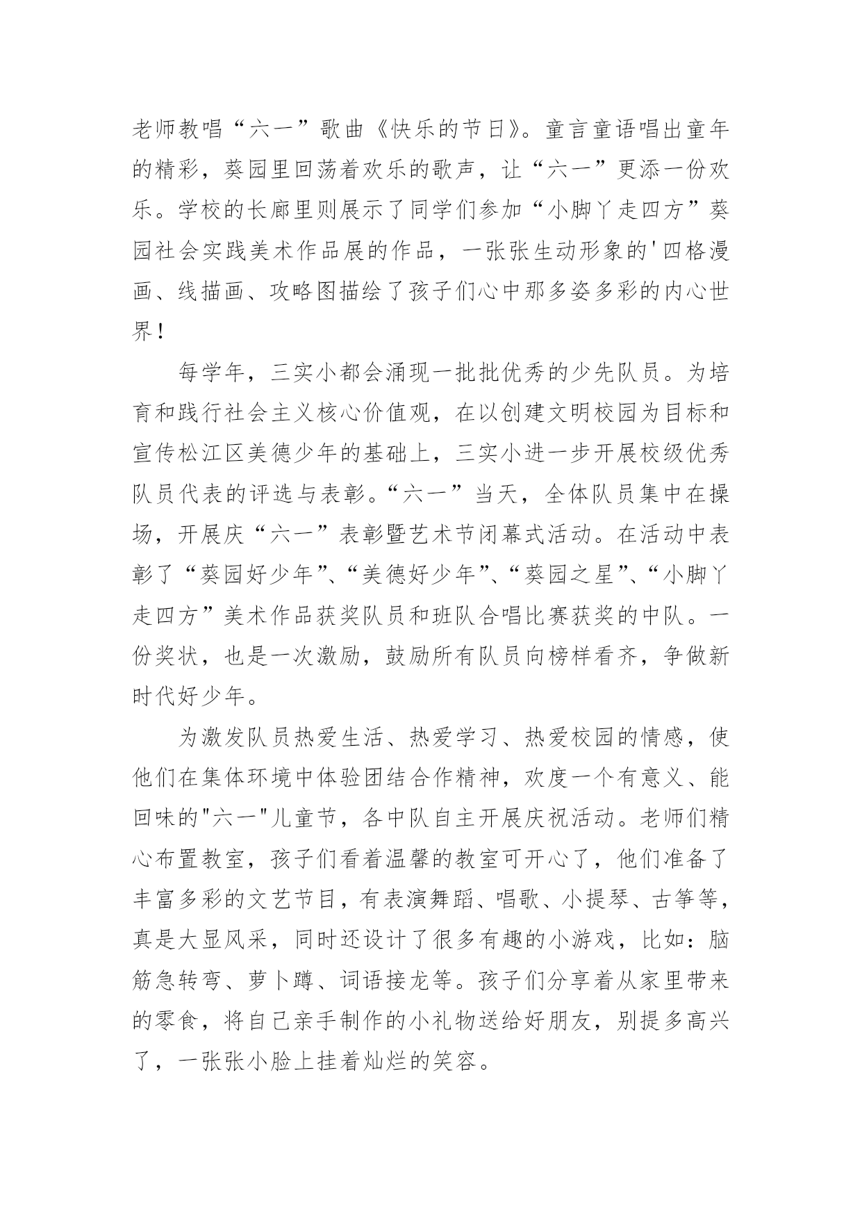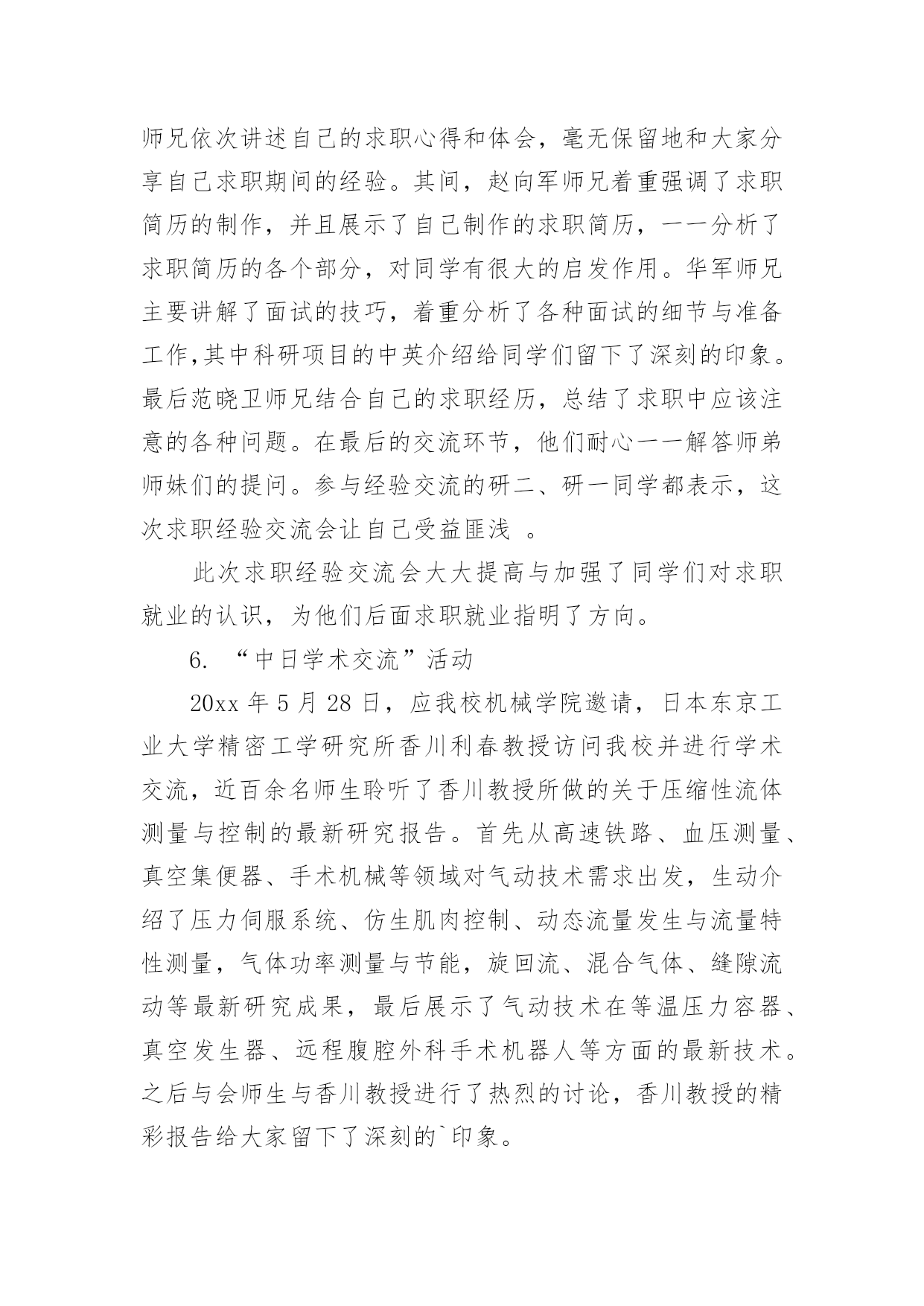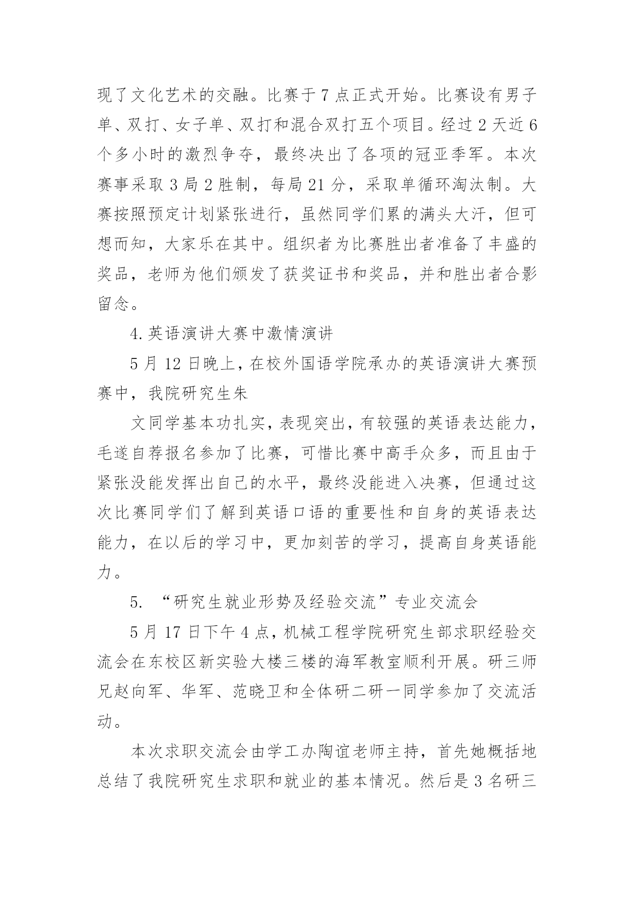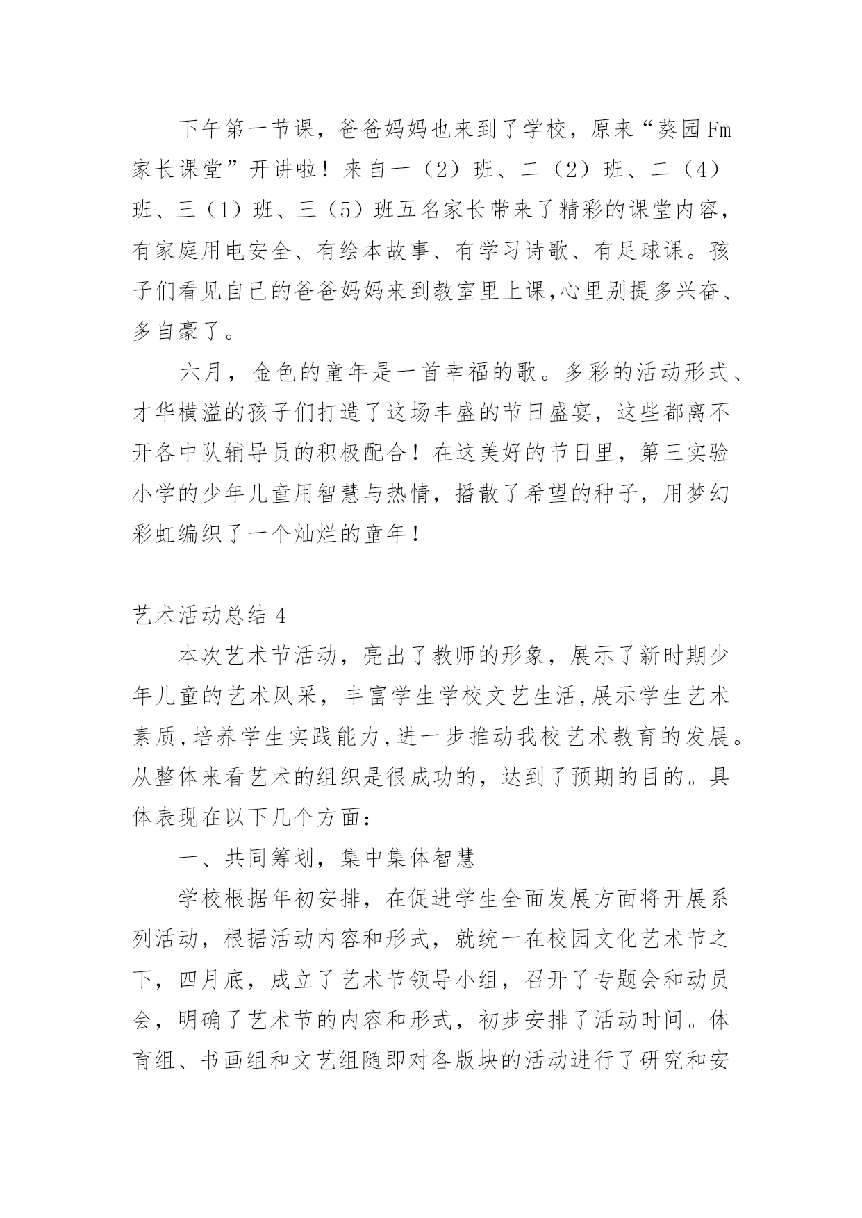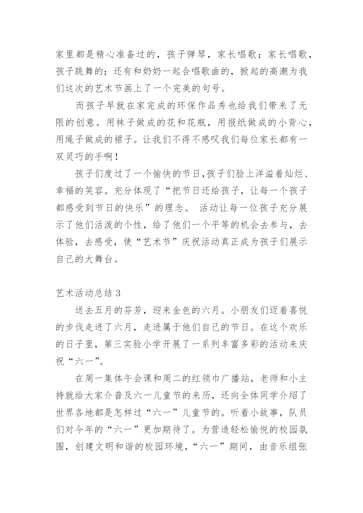 艺术活动总结总结是对取得的成绩、存在的问题及得到的经验和教训等方面情况进行评价与描述的一种书面材料,它可以帮助我们有寻找学习和工作中的规律,为此要我们写一份总结。那么总结有什么格式呢?下面是小编整理的艺术活动总结,希望能够帮助到大家。艺术活动总结1多彩的校园生活,带给全体师生无限美好的期盼。为了活跃校园气氛,丰富同学们的业余生活文化,机械工程学院研究生会以校园文化艺术节为契机,特组织开展了“机械工程学院研究生趣味篮球比赛”、“机械工程学院第五届研究生羽毛球比赛”等活动,这些活动融思想性、艺术性、娱乐性、知识性于一体,本着校团委的“党旗辉映团旗红”的活动领导主题,严格遵循“形式多样、人人参与、层层评优”的原则,给我院研究生提供了一个展示才华的大好舞台。通过这些活动,丰富了广大研究生的课余生活,展示了我院新一届研究生的风采,同时培养研究生的团结协作精神。从整体来看我院此次校园文化艺术节活动是很成功的,达到了预期的目的。一、研究生参与热情高。从活动情况来看,本次艺术节活动我院研究生都能积极参加,参与热情较高,积极参加了研究生部举办的文化艺术节开幕式演出、英语演讲、研究生乒乓球大赛,并且承办了机械工程学院第五届篮球赛、羽毛球赛、乒乓球赛、“研究生就业形势及经验交流”专业讲座和“中日学术交流”活动。相比往届,这届活动的参与人数更多,同学们参与的热情相当高,篮球赛共有40多人参加,羽毛球、乒乓球比赛也有40多人次参加,“研究生就业形势及经验交流”活动全体同学都参加了、“中日学术交流”活动更是座无虚位。一些没有报名的同学也能够积极关注活动进展,参与一些辅助及组织工作,无论是场上参加活动的还是场下的观众,都体会到了活动带来的乐趣,达到了举办活动的目的。二、项目丰富,精彩无比。本次艺术节虽然准备时间很短,但活动项目是丰富而精彩的。我院研究生积极参与和组织的活动主要分为以下几个部分:研究生部举办的文化艺术节开幕式暨欢送毕业生演出晚会、第五届机械工程学院篮球赛、“中日学术交流”活动、机械工程学院第五届羽毛球赛、乒乓球赛、“研究生就业形势及经验交流”专业交流会、和英语演讲大赛等活动。1.在研究生部举办的文化艺术节开幕式暨欢送毕业生演出晚会中激情演出3月29日晚,在研究生部举办的文化艺术节开幕式暨欢送毕业生演出晚会中,我院研究生钱文俊、曹飞、蒋玲慧、何文灿四人为大家精彩演唱了《祝你一路顺风》。表达了对师兄师姐的祝福,歌曲优美动情,歌词表达了温馨、温暖、沉默、无奈,只有心中深深的祝福环绕,寓意我们都相信全体研究生毕业生前程似锦,一路顺风。从选歌、练歌,排练,彩排到最后登台演出,他们为此付出了宝贵的时间和精力。2.院研究生会举办的第五届篮球赛4月14号上午,由机械工程学院团委主办,院研究生会承办的研一VS研二篮球比赛在校篮球场成功举办。经过半个小时的热身训练结束后,比赛于九点正式开始。几乎所有对篮球有热情的同学都参加了这次比赛,场地边都是热情观战的同学。比赛采取正规四节每节15分钟比赛,中场有休息。比赛一开始,两队进入了状态,你攻我守,研二表现了其丰富的球场经验,在防守上从不松懈,进攻节奏也相当清晰。反观研一,虽然其经验不足,但高超的技艺弥补了经验的不足,进攻犀利,但配合不够默契,出现了数次失误。场边观战的同学陶醉在这精彩的比赛中,呐喊声响彻云霄。比赛分数最终锁定在65:64,研一以微弱的优势取得了胜利,在篮球赛中,同学们意识到团队之间相互配合的重要性,对日后的学习研究有很好的帮助作用,赛后同学们加强了彼此之间的交流与探讨,培养了同学们团结协作的精神,这也达到了举办本次活动的目的,最后活动圆满完成。3.院研究生会主办的机械工程学院第五届研究生羽毛球比赛5月14日晚上,由院研究生会主办的机械工程学院第五届研究生羽毛球比赛在校体育馆成功举办。本次比赛有幸邀请了土木工程学院一起参加,加强了与其他学院的交流,体现了文化艺术的交融。比赛于7点正式开始。比赛设有男子单、双打、女子单、双打和混合双打五个项目。经过2天近6个多小时的激烈争夺,最终决出了各项的冠亚季军。本次赛事采取3局2胜制,每局21分,采取单循环淘汰制。大赛按照预定计划紧张进行,虽然同学们累的满头大汗,但可想而知,大家乐在其中。组织者为比赛胜出者准备了丰盛的奖品,老师为他们颁发了获奖证书和奖品,并和胜出者合影留念。4.英语演讲大赛中激情演讲5月12日晚上,在校外国语学院承办的英语演讲大赛预赛中,我院研究生朱文同学基本功扎实,表现突出,有较强的英语表达能力,毛遂自荐报名参加了比赛,可惜比赛中高手众多,而且由于紧张没能发挥出自己的水平,最终没能进入决赛,但通过这次比赛同学们了解到英语口语的重要性和自身的英语表达能力,在以后的学习中,更加刻苦的学习,提高自身英语能力。5.“研究生就业形势及经验交流”专业交流