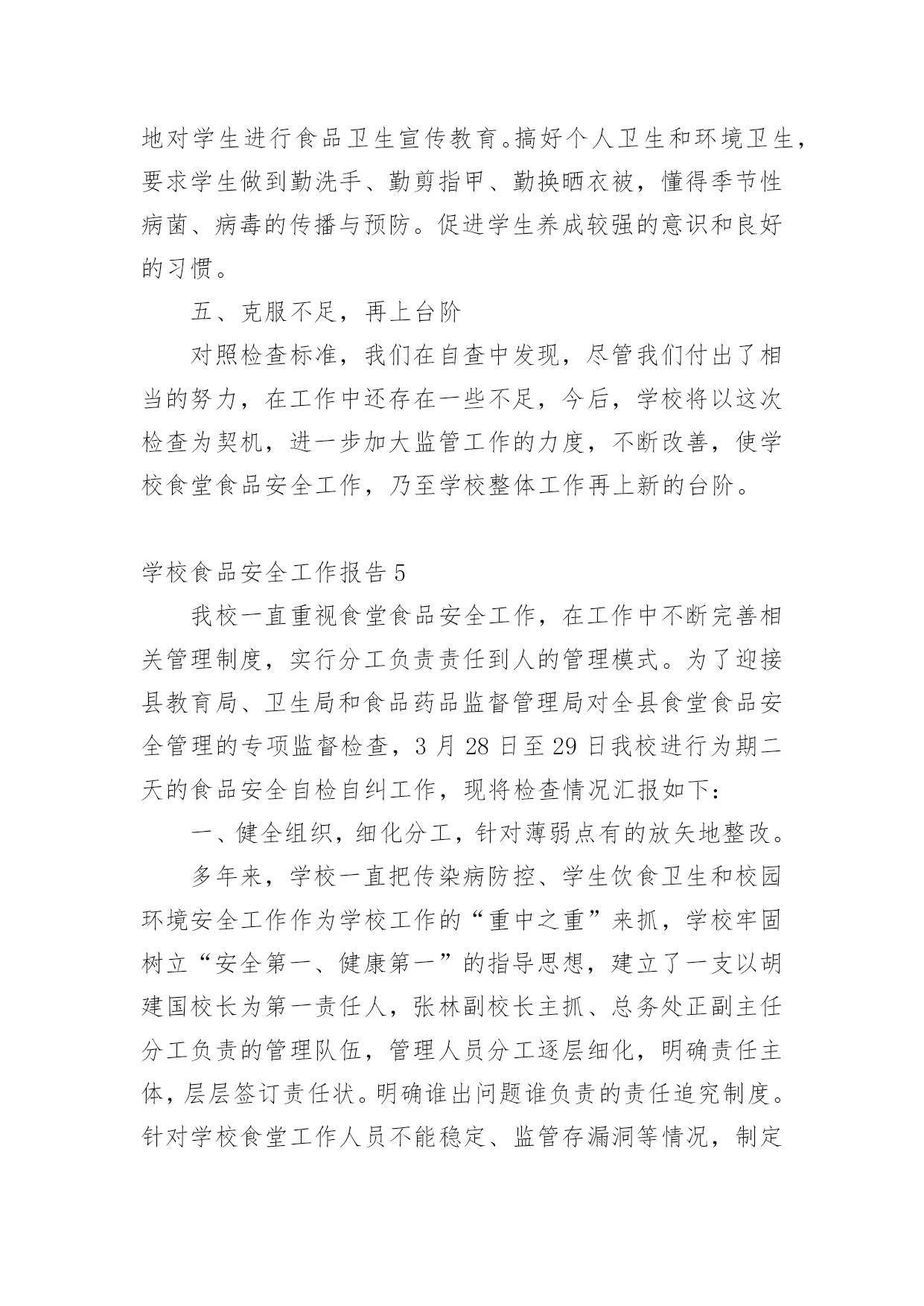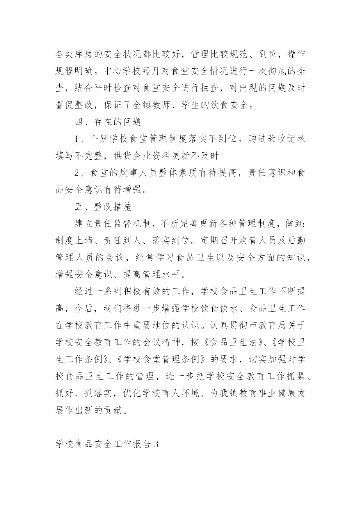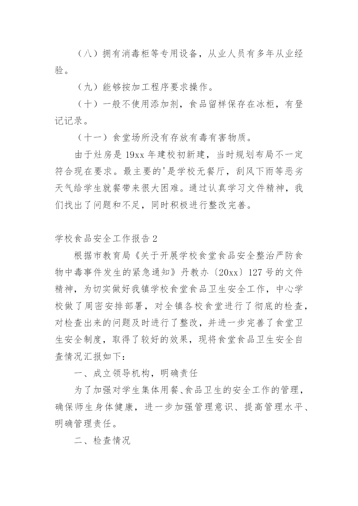 学校食品安全工作报告在日常生活和工作中,我们都不可避免地要接触到报告,报告中提到的所有信息应该是准确无误的。写起报告来就毫无头绪?以下是小编为大家收集的学校食品安全工作报告,希望对大家有所帮助。学校食品安全工作报告1为了进一步加强我校食堂食品卫生安全工作,确保全体师生餐饮食品安全,根据《xx县学校食堂食品安全专项整治工作方案》的文件精神,将我校食堂实际情况汇报如下:(一)学校食品安全组织机构健全,校长任组长,为第一责任人,有兼职管理人员,有规章制度。领导组组长:副组长:成员:(二)有餐饮服务许可证。(三)制定有食品安全突发事件应急预案。(四)食堂功能分区基本合理,不会导致交叉污染。(五)严格执行索票、索证、台帐登记制度。米、面、油由榆社县庄禾粮食购销有限公司配送,其他一般在信誉好的经营户定点购买。(六)食堂环境卫生整洁。(七)从业人员有健康合格证,建有体检、培训档案。(八)拥有消毒柜等专用设备,从业人员有多年从业经验。(九)能够按加工程序要求操作。(十)一般不使用添加剂,食品留样保存在冰柜,有登记记录。(十一)食堂场所没有存放有毒有害物质。由于灶房是19xx年建校初新建,当时规划布局不一定符合现在要求。最主要的'是学校无餐厅,刮风下雨等恶劣天气给学生就餐带来很大困难。通过认真学习文件精神,我们找出了问题和不足,同时积极进行整改完善。学校食品安全工作报告2根据市教育局《关于开展学校食堂食品安全整治严防食物中毒事件发生的紧急通知》丹教办〔20xx〕127号的文件精神,为切实做好我镇学校食堂食品卫生安全工作,中心学校做了周密安排部署,对全镇各校食堂进行了彻底的检查,对检查出来的问题及时进行了整改,并进一步完善了食堂卫生安全制度,取得了较好的效果,现将食堂食品卫生安全自查情况汇报如下:一、成立领导机构,明确责任为了加强对学生集体用餐、食品卫生的安全工作的管理,确保师生身体健康,进一步加强管理意识、提高管理水平、明确管理责任。二、检查情况学校于20xx年11月1日召开了校长参加的食堂卫生安全工作专题会议,对此次食堂卫生安全自查工作进行了具体的安排,并成立了学校食堂卫生安全工作领导小组。真正做到了领导包挂,要求明确,各负其责,责任到人。11月1日3日由中心学校校长牵头挂帅,各校负责人、食堂管理人员积极参与配合,对各校食堂、小卖部等进行全面的检查,尤其对食品卫生、餐饮人员的个人卫生、饮用水卫生、环境卫生、传染病防治与管理状况、食堂用电安全进行了全面细致的排查。排查结束后,及时进行整改,制定详实的整改改措施,进一步完善各种规章制度,对存在问题能解决的及时解决,暂时有困难的及时向上级部门汇报,并采取有效措施杜绝隐患。中心学校又于11月7日组织相关人员对整改情况进行了复查。自查工作的开展,进一步明确相关人员的责任,提高认识,进一步增强了食堂管理人员、食堂工作人员的法律意识和责任意识。三、采取措施1、健全食堂卫生设施。各学校投入资金,购买了一批食堂设施设备,进一步完善了食堂卫生设施。目前食堂功能齐全、防蝇、防尘、防鼠等设施健全,各加工区布局合理,周围环境整洁优美。2、进一步规范管理。一是健全组织,开学初,中心学校就成立了食品卫生管理领导小组,确定一名中心学校工作人员为专职管理员,负责各校食堂的监督、管理、检查工作。食品卫生管理领导小组定期、不定期的对食堂进行卫生检查,发现问题及时督促整改。二是规范管理。进一步完善了食堂管理制度,各校制定了《学校食堂服务管理细则》,并修改完善了《学校食堂考核管理办法》,对食堂的全面工作进行了制度化、规范化。从人员、调入、设备、采购、保管、加工、出售等所有管理环节进行了细化并狠抓落实。3、进一步加强了食品采购、贮存、加工的管理。各校食品采购严格按照《食品卫生法》的要求进行采购,所有统一采购的食品(包括大米、面粉、肉类、食油、种类调味、柴油等)都进行严格的'考察把关,并按国家规定进行索证。各校采购的蔬菜、家禽类,我们执行签订合同,定点供应的办法,与集市固定摊点、菜农签订《供货质量保证书》,确保食品卫生安全,价格优惠。食品贮存严格按照分类、分架、隔墙、离地的原则。加工程序比较合理,生熟、萦素分开,严格执行清洗消毒制度。4、加强食堂证照管理。各校所有食堂工作人员每年都进行体格检查,每年都进行卫生知识的培训,并做到人人办理两证。5、生产场所布局、功能分区、生产工艺流程符合卫生要求,卫生设施配套。烹调间有消烟除尘设施,消烟除尘较好。功能分区合理,粗处理间、烹调间、配餐间、熟食间、洗消间独立设置。熟食或直接入口食品的加工配制间设预进间。有洗手、消毒设施,生产场所卫生,措施完善。6、加强了各种设备的安全检查。现在,各校食堂配属的各类炊事机械、用电设备、消防设备、电路、开关插座、各类库房的安全状况都比较好,管理比较规范、到位,操作