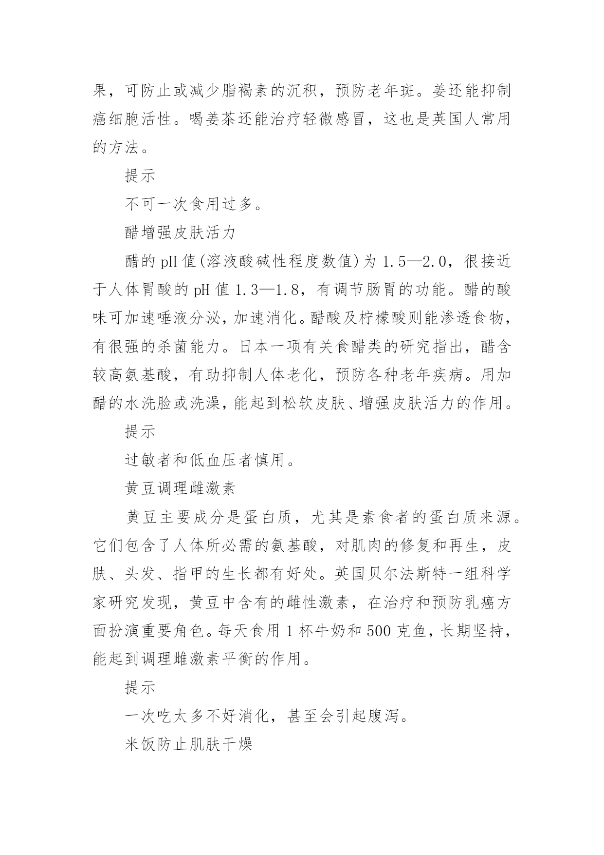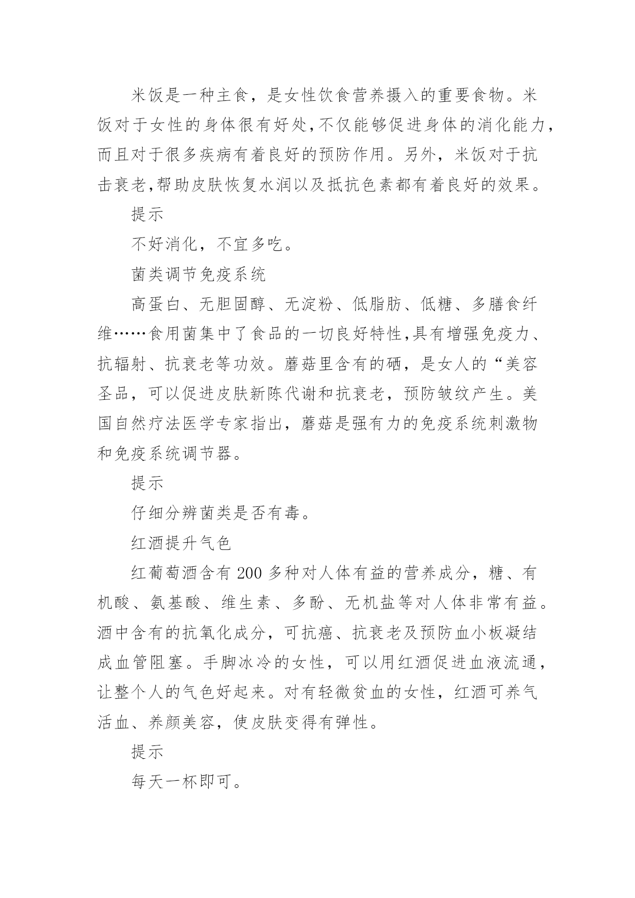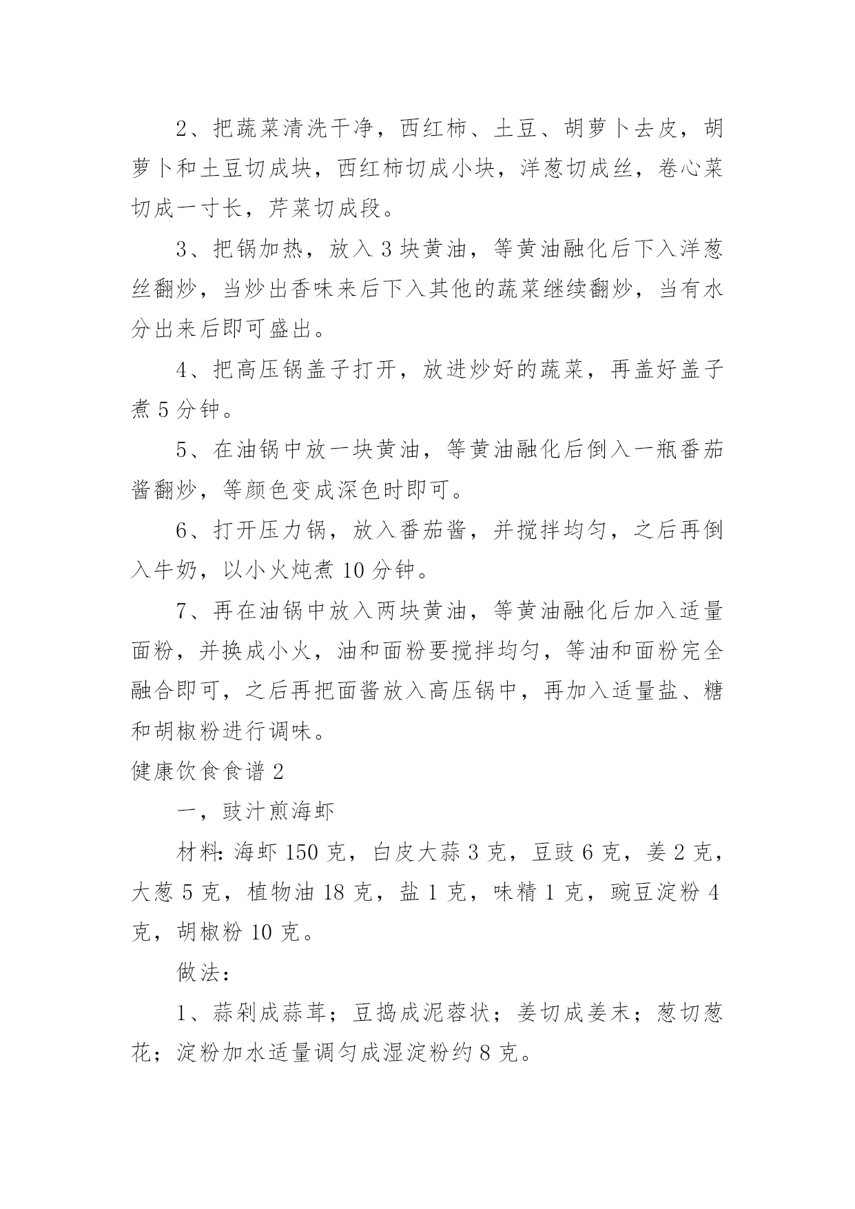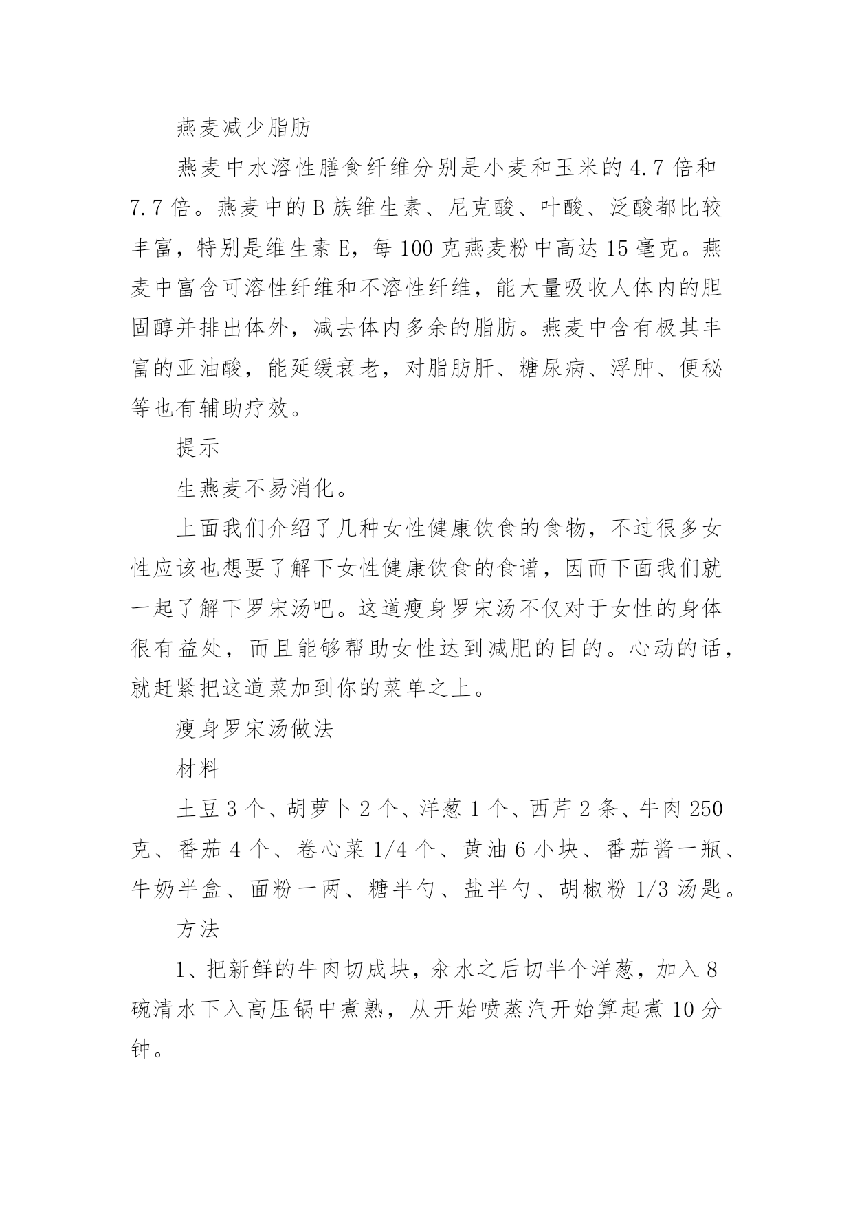健康饮食食谱(集合)健康饮食食谱在日复一日的学习、工作或生活中,大家一定没少看到过美食吧,中国风味的餐食菜肴,中餐重色重形重香重意重味重养,那么,都有哪些经典美食呢?以下是小编为大家收集的健康饮食食谱,仅供参考,希望能够帮助到大家。健康饮食食谱1食物对于身体的滋养效果是得到了全面的认同的,而对于女性的美容养颜抗衰老,健康饮食同样是一种不错的方法。让我们能够在享受美食的同时,获得充足的营养,从而改善我们的身体。葡萄抗氧化葡萄中富含丰富的维生素、矿物质和类黄酮。类黄酮是一种强力抗氧化剂,可抗衰老,并可清除体内自由基。此外,葡萄还含有一种抗癌微量元素(白藜芦醇),可防止健康细胞癌变,阻止癌细胞扩散。不仅是葡萄肉,葡萄皮和葡萄籽也都对女性非常有益。葡萄籽中富含的花青素,其抗氧化的功效比维生素C高出18倍之多,可以说是真正的抗氧化明星。提示葡萄的一大部分营养来自葡萄皮,连皮吃对女性最好。番茄延缓衰老营养学家研究显示,每人每天食用50克—100克鲜番茄,即可满足人体对几种维生素和矿物质的需要。番茄生吃能补充维生素C。煮熟后食用,所含的番茄红素和其他抗氧化剂含量会显著上升,起到降低心脏病的风险和抗衰老的作用。提示生吃、熟吃,吸收的营养不同。土豆是减肥佳品土豆,是一种极为健康的食物,但通常被人们所忽视。它低热量且脂肪含量极低,易产生饱腹感,作为主食食用是女人最好的减肥食物。土豆含有丰富的B族维生素及大量的优质纤维素,还含有微量元素、氨基酸、蛋白质、脂肪和优质淀粉等,在人的机体抗衰老过程中能发挥功效。其所含的蛋白质、磷和维生素C的含量为蔬菜之最。提示土豆发青、发芽后不可食用,以免中毒。茶叶防辐射茶是我国的一种传统饮品,有着良好的功效。茶不仅能够帮助预防癌症。同时也能够起到放辐射的功效,对女性很有益处。另外,除了饮茶之外,女性还可以使用茶叶作为洗脸的工具,对于清洁脸部皮肤,抗击衰老有着良好的功效。提示睡眠不好、胃肠功能较差的人慎用。姜减少色素沉淀姜含有丰富蛋白质、多种维生素、胡萝卜素、钙、铁、磷等。姜中所含的姜辣素进入体内后,有很强的'抗氧化效果,可防止或减少脂褐素的沉积,预防老年斑。姜还能抑制癌细胞活性。喝姜茶还能治疗轻微感冒,这也是英国人常用的方法。提示不可一次食用过多。醋增强皮肤活力醋的pH值(溶液酸碱性程度数值)为1.5—2.0,很接近于人体胃酸的pH值1.3—1.8,有调节肠胃的功能。醋的酸味可加速唾液分泌,加速消化。醋酸及柠檬酸则能渗透食物,有很强的杀菌能力。日本一项有关食醋类的研究指出,醋含较高氨基酸,有助抑制人体老化,预防各种老年疾病。用加醋的水洗脸或洗澡,能起到松软皮肤、增强皮肤活力的作用。提示过敏者和低血压者慎用。黄豆调理雌激素黄豆主要成分是蛋白质,尤其是素食者的蛋白质来源。它们包含了人体所必需的氨基酸,对肌肉的修复和再生,皮肤、头发、指甲的生长都有好处。英国贝尔法斯特一组科学家研究发现,黄豆中含有的雌性激素,在治疗和预防乳癌方面扮演重要角色。每天食用1杯牛奶和500克鱼,长期坚持,能起到调理雌激素平衡的作用。提示一次吃太多不好消化,甚至会引起腹泻。米饭防止肌肤干燥米饭是一种主食,是女性饮食营养摄入的重要食物。米饭对于女性的身体很有好处,不仅能够促进身体的消化能力,而且对于很多疾病有着良好的预防作用。另外,米饭对于抗击衰老,帮助皮肤恢复水润以及抵抗色素都有着良好的效果。提示不好消化,不宜多吃。菌类调节免疫系统高蛋白、无胆固醇、无淀粉、低脂肪、低糖、多膳食纤维……食用菌集中了食品的一切良好特性,具有增强免疫力、抗辐射、抗衰老等功效。蘑菇里含有的硒,是女人的“美容圣品,可以促进皮肤新陈代谢和抗衰老,预防皱纹产生。美国自然疗法医学专家指出,蘑菇是强有力的免疫系统刺激物和免疫系统调节器。提示仔细分辨菌类是否有毒。红酒提升气色红葡萄酒含有200多种对人体有益的营养成分,糖、有机酸、氨基酸、维生素、多酚、无机盐等对人体非常有益。酒中含有的抗氧化成分,可抗癌、抗衰老及预防血小板凝结成血管阻塞。手脚冰冷的女性,可以用红酒促进血液流通,让整个人的气色好起来。对有轻微贫血的女性,红酒可养气活血、养颜美容,使皮肤变得有弹性。提示每天一杯即可。燕麦减少脂肪燕麦中水溶性膳食纤维分别是小麦和玉米的4.7倍和7.7倍。燕麦中的B族维生素、尼克酸、叶酸、泛酸都比较丰富,特别是维生素E,每100克燕麦粉中高达15毫克。燕麦中富含可溶性纤维和不溶性纤维,能大量吸收人体内的胆固醇并排出体外,减去体内多余的脂肪。燕麦中含有极其丰富的亚油酸,能延缓衰老,对脂肪肝、糖尿病、浮肿、便秘等也有辅助疗效。提示生燕麦不易消化。上面我们介绍了几种女性健康饮食的食物,不过很多女性应该也想要了解下女性健康饮食的食谱,因而下面我们就一起了解下罗宋汤吧。这道瘦身罗宋汤不仅对于女性的身