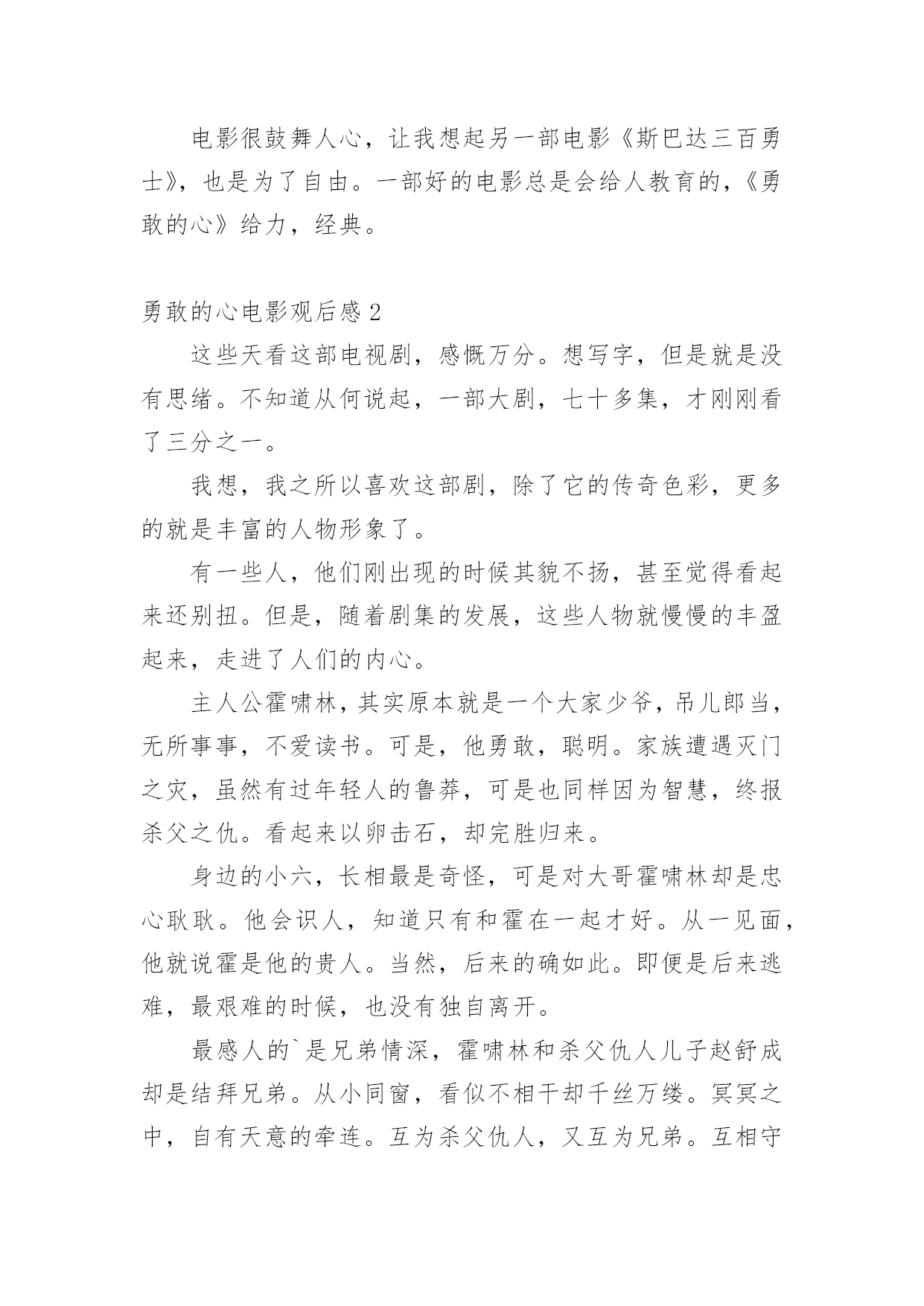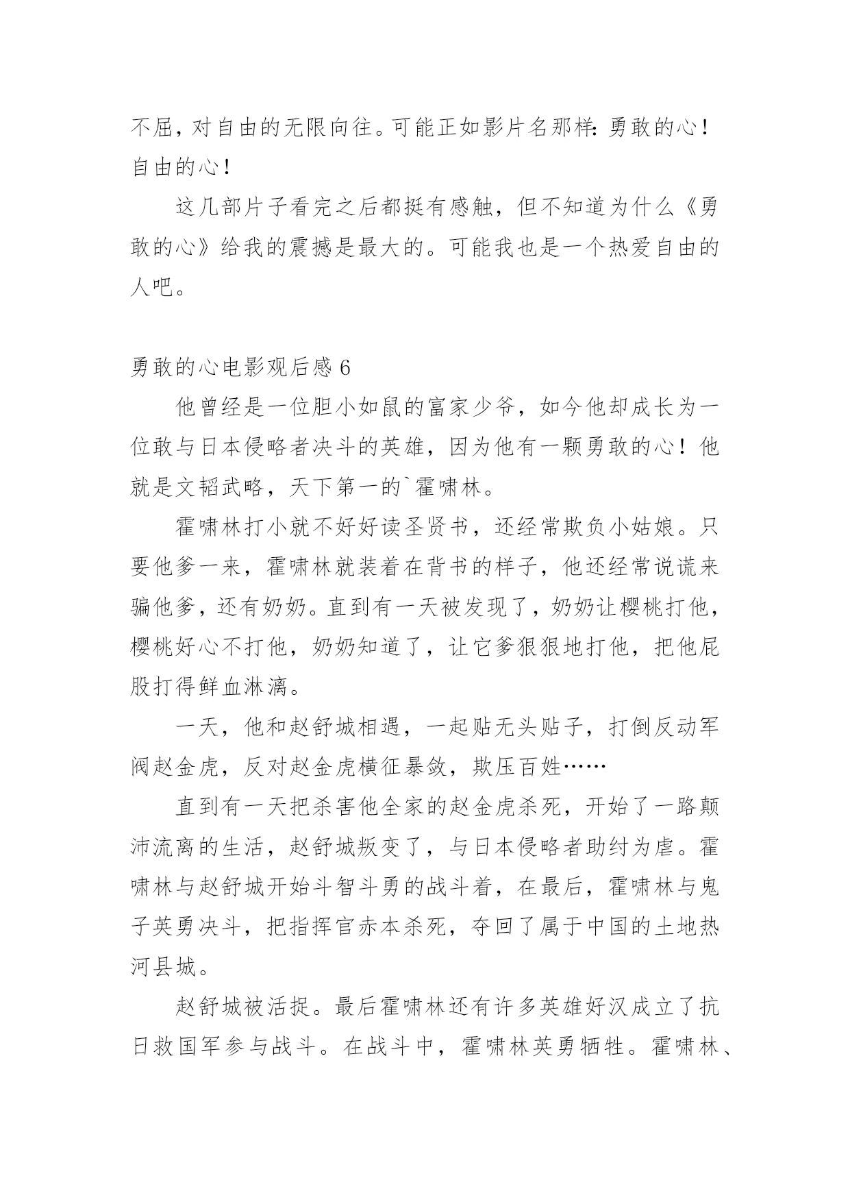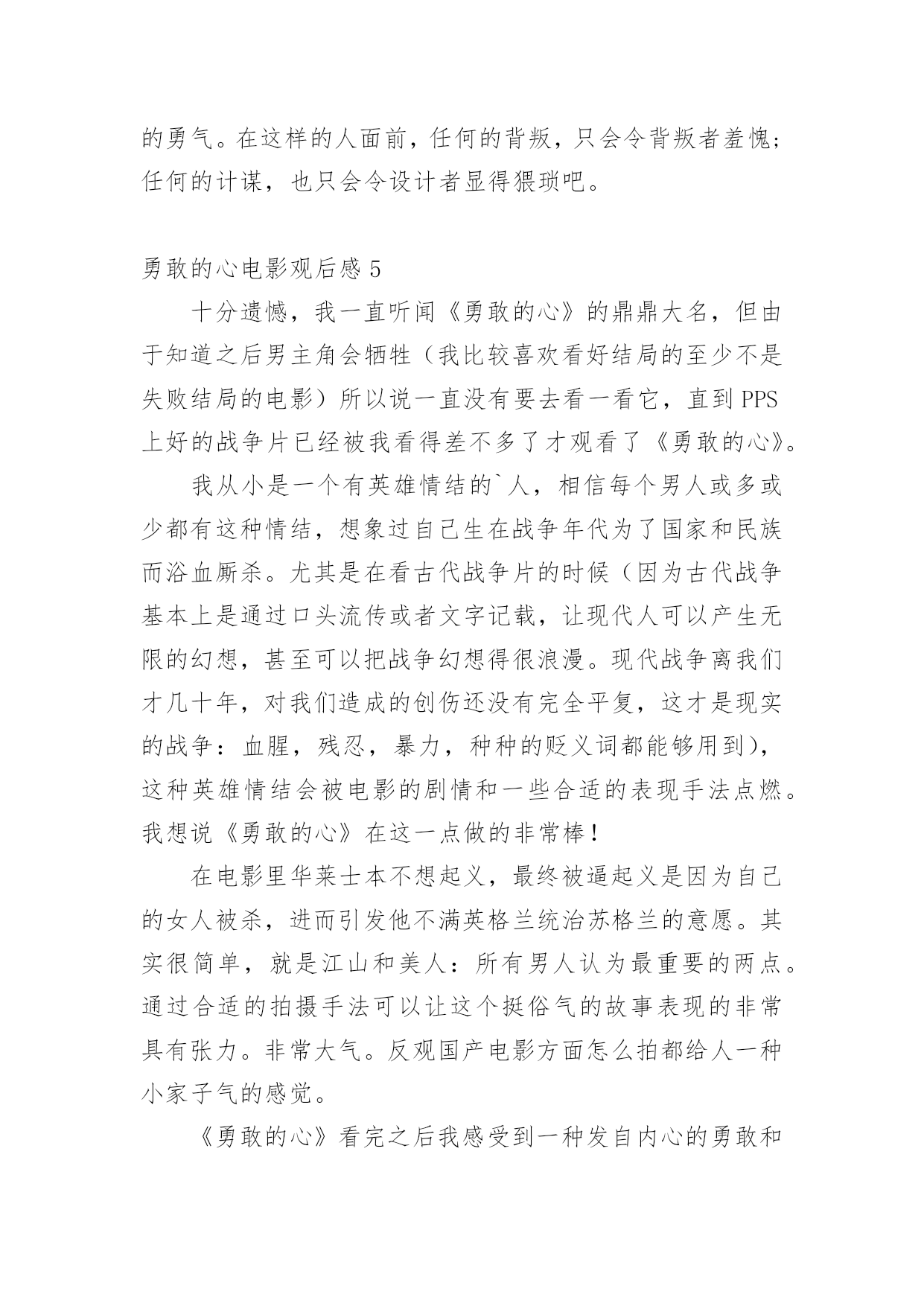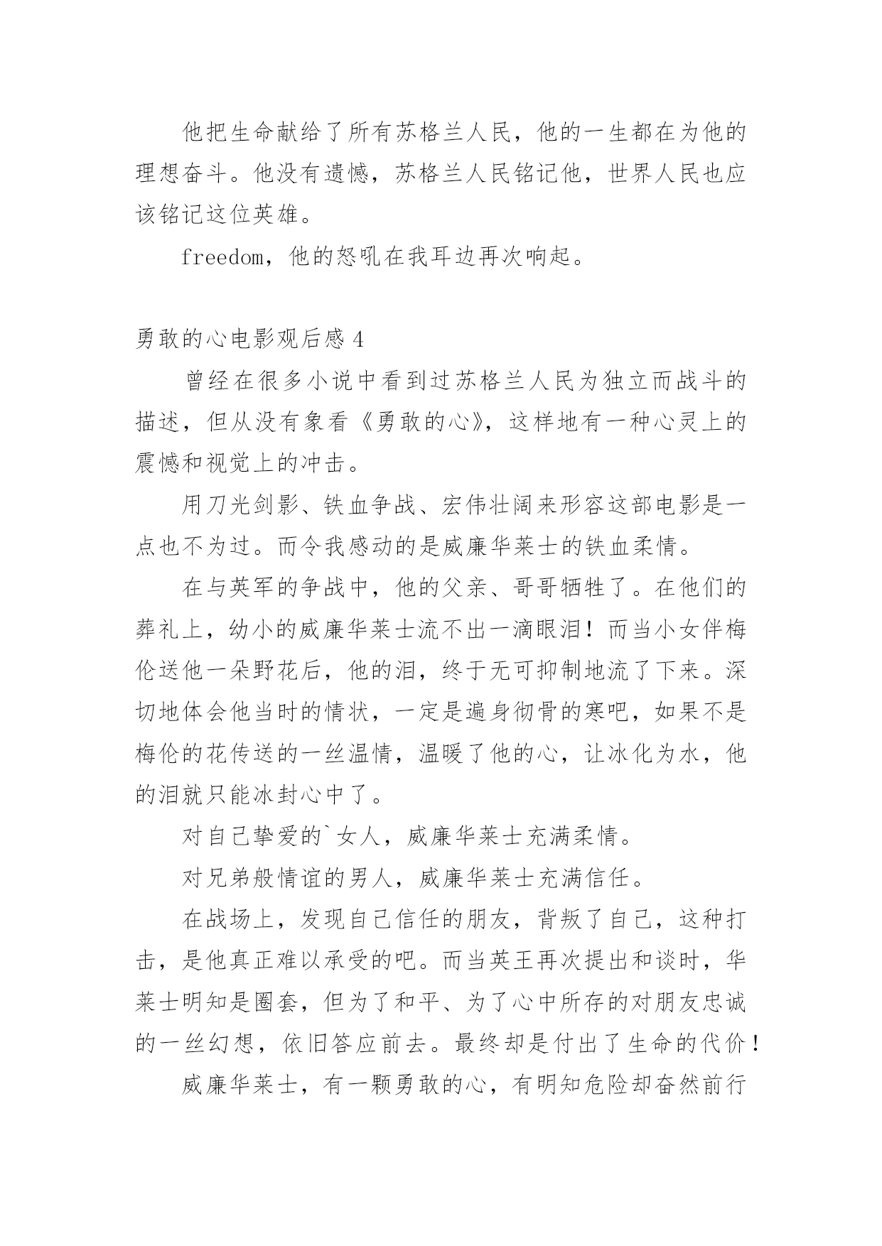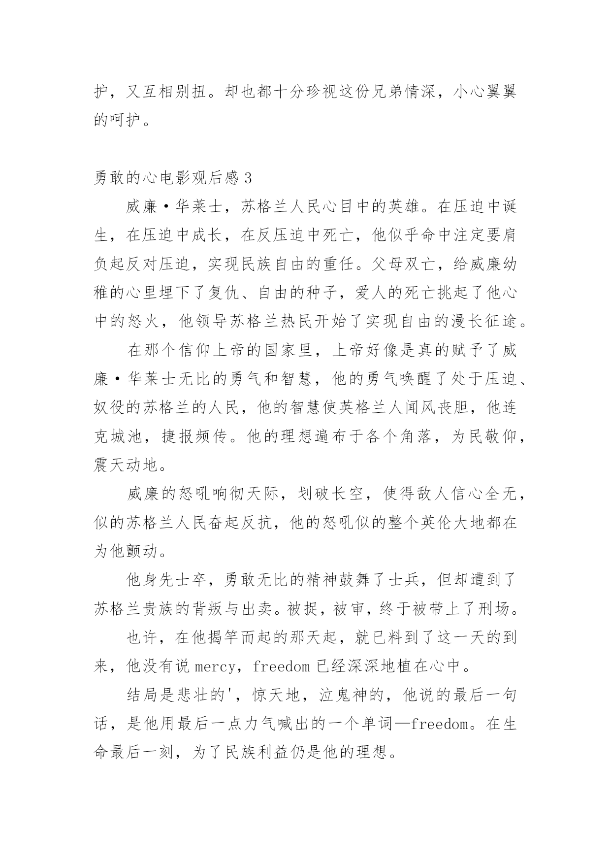 勇敢的心电影观后感在看完一部作品以后,从中我们收获新的思想,记录下来很重要哦,一起来写一篇观后感吧。可是观后感怎么写才合适呢?以下是小编为大家收集的勇敢的心电影观后感,希望能够帮助到大家。勇敢的心电影观后感1今天看了电影《勇敢的心》,一个想看了很久的电影。经典就是经典,很是鼓舞人心。首先,华莱士的父亲、叔叔教会了他:人要先学会用他的脑袋才能真正的战斗。后来,战斗之中他也不断实践着这句话。尤其是打败重装骑兵的那仗,更让人感觉到智慧的力量。小说《活色生香》里有个类似的事件,和日本竞技的黄金镜头那一章节。总结起来就是,不要因为拥有强大的物质、技术之类的'优势而沾沾自喜,要知道人的智慧是无限的。所以,也启迪我们遇到困难不要着急,静下心思考、讨论、想办法,相信人的智慧,很多事情都是可以圆满解决的。其次,口才。华莱士绝断能力强,擅于鼓舞士气,演讲能力很强。能很好地判断局势,能很好地传达出自己的思想,有领导的能力。最后,也是最重要的,勇敢的心。敢想,敢做,同时身体素质好啊,冲锋陷阵,以身作则!当面对强敌时,当遭遇困难时,当临近死亡时,保持清醒,勇敢地坚持自己。电影很鼓舞人心,让我想起另一部电影《斯巴达三百勇士》,也是为了自由。一部好的电影总是会给人教育的,《勇敢的心》给力,经典。勇敢的心电影观后感2这些天看这部电视剧,感慨万分。想写字,但是就是没有思绪。不知道从何说起,一部大剧,七十多集,才刚刚看了三分之一。我想,我之所以喜欢这部剧,除了它的传奇色彩,更多的就是丰富的人物形象了。有一些人,他们刚出现的时候其貌不扬,甚至觉得看起来还别扭。但是,随着剧集的发展,这些人物就慢慢的丰盈起来,走进了人们的内心。主人公霍啸林,其实原本就是一个大家少爷,吊儿郎当,无所事事,不爱读书。可是,他勇敢,聪明。家族遭遇灭门之灾,虽然有过年轻人的鲁莽,可是也同样因为智慧,终报杀父之仇。看起来以卵击石,却完胜归来。身边的小六,长相最是奇怪,可是对大哥霍啸林却是忠心耿耿。他会识人,知道只有和霍在一起才好。从一见面,他就说霍是他的贵人。当然,后来的确如此。即便是后来逃难,最艰难的时候,也没有独自离开。最感人的`是兄弟情深,霍啸林和杀父仇人儿子赵舒成却是结拜兄弟。从小同窗,看似不相干却千丝万缕。冥冥之中,自有天意的牵连。互为杀父仇人,又互为兄弟。互相守护,又互相别扭。却也都十分珍视这份兄弟情深,小心翼翼的呵护。勇敢的心电影观后感3威廉·华莱士,苏格兰人民心目中的英雄。在压迫中诞生,在压迫中成长,在反压迫中死亡,他似乎命中注定要肩负起反对压迫,实现民族自由的重任。父母双亡,给威廉幼稚的心里埋下了复仇、自由的种子,爱人的死亡挑起了他心中的怒火,他领导苏格兰热民开始了实现自由的漫长征途。在那个信仰上帝的国家里,上帝好像是真的赋予了威廉·华莱士无比的勇气和智慧,他的勇气唤醒了处于压迫、奴役的苏格兰的人民,他的智慧使英格兰人闻风丧胆,他连克城池,捷报频传。他的理想遍布于各个角落,为民敬仰,震天动地。威廉的怒吼响彻天际,划破长空,使得敌人信心全无,似的苏格兰人民奋起反抗,他的怒吼似的整个英伦大地都在为他颤动。他身先士卒,勇敢无比的精神鼓舞了士兵,但却遭到了苏格兰贵族的背叛与出卖。被捉,被审,终于被带上了刑场。也许,在他揭竿而起的那天起,就已料到了这一天的到来,他没有说mercy,freedom已经深深地植在心中。结局是悲壮的',惊天地,泣鬼神的,他说的最后一句话,是他用最后一点力气喊出的一个单词—freedom。在生命最后一刻,为了民族利益仍是他的理想。他把生命献给了所有苏格兰人民,他的一生都在为他的理想奋斗。他没有遗憾,苏格兰人民铭记他,世界人民也应该铭记这位英雄。freedom,他的怒吼在我耳边再次响起。勇敢的心电影观后感4曾经在很多小说中看到过苏格兰人民为独立而战斗的描述,但从没有象看《勇敢的心》,这样地有一种心灵上的震憾和视觉上的冲击。用刀光剑影、铁血争战、宏伟壮阔来形容这部电影是一点也不为过。而令我感动的是威廉华莱士的铁血柔情。在与英军的争战中,他的父亲、哥哥牺牲了。在他们的葬礼上,幼小的威廉华莱士流不出一滴眼泪!而当小女伴梅伦送他一朵野花后,他的泪,终于无可抑制地流了下来。深切地体会他当时的情状,一定是遍身彻骨的寒吧,如果不是梅伦的花传送的一丝温情,温暖了他的心,让冰化为水,他的泪就只能冰封心中了。对自己挚爱的`女人,威廉华莱士充满柔情。对兄弟般情谊的男人,威廉华莱士充满信任。在战场上,发现自己信任的朋友,背叛了自己,这种打击,是他真正难以承受的吧。而当英王再次提出和谈时,华莱士明知是圈套,但为了和平、为了心中所存的对朋友忠诚的一丝幻想,依旧答应前去。最终却是付出了生命的代价!威廉华莱士,有一颗勇敢的心,有明知危险却奋然前行的勇气。在这样的人面前,任何的背叛,只会令背