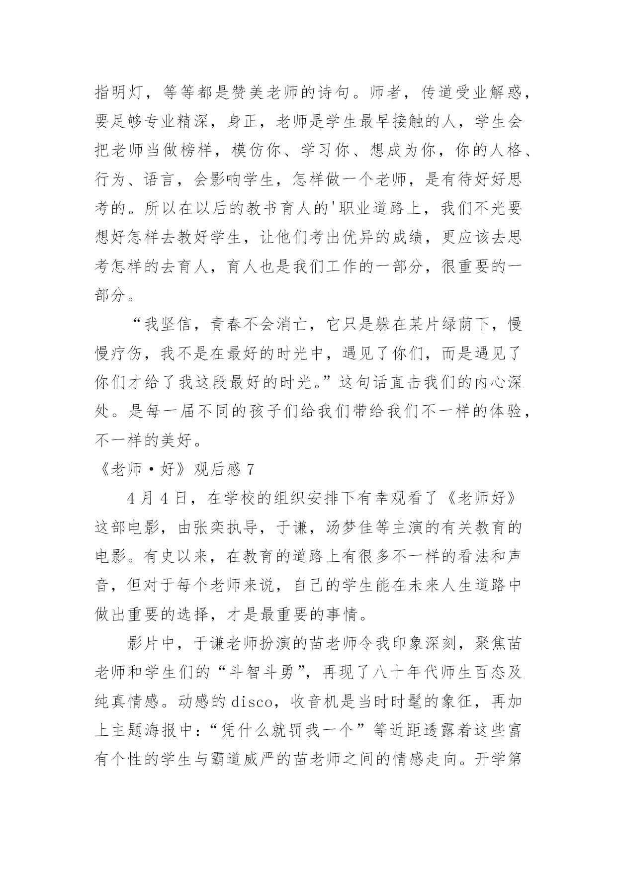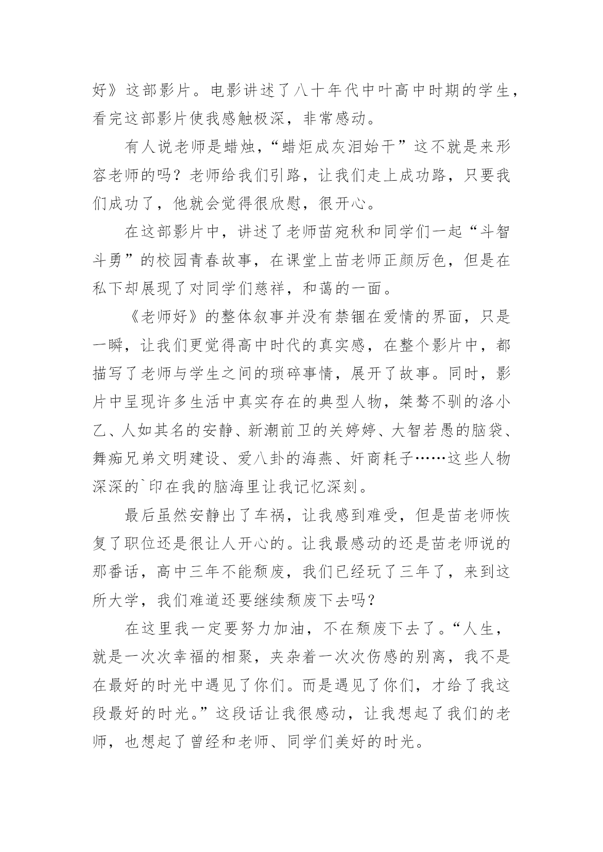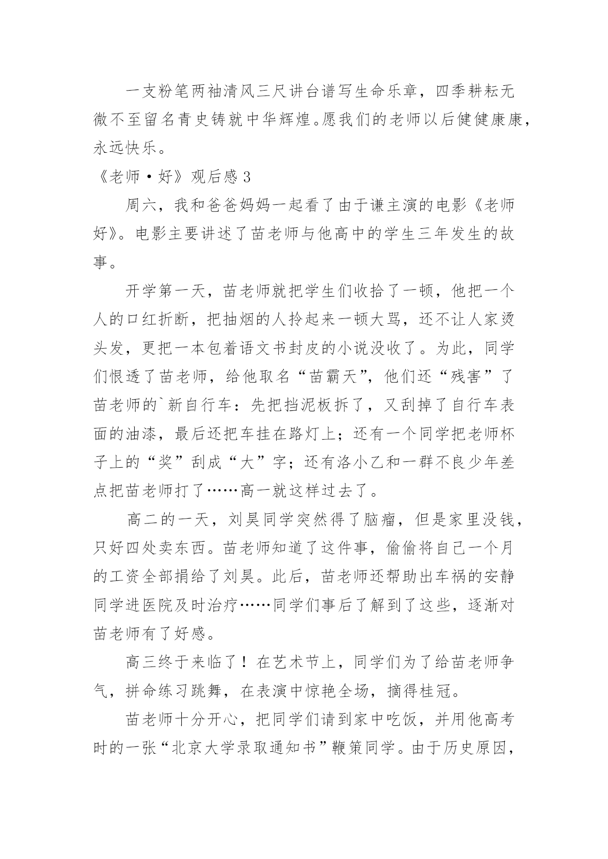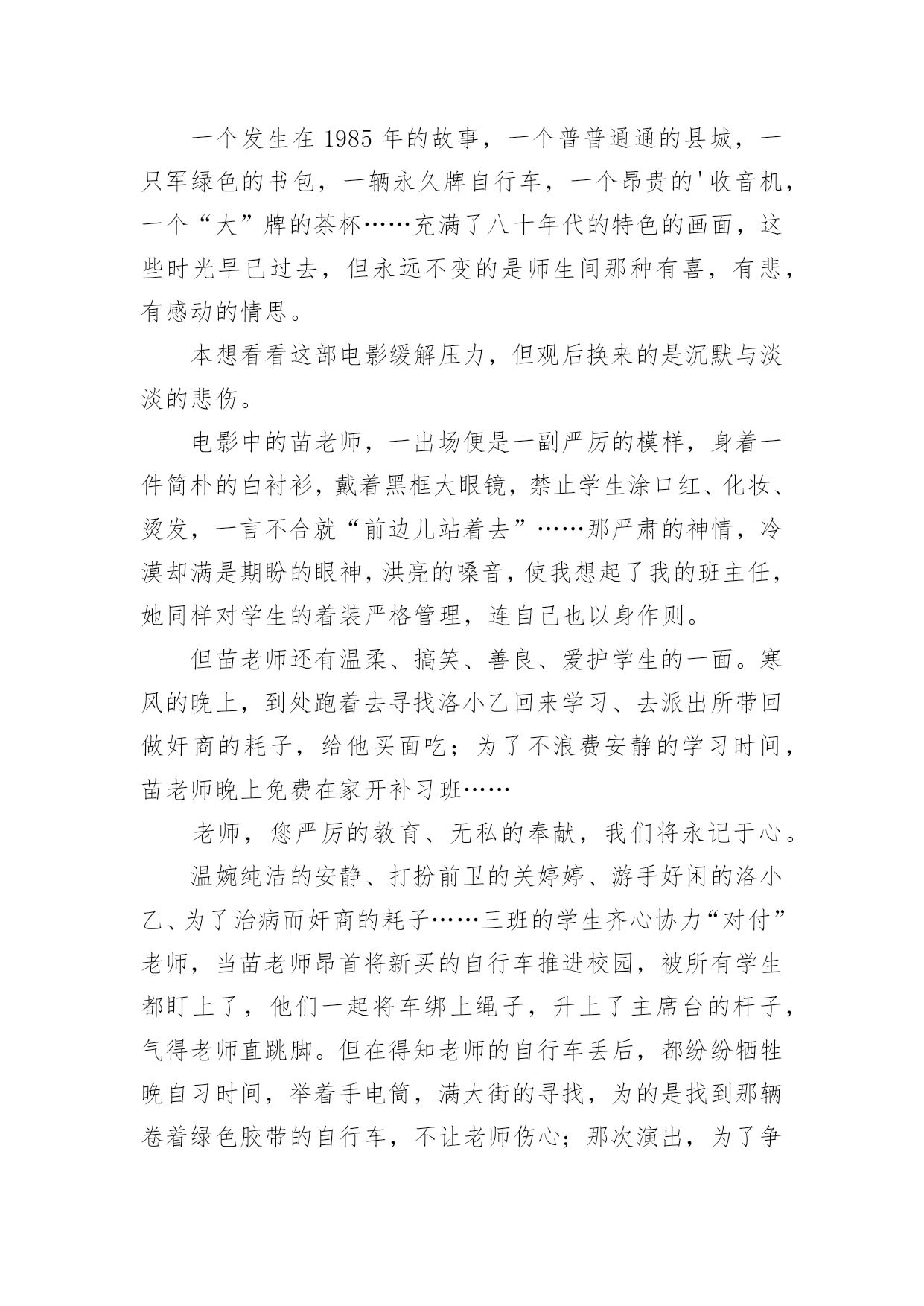 《老师·好》观后感《老师·好》观后感认真品味一部作品后,一定有不少感悟吧,现在就让我们写一篇走心的观后感吧。那么你真的懂得怎么写观后感吗?以下是小编为大家整理的《老师·好》观后感,欢迎大家分享。《老师·好》观后感1《老师·好》这部影片很早就听说了,只是才有时间看。每个生命最天然的声音都是想做自己,如果生命里的这个声音在恰当的时候遇到了些微回应,那真是一件很幸运的事。影片《老师·好》带我们来到了1985年的南宿一中高中三班,一个十八线的小地方,八十年代是个神奇的年代,改革开放、万物复苏,重获生命力的人们开始体验成长带来的惊喜和碰撞,这其中尤以孩子们为代表。一开始时候觉得苗宛秋(于谦饰演)也不过是普通的一个喜欢品学兼优听话的学生的老师,对“坏”学生总是戴着有色眼镜,什么犯错误的时候不分青红皂白就责骂。甚至以为的民主评选班长也只向着好学生。这一瞬间会让我觉得,这个老师其实也不过如此。后面发现,其实苗宛秋也是刀子嘴豆腐心吧,分明印证了那句“当孩子不可爱的时候,正是最需要我们的时候”,他甚至不善于表达自己的内心想法,做的每一件事却是为学生负责。懂得学生的心理行为,知道怎么对症下药,耗子生病要做手术自发募捐一个月的工资。洛小乙想要当兵却因为关婷婷的.挑拨离间让洛小乙没能入团,被误会和安静搞对象,洛小乙开始了自暴自弃,还是苗宛秋让洛小乙回头。跟安静说人生道路十字路口很多条,偏偏有当下一两条是比较重要的选择,让安静清楚自己的人生规划。为高考的学生免费补习被举报导致停职(后来安静去教育局说明了情况,苗老师恢复了职位,还分到了房子,但他没有接受,因为这是安静出了车祸换来的)老师也不是没故事的人。影片中很感人的一幕是,文明建设把自己辛苦攒的买录音机的50块钱捐给耗子做手术的时候的霸气,感到到不禁流泪。还有一幕是安静骑着苗老师的自行车闯进教育局,哭着说“县长,救救我们老师吧。”感人的瞬间就是这么突如其来。坚持了多年的坚固信念一朝被破碎,也许恰恰需要走回到原点,捡拾起自己的初心,问一问想一想。我想火车上苗老师的行李里一定有那只口琴。老师好,请做个好老师!《老师·好》观后感2大家都知道九月十日是教师节,在教师节那天我们学校的大二学长组织我们经贸管理系大一学生共同观看了《老师好》这部影片。电影讲述了八十年代中叶高中时期的学生,看完这部影片使我感触极深,非常感动。有人说老师是蜡烛,“蜡炬成灰泪始干”这不就是来形容老师的吗?老师给我们引路,让我们走上成功路,只要我们成功了,他就会觉得很欣慰,很开心。在这部影片中,讲述了老师苗宛秋和同学们一起“斗智斗勇”的校园青春故事,在课堂上苗老师正颜厉色,但是在私下却展现了对同学们慈祥,和蔼的一面。《老师好》的整体叙事并没有禁锢在爱情的界面,只是一瞬,让我们更觉得高中时代的真实感,在整个影片中,都描写了老师与学生之间的琐碎事情,展开了故事。同时,影片中呈现许多生活中真实存在的典型人物,桀骜不驯的洛小乙、人如其名的安静、新潮前卫的关婷婷、大智若愚的脑袋、舞痴兄弟文明建设、爱八卦的海燕、奸商耗子……这些人物深深的`印在我的脑海里让我记忆深刻。最后虽然安静出了车祸,让我感到难受,但是苗老师恢复了职位还是很让人开心的。让我最感动的还是苗老师说的那番话,高中三年不能颓废,我们已经玩了三年了,来到这所大学,我们难道还要继续颓废下去吗?在这里我一定要努力加油,不在颓废下去了。“人生,就是一次次幸福的相聚,夹杂着一次次伤感的别离,我不是在最好的时光中遇见了你们。而是遇见了你们,才给了我这段最好的时光。”这段话让我很感动,让我想起了我们的老师,也想起了曾经和老师、同学们美好的时光。一支粉笔两袖清风三尺讲台谱写生命乐章,四季耕耘无微不至留名青史铸就中华辉煌。愿我们的老师以后健健康康,永远快乐。《老师·好》观后感3周六,我和爸爸妈妈一起看了由于谦主演的电影《老师好》。电影主要讲述了苗老师与他高中的学生三年发生的故事。开学第一天,苗老师就把学生们收拾了一顿,他把一个人的口红折断,把抽烟的人拎起来一顿大骂,还不让人家烫头发,更把一本包着语文书封皮的小说没收了。为此,同学们恨透了苗老师,给他取名“苗霸天”,他们还“残害”了苗老师的`新自行车:先把挡泥板拆了,又刮掉了自行车表面的油漆,最后还把车挂在路灯上;还有一个同学把老师杯子上的“奖”刮成“大”字;还有洛小乙和一群不良少年差点把苗老师打了……高一就这样过去了。高二的一天,刘昊同学突然得了脑瘤,但是家里没钱,只好四处卖东西。苗老师知道了这件事,偷偷将自己一个月的工资全部捐给了刘昊。此后,苗老师还帮助出车祸的安静同学进医院及时治疗……同学们事后了解到了这些,逐渐对苗老师有了好感。高三终于来临了!在艺术节上,同学们为了给苗老师争气,拼命练习跳舞,在表演中惊艳全场,摘得桂冠。苗老师十分开心,把同学们请到家