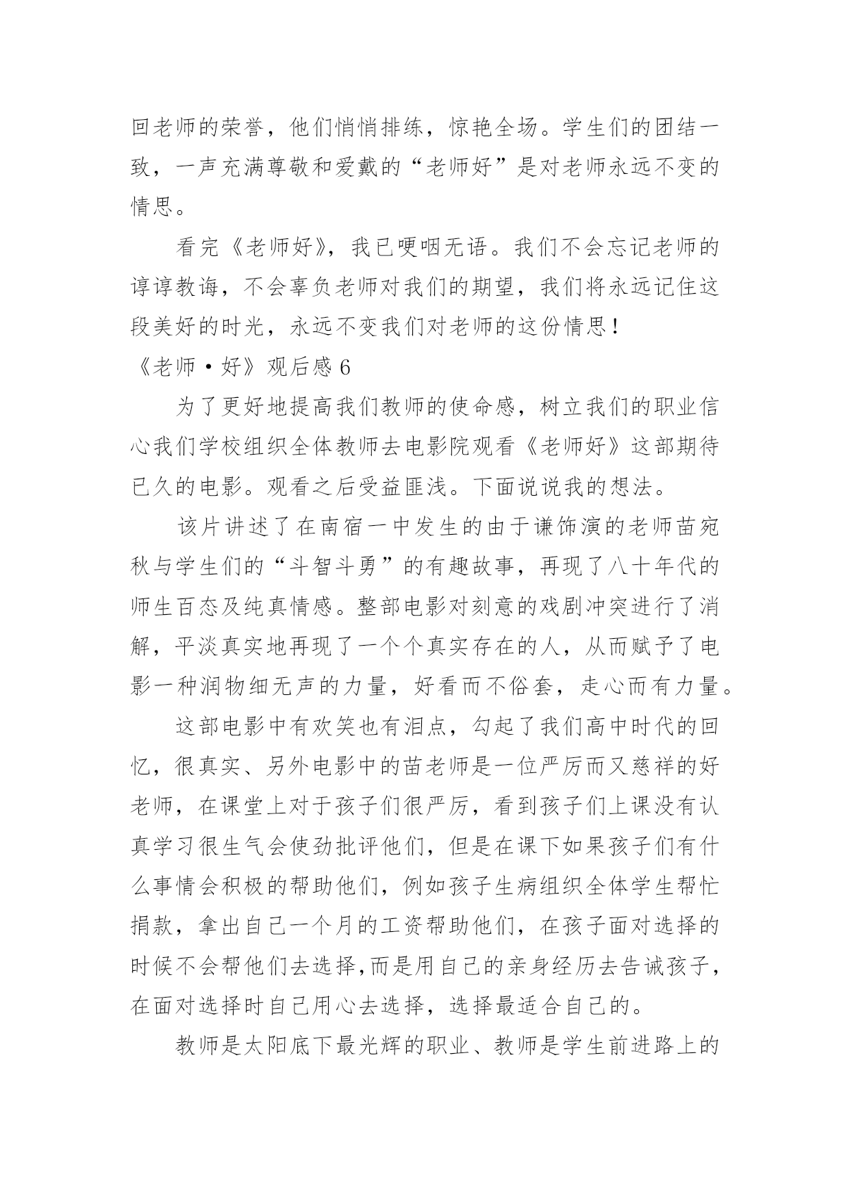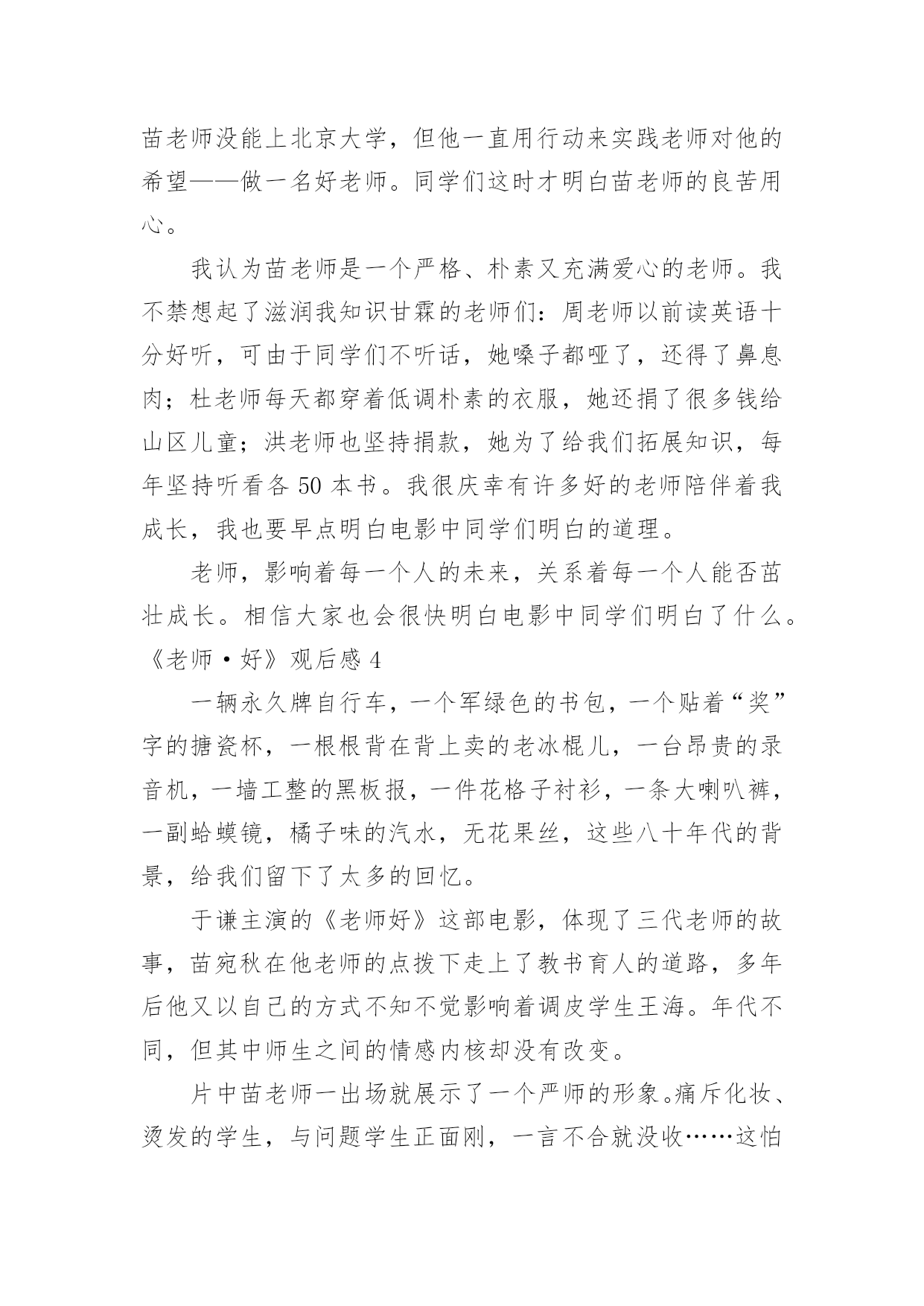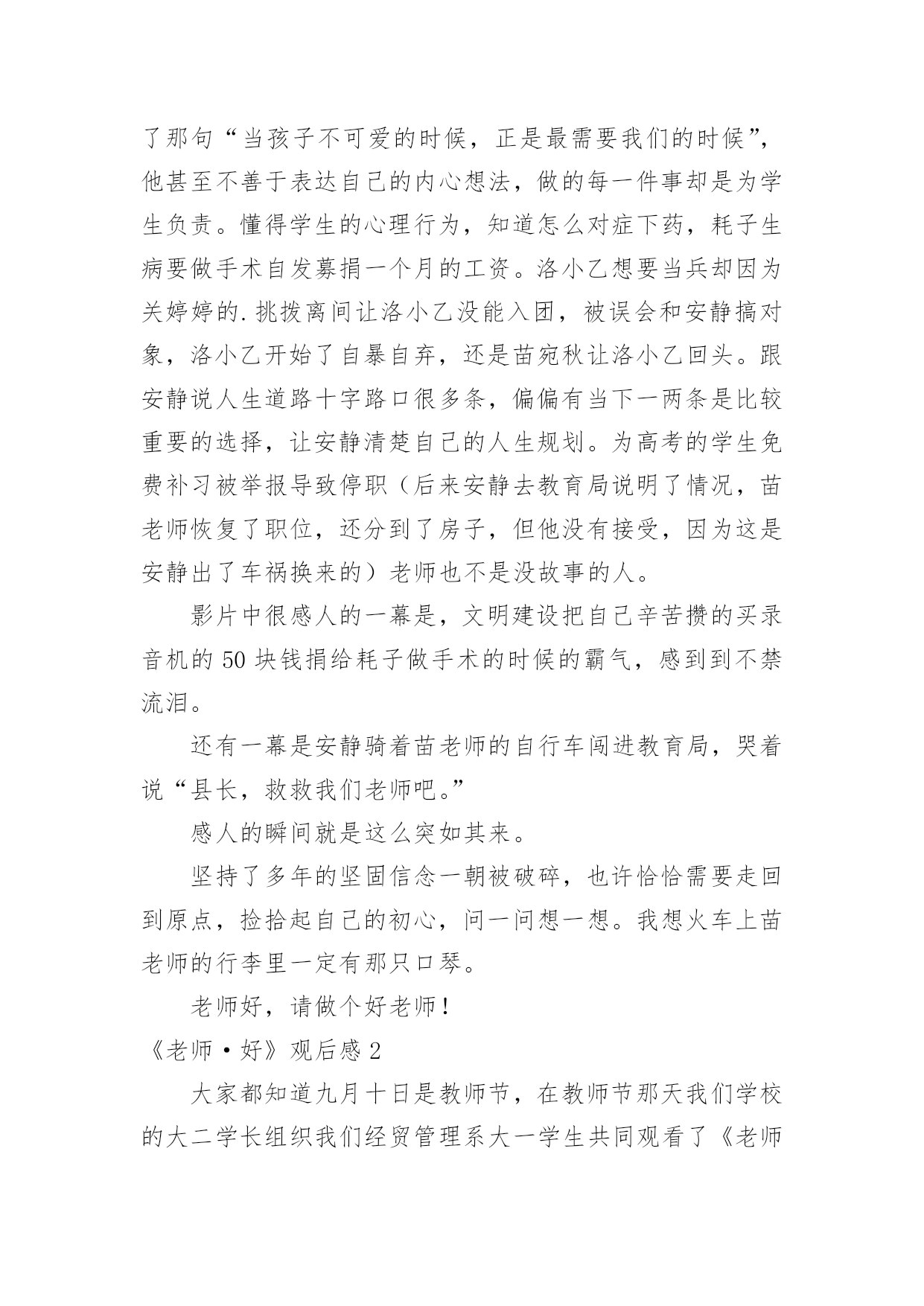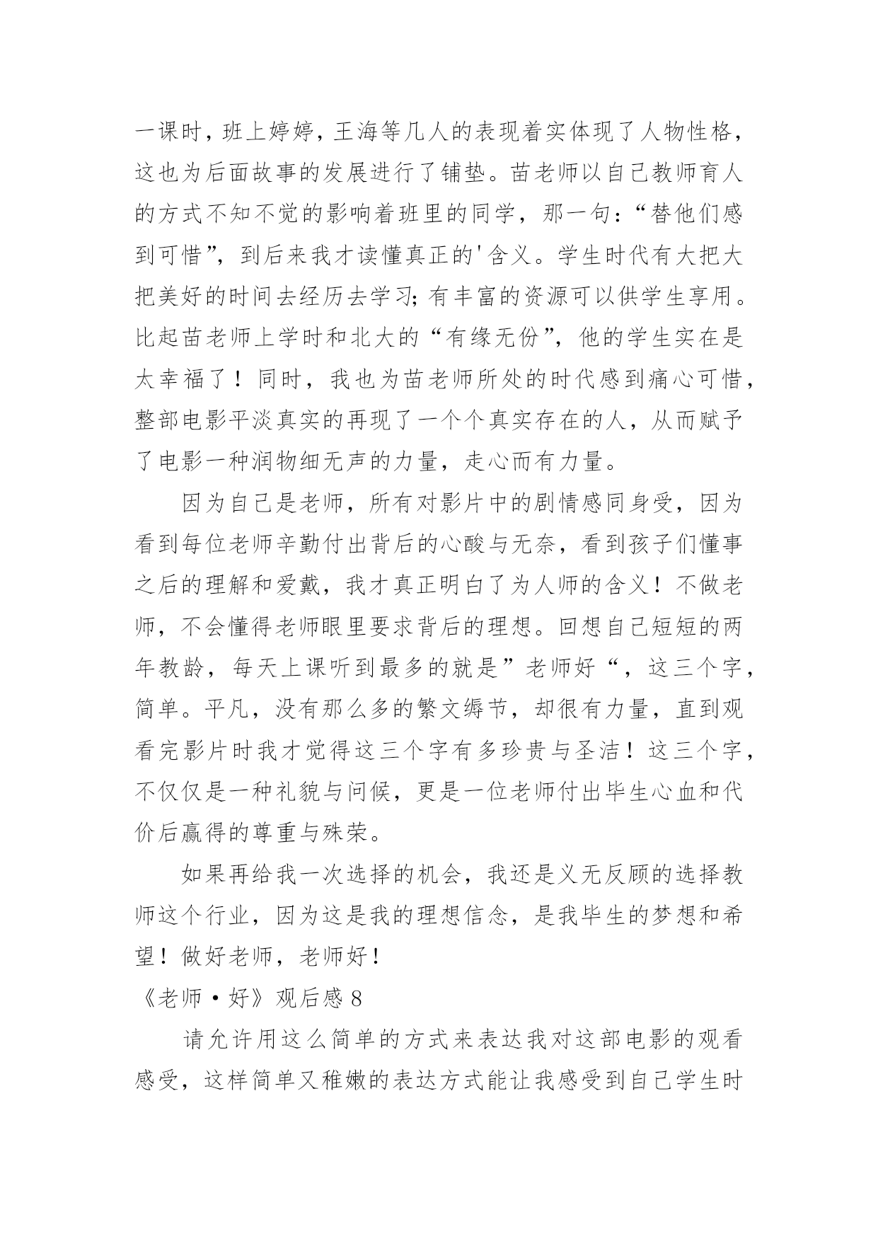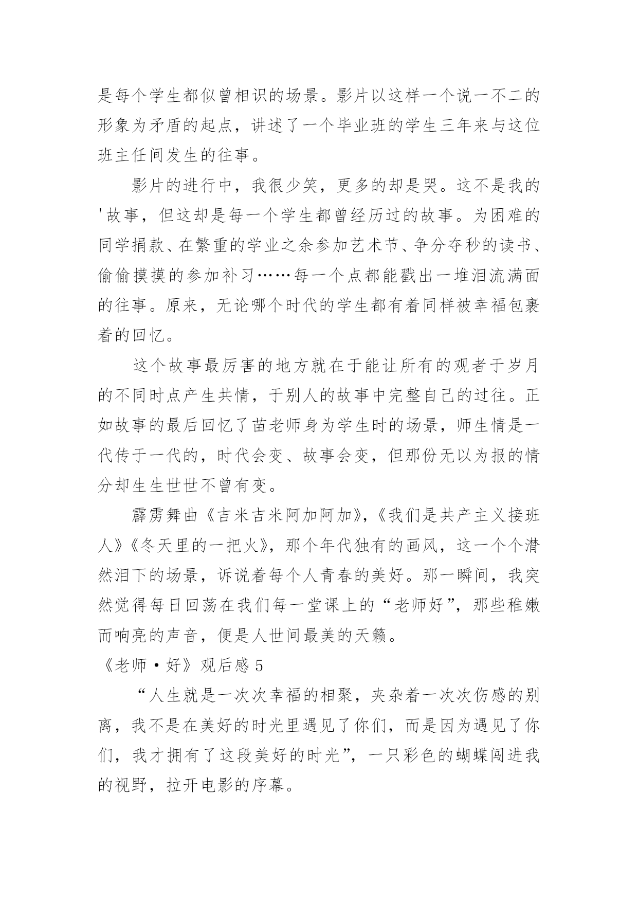 《老师·好》观后感《老师·好》观后感认真品味一部作品后,一定有不少感悟吧,现在就让我们写一篇走心的观后感吧。那么你真的懂得怎么写观后感吗?以下是小编为大家整理的《老师·好》观后感,欢迎大家分享。《老师·好》观后感1《老师·好》这部影片很早就听说了,只是才有时间看。每个生命最天然的声音都是想做自己,如果生命里的这个声音在恰当的时候遇到了些微回应,那真是一件很幸运的事。影片《老师·好》带我们来到了1985年的南宿一中高中三班,一个十八线的小地方,八十年代是个神奇的年代,改革开放、万物复苏,重获生命力的人们开始体验成长带来的惊喜和碰撞,这其中尤以孩子们为代表。一开始时候觉得苗宛秋(于谦饰演)也不过是普通的一个喜欢品学兼优听话的学生的老师,对“坏”学生总是戴着有色眼镜,什么犯错误的时候不分青红皂白就责骂。甚至以为的民主评选班长也只向着好学生。这一瞬间会让我觉得,这个老师其实也不过如此。后面发现,其实苗宛秋也是刀子嘴豆腐心吧,分明印证了那句“当孩子不可爱的时候,正是最需要我们的时候”,他甚至不善于表达自己的内心想法,做的每一件事却是为学生负责。懂得学生的心理行为,知道怎么对症下药,耗子生病要做手术自发募捐一个月的工资。洛小乙想要当兵却因为关婷婷的.挑拨离间让洛小乙没能入团,被误会和安静搞对象,洛小乙开始了自暴自弃,还是苗宛秋让洛小乙回头。跟安静说人生道路十字路口很多条,偏偏有当下一两条是比较重要的选择,让安静清楚自己的人生规划。为高考的学生免费补习被举报导致停职(后来安静去教育局说明了情况,苗老师恢复了职位,还分到了房子,但他没有接受,因为这是安静出了车祸换来的)老师也不是没故事的人。影片中很感人的一幕是,文明建设把自己辛苦攒的买录音机的50块钱捐给耗子做手术的时候的霸气,感到到不禁流泪。还有一幕是安静骑着苗老师的自行车闯进教育局,哭着说“县长,救救我们老师吧。”感人的瞬间就是这么突如其来。坚持了多年的坚固信念一朝被破碎,也许恰恰需要走回到原点,捡拾起自己的初心,问一问想一想。我想火车上苗老师的行李里一定有那只口琴。老师好,请做个好老师!《老师·好》观后感2大家都知道九月十日是教师节,在教师节那天我们学校的大二学长组织我们经贸管理系大一学生共同观看了《老师好》这部影片。电影讲述了八十年代中叶高中时期的学生,看完这部影片使我感触极深,非常感动。有人说老师是蜡烛,“蜡炬成灰泪始干”这不就是来形容老师的吗?老师给我们引路,让我们走上成功路,只要我们成功了,他就会觉得很欣慰,很开心。在这部影片中,讲述了老师苗宛秋和同学们一起“斗智斗勇”的校园青春故事,在课堂上苗老师正颜厉色,但是在私下却展现了对同学们慈祥,和蔼的一面。《老师好》的整体叙事并没有禁锢在爱情的界面,只是一瞬,让我们更觉得高中时代的真实感,在整个影片中,都描写了老师与学生之间的琐碎事情,展开了故事。同时,影片中呈现许多生活中真实存在的典型人物,桀骜不驯的洛小乙、人如其名的安静、新潮前卫的关婷婷、大智若愚的脑袋、舞痴兄弟文明建设、爱八卦的海燕、奸商耗子……这些人物深深的`印在我的脑海里让我记忆深刻。最后虽然安静出了车祸,让我感到难受,但是苗老师恢复了职位还是很让人开心的。让我最感动的还是苗老师说的那番话,高中三年不能颓废,我们已经玩了三年了,来到这所大学,我们难道还要继续颓废下去吗?在这里我一定要努力加油,不在颓废下去了。“人生,就是一次次幸福的相聚,夹杂着一次次伤感的别离,我不是在最好的时光中遇见了你们。而是遇见了你们,才给了我这段最好的时光。”这段话让我很感动,让我想起了我们的老师,也想起了曾经和老师、同学们美好的时光。一支粉笔两袖清风三尺讲台谱写生命乐章,四季耕耘无微不至留名青史铸就中华辉煌。愿我们的老师以后健健康康,永远快乐。《老师·好》观后感3周六,我和爸爸妈妈一起看了由于谦主演的电影《老师好》。电影主要讲述了苗老师与他高中的学生三年发生的故事。开学第一天,苗老师就把学生们收拾了一顿,他把一个人的口红折断,把抽烟的人拎起来一顿大骂,还不让人家烫头发,更把一本包着语文书封皮的小说没收了。为此,同学们恨透了苗老师,给他取名“苗霸天”,他们还“残害”了苗老师的`新自行车:先把挡泥板拆了,又刮掉了自行车表面的油漆,最后还把车挂在路灯上;还有一个同学把老师杯子上的“奖”刮成“大”字;还有洛小乙和一群不良少年差点把苗老师打了……高一就这样过去了。高二的一天,刘昊同学突然得了脑瘤,但是家里没钱,只好四处卖东西。苗老师知道了这件事,偷偷将自己一个月的工资全部捐给了刘昊。此后,苗老师还帮助出车祸的安静同学进医院及时治疗……同学们事后了解到了这些,逐渐对苗老师有了好感。高三终于来临了!在艺术节上,同学们为了给苗老师争气,拼命练习跳舞,在表演中惊艳全场,摘得桂冠。苗老师十分开心,把同学们请到家