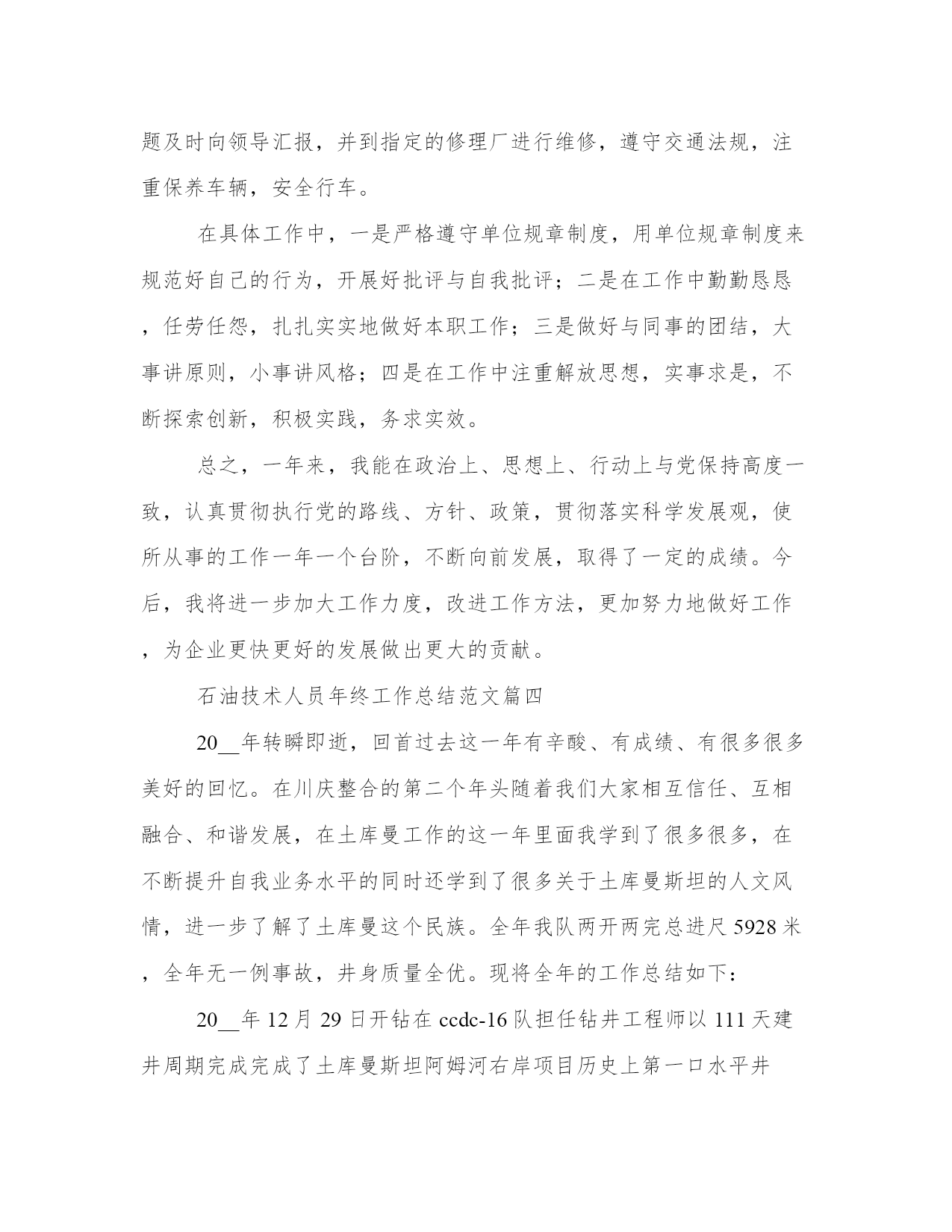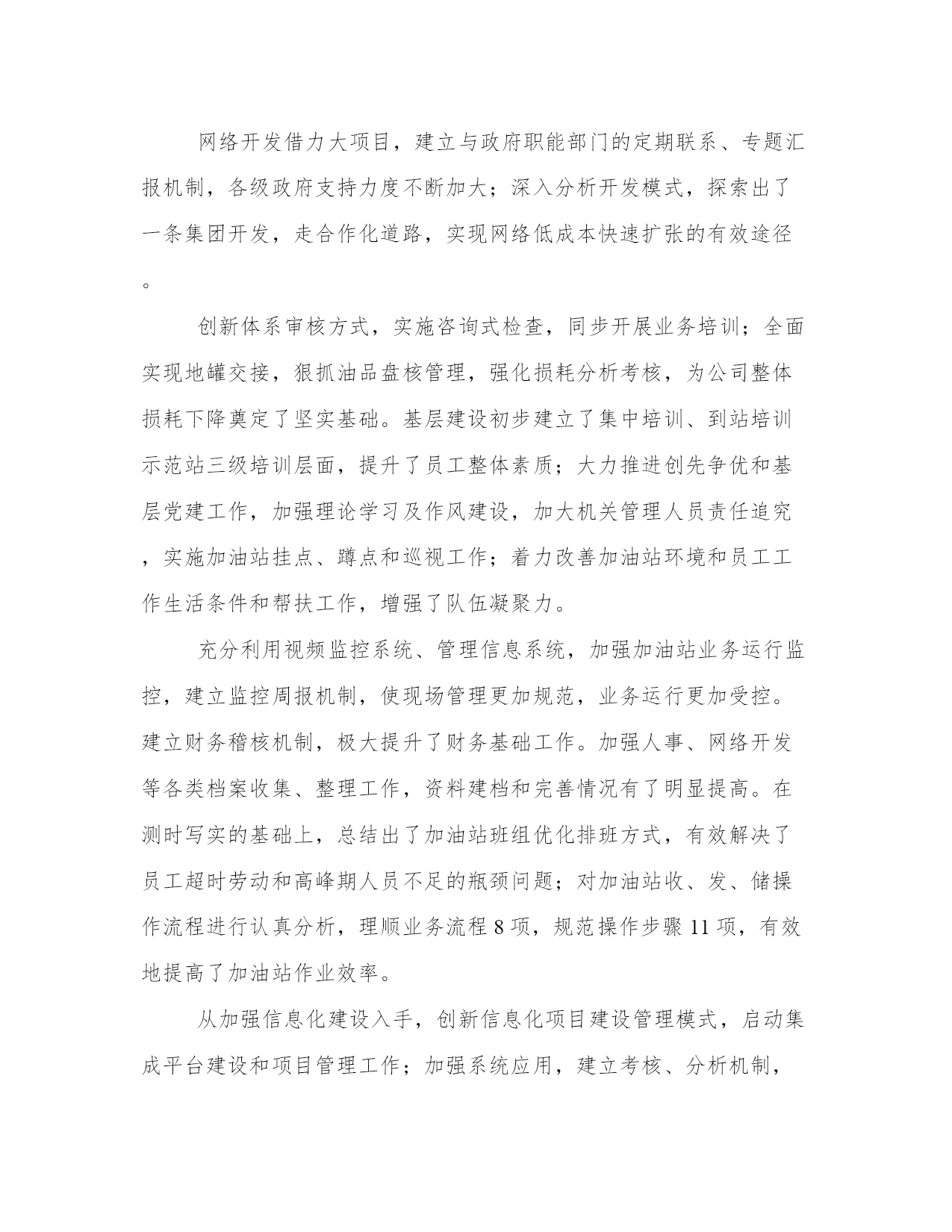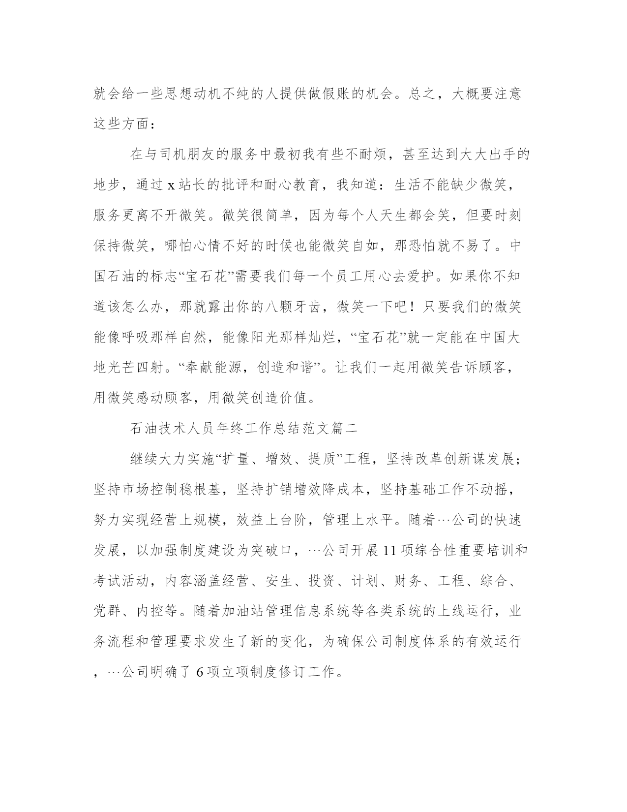 2024年石油技术人员年终工作总结范文(4篇)当工作或学习进行到一定阶段或告一段落时,需要回过头来对所做的工作认真地分析分析一下,肯定成绩,找出问题,归纳出经验教训,提高认识,明确方向,以便进一步做好工作,并把这些用文字表述出来,就叫做总结。怎样写总结才更能起到其作用呢?总结应该怎么写呢?下面是小编整理的个人今后的总结范文,欢迎阅读分享,希望对大家有所帮助。石油技术人员年终工作总结范文篇一大连加油站是一个中等规模的加油站。该站的主要成员有:站长,计量员,核算员,安全员和四名加油员。加油站的组建也相当简单。核心的部分由四大块组成:第一大块是加油区,第二大块是油罐区,第三大块是办公大厅。第四大块就是工作人员餐厅。在未上岗前的培训,了解到了有关中国石油企业各方面的知识。中国石油就是中国石油天然气股份有限公司,是国内销售额最大的企业之一。它与中国石化是两个独立的企业,不能混为一谈。在排名中,中国石油跻身于世界500强企业之前列,排名第52位,而中国石化排名63位。中国石油是xx年北京奥运会的合作伙伴,该企业的宗旨是“奉献能源,创造和谐”;企业精神:爱国,创业,求实,奉献。中国石油的经营核心管理理念:诚信,创新,业绩,和谐,安全。中国石油加油站服务宗旨:为客户提供全员,全面,全过程,全心全意地服务。加油站的服务承诺;质量达标,计量准确,环境整洁,健康安全,方便快捷。来到大连加油站加油站里工作,x站长和x班长,安全员吴x强调最多的就是安全问题。加油区的四根大柱上都贴着各种标语:“不准吸烟”,“不准打手机”,“熄火加油”等。意在提醒进入加油站的每一个人员安全第一。这些安全的教育算是来到加油站后所上的第一堂“通识教育课”吧。在加油站工作,首先就必须学会加油。规范的加油操作被称为“加油十三步曲”。工作的第1天,x站长就派了x班长来教我。她先给我们示范,时不时给我们纠正错误。我也学得不亦乐乎。所谓加油十三步曲:第一步,站立迎候。第二步,指引车辆。第三步,开启车门。第四步,微笑招呼。第五步,热情询问。第六部,开启油箱。第七步,归零预置。第八步,提枪加油。第九部,收枪复位。第十步,简易擦车。第十一步,提示付款。第十二步,礼貌送行。第十三步,盘整清洁。我要把这十三步的每一个动作做到位,做规范确实不是一件容易的事,也犯了一些错误:如加冒油,但最大的是一时疏忽被司机把加油机的计量器打碎幸运的是没有伤到人,没有造成重大事故,此事通过x站长的处理与司机的耐心交涉以基本解决!在这里我非常感谢她,我们尊敬的x站长!在加油站里工作的第二事就是开发票。据我自己所体验到的,开发票就是要细心,特别是一些微小的地方,一定要注意到。稍不小心就会给一些思想动机不纯的人提供做假账的机会。总之,大概要注意这些方面:在与司机朋友的服务中最初我有些不耐烦,甚至达到大大出手的地步,通过x站长的批评和耐心教育,我知道:生活不能缺少微笑,服务更离不开微笑。微笑很简单,因为每个人天生都会笑,但要时刻保持微笑,哪怕心情不好的时候也能微笑自如,那恐怕就不易了。中国石油的标志“宝石花”需要我们每一个员工用心去爱护。如果你不知道该怎么办,那就露出你的八颗牙齿,微笑一下吧!只要我们的微笑能像呼吸那样自然,能像阳光那样灿烂,“宝石花”就一定能在中国大地光芒四射。“奉献能源,创造和谐”。让我们一起用微笑告诉顾客,用微笑感动顾客,用微笑创造价值。石油技术人员年终工作总结范文篇二继续大力实施“扩量、增效、提质”工程,坚持改革创新谋发展;坚持市场控制稳根基,坚持扩销增效降成本,坚持基础工作不动摇,努力实现经营上规模,效益上台阶,管理上水平。随着···公司的快速发展,以加强制度建设为突破口,···公司开展11项综合性重要培训和考试活动,内容涵盖经营、安生、投资、计划、财务、工程、综合、党群、内控等。随着加油站管理信息系统等各类系统的上线运行,业务流程和管理要求发生了新的变化,为确保公司制度体系的有效运行,···公司明确了6项立项制度修订工作。制度的关键在于执行。制度发布后,···公司通过到站培训、集中考试等多种形式加强对各项规章制度的宣贯工作,加强各级人员对制度内容的理解和掌握。按照重点突出、管控到位、注重效果的原则,持续改进精细化管理大检查工作,不断完善检查形式、内容、方法和手段,改进检查程序;加大对制度执行情况的检查督促力度,及时发现制度的设计问题、所属各单位执行情况等,通过不断完善制度执行过程中存在问题的信息反馈、收集,持续推进制度建设工作。对不严格执行制度流程、出现违规违纪问题的单位和个人严肃责任追究,切实维护制度的严肃性和权威性,强化广大干部员工的制度执行意识,确保各项业务规范、高效、受控运行,切实增强了管控能力。始终坚持向市场要效益、向管理要效益的思路,继续按照“····”的具