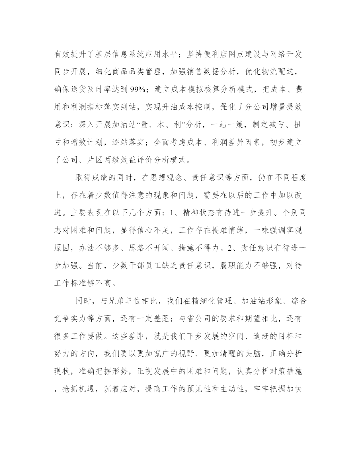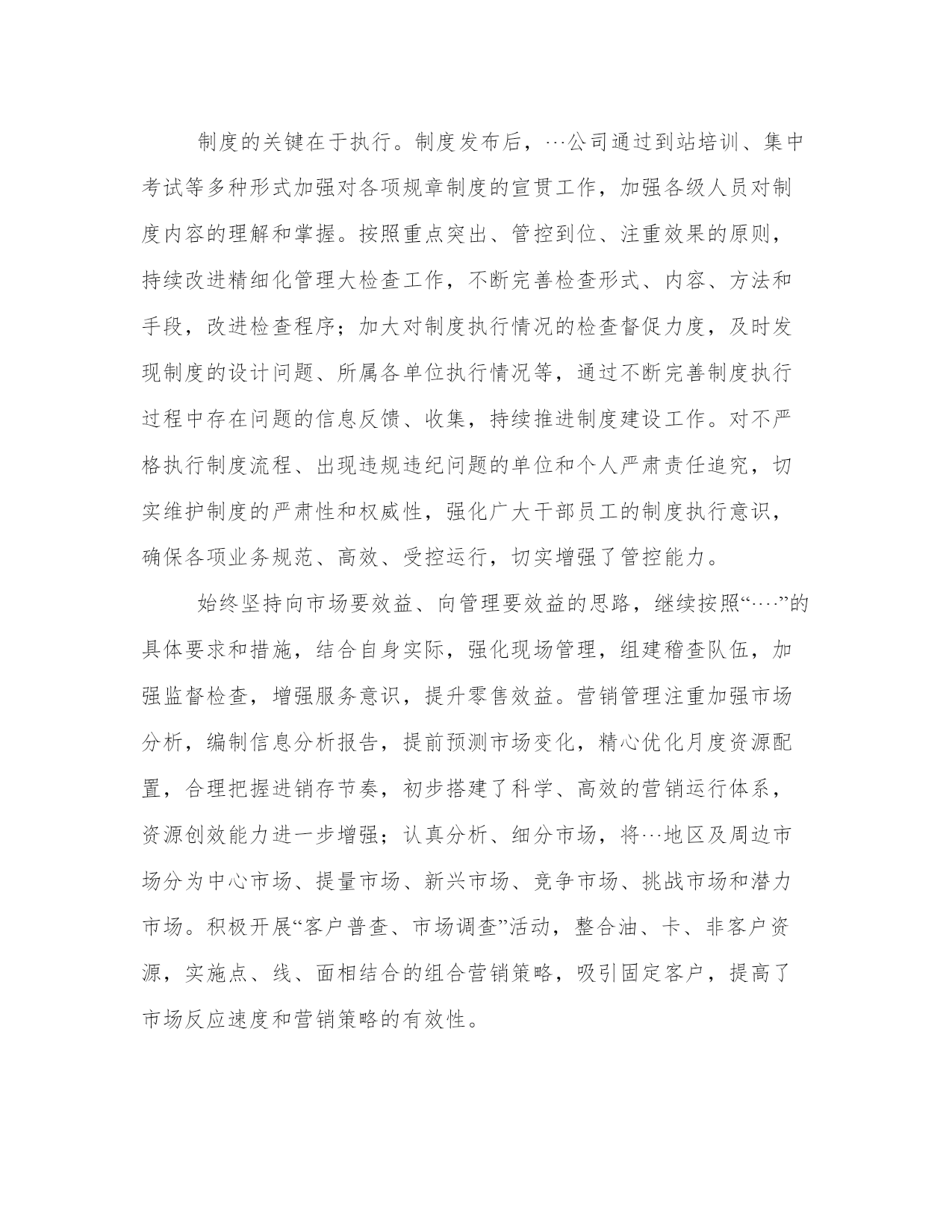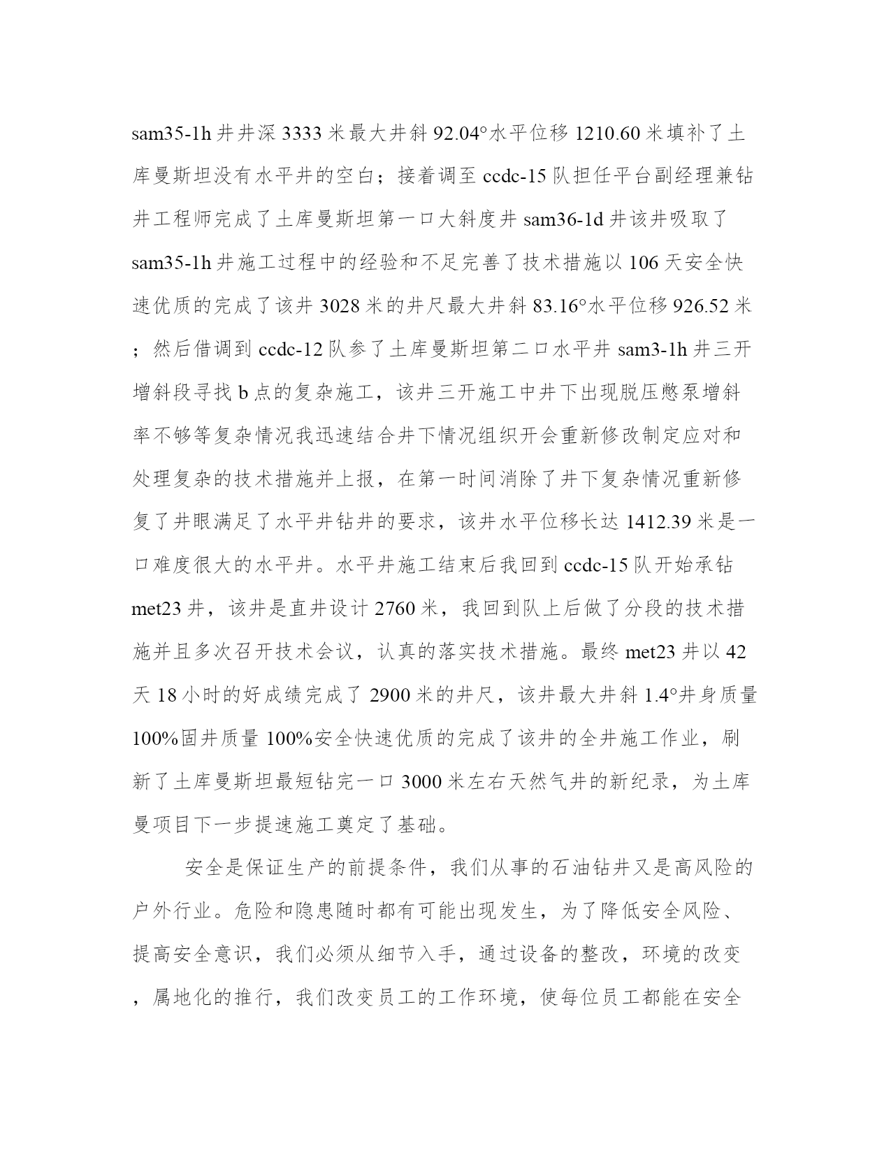 2024年石油技术人员年终工作总结范文(4篇)当工作或学习进行到一定阶段或告一段落时,需要回过头来对所做的工作认真地分析分析一下,肯定成绩,找出问题,归纳出经验教训,提高认识,明确方向,以便进一步做好工作,并把这些用文字表述出来,就叫做总结。怎样写总结才更能起到其作用呢?总结应该怎么写呢?下面是小编整理的个人今后的总结范文,欢迎阅读分享,希望对大家有所帮助。石油技术人员年终工作总结范文篇一大连加油站是一个中等规模的加油站。该站的主要成员有:站长,计量员,核算员,安全员和四名加油员。加油站的组建也相当简单。核心的部分由四大块组成:第一大块是加油区,第二大块是油罐区,第三大块是办公大厅。第四大块就是工作人员餐厅。在未上岗前的培训,了解到了有关中国石油企业各方面的知识。中国石油就是中国石油天然气股份有限公司,是国内销售额最大的企业之一。它与中国石化是两个独立的企业,不能混为一谈。在排名中,中国石油跻身于世界500强企业之前列,排名第52位,而中国石化排名63位。中国石油是xx年北京奥运会的合作伙伴,该企业的宗旨是“奉献能源,创造和谐”;企业精神:爱国,创业,求实,奉献。中国石油的经营核心管理理念:诚信,创新,业绩,和谐,安全。中国石油加油站服务宗旨:为客户提供全员,全面,全过程,全心全意地服务。加油站的服务承诺;质量达标,计量准确,环境整洁,健康安全,方便快捷。来到大连加油站加油站里工作,x站长和x班长,安全员吴x强调最多的就是安全问题。加油区的四根大柱上都贴着各种标语:“不准吸烟”,“不准打手机”,“熄火加油”等。意在提醒进入加油站的每一个人员安全第一。这些安全的教育算是来到加油站后所上的第一堂“通识教育课”吧。在加油站工作,首先就必须学会加油。规范的加油操作被称为“加油十三步曲”。工作的第1天,x站长就派了x班长来教我。她先给我们示范,时不时给我们纠正错误。我也学得不亦乐乎。所谓加油十三步曲:第一步,站立迎候。第二步,指引车辆。第三步,开启车门。第四步,微笑招呼。第五步,热情询问。第六部,开启油箱。第七步,归零预置。第八步,提枪加油。第九部,收枪复位。第十步,简易擦车。第十一步,提示付款。第十二步,礼貌送行。第十三步,盘整清洁。我要把这十三步的每一个动作做到位,做规范确实不是一件容易的事,也犯了一些错误:如加冒油,但最大的是一时疏忽被司机把加油机的计量器打碎幸运的是没有伤到人,没有造成重大事故,此事通过x站长的处理与司机的耐心交涉以基本解决!在这里我非常感谢她,我们尊敬的x站长!在加油站里工作的第二事就是开发票。据我自己所体验到的,开发票就是要细心,特别是一些微小的地方,一定要注意到。稍不小心就会给一些思想动机不纯的人提供做假账的机会。总之,大概要注意这些方面:在与司机朋友的服务中最初我有些不耐烦,甚至达到大大出手的地步,通过x站长的批评和耐心教育,我知道:生活不能缺少微笑,服务更离不开微笑。微笑很简单,因为每个人天生都会笑,但要时刻保持微笑,哪怕心情不好的时候也能微笑自如,那恐怕就不易了。中国石油的标志“宝石花”需要我们每一个员工用心去爱护。如果你不知道该怎么办,那就露出你的八颗牙齿,微笑一下吧!只要我们的微笑能像呼吸那样自然,能像阳光那样灿烂,“宝石花”就一定能在中国大地光芒四射。“奉献能源,创造和谐”。让我们一起用微笑告诉顾客,用微笑感动顾客,用微笑创造价值。石油技术人员年终工作总结范文篇二继续大力实施“扩量、增效、提质”工程,坚持改革创新谋发展;坚持市场控制稳根基,坚持扩销增效降成本,坚持基础工作不动摇,努力实现经营上规模,效益上台阶,管理上水平。随着···公司的快速发展,以加强制度建设为突破口,···公司开展11项综合性重要培训和考试活动,内容涵盖经营、安生、投资、计划、财务、工程、综合、党群、内控等。随着加油站管理信息系统等各类系统的上线运行,业务流程和管理要求发生了新的变化,为确保公司制度体系的有效运行,···公司明确了6项立项制度修订工作。制度的关键在于执行。制度发布后,···公司通过到站培训、集中考试等多种形式加强对各项规章制度的宣贯工作,加强各级人员对制度内容的理解和掌握。按照重点突出、管控到位、注重效果的原则,持续改进精细化管理大检查工作,不断完善检查形式、内容、方法和手段,改进检查程序;加大对制度执行情况的检查督促力度,及时发现制度的设计问题、所属各单位执行情况等,通过不断完善制度执行过程中存在问题的信息反馈、收集,持续推进制度建设工作。对不严格执行制度流程、出现违规违纪问题的单位和个人严肃责任追究,切实维护制度的严肃性和权威性,强化广大干部员工的制度执行意识,确保各项业务规范、高效、受控运行,切实增强了管控能力。始终坚持向市场要效益、向管理要效益的思路,继续按照“····”的具