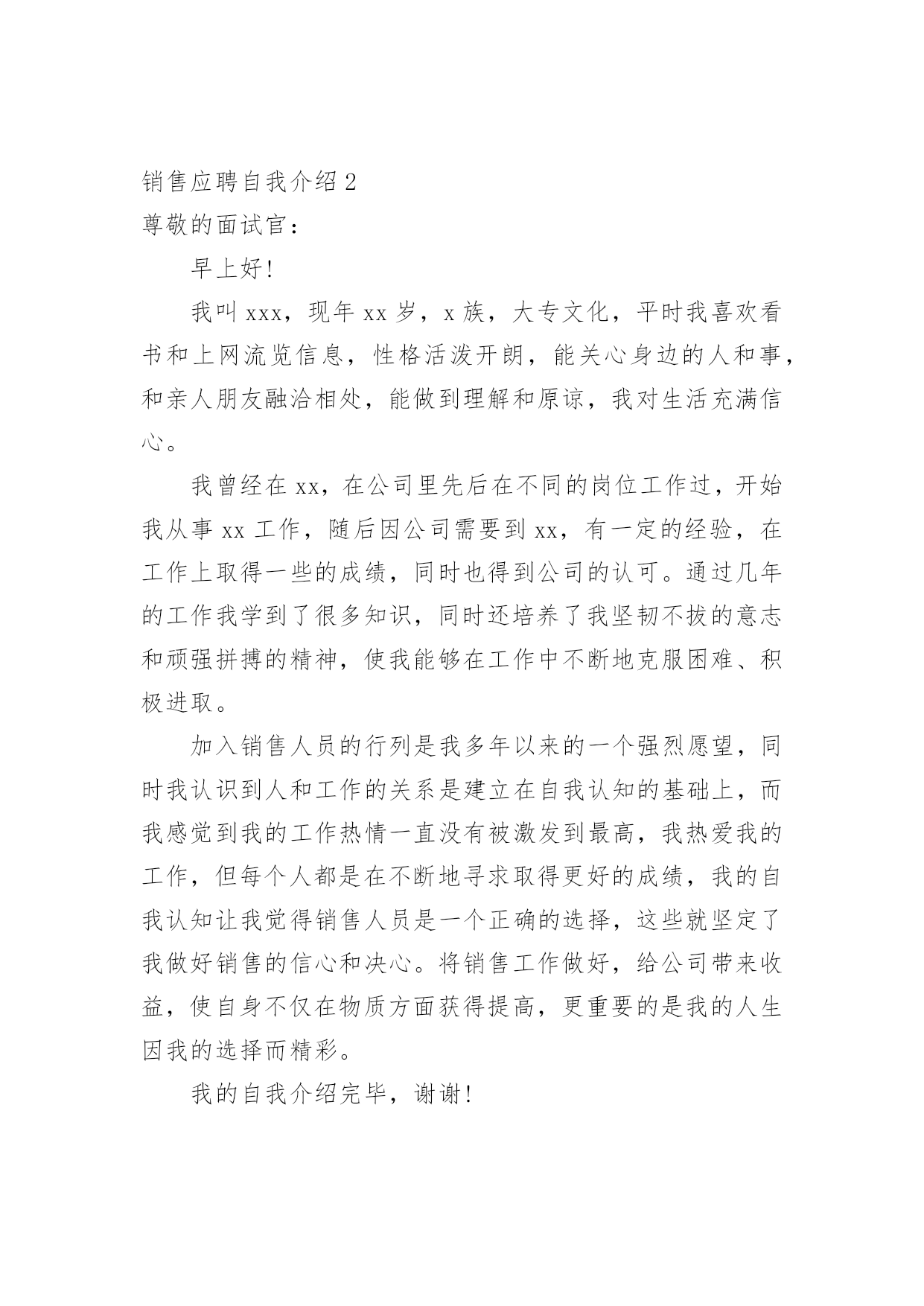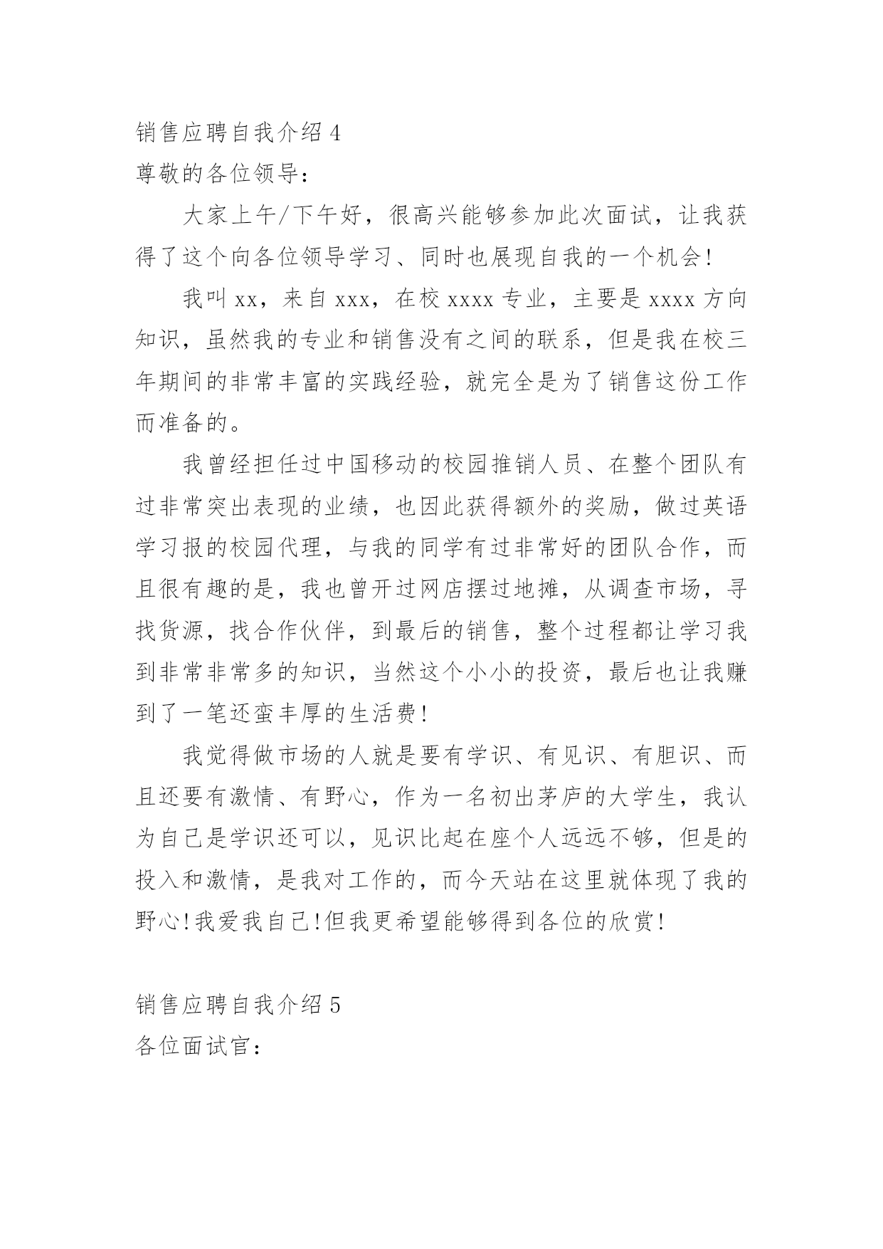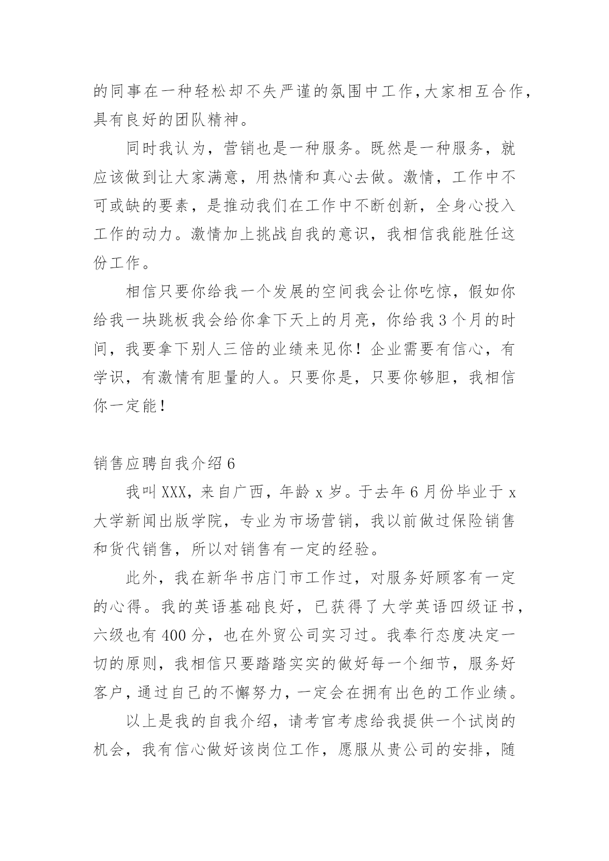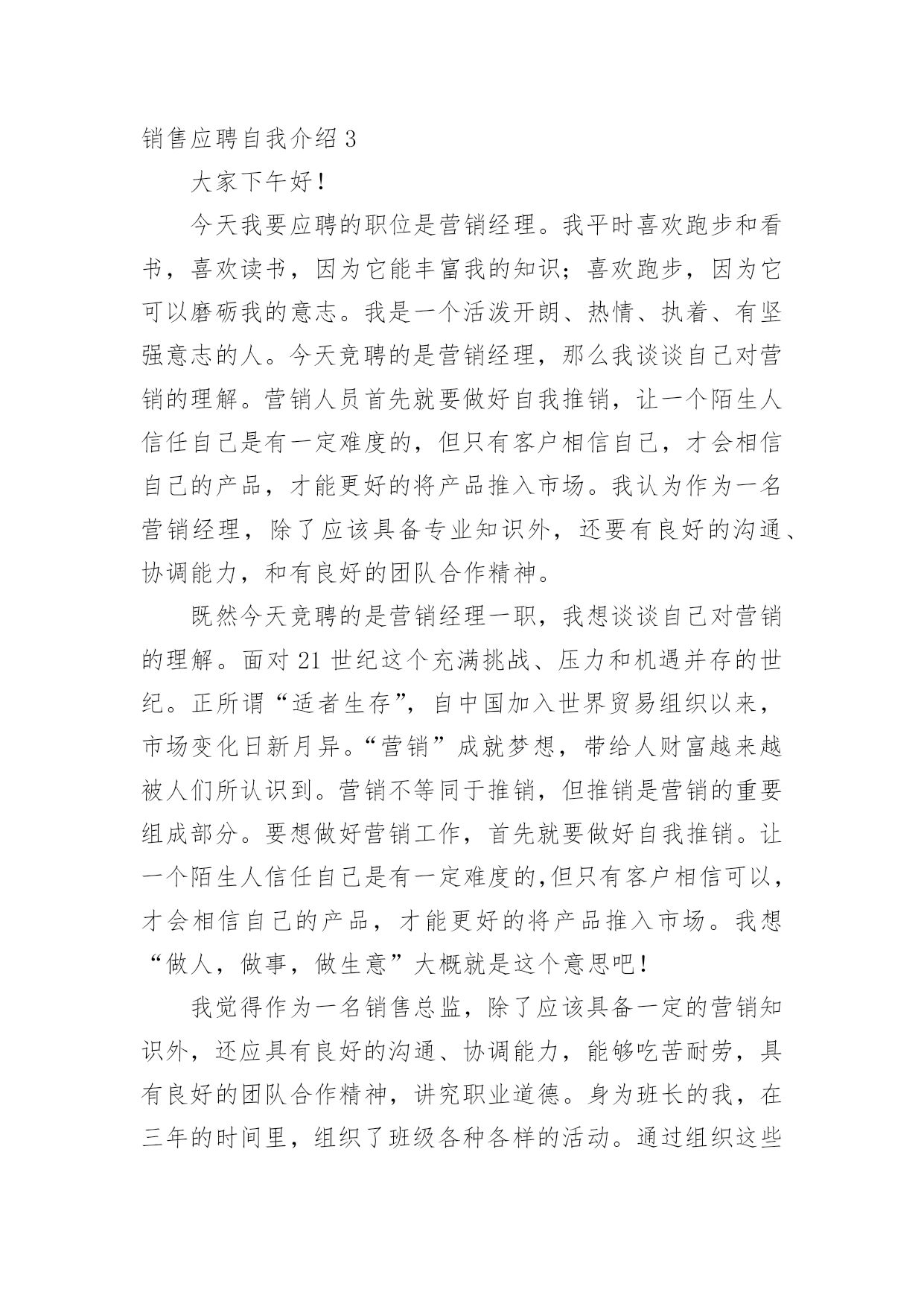 销售应聘自我介绍当换了一个新环境后,时常要进行自我介绍,用自我介绍往往可以让他人有一定的了解。相信大家又在为写自我介绍犯愁了吧!以下是小编为大家整理的销售应聘自我介绍,仅供参考,大家一起来看看吧。销售应聘自我介绍1各位考官大家好,非常高兴能站在这里参加这次面试,能过的这样的机会我感到非常荣幸!我叫XXX毕业于X***x某某专业,三年的心理学学习,教会了我很多专业知识,也让我长大的许多,对于这几年的专业学习,我感到了非常充实,也掌握了大量的专业知识,理论与实践的结合让我在还未走出校园的那一刻就对这一天充满了期待。我一直相信一句话,那就是付出就有回报,学习中如此,生活中也如此,我相信外向的我可以更自信的对待明天,可以更踏实的对待我的工作,泰山不让土壤故能成其大,河海不择细流故能就起深,不积跬步无以至千里,我现在就要从小事做起,从头开始,我深深地明白只有今天勤劳踏实的工作,才能成就更美好的未来,这就是我,一个刚刚走出校门的学生对于工作的看法,这就是我一个不怕吃苦的青年在工作前所有的决心,说的好不如做的好,给我一次机会,我一定不会让大家失望,谢谢!销售应聘自我介绍2尊敬的面试官:早上好!我叫xxx,现年xx岁,x族,大专文化,平时我喜欢看书和上网流览信息,性格活泼开朗,能关心身边的人和事,和亲人朋友融洽相处,能做到理解和原谅,我对生活充满信心。我曾经在xx,在公司里先后在不同的岗位工作过,开始我从事xx工作,随后因公司需要到xx,有一定的经验,在工作上取得一些的成绩,同时也得到公司的认可。通过几年的工作我学到了很多知识,同时还培养了我坚韧不拔的意志和顽强拼搏的精神,使我能够在工作中不断地克服困难、积极进取。加入销售人员的行列是我多年以来的一个强烈愿望,同时我认识到人和工作的关系是建立在自我认知的基础上,而我感觉到我的工作热情一直没有被激发到最高,我热爱我的工作,但每个人都是在不断地寻求取得更好的成绩,我的自我认知让我觉得销售人员是一个正确的选择,这些就坚定了我做好销售的信心和决心。将销售工作做好,给公司带来收益,使自身不仅在物质方面获得提高,更重要的是我的人生因我的选择而精彩。我的自我介绍完毕,谢谢!销售应聘自我介绍3大家下午好!今天我要应聘的职位是营销经理。我平时喜欢跑步和看书,喜欢读书,因为它能丰富我的知识;喜欢跑步,因为它可以磨砺我的意志。我是一个活泼开朗、热情、执着、有坚强意志的人。今天竞聘的是营销经理,那么我谈谈自己对营销的理解。营销人员首先就要做好自我推销,让一个陌生人信任自己是有一定难度的,但只有客户相信自己,才会相信自己的产品,才能更好的将产品推入市场。我认为作为一名营销经理,除了应该具备专业知识外,还要有良好的沟通、协调能力,和有良好的团队合作精神。既然今天竞聘的是营销经理一职,我想谈谈自己对营销的理解。面对21世纪这个充满挑战、压力和机遇并存的世纪。正所谓“适者生存”,自中国加入世界贸易组织以来,市场变化日新月异。“营销”成就梦想,带给人财富越来越被人们所认识到。营销不等同于推销,但推销是营销的重要组成部分。要想做好营销工作,首先就要做好自我推销。让一个陌生人信任自己是有一定难度的,但只有客户相信可以,才会相信自己的产品,才能更好的将产品推入市场。我想“做人,做事,做生意”大概就是这个意思吧!我觉得作为一名销售总监,除了应该具备一定的营销知识外,还应具有良好的沟通、协调能力,能够吃苦耐劳,具有良好的团队合作精神,讲究职业道德。身为班长的我,在三年的时间里,组织了班级各种各样的活动。通过组织这些活动,提高了自己的组织协调能力,加强了团队合作意识。同时也让我充分认识到,个人的能力毕竟很有限,只有通过团队合作,集思广益,取长补短,才能更好的完成工作。如果这次我有幸竞聘上营销经理,我想打造一个平台,让自己的同事在一种轻松却不失严谨的氛围中工作,大家相互合作,具有良好的团队精神。同时我认为营销也是一种服务。既然是一种服务,就应该做到让大家满意,用热情和真心去做。激情,工作中不可或缺的要素,是推动我们在工作中不断创新,全身心投入工作的动力。激情加上挑战自我的意识,我相信我能胜任这份工作。身为班长的我,在大学三年的时间里,组织了班级各种各样的活动。通过组织这些活动,提高了自己的组织协调能力,加强了团队合作意识。同时也让我充分认识到,个人的能力毕竟很有限,只有通过团队合作,集思广益,取长补短,才能更好的完成工作。如果我有幸竞聘上营销经理,我想打造一个高效率的团队,什么是一个团队呢?团队就是不要让另外一个人失败,不要让团队任何一个人失败。同时我认为,营销也是一种服务,应该做到让客户满意,需要热情和专注。激情,工作中不可或缺的要素,是推动我们在工作中不断创新,全身心投入工作的动力。激情加上挑战自我的意识,我相信我能胜任这份工作。销