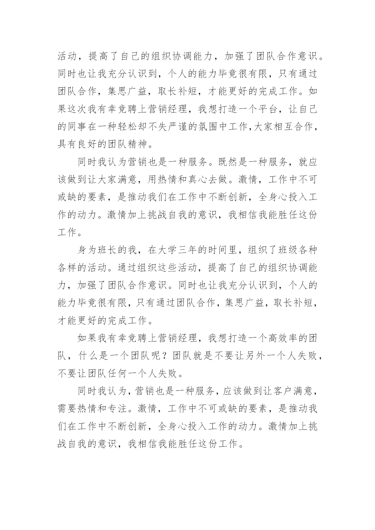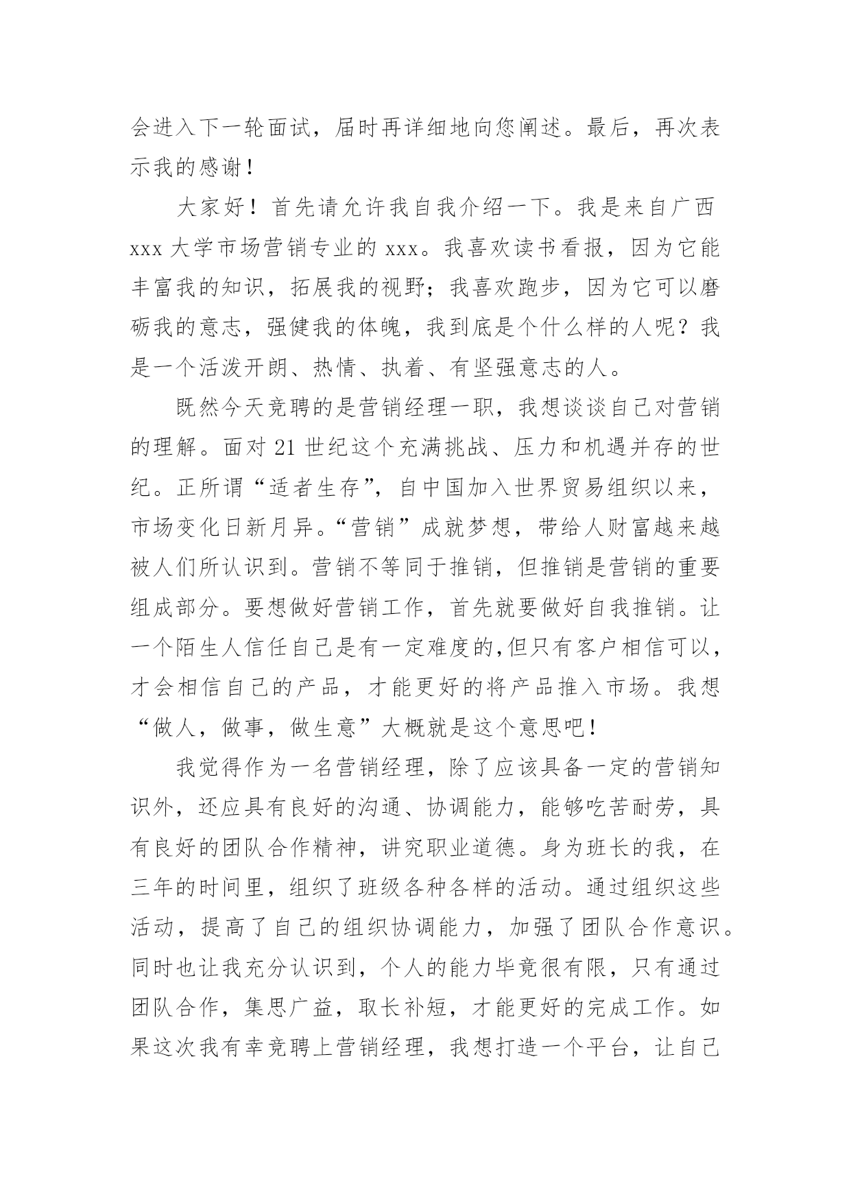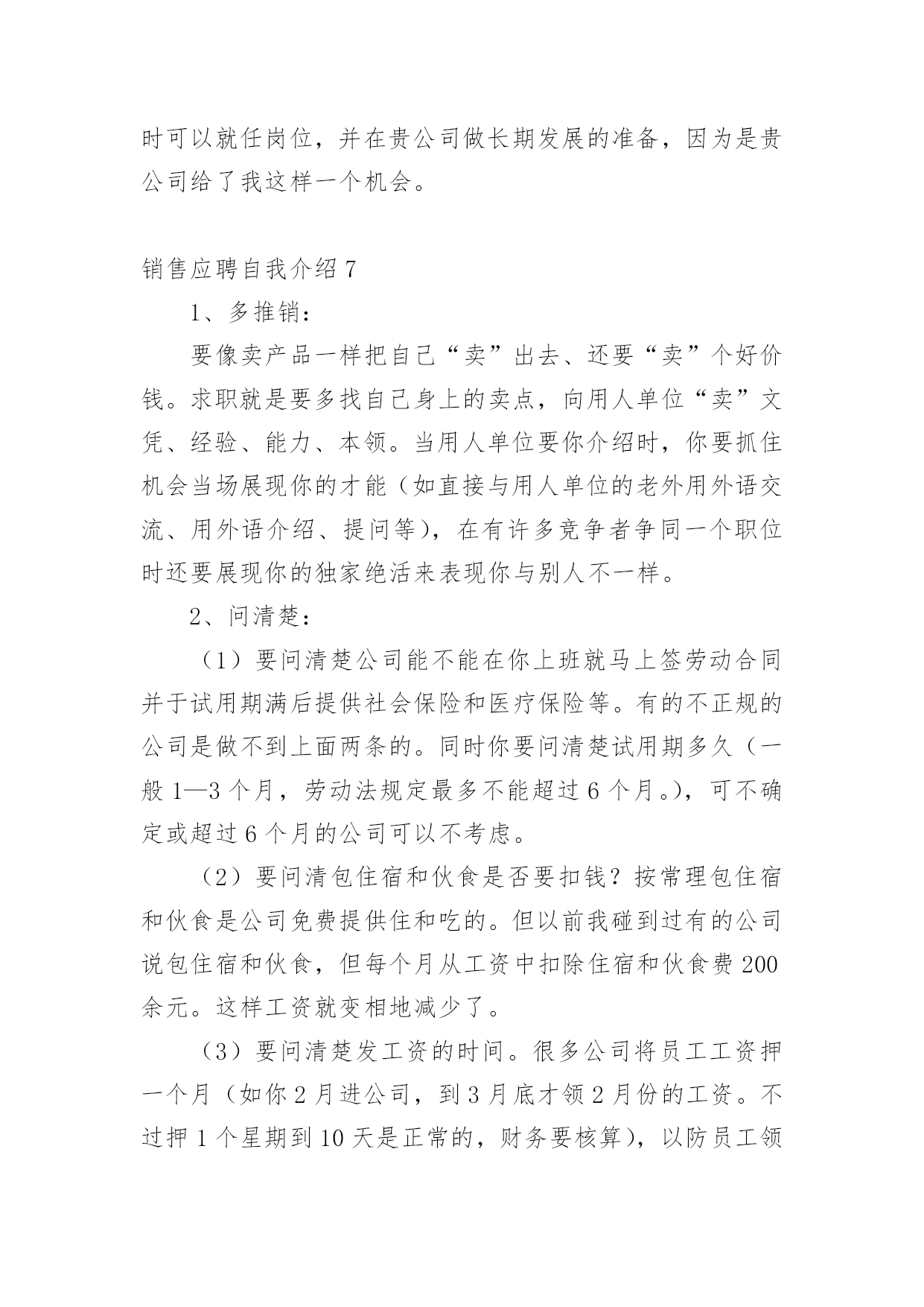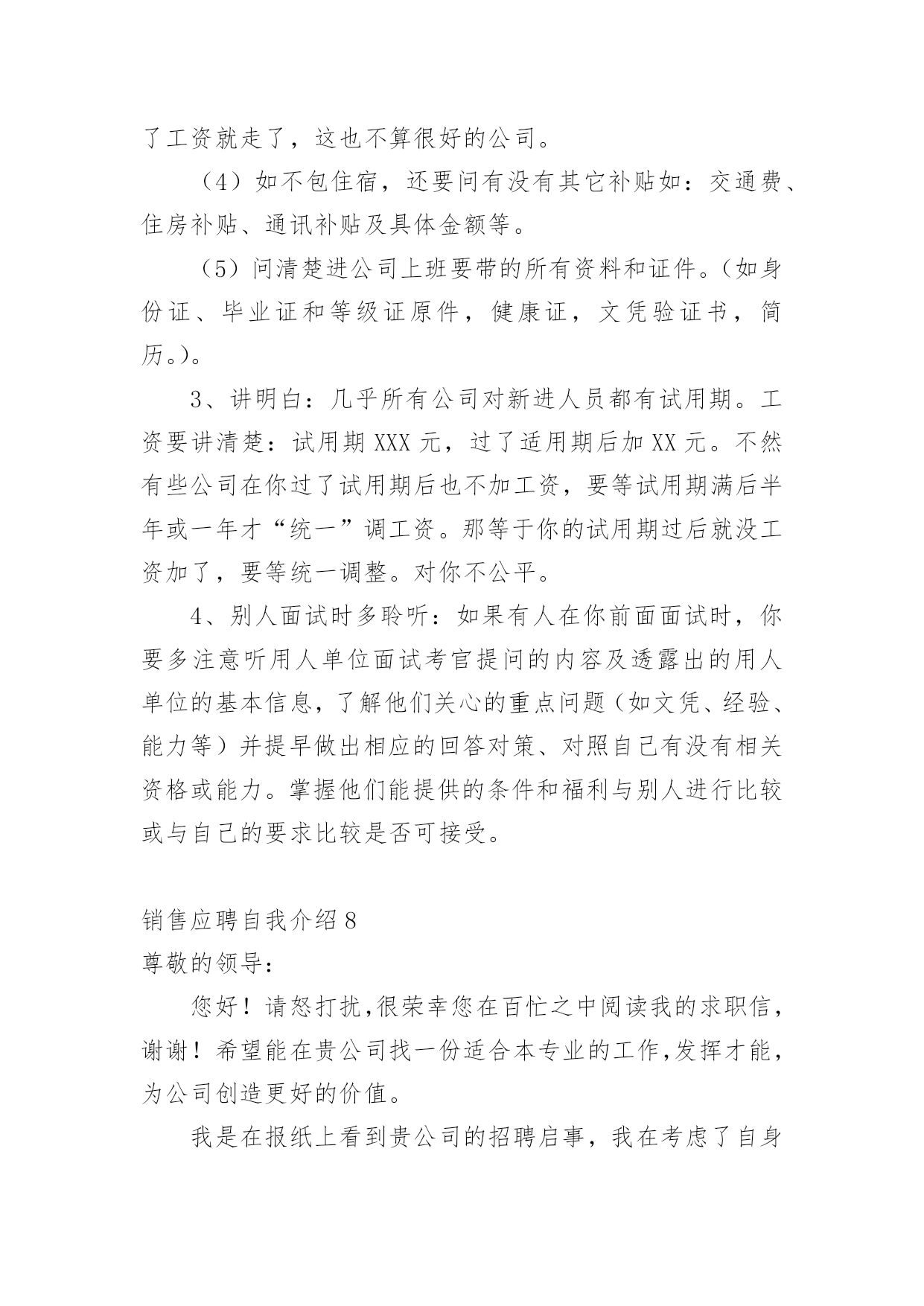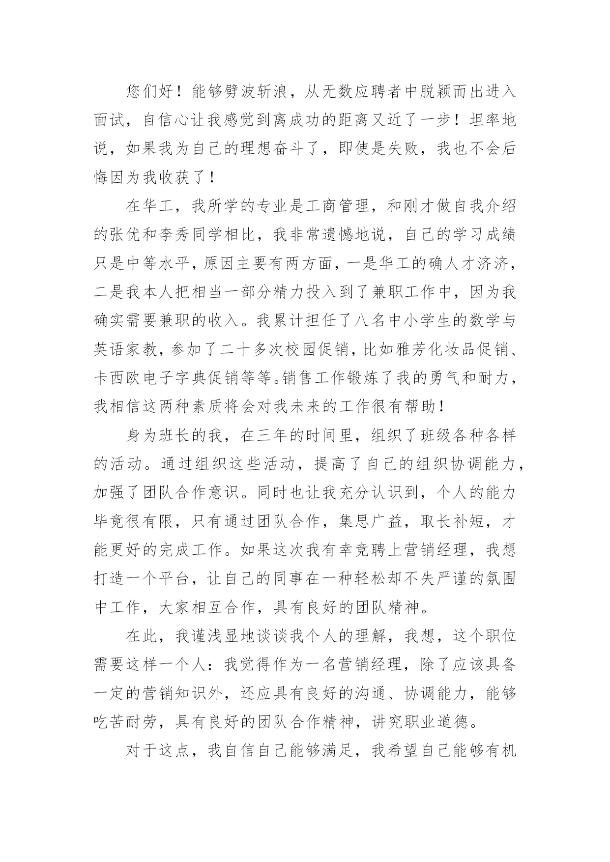销售应聘自我介绍当换了一个新环境后,时常要进行自我介绍,用自我介绍往往可以让他人有一定的了解。相信大家又在为写自我介绍犯愁了吧!以下是小编为大家整理的销售应聘自我介绍,仅供参考,大家一起来看看吧。销售应聘自我介绍1各位考官大家好,非常高兴能站在这里参加这次面试,能过的这样的机会我感到非常荣幸!我叫XXX毕业于X***x某某专业,三年的心理学学习,教会了我很多专业知识,也让我长大的许多,对于这几年的专业学习,我感到了非常充实,也掌握了大量的专业知识,理论与实践的结合让我在还未走出校园的那一刻就对这一天充满了期待。我一直相信一句话,那就是付出就有回报,学习中如此,生活中也如此,我相信外向的我可以更自信的对待明天,可以更踏实的对待我的工作,泰山不让土壤故能成其大,河海不择细流故能就起深,不积跬步无以至千里,我现在就要从小事做起,从头开始,我深深地明白只有今天勤劳踏实的工作,才能成就更美好的未来,这就是我,一个刚刚走出校门的学生对于工作的看法,这就是我一个不怕吃苦的青年在工作前所有的决心,说的好不如做的好,给我一次机会,我一定不会让大家失望,谢谢!销售应聘自我介绍2尊敬的面试官:早上好!我叫xxx,现年xx岁,x族,大专文化,平时我喜欢看书和上网流览信息,性格活泼开朗,能关心身边的人和事,和亲人朋友融洽相处,能做到理解和原谅,我对生活充满信心。我曾经在xx,在公司里先后在不同的岗位工作过,开始我从事xx工作,随后因公司需要到xx,有一定的经验,在工作上取得一些的成绩,同时也得到公司的认可。通过几年的工作我学到了很多知识,同时还培养了我坚韧不拔的意志和顽强拼搏的精神,使我能够在工作中不断地克服困难、积极进取。加入销售人员的行列是我多年以来的一个强烈愿望,同时我认识到人和工作的关系是建立在自我认知的基础上,而我感觉到我的工作热情一直没有被激发到最高,我热爱我的工作,但每个人都是在不断地寻求取得更好的成绩,我的自我认知让我觉得销售人员是一个正确的选择,这些就坚定了我做好销售的信心和决心。将销售工作做好,给公司带来收益,使自身不仅在物质方面获得提高,更重要的是我的人生因我的选择而精彩。我的自我介绍完毕,谢谢!销售应聘自我介绍3大家下午好!今天我要应聘的职位是营销经理。我平时喜欢跑步和看书,喜欢读书,因为它能丰富我的知识;喜欢跑步,因为它可以磨砺我的意志。我是一个活泼开朗、热情、执着、有坚强意志的人。今天竞聘的是营销经理,那么我谈谈自己对营销的理解。营销人员首先就要做好自我推销,让一个陌生人信任自己是有一定难度的,但只有客户相信自己,才会相信自己的产品,才能更好的将产品推入市场。我认为作为一名营销经理,除了应该具备专业知识外,还要有良好的沟通、协调能力,和有良好的团队合作精神。既然今天竞聘的是营销经理一职,我想谈谈自己对营销的理解。面对21世纪这个充满挑战、压力和机遇并存的世纪。正所谓“适者生存”,自中国加入世界贸易组织以来,市场变化日新月异。“营销”成就梦想,带给人财富越来越被人们所认识到。营销不等同于推销,但推销是营销的重要组成部分。要想做好营销工作,首先就要做好自我推销。让一个陌生人信任自己是有一定难度的,但只有客户相信可以,才会相信自己的产品,才能更好的将产品推入市场。我想“做人,做事,做生意”大概就是这个意思吧!我觉得作为一名销售总监,除了应该具备一定的营销知识外,还应具有良好的沟通、协调能力,能够吃苦耐劳,具有良好的团队合作精神,讲究职业道德。身为班长的我,在三年的时间里,组织了班级各种各样的活动。通过组织这些活动,提高了自己的组织协调能力,加强了团队合作意识。同时也让我充分认识到,个人的能力毕竟很有限,只有通过团队合作,集思广益,取长补短,才能更好的完成工作。如果这次我有幸竞聘上营销经理,我想打造一个平台,让自己的同事在一种轻松却不失严谨的氛围中工作,大家相互合作,具有良好的团队精神。同时我认为营销也是一种服务。既然是一种服务,就应该做到让大家满意,用热情和真心去做。激情,工作中不可或缺的要素,是推动我们在工作中不断创新,全身心投入工作的动力。激情加上挑战自我的意识,我相信我能胜任这份工作。身为班长的我,在大学三年的时间里,组织了班级各种各样的活动。通过组织这些活动,提高了自己的组织协调能力,加强了团队合作意识。同时也让我充分认识到,个人的能力毕竟很有限,只有通过团队合作,集思广益,取长补短,才能更好的完成工作。如果我有幸竞聘上营销经理,我想打造一个高效率的团队,什么是一个团队呢?团队就是不要让另外一个人失败,不要让团队任何一个人失败。同时我认为,营销也是一种服务,应该做到让客户满意,需要热情和专注。激情,工作中不可或缺的要素,是推动我们在工作中不断创新,全身心投入工作的动力。激情加上挑战自我的意识,我相信我能胜任这份工作。销