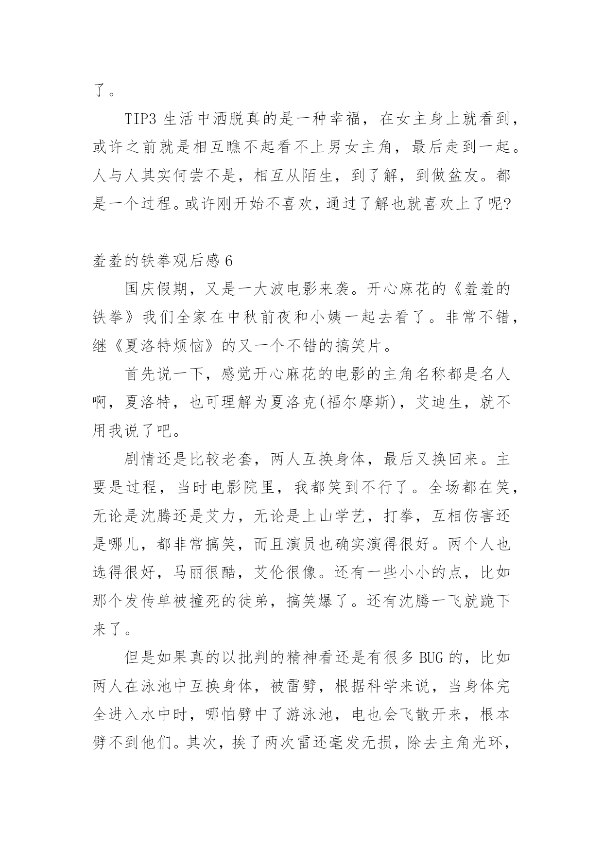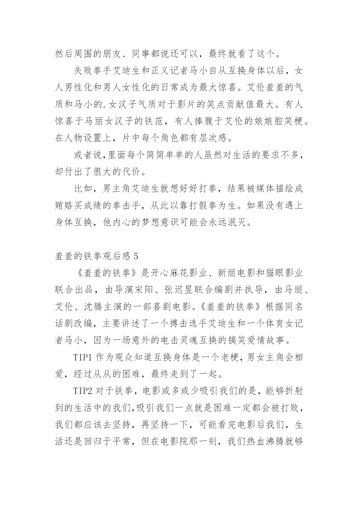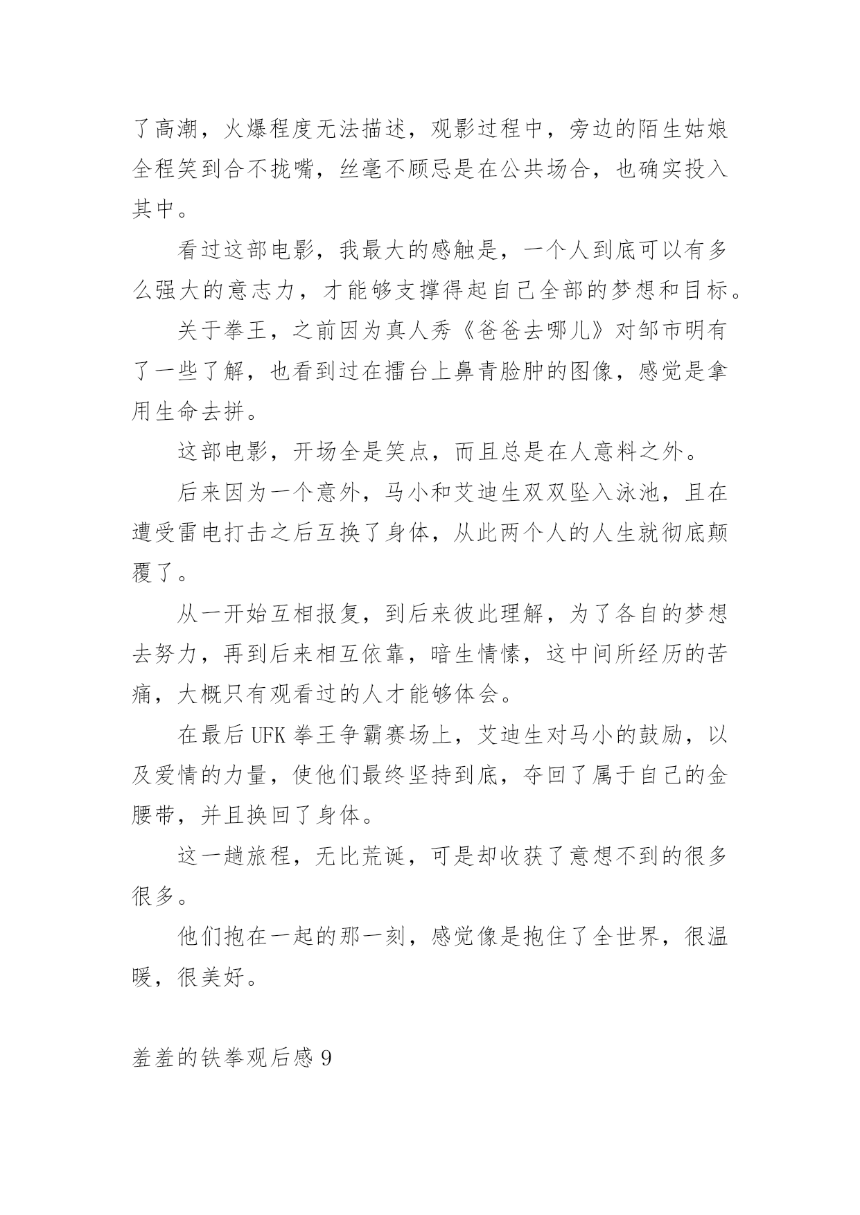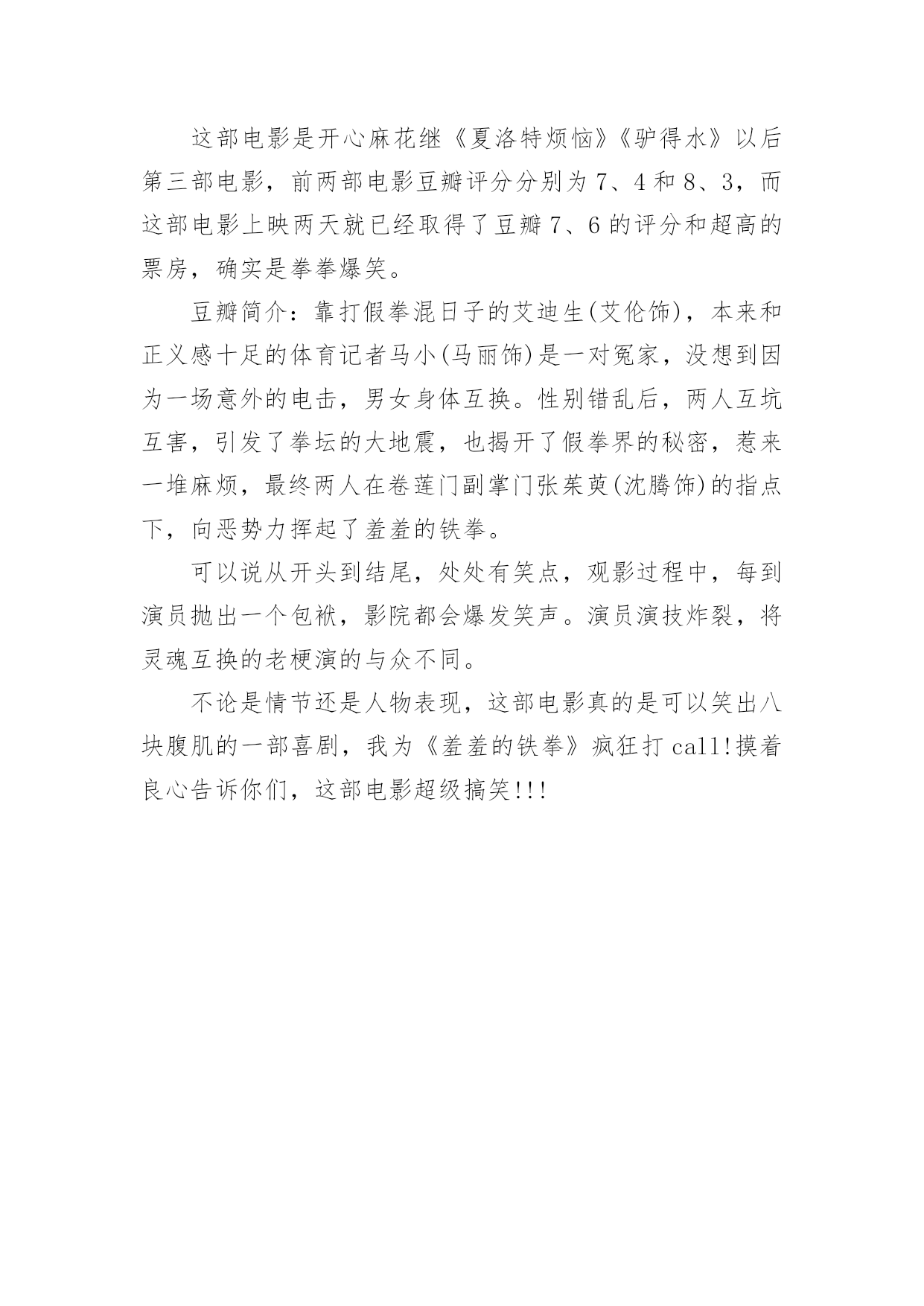 羞羞的铁拳观后感看完一部影视作品以后,从中我们可以吸收新的思想,是时候抽出时间写写观后感了。那么观后感到底应该怎么写呢?以下是小编整理的羞羞的铁拳观后感,欢迎大家分享。羞羞的铁拳观后感1今天上午,爸爸妈妈突然说,要带我去看电影,我真是开心极了!我们看的电影是《羞羞的铁拳》,是一部非常搞笑的电影。爱打假拳的拳手爱迪生和一名叫马小的女记者在遭遇了一场雷霹之后,两个人交换了身体。刚开始的时候,他们两个互相坑害,但是在经历了许多事情以后,两个人同心协力,战胜了恶势力。拳王吴良在逼迫他们做假拳的时候,他们不妥协,用了短短三个月的时间,上山寻找师傅练习功夫,他们在高速公路上练习发传单,在河里练习捕鱼,和老猫头鹰比赛熬夜。这些看似和打拳没有什么关系,但其实都是获胜的法宝。尤其是师傅最后的的一句“你过来呀!”是让自己变得自信。在爱迪生胳膊被吴良打断,快要站不起来的时候,爱迪生在最后时刻,用上了师傅教他的几招,打败了吴良,成为了拳王。这部影片不只是搞笑,也告诉了我们在遇到困难的时候要坚持,不要放弃,努力拼搏,最终一定会取得成功!羞羞的铁拳观后感2《羞羞的铁拳》是开心麻花影业、新丽电影和猫眼影业联合出品,由导演宋阳、张迟昱联合编剧并执导,由马丽、艾伦、沈腾主演的一部喜剧电影。《羞羞的铁拳》根据同名话剧改编,主要讲述了一个搏击选手艾迪生和一个体育女记者马小,因为一场意外的电击灵魂互换的搞笑爱情故事。TIP1作为观众知道互换身体是一个老梗,男女主角会相爱,经过从从的困难,最终走到了一起。TIP2对于铁拳,电影或多或少吸引我们的是,能够折射到的生活中的我们,吸引我们一点就是困难一定都会被打败,我们都应该去坚持,再坚持一下,可能看完电影后我们,生活还是回归于平常,但在电影院那一刻,我们热血沸腾就够了。TIP3生活中洒脱真的是一种幸福,在女主身上就看到,或许之前就是相互瞧不起看不上男女主角,最后走到一起。人与人其实何尝不是,相互从陌生,到了解,到做盆友。都是一个过程。或许刚开始不喜欢,通过了解也就喜欢上了呢?羞羞的铁拳观后感3《羞羞的铁拳》是讲马小和艾迪生交换灵魂的搞笑故事。主角马小是名记者,艾迪生是个拳手。一开始他们的相处并不愉快,在一次意外中他们的灵魂互换了。在他们交换身体的时候,他们都开始了解对方。马小用艾迪生的身体帮他夺回本就属于他的金腰带。在这期间,马小的爸爸带他们来到了卷莲门。在这里他们把熬鹰都给熬死了,但这也证明了他们很有耐力。在生活中很多人因为困难就放弃,一点耐力都没有。除了熬鹰以外,还有一件是在马路上车群中发传单。从一开始一张都发不出去,到后来在高速的车群中每一张都精准地发了出去。这一点少不了他们的努力与决心。有多少人能很努力地做一件事,就算能,也很少再遇到困难后,继续坚持下去。在艾迪生得一个挑战拳王的机会时,吴良抓住了马小的父亲,并威胁艾迪生打假拳。生活中有些人就是这样,为了达到目的,什么事情都会去干,到了出事,才后悔。不过结局中,艾迪生身体中的马小并没有打假拳,而是拼尽全力打。在一回合结束后,马小和艾迪生又换回来了,虽然在第二回合中被吴良打断了左臂,但艾迪生还是赢了。这个电影告诉我们:只要坚持不懈,不管遇到了多大的困难,也能成功的。羞羞的铁拳观后感4抱着5分的期望去的,给了8分的惊喜,说实在的,本身对电影不是很感兴趣,但是因为朋友念叨了很久想看这个,然后周围的朋友、同事都说还可以,最终就看了这个。失败拳手艾迪生和正义记者马小自从互换身体以后,女人男性化和男人女性化的日常成为最大惊喜。艾伦羞羞的气质和马小的.女汉子气质对于影片的笑点贡献值最大。有人惊喜于马丽女汉子的铁范,有人捧腹于艾伦的娘娘腔笑梗。在人物设置上,片中每个角色都有层次感。或者说,里面每个简简单单的人虽然对生活的要求不多,却付出了很大的代价。比如,男主角艾迪生就想好好打拳,结果被媒体描绘成贿赂买成绩的拳击手,从此以靠打假拳为生。如果没有遇上身体互换,他内心的梦想意识可能会永远泯灭。羞羞的铁拳观后感5《羞羞的铁拳》是开心麻花影业、新丽电影和猫眼影业联合出品,由导演宋阳、张迟昱联合编剧并执导,由马丽、艾伦、沈腾主演的一部喜剧电影。《羞羞的铁拳》根据同名话剧改编,主要讲述了一个搏击选手艾迪生和一个体育女记者马小,因为一场意外的电击灵魂互换的搞笑爱情故事。TIP1作为观众知道互换身体是一个老梗,男女主角会相爱,经过从从的困难,最终走到了一起。TIP2对于铁拳,电影或多或少吸引我们的是,能够折射到的生活中的我们,吸引我们一点就是困难一定都会被打败,我们都应该去坚持,再坚持一下,可能看完电影后我们,生活还是回归于平常,但在电影院那一刻,我们热血沸腾就够了。TIP3生活中洒脱真的是一种幸福,在女主身上就看到,或许之前就是相互瞧不起看不上男女主角,最后走到一起。人与人其实何尝不是,相互