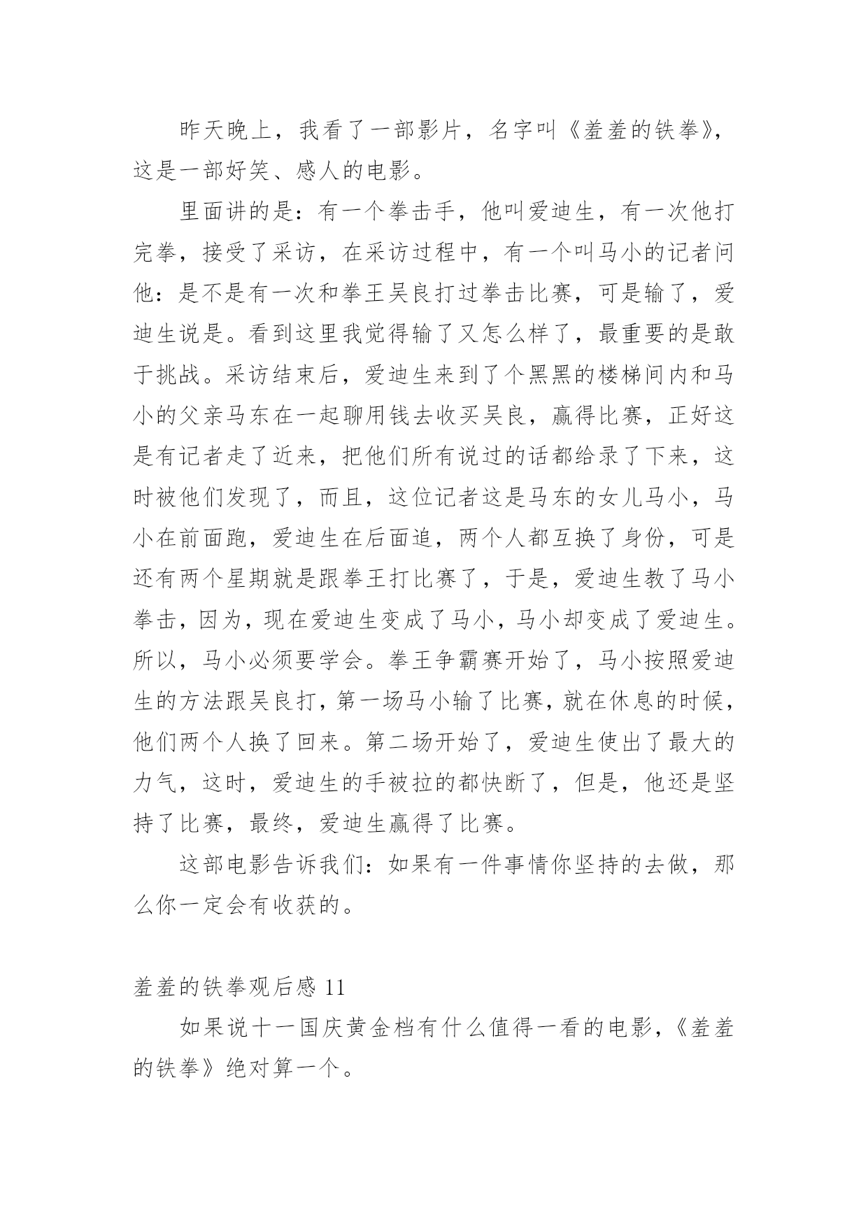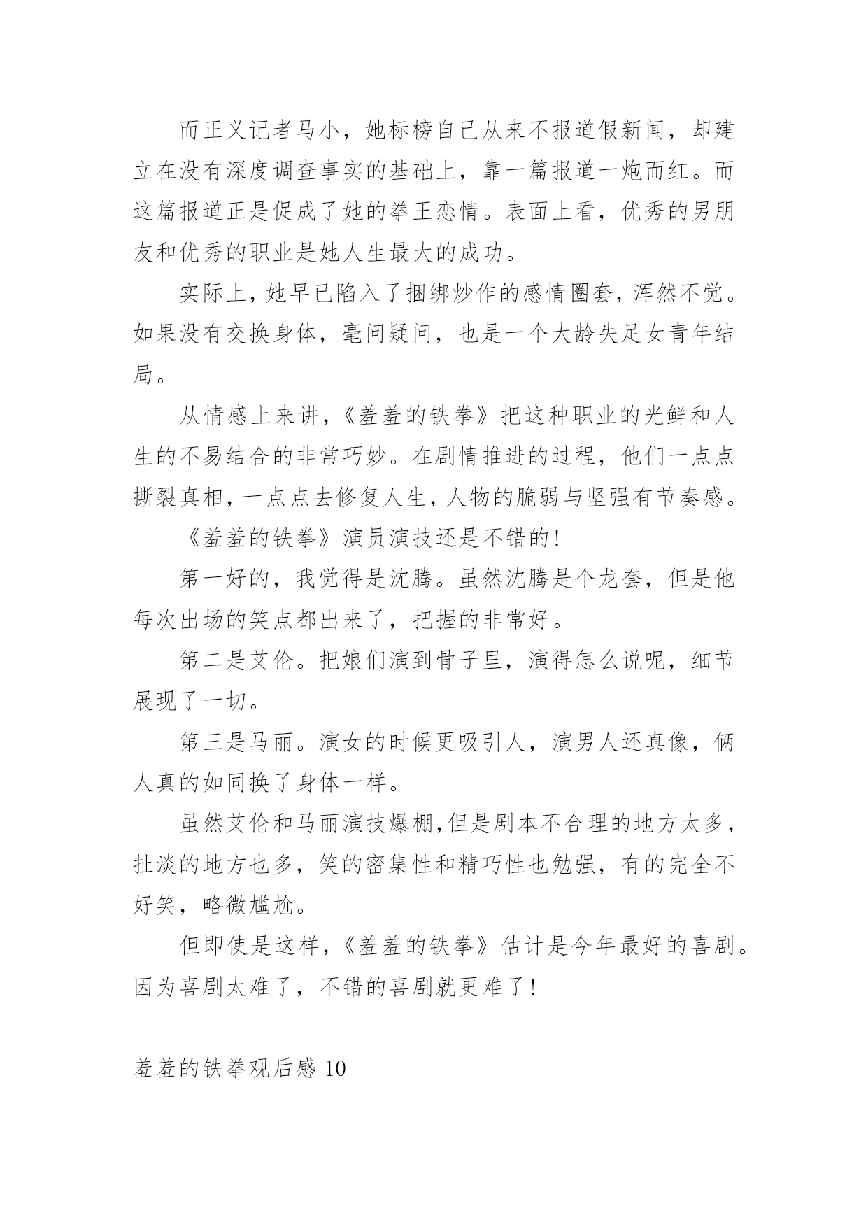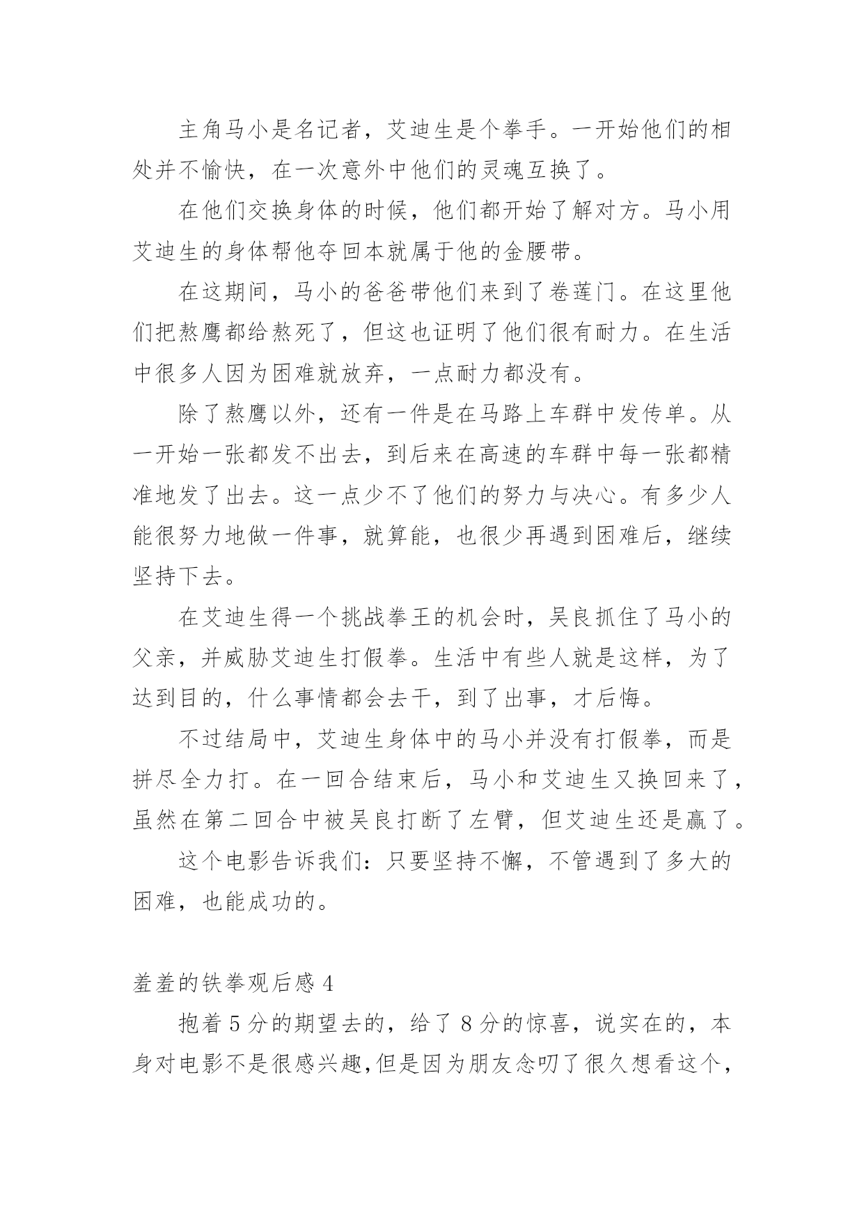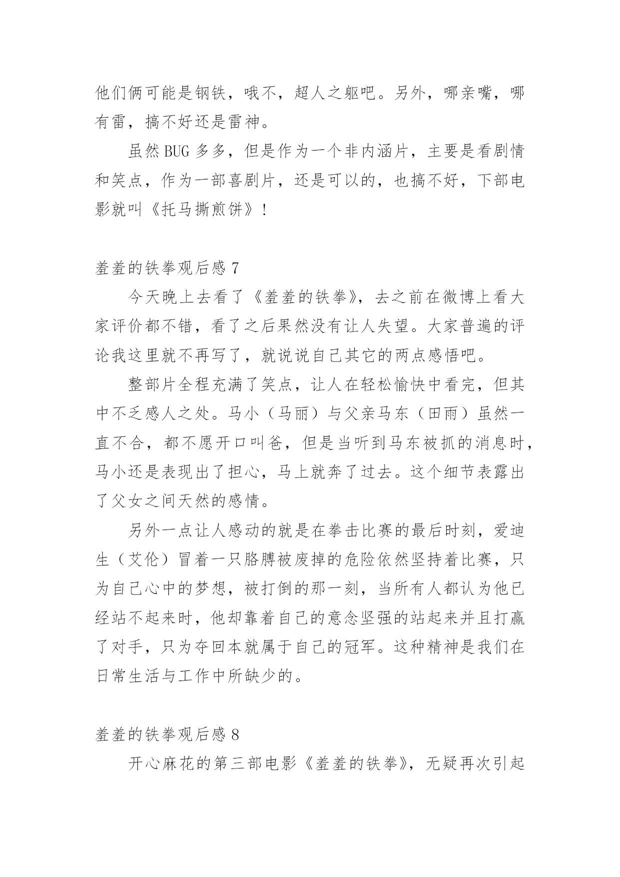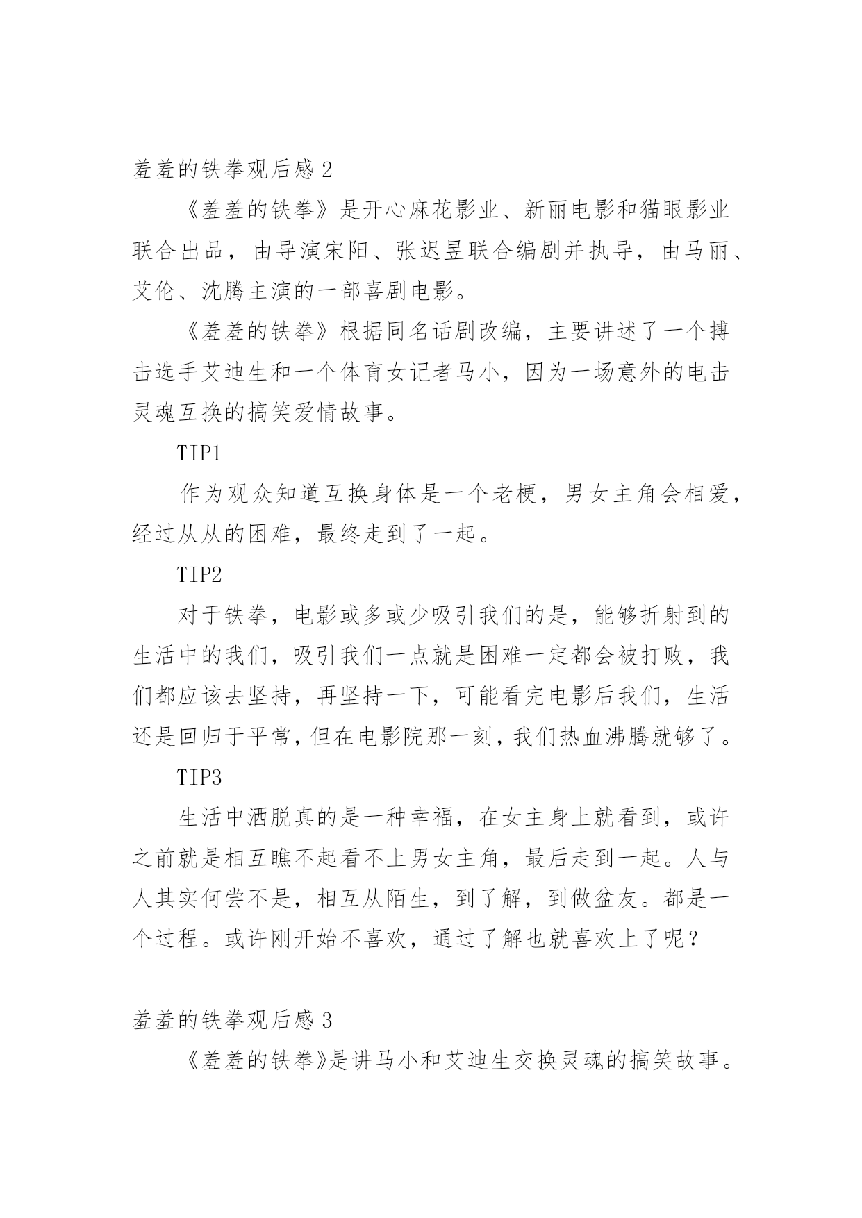 羞羞的铁拳观后感看完一部影视作品以后,从中我们可以吸收新的思想,是时候抽出时间写写观后感了。那么观后感到底应该怎么写呢?以下是小编整理的羞羞的铁拳观后感,欢迎大家分享。羞羞的铁拳观后感1今天上午,爸爸妈妈突然说,要带我去看电影,我真是开心极了!我们看的电影是《羞羞的铁拳》,是一部非常搞笑的电影。爱打假拳的拳手爱迪生和一名叫马小的女记者在遭遇了一场雷霹之后,两个人交换了身体。刚开始的时候,他们两个互相坑害,但是在经历了许多事情以后,两个人同心协力,战胜了恶势力。拳王吴良在逼迫他们做假拳的时候,他们不妥协,用了短短三个月的时间,上山寻找师傅练习功夫,他们在高速公路上练习发传单,在河里练习捕鱼,和老猫头鹰比赛熬夜。这些看似和打拳没有什么关系,但其实都是获胜的法宝。尤其是师傅最后的的一句“你过来呀!”是让自己变得自信。在爱迪生胳膊被吴良打断,快要站不起来的时候,爱迪生在最后时刻,用上了师傅教他的几招,打败了吴良,成为了拳王。这部影片不只是搞笑,也告诉了我们在遇到困难的时候要坚持,不要放弃,努力拼搏,最终一定会取得成功!羞羞的铁拳观后感2《羞羞的铁拳》是开心麻花影业、新丽电影和猫眼影业联合出品,由导演宋阳、张迟昱联合编剧并执导,由马丽、艾伦、沈腾主演的一部喜剧电影。《羞羞的铁拳》根据同名话剧改编,主要讲述了一个搏击选手艾迪生和一个体育女记者马小,因为一场意外的电击灵魂互换的搞笑爱情故事。TIP1作为观众知道互换身体是一个老梗,男女主角会相爱,经过从从的困难,最终走到了一起。TIP2对于铁拳,电影或多或少吸引我们的是,能够折射到的生活中的我们,吸引我们一点就是困难一定都会被打败,我们都应该去坚持,再坚持一下,可能看完电影后我们,生活还是回归于平常,但在电影院那一刻,我们热血沸腾就够了。TIP3生活中洒脱真的是一种幸福,在女主身上就看到,或许之前就是相互瞧不起看不上男女主角,最后走到一起。人与人其实何尝不是,相互从陌生,到了解,到做盆友。都是一个过程。或许刚开始不喜欢,通过了解也就喜欢上了呢?羞羞的铁拳观后感3《羞羞的铁拳》是讲马小和艾迪生交换灵魂的搞笑故事。主角马小是名记者,艾迪生是个拳手。一开始他们的相处并不愉快,在一次意外中他们的灵魂互换了。在他们交换身体的时候,他们都开始了解对方。马小用艾迪生的身体帮他夺回本就属于他的金腰带。在这期间,马小的爸爸带他们来到了卷莲门。在这里他们把熬鹰都给熬死了,但这也证明了他们很有耐力。在生活中很多人因为困难就放弃,一点耐力都没有。除了熬鹰以外,还有一件是在马路上车群中发传单。从一开始一张都发不出去,到后来在高速的车群中每一张都精准地发了出去。这一点少不了他们的努力与决心。有多少人能很努力地做一件事,就算能,也很少再遇到困难后,继续坚持下去。在艾迪生得一个挑战拳王的机会时,吴良抓住了马小的父亲,并威胁艾迪生打假拳。生活中有些人就是这样,为了达到目的,什么事情都会去干,到了出事,才后悔。不过结局中,艾迪生身体中的马小并没有打假拳,而是拼尽全力打。在一回合结束后,马小和艾迪生又换回来了,虽然在第二回合中被吴良打断了左臂,但艾迪生还是赢了。这个电影告诉我们:只要坚持不懈,不管遇到了多大的困难,也能成功的。羞羞的铁拳观后感4抱着5分的期望去的,给了8分的惊喜,说实在的,本身对电影不是很感兴趣,但是因为朋友念叨了很久想看这个,然后周围的朋友、同事都说还可以,最终就看了这个。失败拳手艾迪生和正义记者马小自从互换身体以后,女人男性化和男人女性化的日常成为最大惊喜。艾伦羞羞的气质和马小的.女汉子气质对于影片的笑点贡献值最大。有人惊喜于马丽女汉子的铁范,有人捧腹于艾伦的娘娘腔笑梗。在人物设置上,片中每个角色都有层次感。或者说,里面每个简简单单的人虽然对生活的要求不多,却付出了很大的代价。比如,男主角艾迪生就想好好打拳,结果被媒体描绘成贿赂买成绩的拳击手,从此以靠打假拳为生。如果没有遇上身体互换,他内心的梦想意识可能会永远泯灭。羞羞的铁拳观后感5《羞羞的铁拳》是开心麻花影业、新丽电影和猫眼影业联合出品,由导演宋阳、张迟昱联合编剧并执导,由马丽、艾伦、沈腾主演的一部喜剧电影。《羞羞的铁拳》根据同名话剧改编,主要讲述了一个搏击选手艾迪生和一个体育女记者马小,因为一场意外的电击灵魂互换的搞笑爱情故事。TIP1作为观众知道互换身体是一个老梗,男女主角会相爱,经过从从的困难,最终走到了一起。TIP2对于铁拳,电影或多或少吸引我们的是,能够折射到的生活中的我们,吸引我们一点就是困难一定都会被打败,我们都应该去坚持,再坚持一下,可能看完电影后我们,生活还是回归于平常,但在电影院那一刻,我们热血沸腾就够了。TIP3生活中洒脱真的是一种幸福,在女主身上就看到,或许之前就是相互瞧不起看不上男女主角,最后走到一起。人与人其实何尝不是,相互