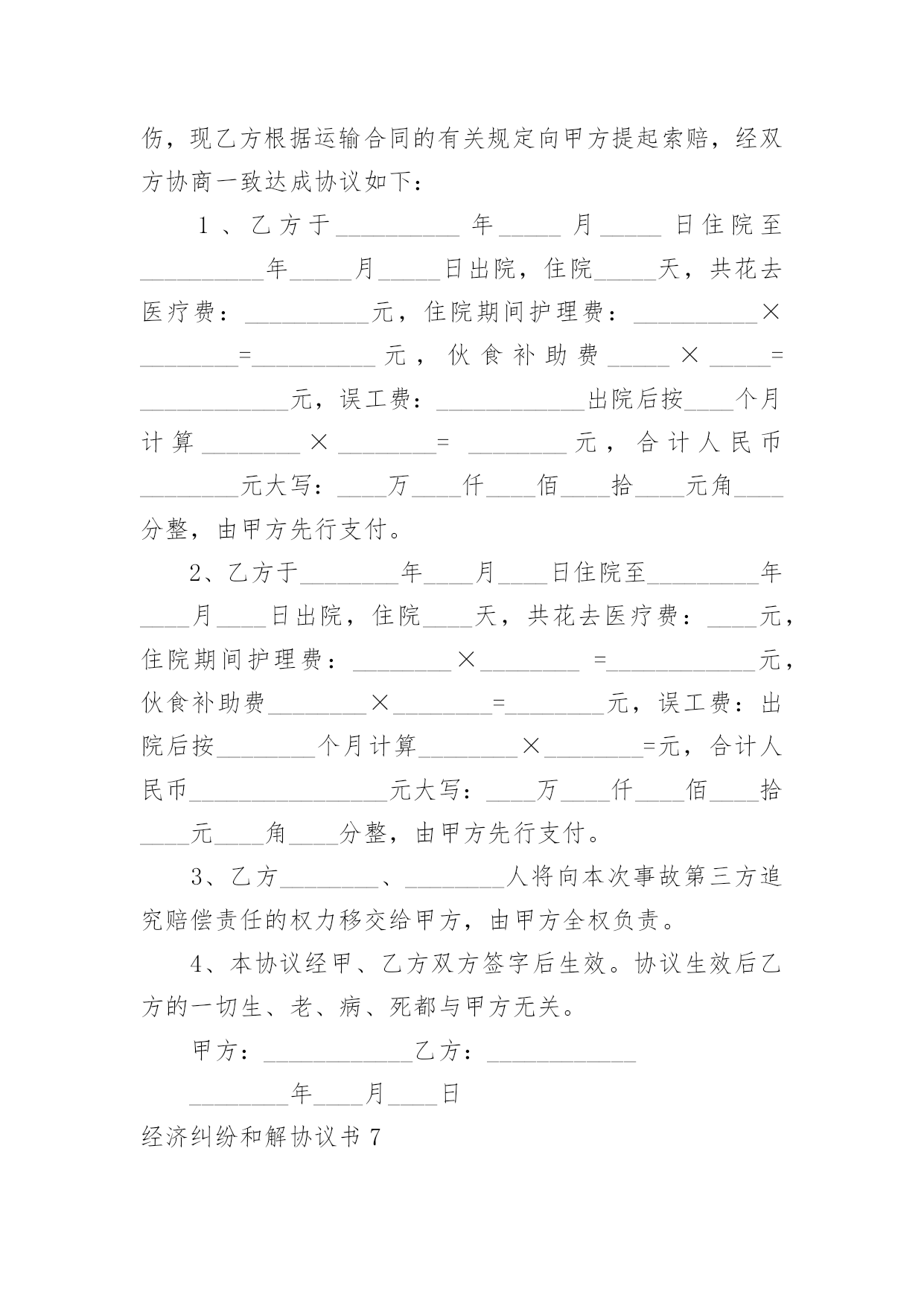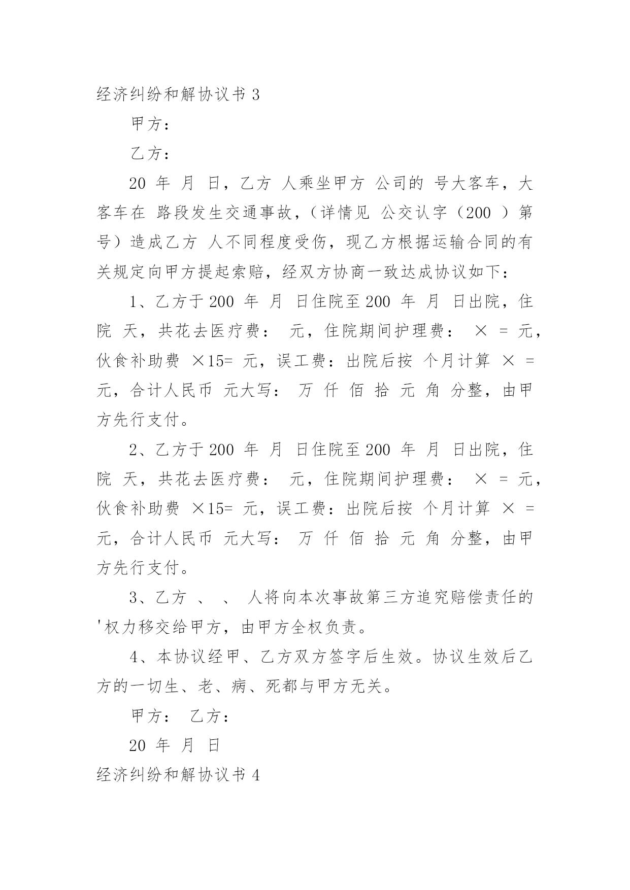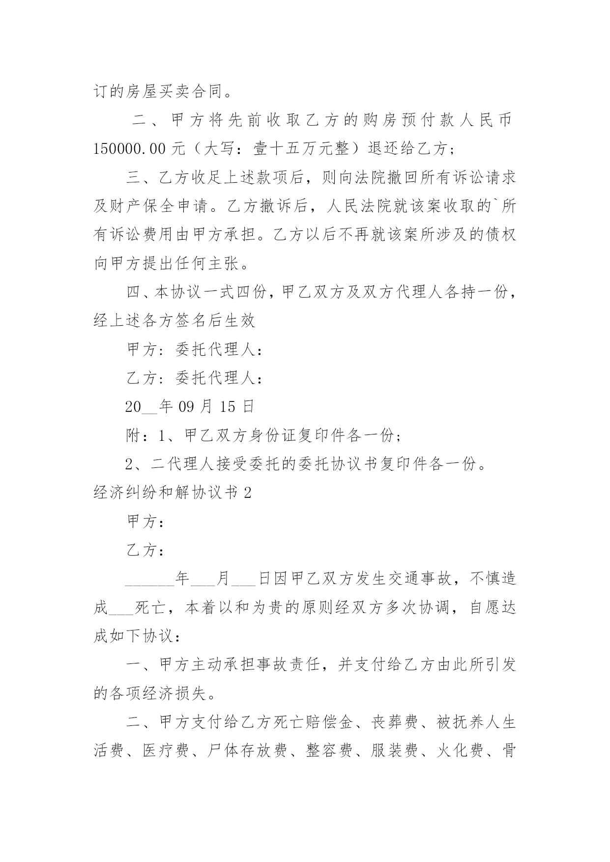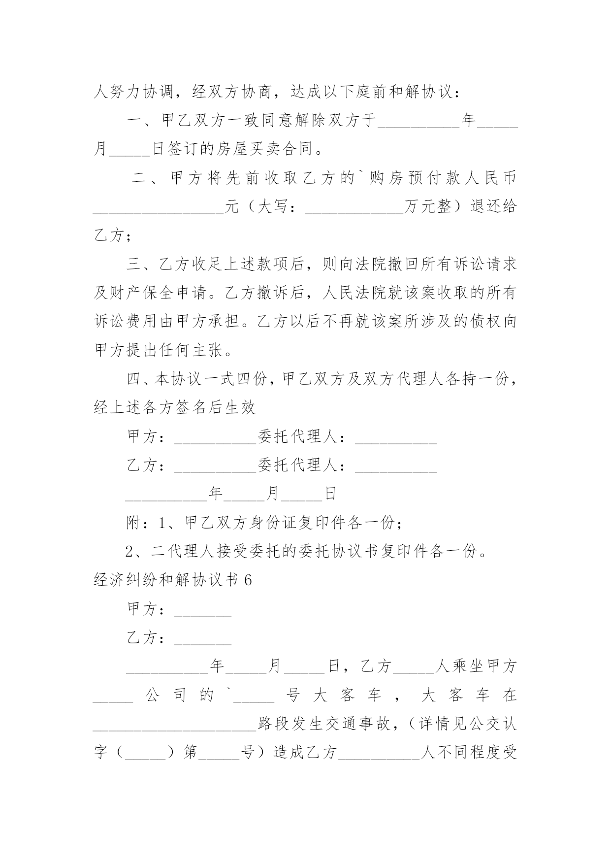 经济纠纷和解协议书经济纠纷和解协议书在我们平凡的日常里,男女老少都可能需要用到协议,签订协议可以约束双方履行责任。那么你真正懂得怎么写好协议吗?以下是小编收集整理的经济纠纷和解协议书,欢迎阅读,希望大家能够喜欢。经济纠纷和解协议书1甲方:张XX,男,白族,1971年12月07日生,云南省大理市人,住大理市经济开发区XXXX职工宿舍3栋4单元202室,身份证号码532901XXXXXX,联系电话138872XXXXX,0872-23XXXXX。委托代理人:乙方:刘XX,女,汉族,1968年9月2日生,住大理市下关镇雪人路八号6栋,身份证号码532901XXXXXX,联系电话:139872XXXXX。委托代理人:刘XX诉张XX买卖合同纠纷一案,由XXX人民法院受理,案号:(20__)XX初字第39号,原定于20__年8月30日开庭。现经委托代理人努力协调,经双方协商,达成以下庭前和解协议:一、甲乙双方一致同意解除双方于20__年5月23日签订的房屋买卖合同。二、甲方将先前收取乙方的购房预付款人民币150000.00元(大写:壹十五万元整)退还给乙方;三、乙方收足上述款项后,则向法院撤回所有诉讼请求及财产保全申请。乙方撤诉后,人民法院就该案收取的`所有诉讼费用由甲方承担。乙方以后不再就该案所涉及的债权向甲方提出任何主张。四、本协议一式四份,甲乙双方及双方代理人各持一份,经上述各方签名后生效甲方:委托代理人:乙方:委托代理人:20__年09月15日附:1、甲乙双方身份证复印件各一份;2、二代理人接受委托的委托协议书复印件各一份。经济纠纷和解协议书2甲方:乙方:______年___月___日因甲乙双方发生交通事故,不慎造成___死亡,本着以和为贵的原则经双方多次协调,自愿达成如下协议:一、甲方主动承担事故责任,并支付给乙方由此所引发的各项经济损失。二、甲方支付给乙方死亡赔偿金、丧葬费、被抚养人生活费、医疗费、尸体存放费、整容费、服装费、火化费、骨灰盒费用、仪式费用、殡仪费及其他费用等等共计人民币______元整(______元)。乙方向甲方出示收据。上述费用支付给乙方后,由乙方自行分配、处理,其分配、处理的方式、后果与甲方无关。三、甲方履行完给付义务后,乙方就此事保证不以任何形式、任何理由就甲方交通肇事一事向甲方要求其他任何费用。四、甲方履行完给付义务后,就此事处理即告终结,甲乙双方之间不再有任何权利、义务。以后因此事衍生的`结果亦由乙方自行承担,甲方对此不再承担任何责任。五、乙方承诺不再追究甲方的一切法律责任。六、本协议为双方平等、自愿协商之结果,是双方真实意思表示,且公平、合理。七、本协议内容甲乙双方已经全文阅读并理解无误,甲乙双方明白本协议所涉及后果,甲乙双方对此协议处理结果完全满意。八、甲乙双方为签署本协议所需的内部授权程序均已完成。本协议生效后即对协议双方具有法律约束力。九、本协议为甲乙双方终结处理协议。十、本协议自甲乙双方签字时生效。本协议一式叁份,甲乙双方每人各执壹份,公证处存档一份。甲方:乙方:______年___月___日经济纠纷和解协议书3甲方:乙方:20年月日,乙方人乘坐甲方公司的号大客车,大客车在路段发生交通事故,(详情见公交认字(200)第号)造成乙方人不同程度受伤,现乙方根据运输合同的有关规定向甲方提起索赔,经双方协商一致达成协议如下:1、乙方于200年月日住院至200年月日出院,住院天,共花去医疗费:元,住院期间护理费:×=元,伙食补助费×15=元,误工费:出院后按个月计算×=元,合计人民币元大写:万仟佰拾元角分整,由甲方先行支付。2、乙方于200年月日住院至200年月日出院,住院天,共花去医疗费:元,住院期间护理费:×=元,伙食补助费×15=元,误工费:出院后按个月计算×=元,合计人民币元大写:万仟佰拾元角分整,由甲方先行支付。3、乙方、、人将向本次事故第三方追究赔偿责任的'权力移交给甲方,由甲方全权负责。4、本协议经甲、乙方双方签字后生效。协议生效后乙方的一切生、老、病、死都与甲方无关。甲方:乙方:20年月日经济纠纷和解协议书4医疗机构名称:医疗机构法定代理人:调解机构:患者的姓名:年龄:性别:籍贯:住址:职业:协议地点:患者于年月日因在医方处住院(门诊)科治疗,其间,医患双方因患者医疗问题发生医疗行为争议。经医患双方行为主体同意,医患双方均愿通过协商解决该医疗行为争议;本着当事双方自愿、平等、公平、合法、真实和诚实信用的原则,根据《医疗事故处理条例》及相关法律法规,经充分协商,现达成如下协议,由医患双方共同遵照执行。第一条:医患双方对自主协商解决该医疗争议不持异议。第二条:医院同意向患方实行一次性经济补偿:(¥元)第三条:医方同意于本协议生效后日内向患方一次性支付本协议第二条规定的`款项。第四条:
