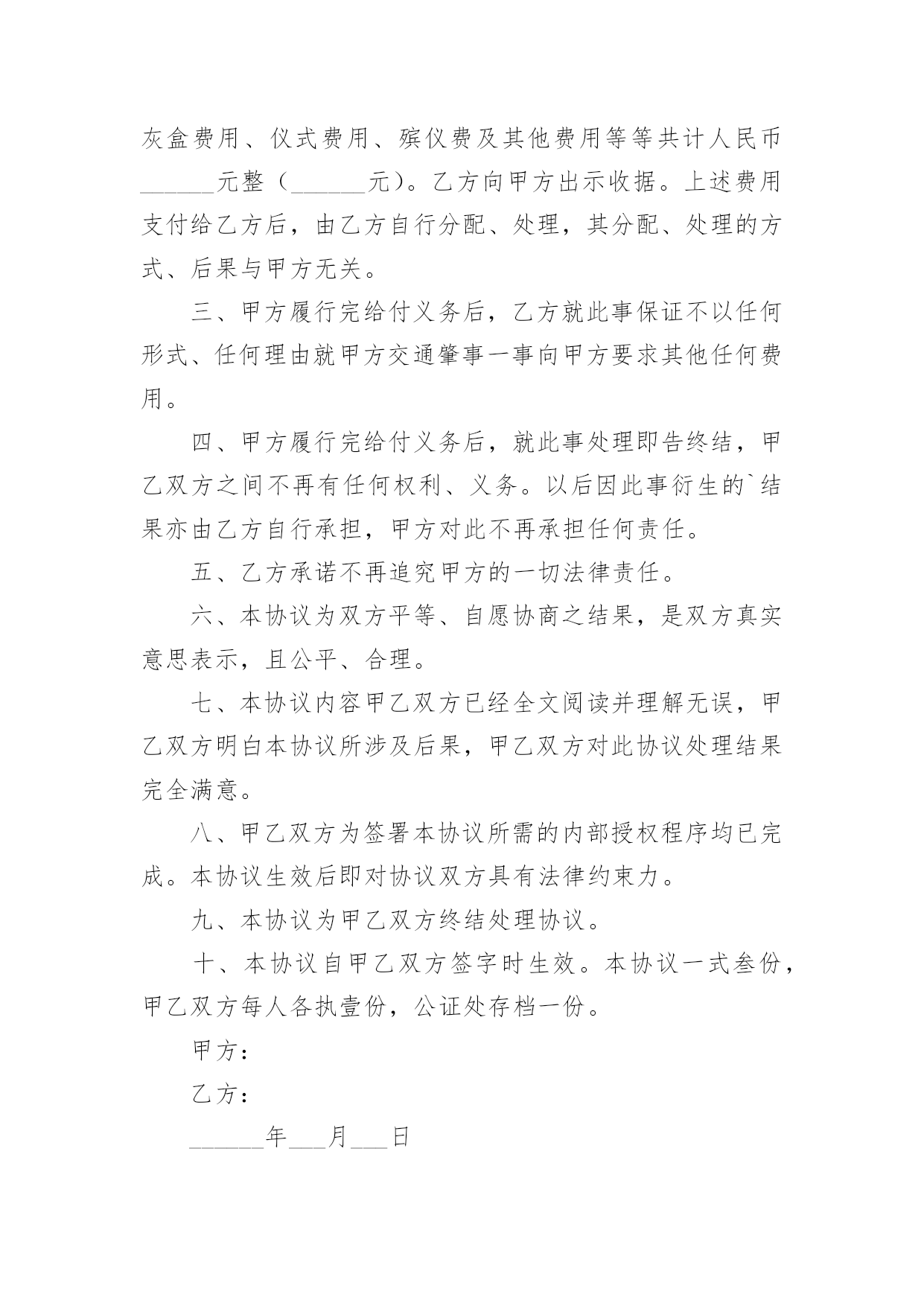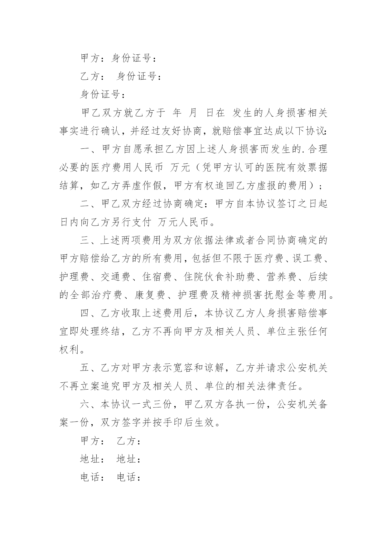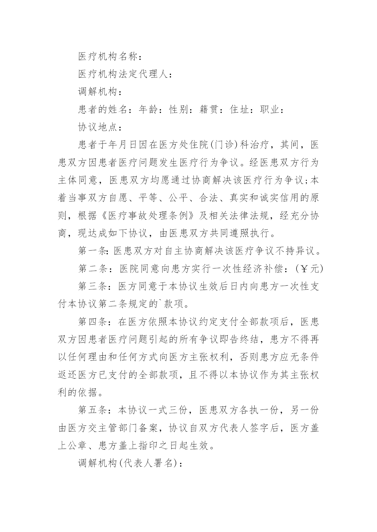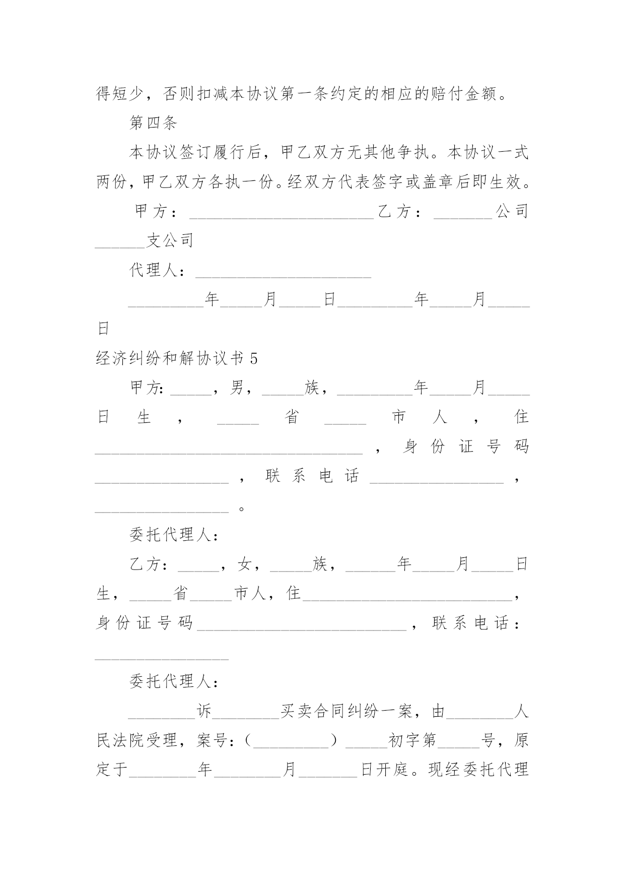 经济纠纷和解协议书经济纠纷和解协议书在我们平凡的日常里,男女老少都可能需要用到协议,签订协议可以约束双方履行责任。那么你真正懂得怎么写好协议吗?以下是小编收集整理的经济纠纷和解协议书,欢迎阅读,希望大家能够喜欢。经济纠纷和解协议书1甲方:张XX,男,白族,1971年12月07日生,云南省大理市人,住大理市经济开发区XXXX职工宿舍3栋4单元202室,身份证号码532901XXXXXX,联系电话138872XXXXX,0872-23XXXXX。委托代理人:乙方:刘XX,女,汉族,1968年9月2日生,住大理市下关镇雪人路八号6栋,身份证号码532901XXXXXX,联系电话:139872XXXXX。委托代理人:刘XX诉张XX买卖合同纠纷一案,由XXX人民法院受理,案号:(20__)XX初字第39号,原定于20__年8月30日开庭。现经委托代理人努力协调,经双方协商,达成以下庭前和解协议:一、甲乙双方一致同意解除双方于20__年5月23日签订的房屋买卖合同。二、甲方将先前收取乙方的购房预付款人民币150000.00元(大写:壹十五万元整)退还给乙方;三、乙方收足上述款项后,则向法院撤回所有诉讼请求及财产保全申请。乙方撤诉后,人民法院就该案收取的`所有诉讼费用由甲方承担。乙方以后不再就该案所涉及的债权向甲方提出任何主张。四、本协议一式四份,甲乙双方及双方代理人各持一份,经上述各方签名后生效甲方:委托代理人:乙方:委托代理人:20__年09月15日附:1、甲乙双方身份证复印件各一份;2、二代理人接受委托的委托协议书复印件各一份。经济纠纷和解协议书2甲方:乙方:______年___月___日因甲乙双方发生交通事故,不慎造成___死亡,本着以和为贵的原则经双方多次协调,自愿达成如下协议:一、甲方主动承担事故责任,并支付给乙方由此所引发的各项经济损失。二、甲方支付给乙方死亡赔偿金、丧葬费、被抚养人生活费、医疗费、尸体存放费、整容费、服装费、火化费、骨灰盒费用、仪式费用、殡仪费及其他费用等等共计人民币______元整(______元)。乙方向甲方出示收据。上述费用支付给乙方后,由乙方自行分配、处理,其分配、处理的方式、后果与甲方无关。三、甲方履行完给付义务后,乙方就此事保证不以任何形式、任何理由就甲方交通肇事一事向甲方要求其他任何费用。四、甲方履行完给付义务后,就此事处理即告终结,甲乙双方之间不再有任何权利、义务。以后因此事衍生的`结果亦由乙方自行承担,甲方对此不再承担任何责任。五、乙方承诺不再追究甲方的一切法律责任。六、本协议为双方平等、自愿协商之结果,是双方真实意思表示,且公平、合理。七、本协议内容甲乙双方已经全文阅读并理解无误,甲乙双方明白本协议所涉及后果,甲乙双方对此协议处理结果完全满意。八、甲乙双方为签署本协议所需的内部授权程序均已完成。本协议生效后即对协议双方具有法律约束力。九、本协议为甲乙双方终结处理协议。十、本协议自甲乙双方签字时生效。本协议一式叁份,甲乙双方每人各执壹份,公证处存档一份。甲方:乙方:______年___月___日经济纠纷和解协议书3甲方:乙方:20年月日,乙方人乘坐甲方公司的号大客车,大客车在路段发生交通事故,(详情见公交认字(200)第号)造成乙方人不同程度受伤,现乙方根据运输合同的有关规定向甲方提起索赔,经双方协商一致达成协议如下:1、乙方于200年月日住院至200年月日出院,住院天,共花去医疗费:元,住院期间护理费:×=元,伙食补助费×15=元,误工费:出院后按个月计算×=元,合计人民币元大写:万仟佰拾元角分整,由甲方先行支付。2、乙方于200年月日住院至200年月日出院,住院天,共花去医疗费:元,住院期间护理费:×=元,伙食补助费×15=元,误工费:出院后按个月计算×=元,合计人民币元大写:万仟佰拾元角分整,由甲方先行支付。3、乙方、、人将向本次事故第三方追究赔偿责任的'权力移交给甲方,由甲方全权负责。4、本协议经甲、乙方双方签字后生效。协议生效后乙方的一切生、老、病、死都与甲方无关。甲方:乙方:20年月日经济纠纷和解协议书4医疗机构名称:医疗机构法定代理人:调解机构:患者的姓名:年龄:性别:籍贯:住址:职业:协议地点:患者于年月日因在医方处住院(门诊)科治疗,其间,医患双方因患者医疗问题发生医疗行为争议。经医患双方行为主体同意,医患双方均愿通过协商解决该医疗行为争议;本着当事双方自愿、平等、公平、合法、真实和诚实信用的原则,根据《医疗事故处理条例》及相关法律法规,经充分协商,现达成如下协议,由医患双方共同遵照执行。第一条:医患双方对自主协商解决该医疗争议不持异议。第二条:医院同意向患方实行一次性经济补偿:(¥元)第三条:医方同意于本协议生效后日内向患方一次性支付本协议第二条规定的`款项。第四条: