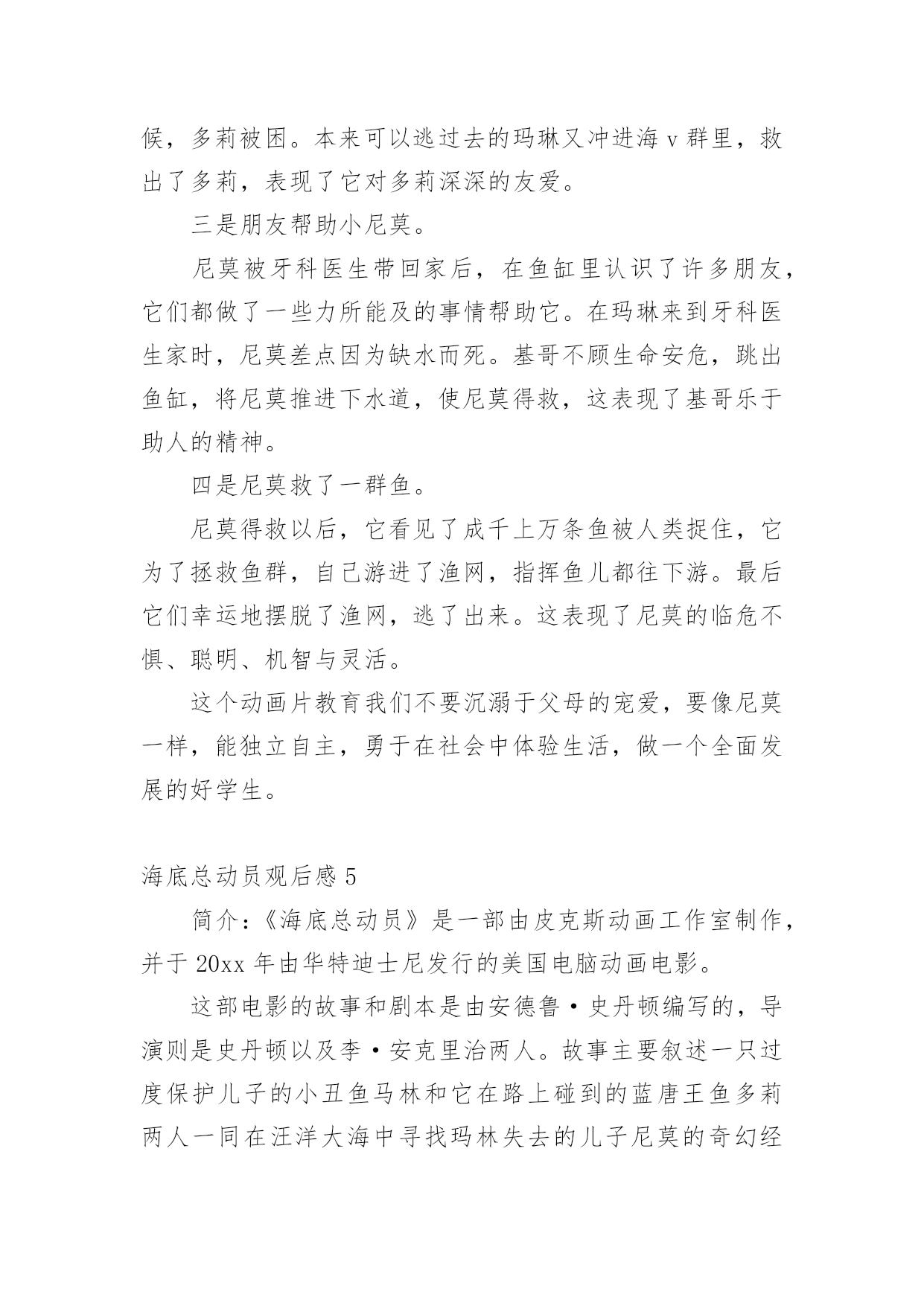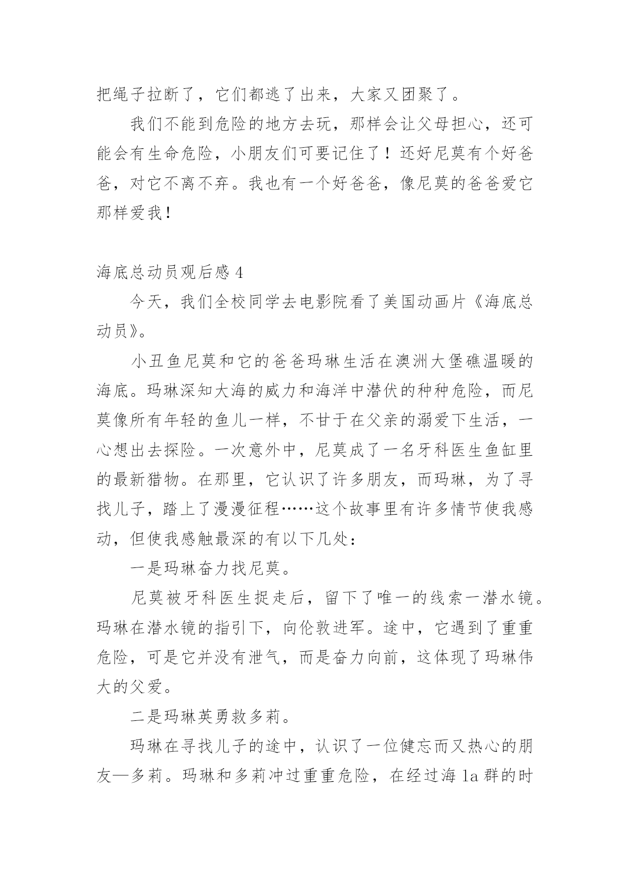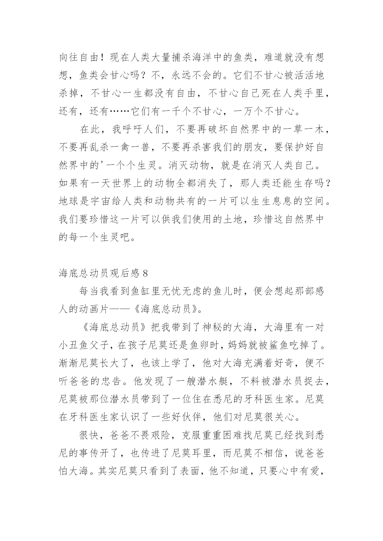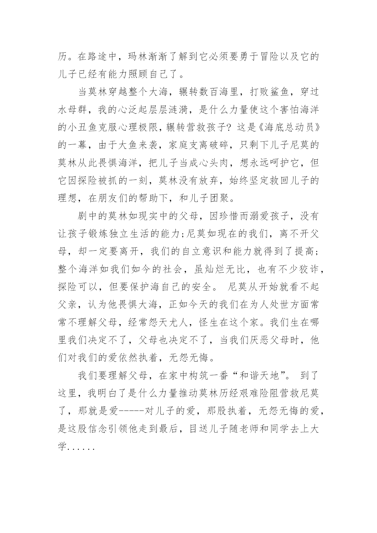 海底总动员观后感在观看完一部作品以后,这次观看让你有什么体会呢?需要写一篇观后感好好地作记录了。你想知道观后感怎么写吗?下面是小编帮大家整理的海底总动员观后感,仅供参考,大家一起来看看吧。海底总动员观后感1在一望无际的大海深处,有一片茂密的海葵林,住着两只可爱的小丑鱼——爸爸马林和儿子尼莫。在不久前,他们的家庭遭遇了不幸:妈妈和其它兄弟姐妹们被鲨鱼当成了一顿美餐,只有爸爸和尼莫侥幸存活了下来??儿子一天天长大了,尼莫到了上学的年龄,在这期间,尼莫被潜水员抓走了,爸爸为了救他,遭受了各种各样的危险,经历了千辛万苦的努力,终于救出了尼莫,父子再次团圆??每当想起《海底总动员》这一幕幕惊心动魄,催人泪下的情景时,我的心中情不自禁地有一股暖流涌遍全身。尼莫有一位对他不离不弃的爸爸,我也有这么一位好爸爸,正像歌中所唱的:“做起饭来锵铛铛锵铛铛,洗起衣服嚓嚓嚓嚓嚓嚓,高兴起来哈哈哈哈哈哈,打起屁股哈哈哈哈哈哈??”勤快又严厉的好爸爸。想到爸爸马林对儿子尼莫不离不弃的爱,我不禁想起我的爸爸对我们的关爱和鼓励。有一次,我和爸爸一起去公园游玩,到了攀岩娱乐区,我看到一位位勇于攀登的小勇士,我满怀钦佩,心想:我要是能攀到顶峰就好了!可惜,我没这胆量呀!这时,爸爸似乎看透了我的心思,亲切地对我说:“月月,也当一回小勇士吧?”我连忙摆手说:“不行,不行,我可没这胆量呀!”爸爸语重心长地说:就这么点困难就吓住了?以后要经历的挫折可能很多,自己不去尝试,不去拼搏,难道就这么退缩了?相信自己去尝试一下吧!”我仔细琢磨了一番后,决心当回勇士,我一鼓作气攀上了顶峰,战胜了自己,真开心!爸爸不仅对我无微不至,对家庭也释放出了无穷无尽的爱。每当妈妈生日时,爸爸总是买些精美的礼物送给她,每当爸爸在家休假,他带我出去游玩,开拓视野,增长见识,每当我和妈妈闹别扭时,爸爸总是站出来解决问题??爸爸就像冬日里的一缕阳光,温暖着我的心田,爸爸就像林中的一棵大树,为我遮风挡雨,爸爸就像家里的顶梁柱,为我撑起一片天地??我爱您——亲爱的爸爸!海底总动员观后感2由于看得不是HD版,画质上稍微有些逊色。在对海等大场景下的表现不够震撼。父亲马林对着这个唯一幸存下来的儿子尼莫呵护有加,由于鱼卵时的遇袭,导致尼莫一个胸鳍发育不起来,因此就更加过度呵护了。处处呵护着尼莫,上课怕他遇危险,劝诫他还是晚些时候再读算了。听到老师要带他们去峭壁,吓了一跳,赶紧跟去。看到尼莫游开,更担心遇到危险,喊着叫他回来。面对着这个唠唠叨叨的家长,而且还在自己的同学面前唠叨,多灭面子啊。这时小孩的叛逆心理就呈现出来了。尼莫忽然勇敢了起来,准确的说应该叫莽撞。游向了快艇,并碰了一下。然而正准备功成荣归时,被快艇上下来的潜水者抓去了。因此,父亲踏上了寻找儿子的历程。途中也发生了不少故事,经历了几次九死一生的磨难。最后为了救多莉勇闯水母群,被龟龟救了下来,带上来暖流这条高速公路。在暖流这段时期,乌龟的孩子们相当活跃,龟龟让他儿子去穿越暖流。面对这种现象,马林问龟龟不担心孩子的安危吗。而龟龟们就是这样放手让孩子们去做的。作为父母要相信孩子,其实这样做就是能培育孩子的进取心。这一段对话,多少给了马林一些启发。教导了,知道了,但是又有多少父母能做到呢?不经历痛苦的挣扎能改变呵护溺爱这种教育方式吗?不知道。待面临时,要注意观察,适时需要营造一个不会过度呵护的环境,比如和爷爷奶奶保持距离,别给长辈带;在安全的情况下,让孩子自己接受错误,跌倒了自己爬起来,让其懂得吸取教训。海底总动员观后感3今天,我看了一部电影,叫《海底总动员》。从前,有一对小丑鱼夫妻,在海葵林里安了家,并生下了四百多只鱼卵,它们好高兴,正在说给鱼宝宝起什么名字,妻子珊珊说:叫尼莫。老公马林说:把一个叫尼莫,剩下的一半叫小马林,一半叫小珊珊。正在这时,一头鲨鱼朝它们游来,马林叫珊珊躲进海葵林里,自己去引开鲨鱼。珊珊和鱼卵都成了鲨鱼的盘中餐,当马林回来找它们的时候,只发现一个鱼卵,悲痛欲绝,说:爸爸来了,没事了,爸爸不会让你有事的!小丑鱼渐渐的长大了,该上学了,马林便带着儿子到学校报名,到了学校,尼莫的几个调皮的孩子到海的深处,看谁游得远,还好马林及时感到,和老师说要带它回去,过几年再来上学,因为尼莫的鱼鳍一边大,一边小,马林怕它会有危险,可尼莫不想走,便朝深海游去,它刚好撞到一艘游艇上,被人类抓去了,放进了鱼缸里,尼莫认识了很多新朋友,有海星、河豚鱼、小光鱼......它们想帮尼莫逃出去,它们试图赛住排水系统,可是不管用。马林一路打听尼莫的消息,在半路上,遇到了蓝色的扁鱼多莉,它得了健忘症,它愿意和马林一起去找尼莫。可是它和马林在一起就能记住事情。它们一路上千辛万苦,碰到了三头鲨鱼,一只食人鱼......后来,一群海龟带它们来到了悉尼,见到了尼莫,这时尼莫被装