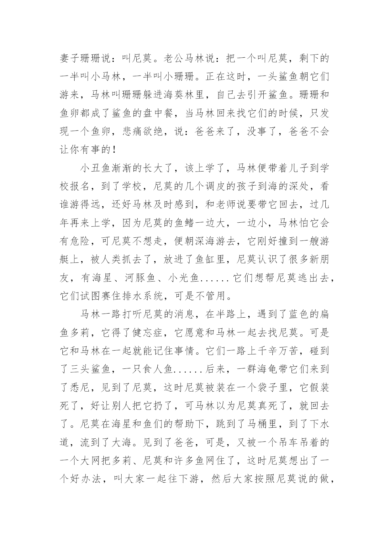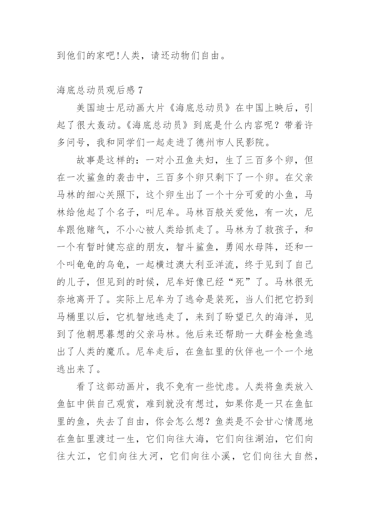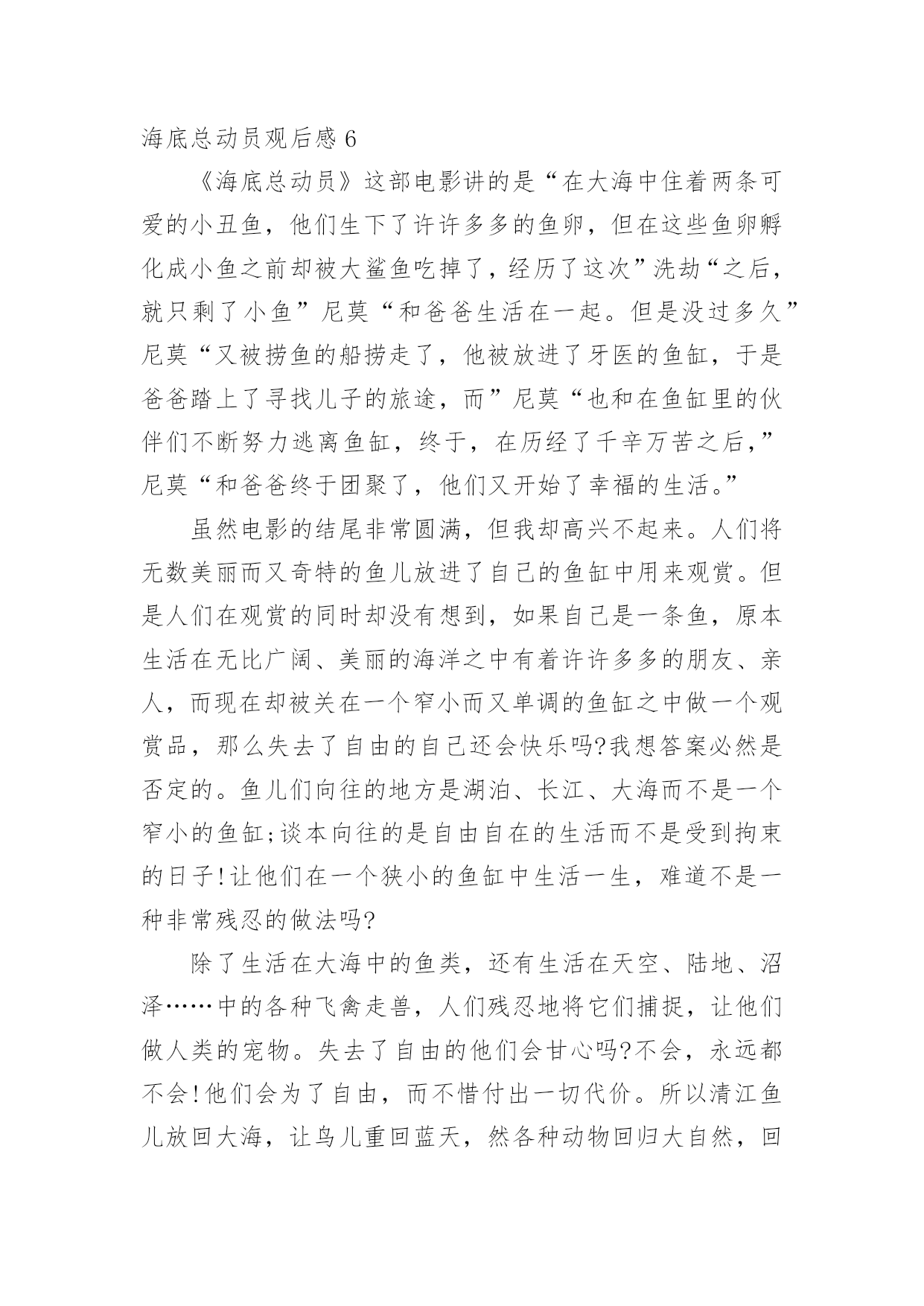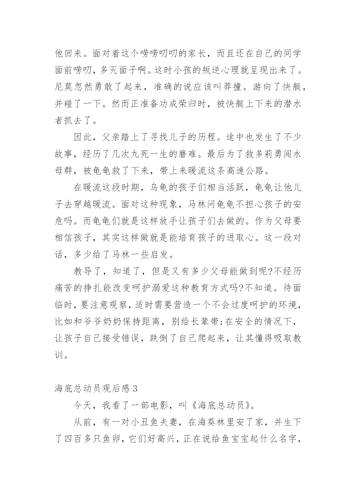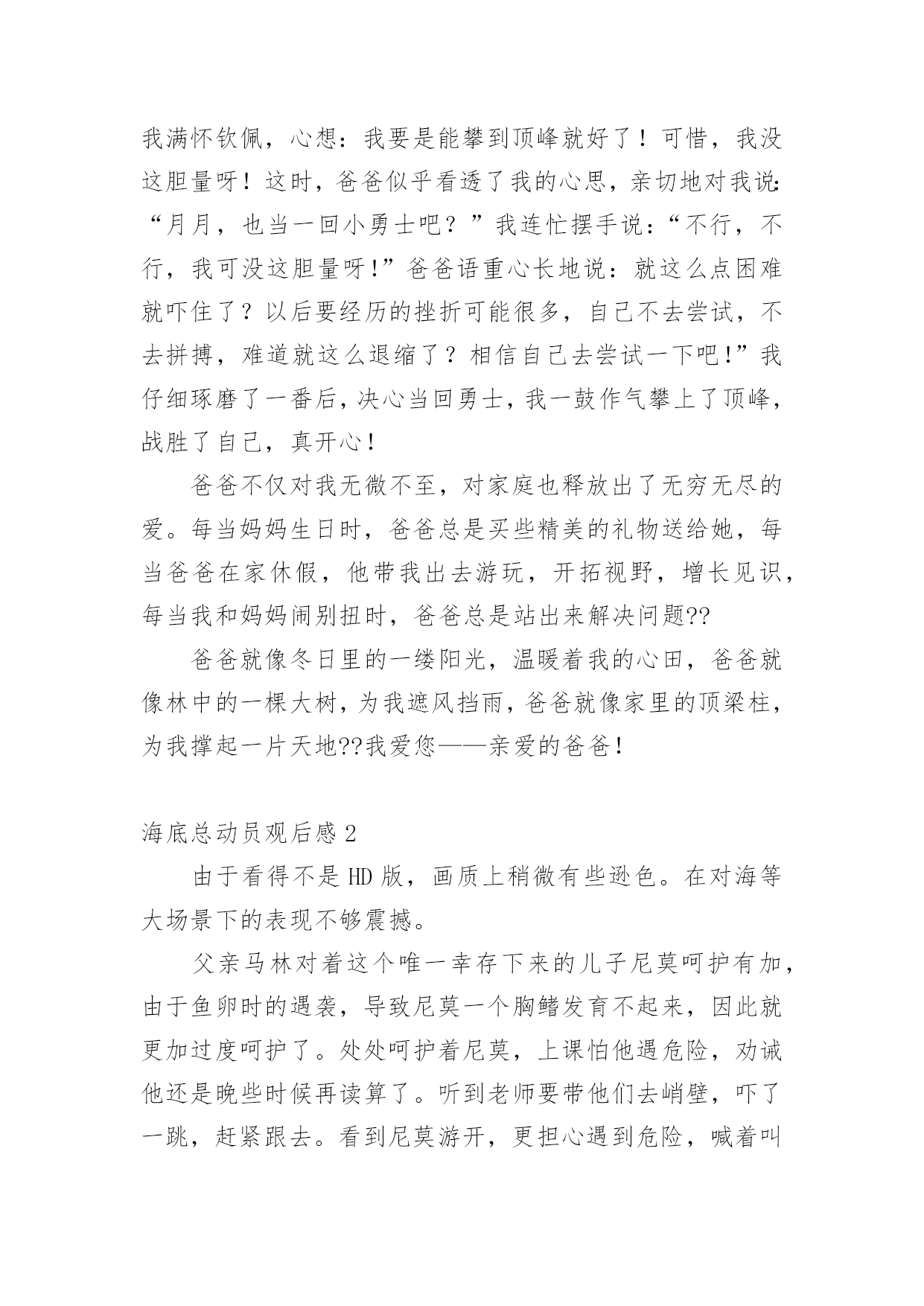 海底总动员观后感在观看完一部作品以后,这次观看让你有什么体会呢?需要写一篇观后感好好地作记录了。你想知道观后感怎么写吗?下面是小编帮大家整理的海底总动员观后感,仅供参考,大家一起来看看吧。海底总动员观后感1在一望无际的大海深处,有一片茂密的海葵林,住着两只可爱的小丑鱼——爸爸马林和儿子尼莫。在不久前,他们的家庭遭遇了不幸:妈妈和其它兄弟姐妹们被鲨鱼当成了一顿美餐,只有爸爸和尼莫侥幸存活了下来??儿子一天天长大了,尼莫到了上学的年龄,在这期间,尼莫被潜水员抓走了,爸爸为了救他,遭受了各种各样的危险,经历了千辛万苦的努力,终于救出了尼莫,父子再次团圆??每当想起《海底总动员》这一幕幕惊心动魄,催人泪下的情景时,我的心中情不自禁地有一股暖流涌遍全身。尼莫有一位对他不离不弃的爸爸,我也有这么一位好爸爸,正像歌中所唱的:“做起饭来锵铛铛锵铛铛,洗起衣服嚓嚓嚓嚓嚓嚓,高兴起来哈哈哈哈哈哈,打起屁股哈哈哈哈哈哈??”勤快又严厉的好爸爸。想到爸爸马林对儿子尼莫不离不弃的爱,我不禁想起我的爸爸对我们的关爱和鼓励。有一次,我和爸爸一起去公园游玩,到了攀岩娱乐区,我看到一位位勇于攀登的小勇士,我满怀钦佩,心想:我要是能攀到顶峰就好了!可惜,我没这胆量呀!这时,爸爸似乎看透了我的心思,亲切地对我说:“月月,也当一回小勇士吧?”我连忙摆手说:“不行,不行,我可没这胆量呀!”爸爸语重心长地说:就这么点困难就吓住了?以后要经历的挫折可能很多,自己不去尝试,不去拼搏,难道就这么退缩了?相信自己去尝试一下吧!”我仔细琢磨了一番后,决心当回勇士,我一鼓作气攀上了顶峰,战胜了自己,真开心!爸爸不仅对我无微不至,对家庭也释放出了无穷无尽的爱。每当妈妈生日时,爸爸总是买些精美的礼物送给她,每当爸爸在家休假,他带我出去游玩,开拓视野,增长见识,每当我和妈妈闹别扭时,爸爸总是站出来解决问题??爸爸就像冬日里的一缕阳光,温暖着我的心田,爸爸就像林中的一棵大树,为我遮风挡雨,爸爸就像家里的顶梁柱,为我撑起一片天地??我爱您——亲爱的爸爸!海底总动员观后感2由于看得不是HD版,画质上稍微有些逊色。在对海等大场景下的表现不够震撼。父亲马林对着这个唯一幸存下来的儿子尼莫呵护有加,由于鱼卵时的遇袭,导致尼莫一个胸鳍发育不起来,因此就更加过度呵护了。处处呵护着尼莫,上课怕他遇危险,劝诫他还是晚些时候再读算了。听到老师要带他们去峭壁,吓了一跳,赶紧跟去。看到尼莫游开,更担心遇到危险,喊着叫他回来。面对着这个唠唠叨叨的家长,而且还在自己的同学面前唠叨,多灭面子啊。这时小孩的叛逆心理就呈现出来了。尼莫忽然勇敢了起来,准确的说应该叫莽撞。游向了快艇,并碰了一下。然而正准备功成荣归时,被快艇上下来的潜水者抓去了。因此,父亲踏上了寻找儿子的历程。途中也发生了不少故事,经历了几次九死一生的磨难。最后为了救多莉勇闯水母群,被龟龟救了下来,带上来暖流这条高速公路。在暖流这段时期,乌龟的孩子们相当活跃,龟龟让他儿子去穿越暖流。面对这种现象,马林问龟龟不担心孩子的安危吗。而龟龟们就是这样放手让孩子们去做的。作为父母要相信孩子,其实这样做就是能培育孩子的进取心。这一段对话,多少给了马林一些启发。教导了,知道了,但是又有多少父母能做到呢?不经历痛苦的挣扎能改变呵护溺爱这种教育方式吗?不知道。待面临时,要注意观察,适时需要营造一个不会过度呵护的环境,比如和爷爷奶奶保持距离,别给长辈带;在安全的情况下,让孩子自己接受错误,跌倒了自己爬起来,让其懂得吸取教训。海底总动员观后感3今天,我看了一部电影,叫《海底总动员》。从前,有一对小丑鱼夫妻,在海葵林里安了家,并生下了四百多只鱼卵,它们好高兴,正在说给鱼宝宝起什么名字,妻子珊珊说:叫尼莫。老公马林说:把一个叫尼莫,剩下的一半叫小马林,一半叫小珊珊。正在这时,一头鲨鱼朝它们游来,马林叫珊珊躲进海葵林里,自己去引开鲨鱼。珊珊和鱼卵都成了鲨鱼的盘中餐,当马林回来找它们的时候,只发现一个鱼卵,悲痛欲绝,说:爸爸来了,没事了,爸爸不会让你有事的!小丑鱼渐渐的长大了,该上学了,马林便带着儿子到学校报名,到了学校,尼莫的几个调皮的孩子到海的深处,看谁游得远,还好马林及时感到,和老师说要带它回去,过几年再来上学,因为尼莫的鱼鳍一边大,一边小,马林怕它会有危险,可尼莫不想走,便朝深海游去,它刚好撞到一艘游艇上,被人类抓去了,放进了鱼缸里,尼莫认识了很多新朋友,有海星、河豚鱼、小光鱼......它们想帮尼莫逃出去,它们试图赛住排水系统,可是不管用。马林一路打听尼莫的消息,在半路上,遇到了蓝色的扁鱼多莉,它得了健忘症,它愿意和马林一起去找尼莫。可是它和马林在一起就能记住事情。它们一路上千辛万苦,碰到了三头鲨鱼,一只食人鱼......后来,一群海龟带它们来到了悉尼,见到了尼莫,这时尼莫被装